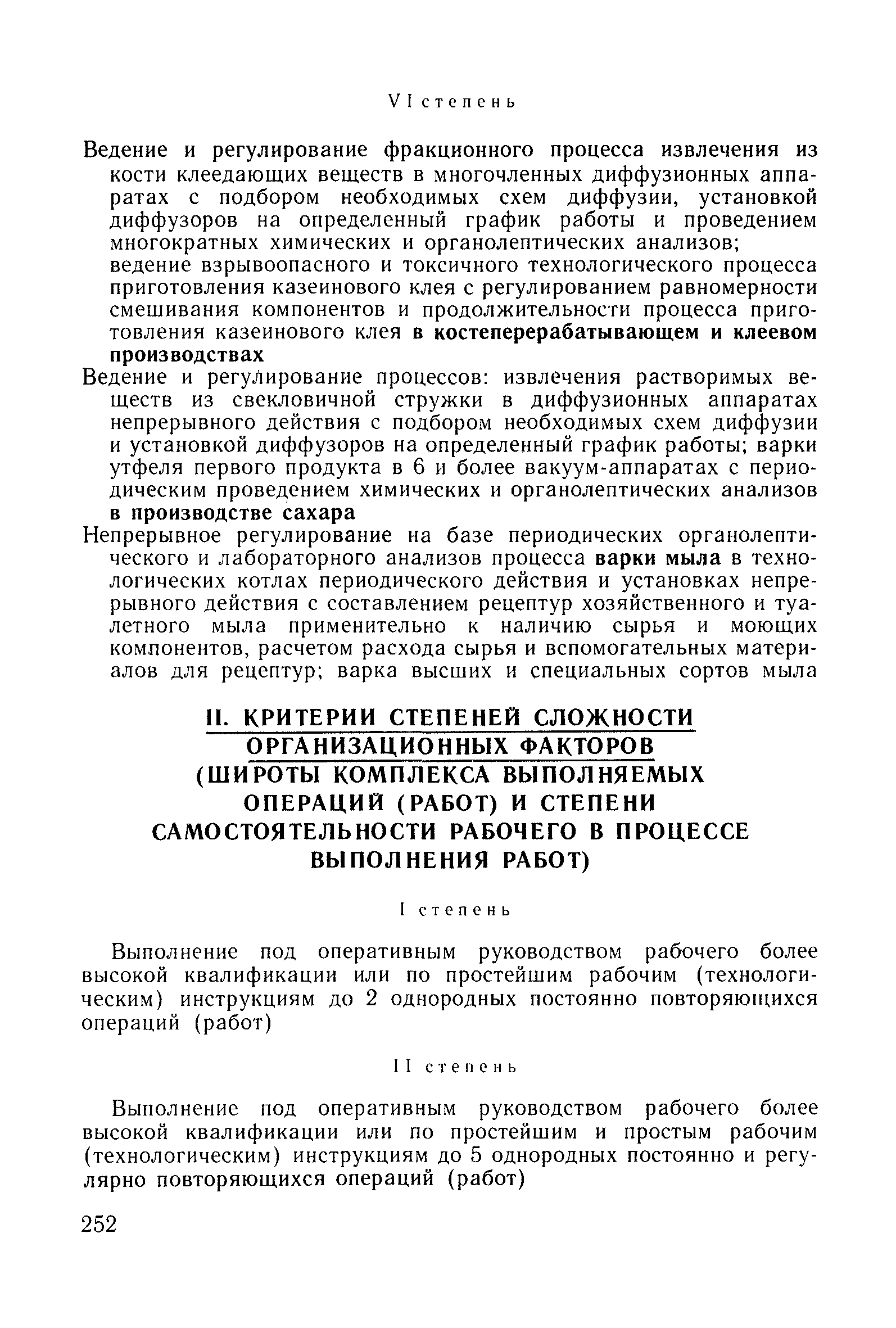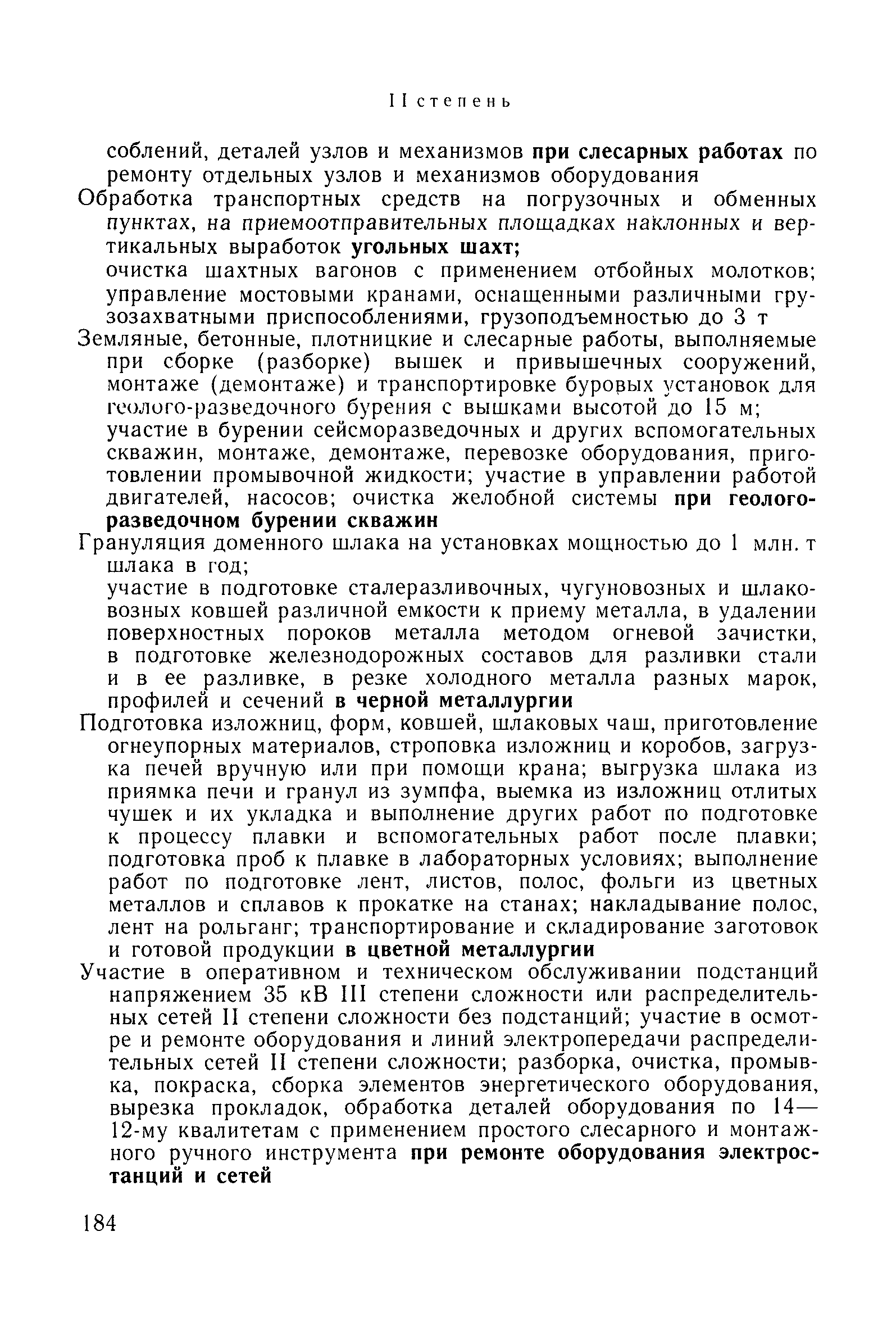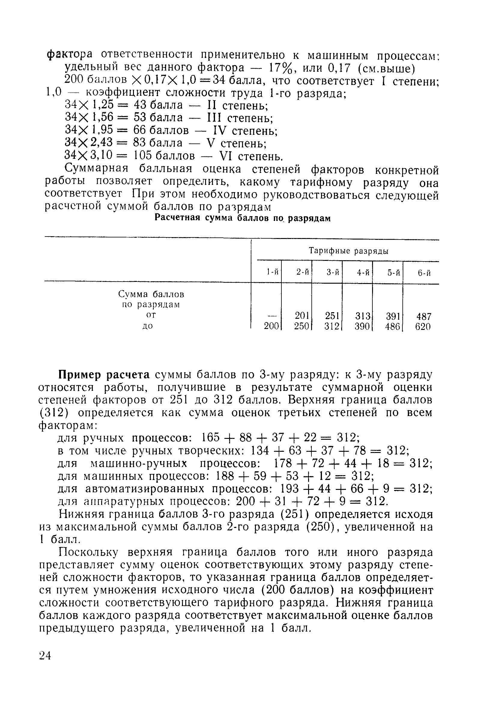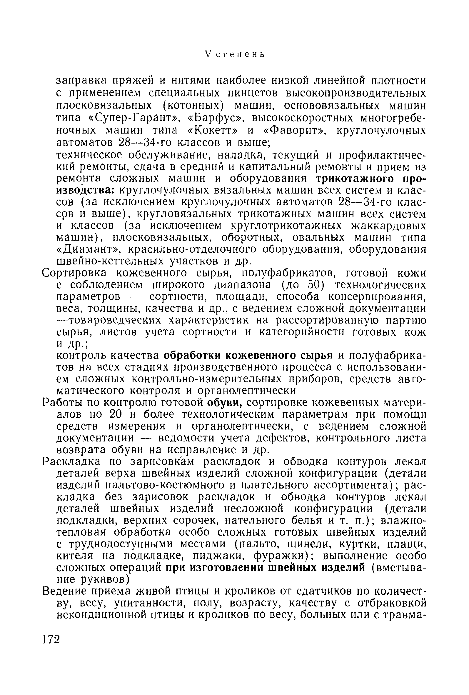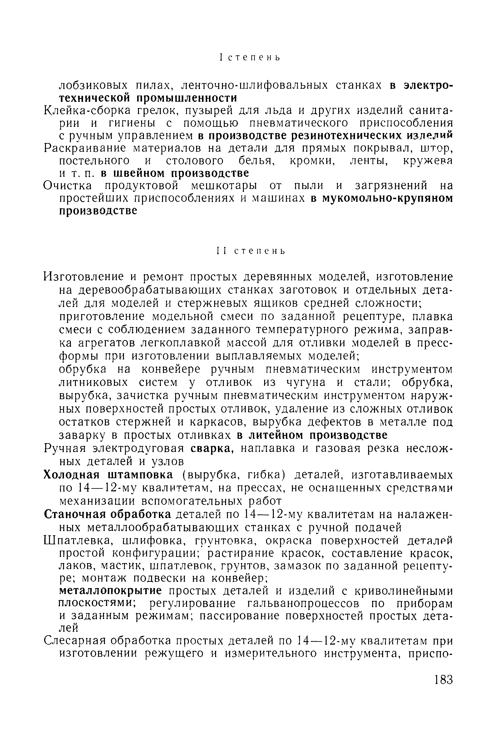| Оглавление: | Введение I Назначение и структура построения Единого тарифно-квалификационного справочника работ и профессий рабочих II Основы методики определения разряда сложности работ III Определение требований к квалификации рабочих IV Определение наименований профессий рабочих Приложение 1. Примеры тарифно-квалификационных характеристик профессий рабочих по типам трудовых процессов Приложение 2. Критерии степеней сложности факторов 1. Критерии степеней сложности технологических факторов 1. Критерии степеней подфактора "Сложность управлении (обслуживания, пользования) орудиями труда" А. Для ручных процессов труда Б. Для машинно-ручных процессов труда В. Для машинных процессов труда Г. Для автоматизированных процессов труда Д. Для аппаратурных процессов труда 2. Критерии степеней подфактора "Сложность предметов труда" А. Для ручных процессов труда Б. Для машинно-ручных процессов труда В. Для машинных процессов труда 3. Критерии степеней подфактора "Сложность технологических (рабочих) процессов" А. Для ручных процессов труда Б. Для машинно-ручных процессов труда В. Для машинных процессов труда Г. Для автоматизированных процессов труда Д. Для аппаратурных процессов труда II Критерии степеней сложности организационных факторов (широты комплекса выполняемых операций (работ) и степени самостоятельности рабочего в процессе выполнения работ) III Критерии степеней сложности фактора ответственности (материальной ответственности и ответственности за здоровье и жизнь) IV Критерии степеней сложности специфических факторов . . . Приложение 3. Профессионально-квалификационная карта рабочего Приложение 4. Примеры оценки сложности работ по типам трудовых процессов Приложение 5. Тарифно-квалификационная карта для определения разряда сложности работы |
