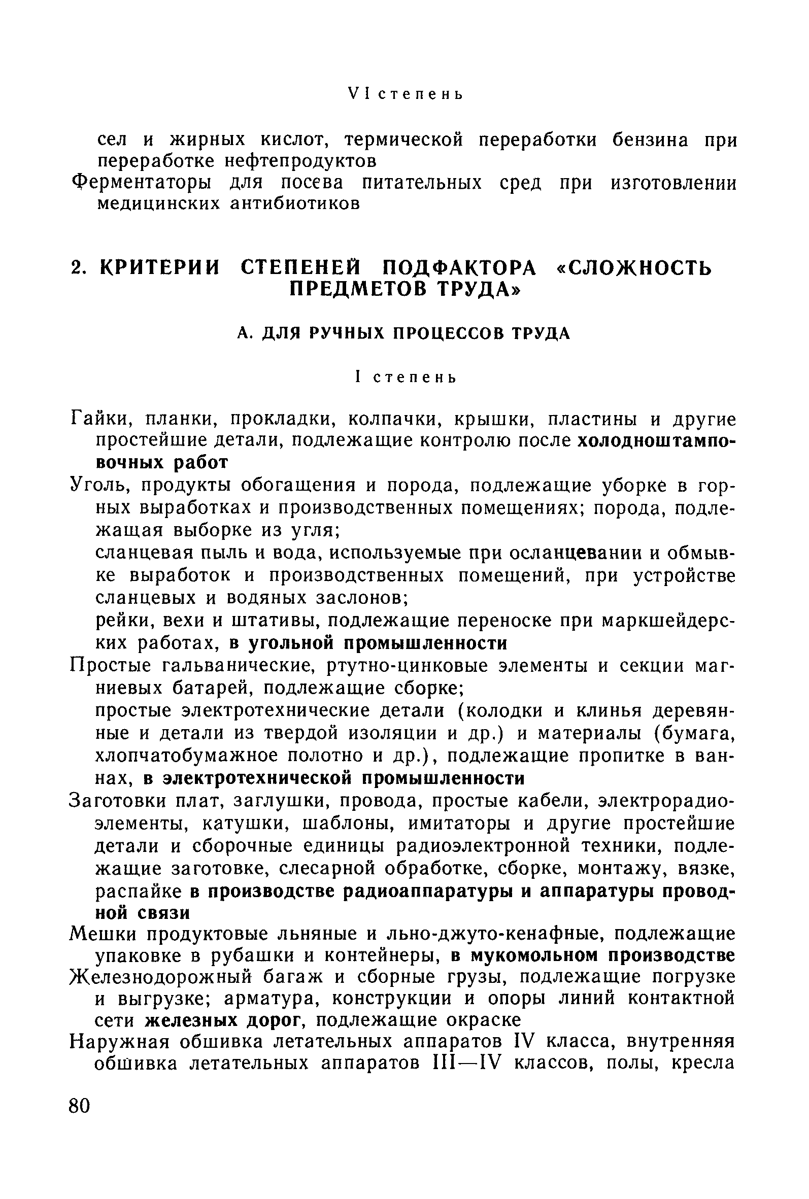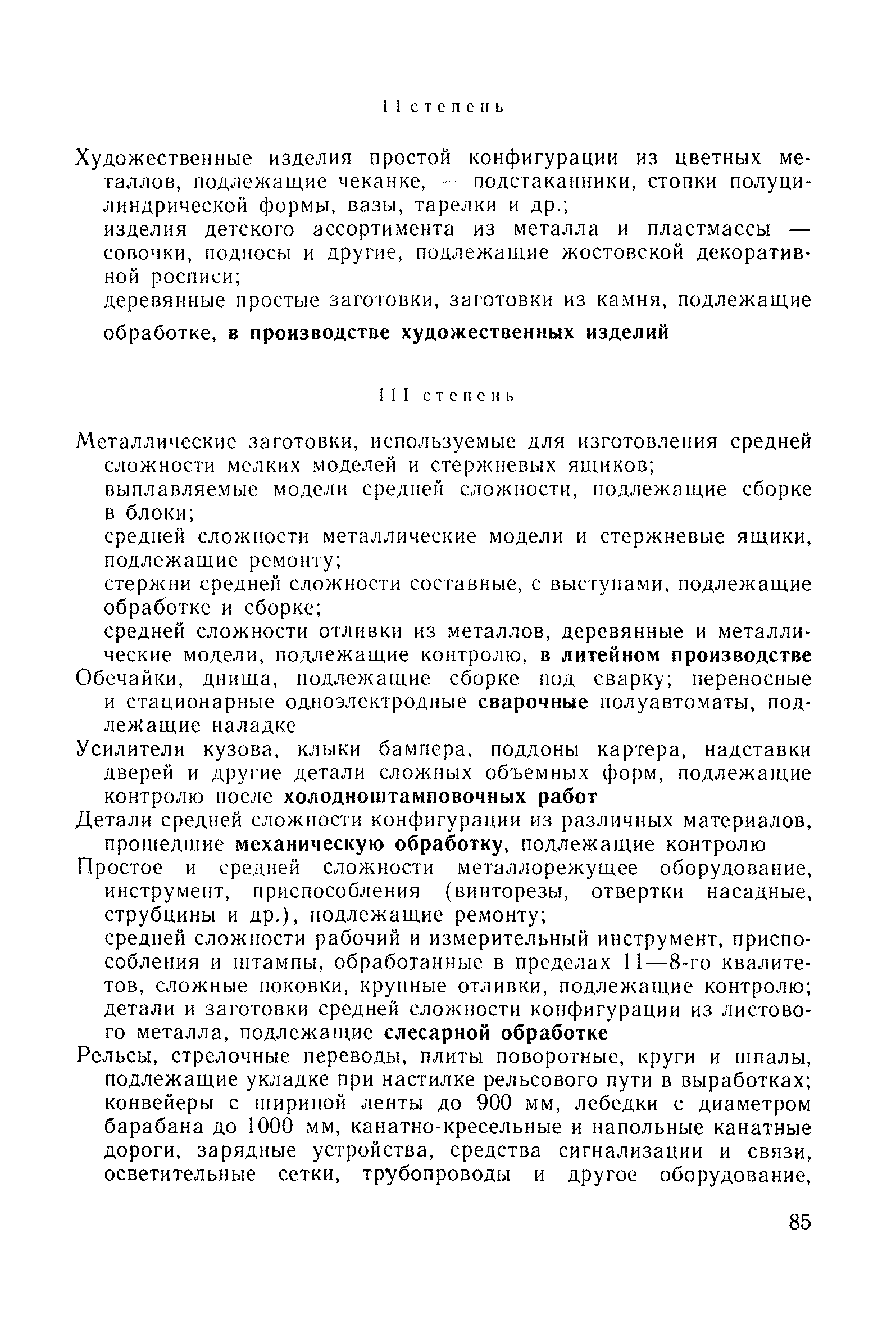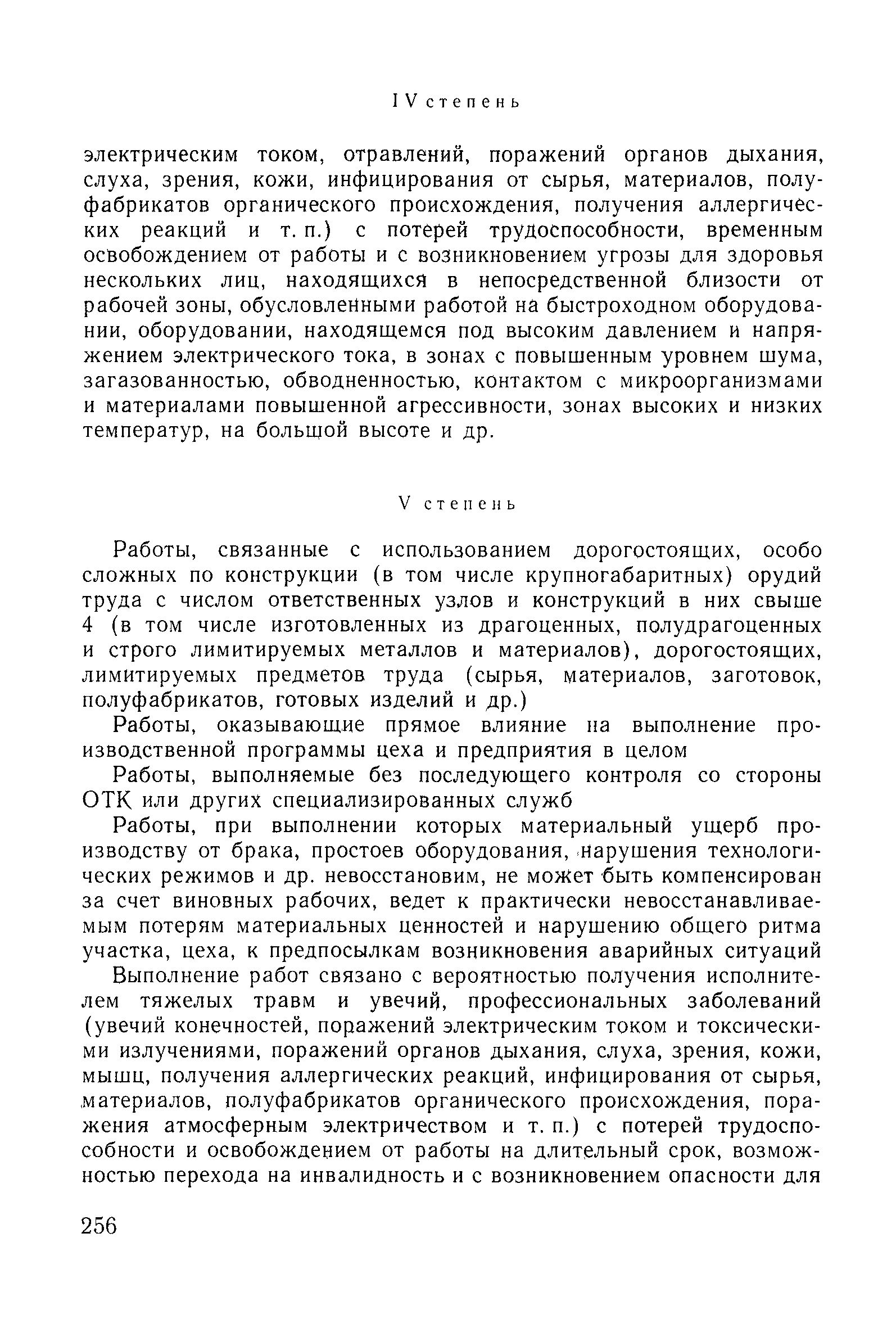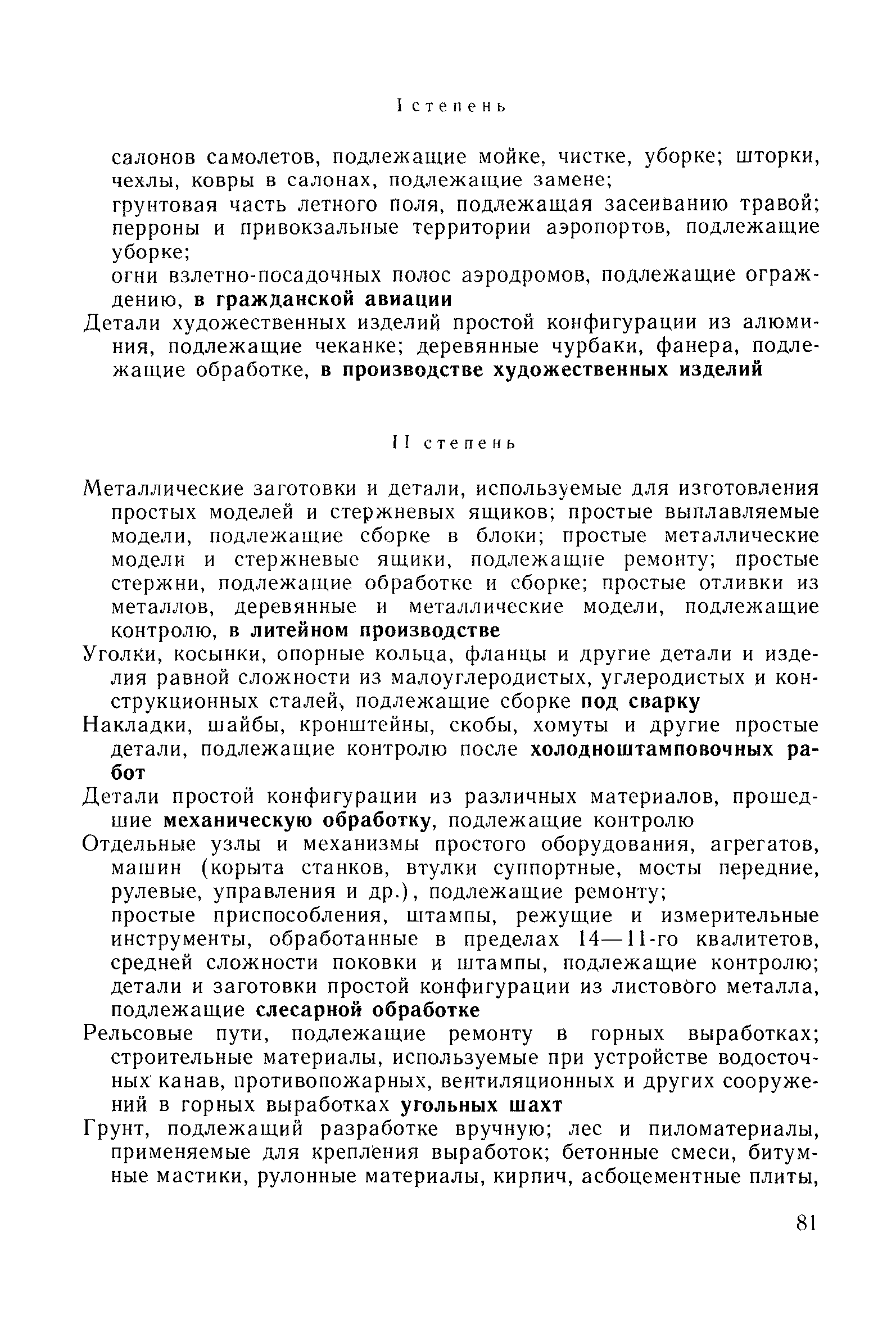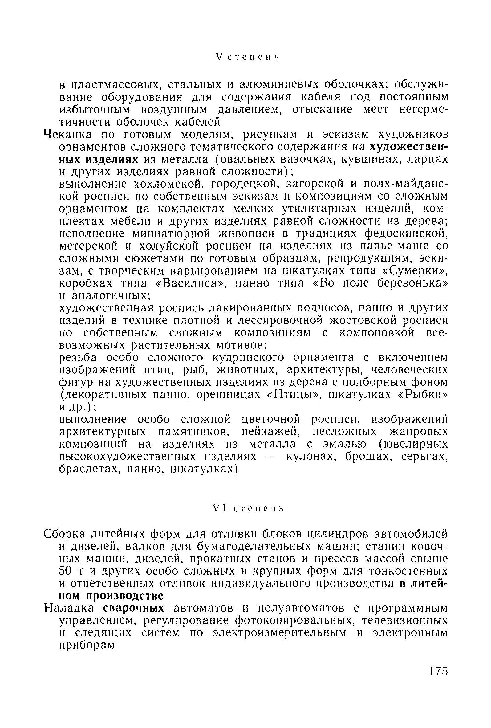 | Оглавление: | Введение I Назначение и структура построения Единого тарифно-квалификационного справочника работ и профессий рабочих II Основы методики определения разряда сложности работ III Определение требований к квалификации рабочих IV Определение наименований профессий рабочих Приложение 1. Примеры тарифно-квалификационных характеристик профессий рабочих по типам трудовых процессов Приложение 2. Критерии степеней сложности факторов 1. Критерии степеней сложности технологических факторов 1. Критерии степеней подфактора "Сложность управлении (обслуживания, пользования) орудиями труда" А. Для ручных процессов труда Б. Для машинно-ручных процессов труда В. Для машинных процессов труда Г. Для автоматизированных процессов труда Д. Для аппаратурных процессов труда 2. Критерии степеней подфактора "Сложность предметов труда" А. Для ручных процессов труда Б. Для машинно-ручных процессов труда В. Для машинных процессов труда 3. Критерии степеней подфактора "Сложность технологических (рабочих) процессов" А. Для ручных процессов труда Б. Для машинно-ручных процессов труда В. Для машинных процессов труда Г. Для автоматизированных процессов труда Д. Для аппаратурных процессов труда II Критерии степеней сложности организационных факторов (широты комплекса выполняемых операций (работ) и степени самостоятельности рабочего в процессе выполнения работ) III Критерии степеней сложности фактора ответственности (материальной ответственности и ответственности за здоровье и жизнь) IV Критерии степеней сложности специфических факторов . . . Приложение 3. Профессионально-квалификационная карта рабочего Приложение 4. Примеры оценки сложности работ по типам трудовых процессов Приложение 5. Тарифно-квалификационная карта для определения разряда сложности работы |