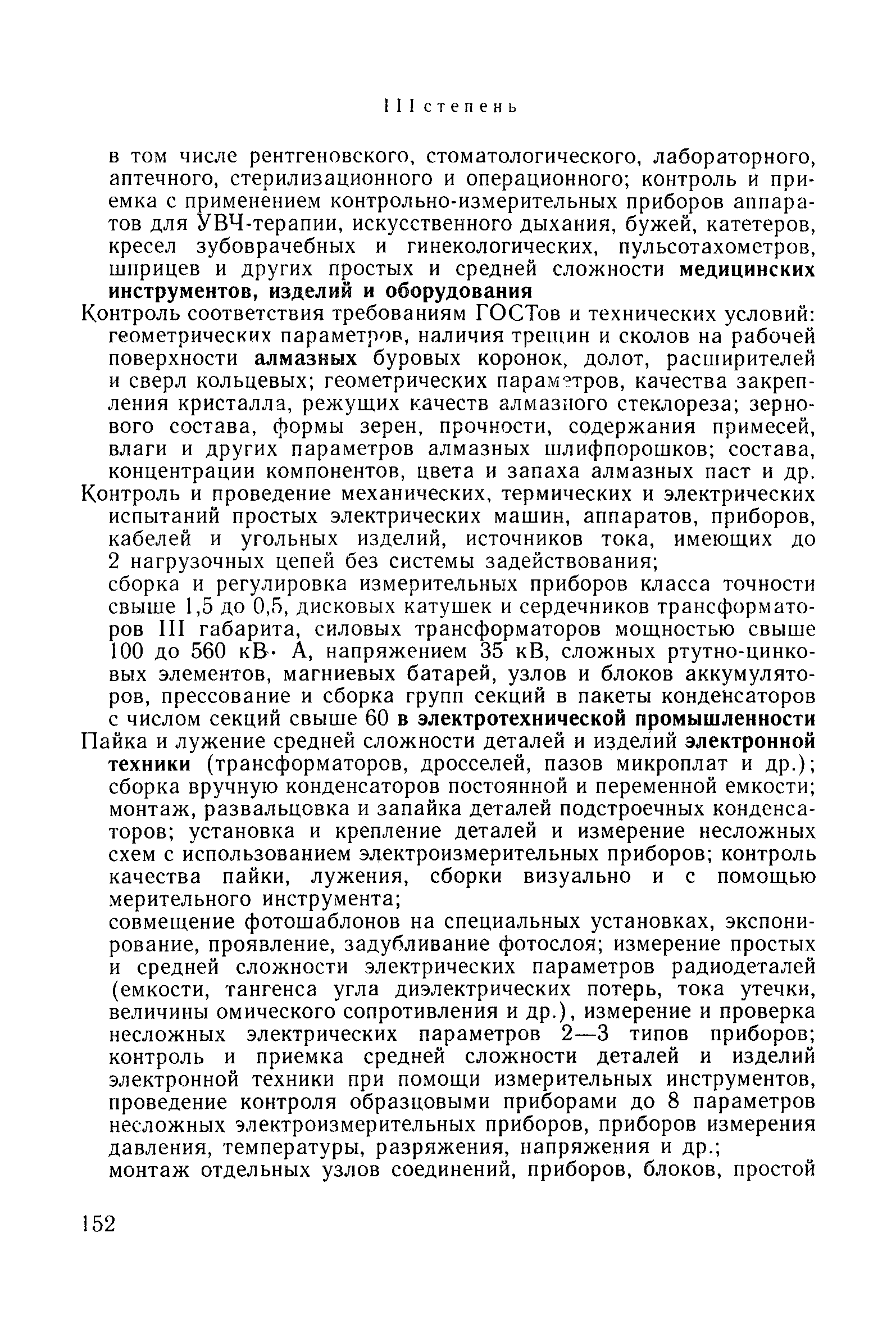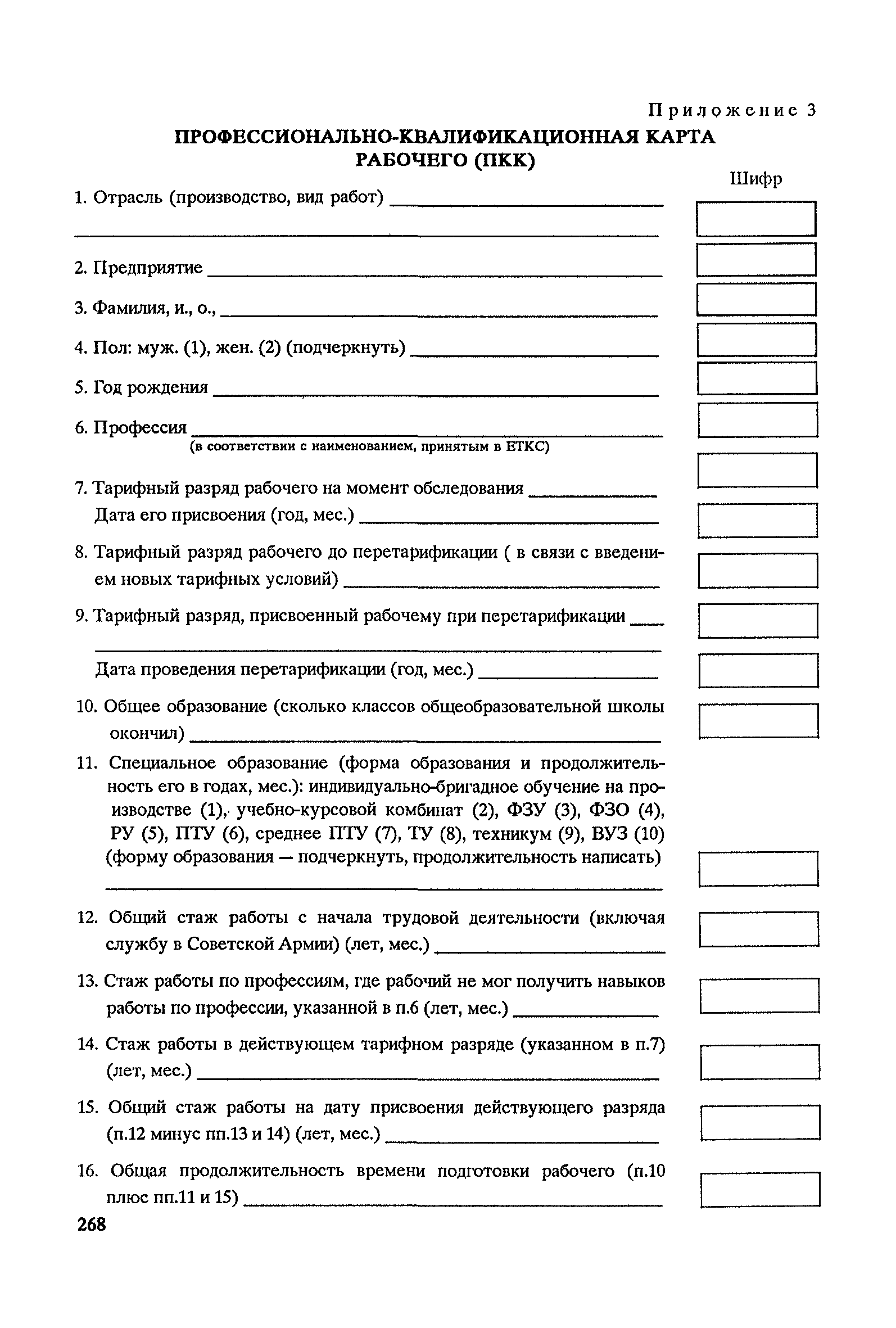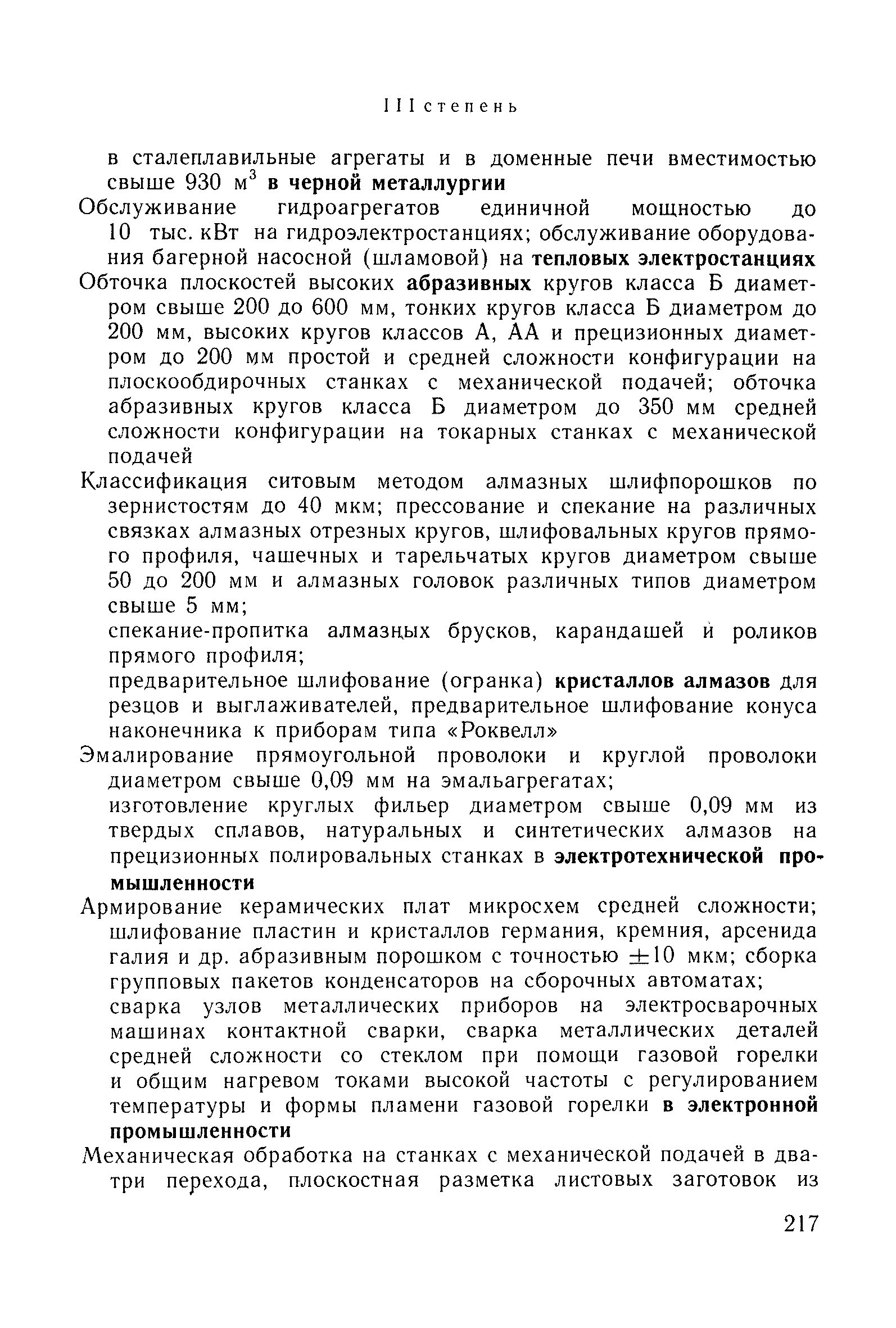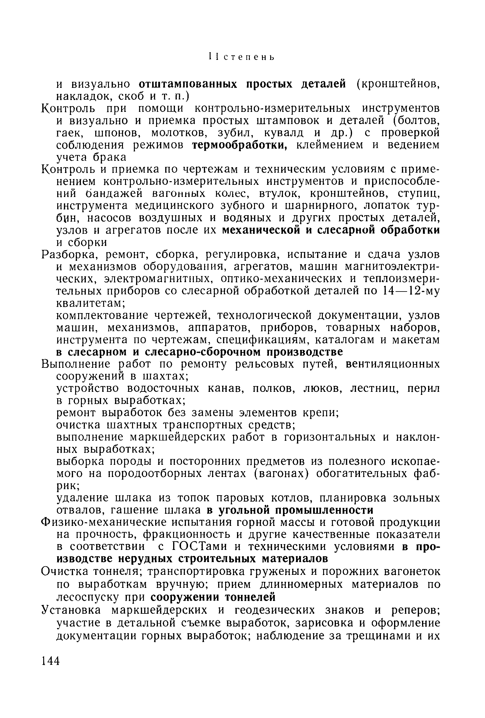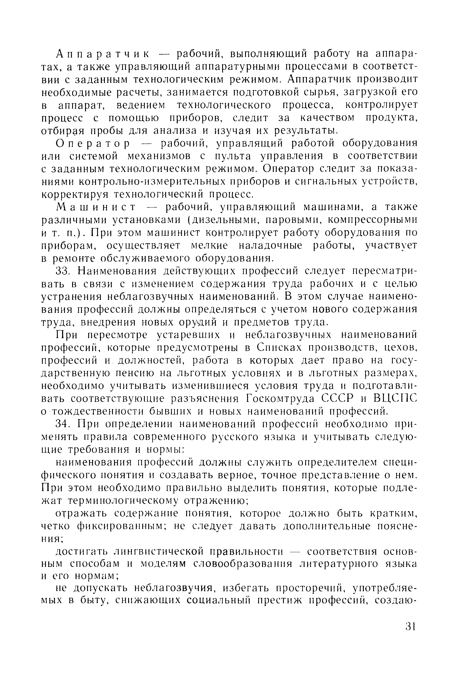 | Оглавление: | Введение I Назначение и структура построения Единого тарифно-квалификационного справочника работ и профессий рабочих II Основы методики определения разряда сложности работ III Определение требований к квалификации рабочих IV Определение наименований профессий рабочих Приложение 1. Примеры тарифно-квалификационных характеристик профессий рабочих по типам трудовых процессов Приложение 2. Критерии степеней сложности факторов 1. Критерии степеней сложности технологических факторов 1. Критерии степеней подфактора "Сложность управлении (обслуживания, пользования) орудиями труда" А. Для ручных процессов труда Б. Для машинно-ручных процессов труда В. Для машинных процессов труда Г. Для автоматизированных процессов труда Д. Для аппаратурных процессов труда 2. Критерии степеней подфактора "Сложность предметов труда" А. Для ручных процессов труда Б. Для машинно-ручных процессов труда В. Для машинных процессов труда 3. Критерии степеней подфактора "Сложность технологических (рабочих) процессов" А. Для ручных процессов труда Б. Для машинно-ручных процессов труда В. Для машинных процессов труда Г. Для автоматизированных процессов труда Д. Для аппаратурных процессов труда II Критерии степеней сложности организационных факторов (широты комплекса выполняемых операций (работ) и степени самостоятельности рабочего в процессе выполнения работ) III Критерии степеней сложности фактора ответственности (материальной ответственности и ответственности за здоровье и жизнь) IV Критерии степеней сложности специфических факторов . . . Приложение 3. Профессионально-квалификационная карта рабочего Приложение 4. Примеры оценки сложности работ по типам трудовых процессов Приложение 5. Тарифно-квалификационная карта для определения разряда сложности работы |