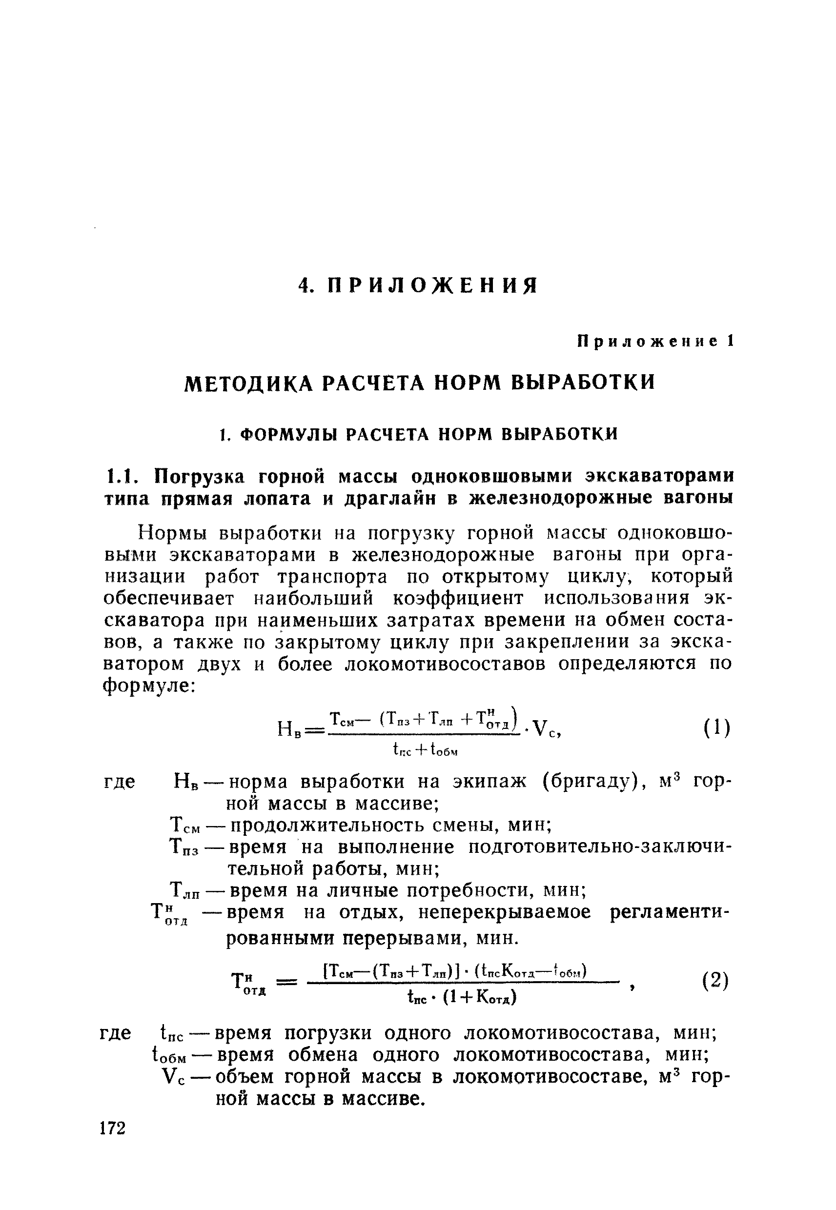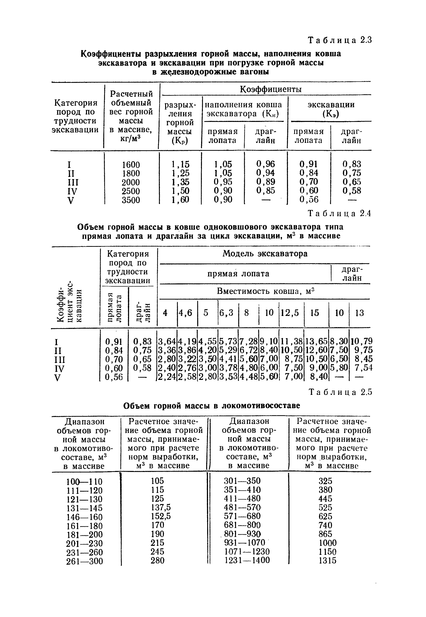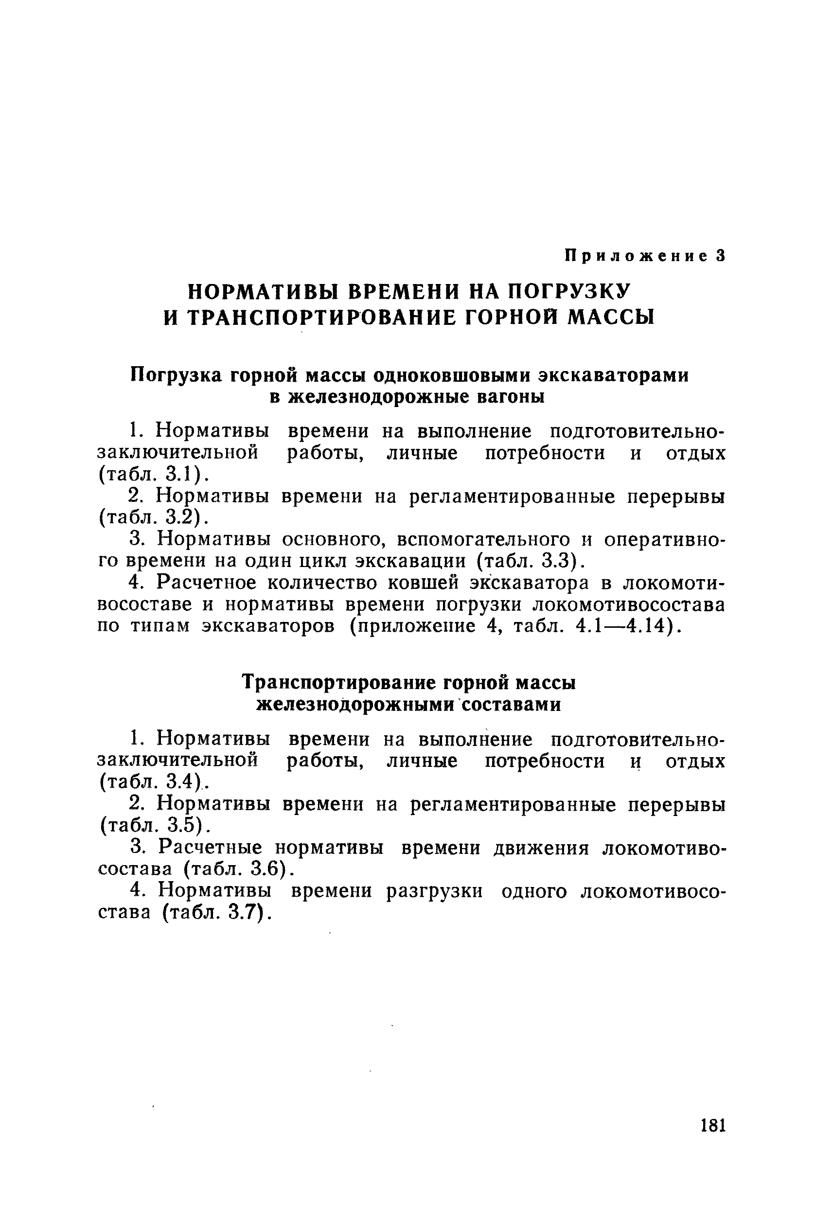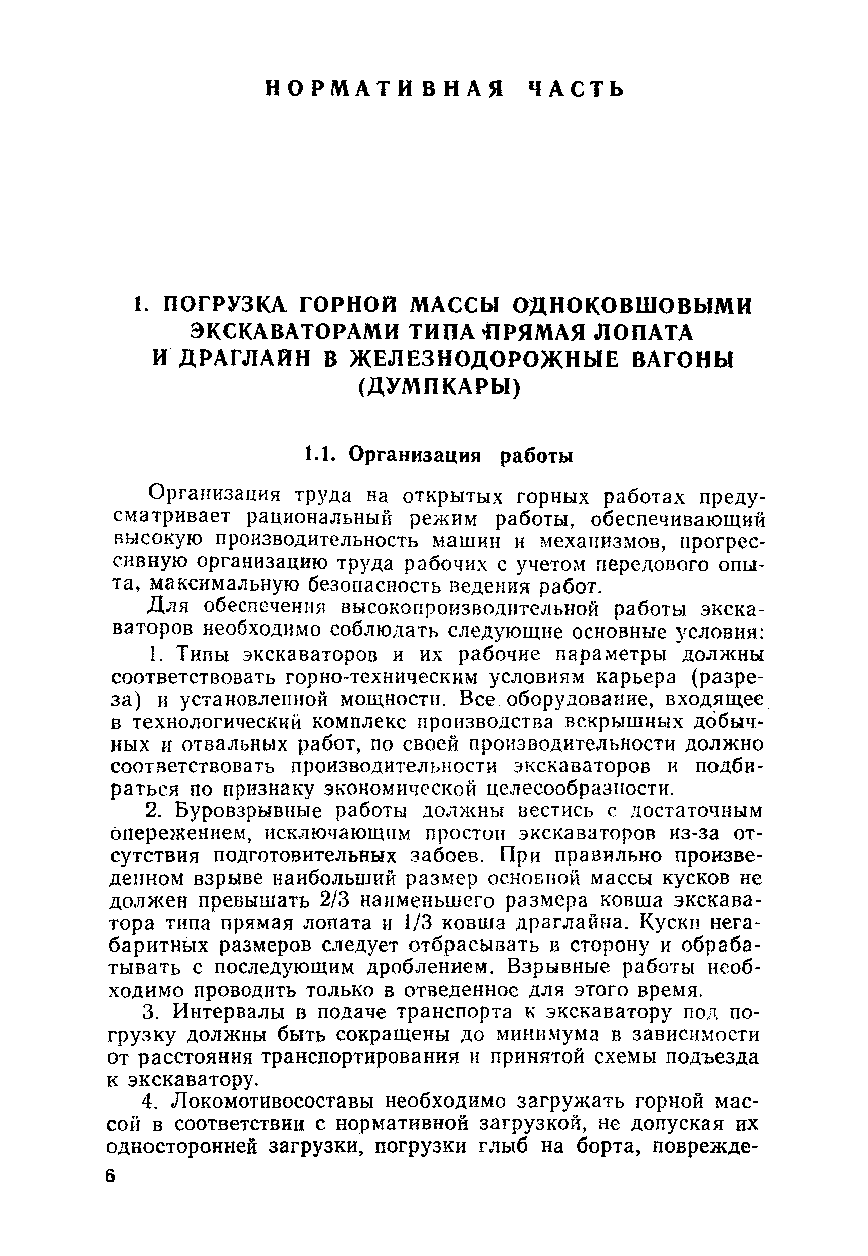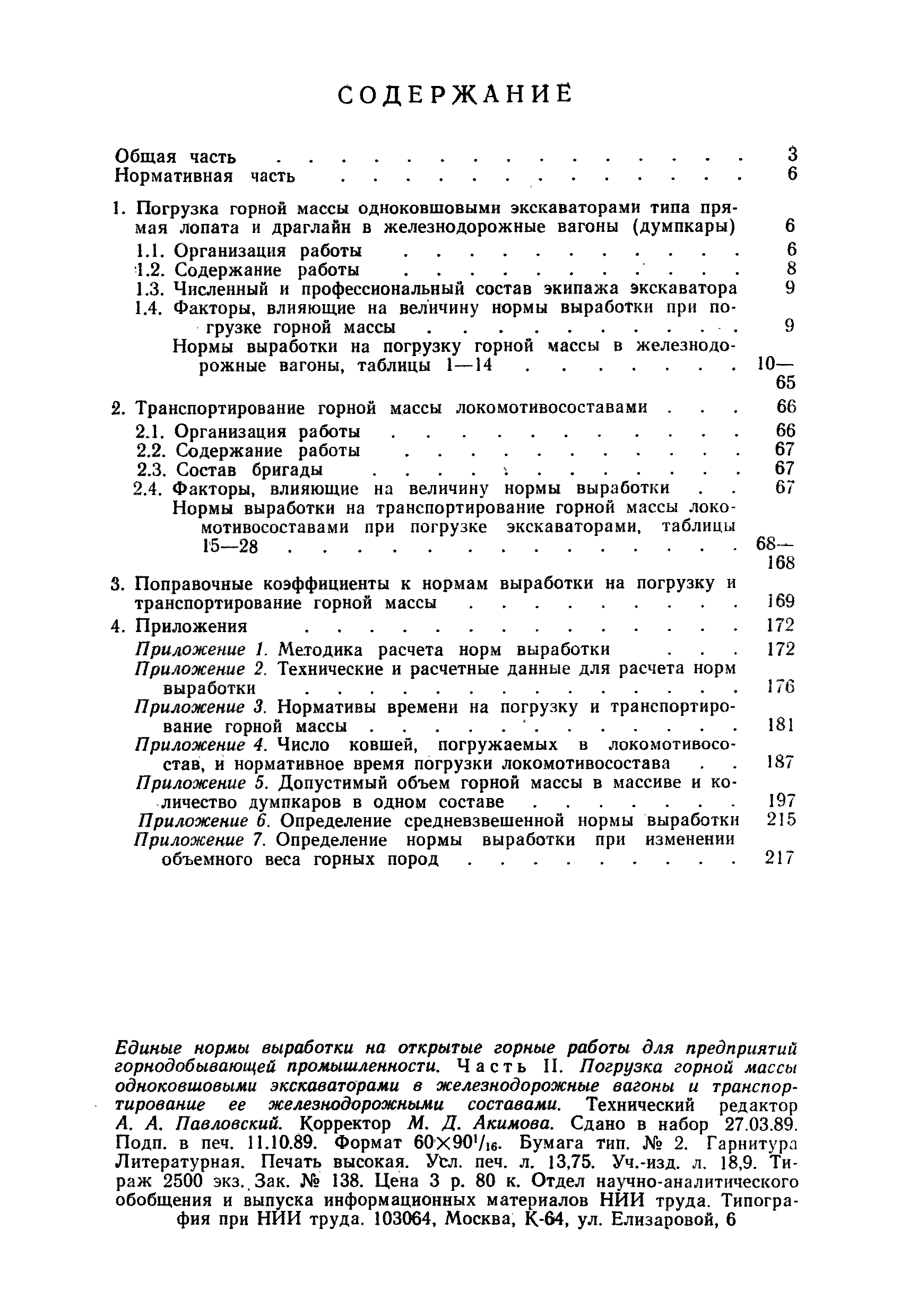 | Оглавление: | Общая часть Нормативная часть 1. Погрузка горной массы одноковшовыми экскаваторами типа прямая лопата и драглайн в железнодорожные вагоны (думпкары) 1.1. Организация работы 1.2. Содержание работы 1.3. Численный и профессиональный состав экипажа экскаватора 1.4. Факторы, влияющие на величину нормы выработки при погрузке горной массы Нормы выработки на погрузку горной нассы в железнодорожные вагоны, таблицы 1 - 14 2. Транспортирование горной массы локомотивосоставами 2.1. Организация работы 2.2. Содержание работы 2.3. Состав бригады 2.4. Факторы, влияющие на величину нормы выработки Нормы выработки на транспортирование горной массы локомотивосоставами при погрузке экскаваторами, таблицы 15 - 28 3. Поправочные коэффициенты к нормам выработки на погрузку и транспортирование горной массы Приложение 1. Методика расчета норм выработки Приложение 2. Технические и расчетные данные для расчета норм выработки Приложение 3. Нормативы времени на погрузку и транспортирование горной массы Приложение 4. Число ковшей, погружаемых в локомотивосостав, и нормативное время погрузки локомотивосостава Приложение 5. Допустимый объем горной массы в массиве и количество думпкаров в одном составе Приложение 6. Определение средневзвешенной нормы выработки Приложение 7. Определение нормы выработки при изменении объемного веса горных пород |