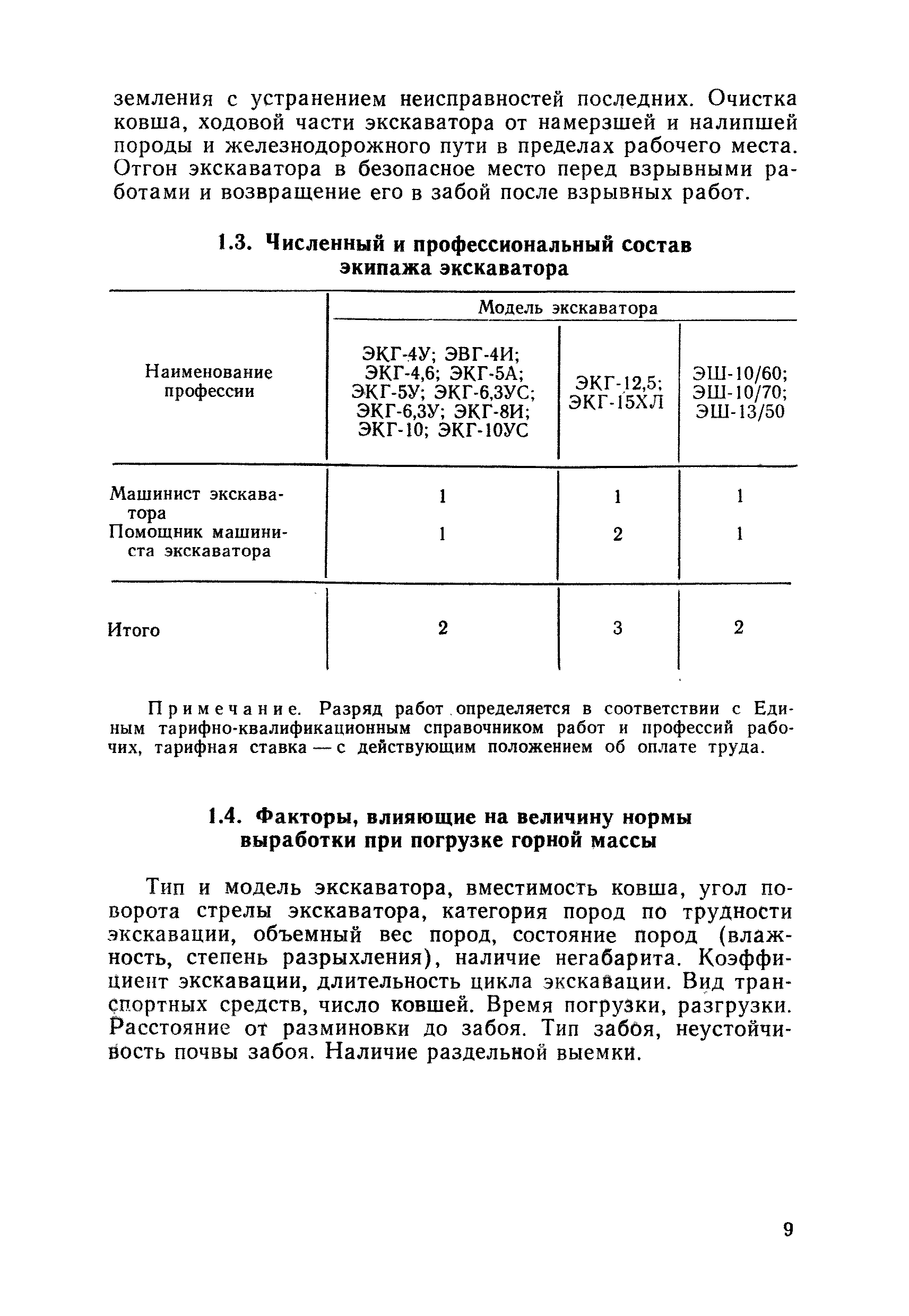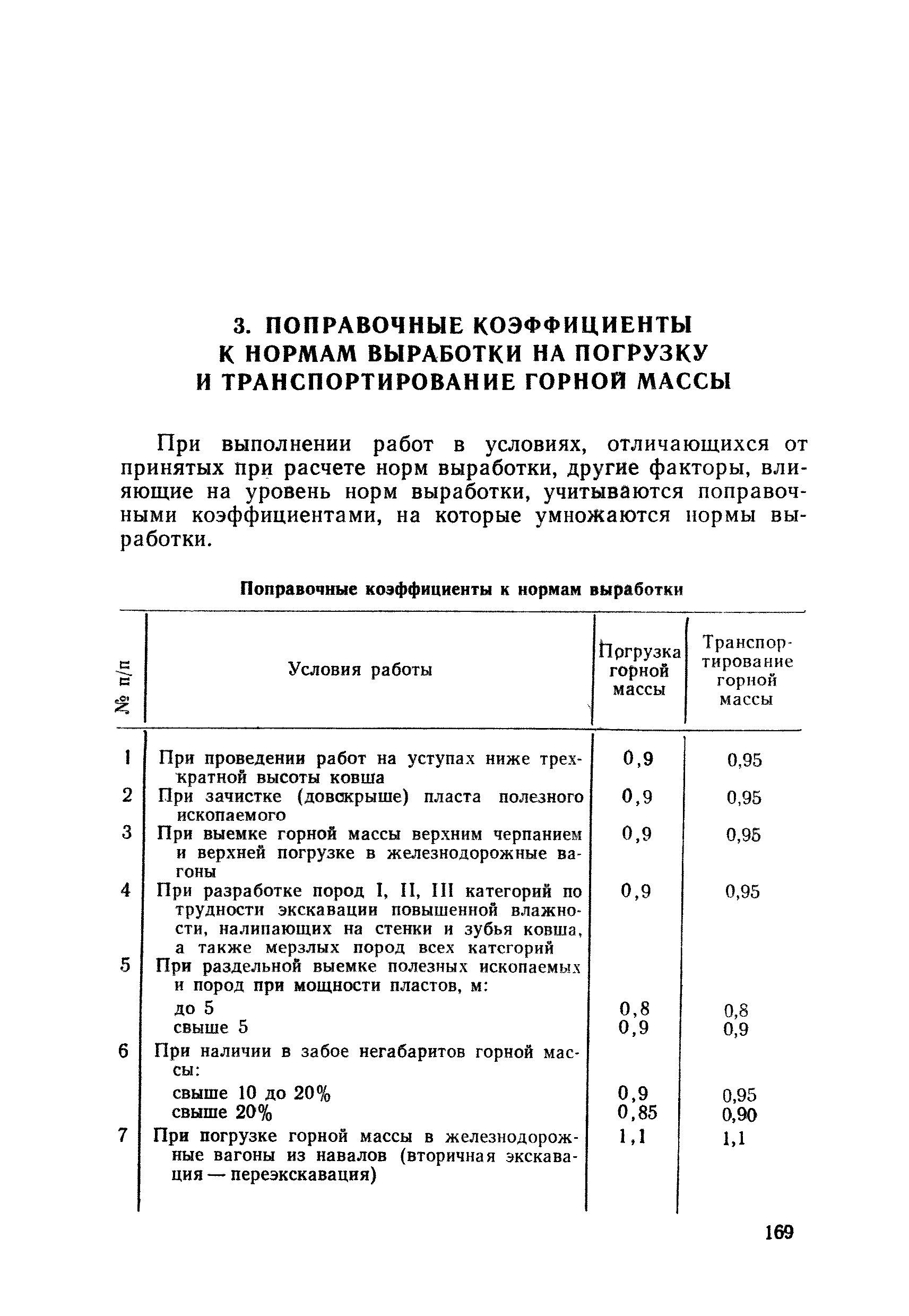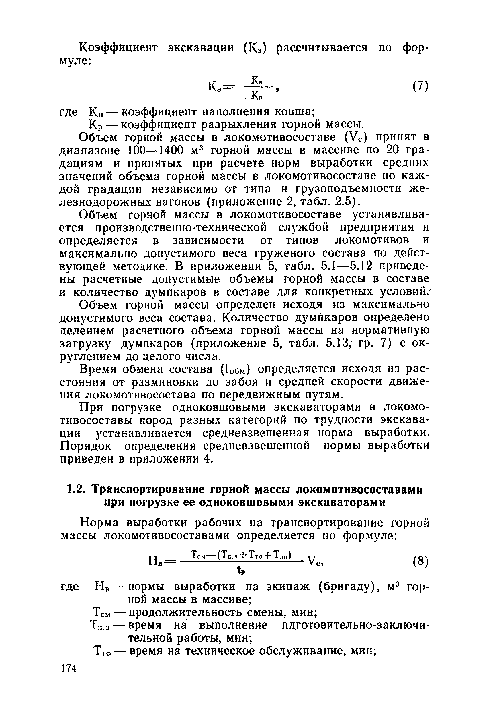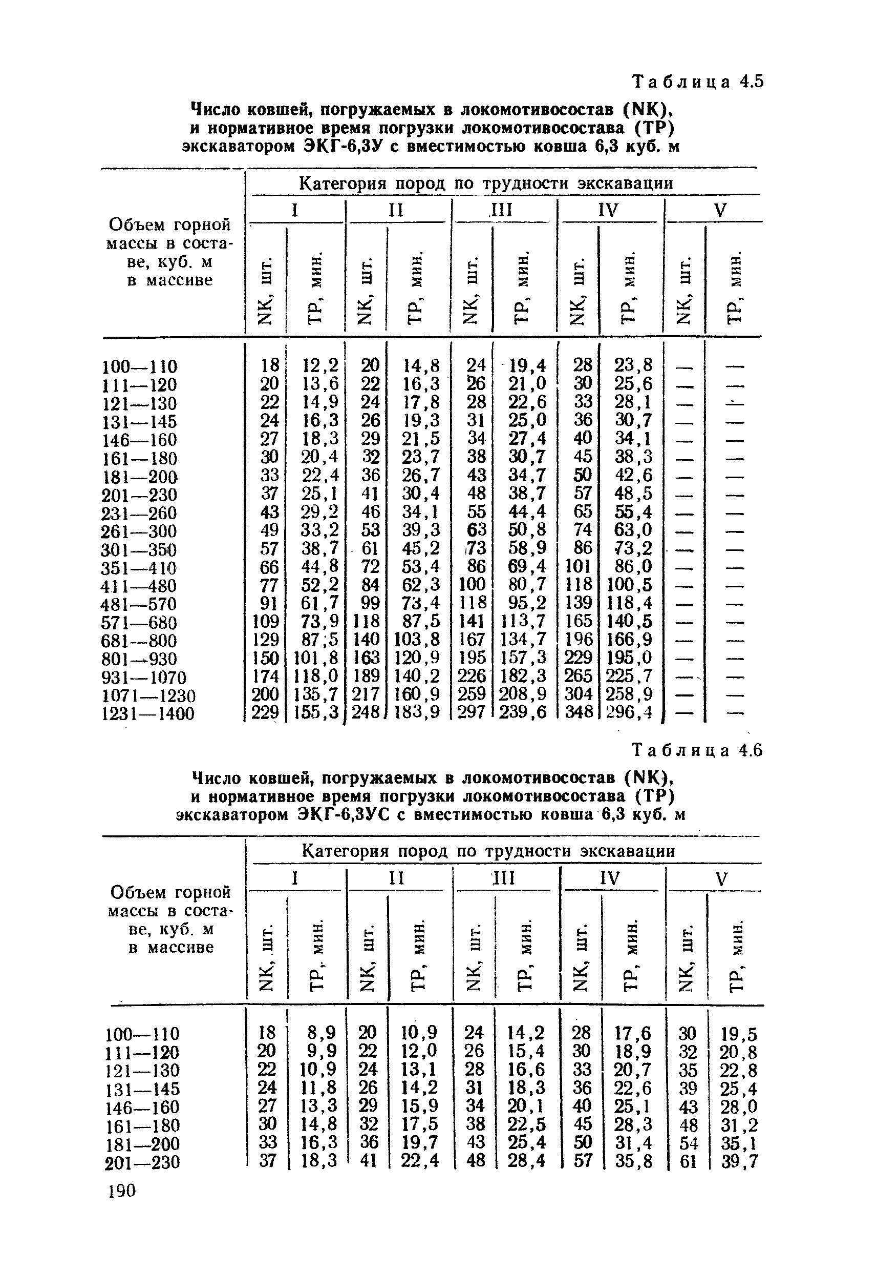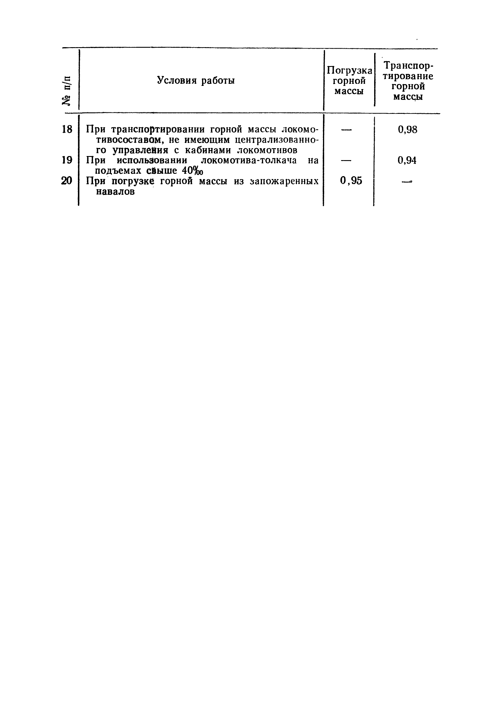 | Оглавление: | Общая часть Нормативная часть 1. Погрузка горной массы одноковшовыми экскаваторами типа прямая лопата и драглайн в железнодорожные вагоны (думпкары) 1.1. Организация работы 1.2. Содержание работы 1.3. Численный и профессиональный состав экипажа экскаватора 1.4. Факторы, влияющие на величину нормы выработки при погрузке горной массы Нормы выработки на погрузку горной нассы в железнодорожные вагоны, таблицы 1 - 14 2. Транспортирование горной массы локомотивосоставами 2.1. Организация работы 2.2. Содержание работы 2.3. Состав бригады 2.4. Факторы, влияющие на величину нормы выработки Нормы выработки на транспортирование горной массы локомотивосоставами при погрузке экскаваторами, таблицы 15 - 28 3. Поправочные коэффициенты к нормам выработки на погрузку и транспортирование горной массы Приложение 1. Методика расчета норм выработки Приложение 2. Технические и расчетные данные для расчета норм выработки Приложение 3. Нормативы времени на погрузку и транспортирование горной массы Приложение 4. Число ковшей, погружаемых в локомотивосостав, и нормативное время погрузки локомотивосостава Приложение 5. Допустимый объем горной массы в массиве и количество думпкаров в одном составе Приложение 6. Определение средневзвешенной нормы выработки Приложение 7. Определение нормы выработки при изменении объемного веса горных пород |