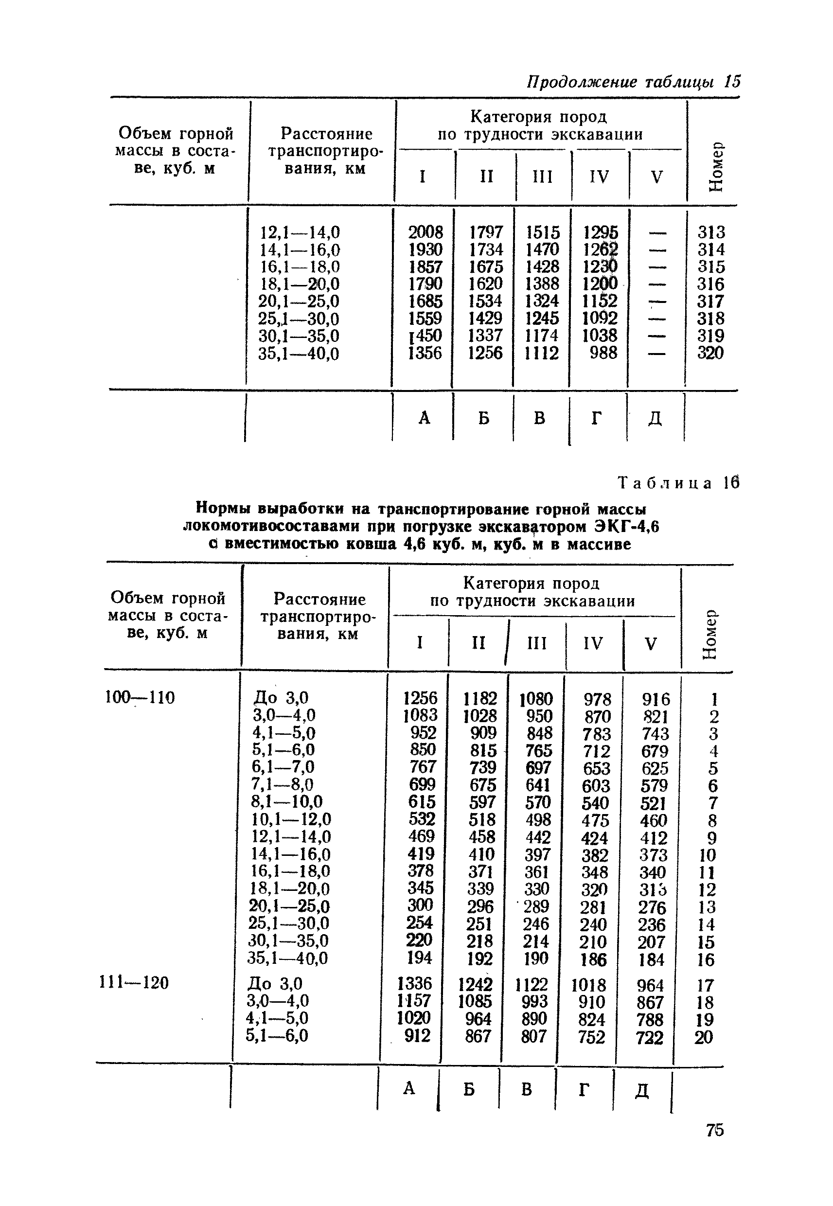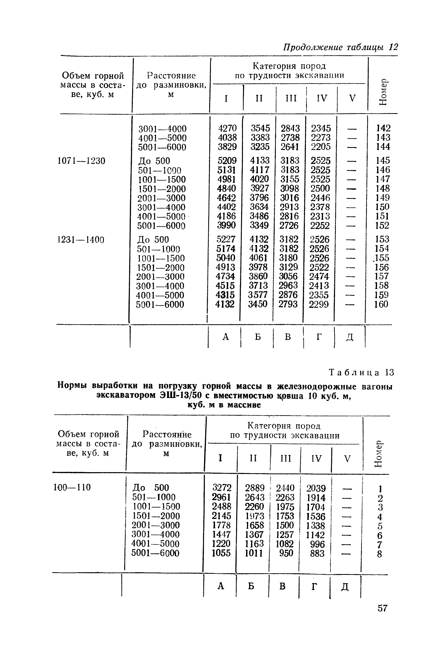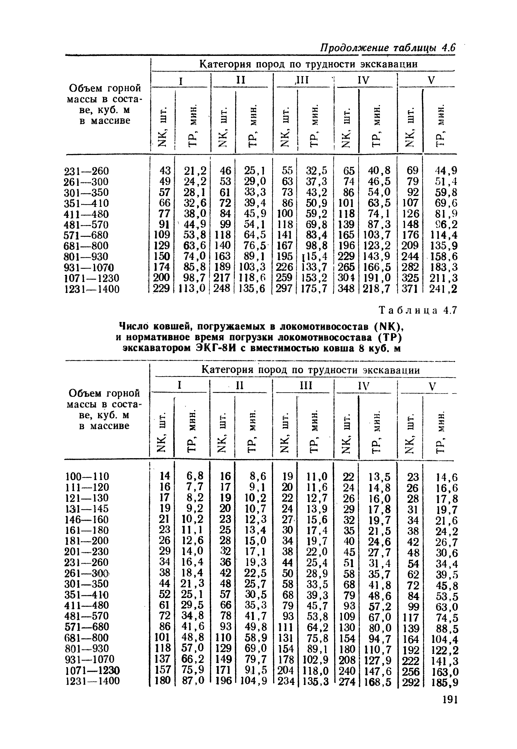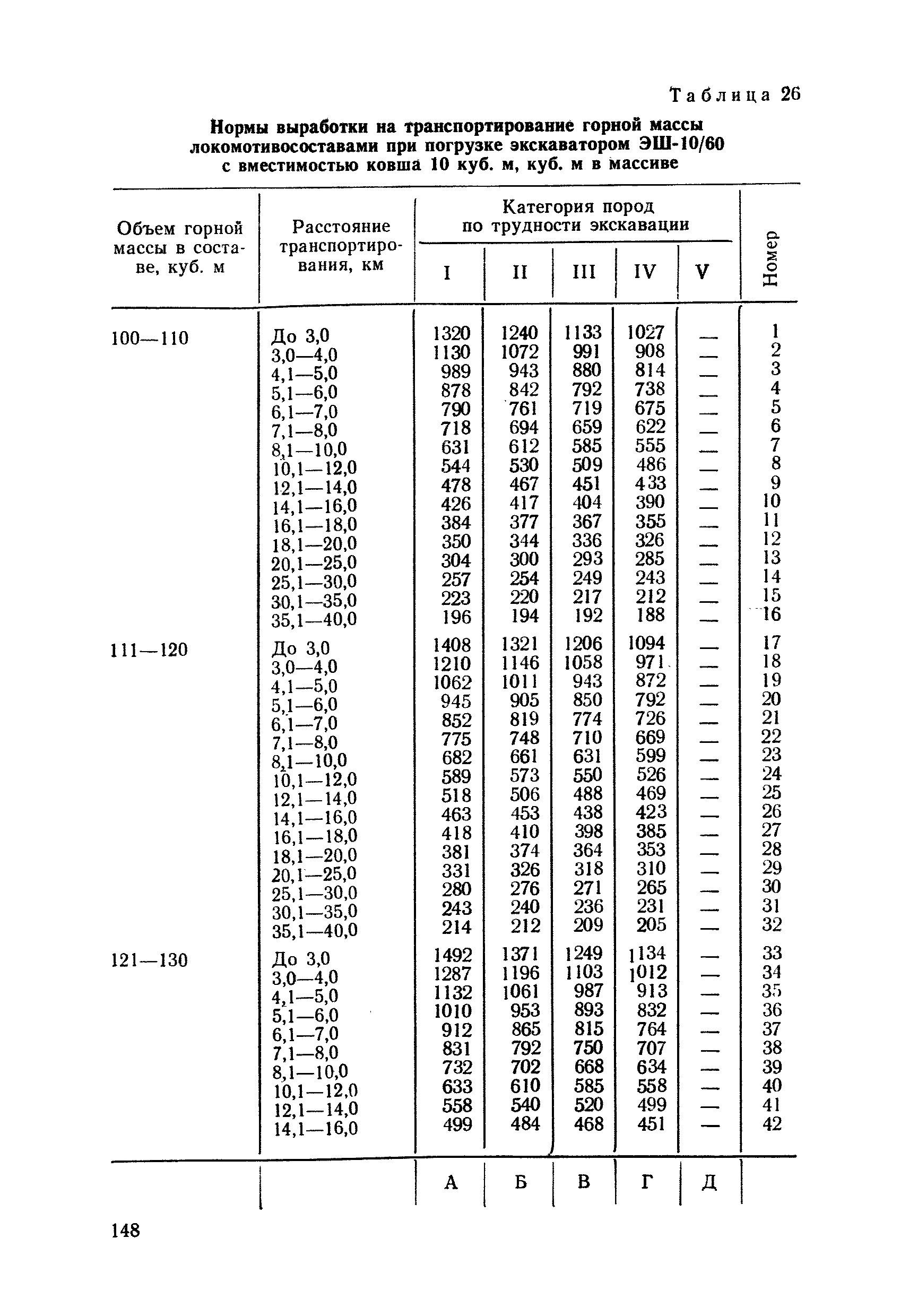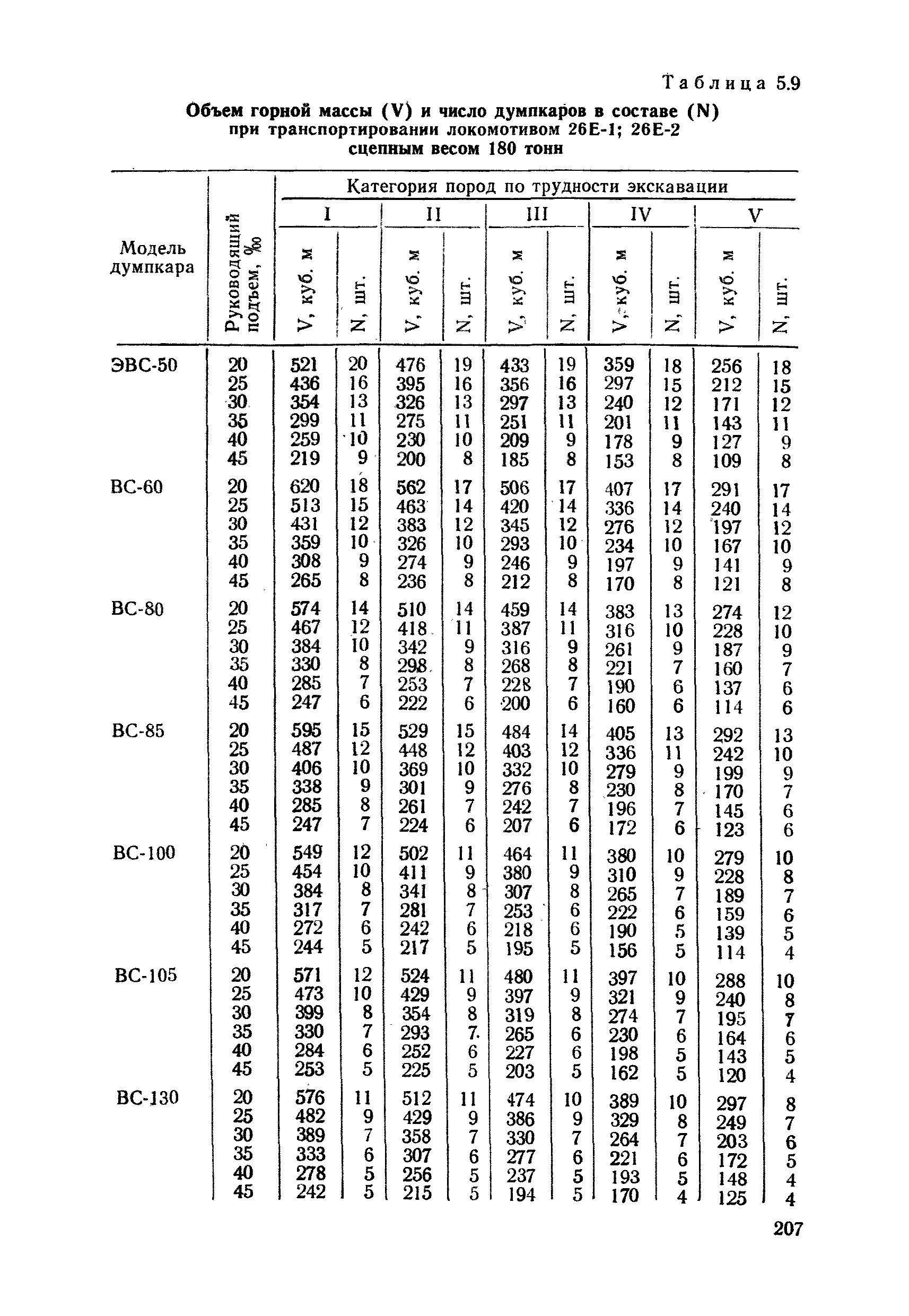| Оглавление: | Общая часть Нормативная часть 1. Погрузка горной массы одноковшовыми экскаваторами типа прямая лопата и драглайн в железнодорожные вагоны (думпкары) 1.1. Организация работы 1.2. Содержание работы 1.3. Численный и профессиональный состав экипажа экскаватора 1.4. Факторы, влияющие на величину нормы выработки при погрузке горной массы Нормы выработки на погрузку горной нассы в железнодорожные вагоны, таблицы 1 - 14 2. Транспортирование горной массы локомотивосоставами 2.1. Организация работы 2.2. Содержание работы 2.3. Состав бригады 2.4. Факторы, влияющие на величину нормы выработки Нормы выработки на транспортирование горной массы локомотивосоставами при погрузке экскаваторами, таблицы 15 - 28 3. Поправочные коэффициенты к нормам выработки на погрузку и транспортирование горной массы Приложение 1. Методика расчета норм выработки Приложение 2. Технические и расчетные данные для расчета норм выработки Приложение 3. Нормативы времени на погрузку и транспортирование горной массы Приложение 4. Число ковшей, погружаемых в локомотивосостав, и нормативное время погрузки локомотивосостава Приложение 5. Допустимый объем горной массы в массиве и количество думпкаров в одном составе Приложение 6. Определение средневзвешенной нормы выработки Приложение 7. Определение нормы выработки при изменении объемного веса горных пород |