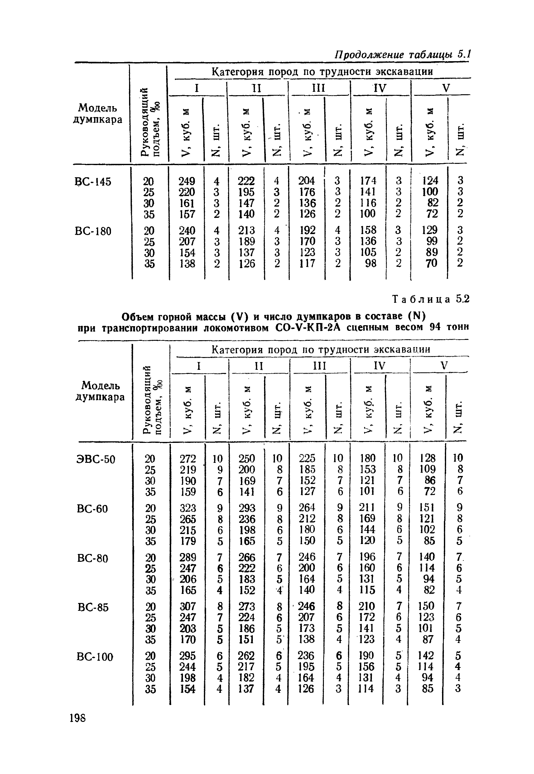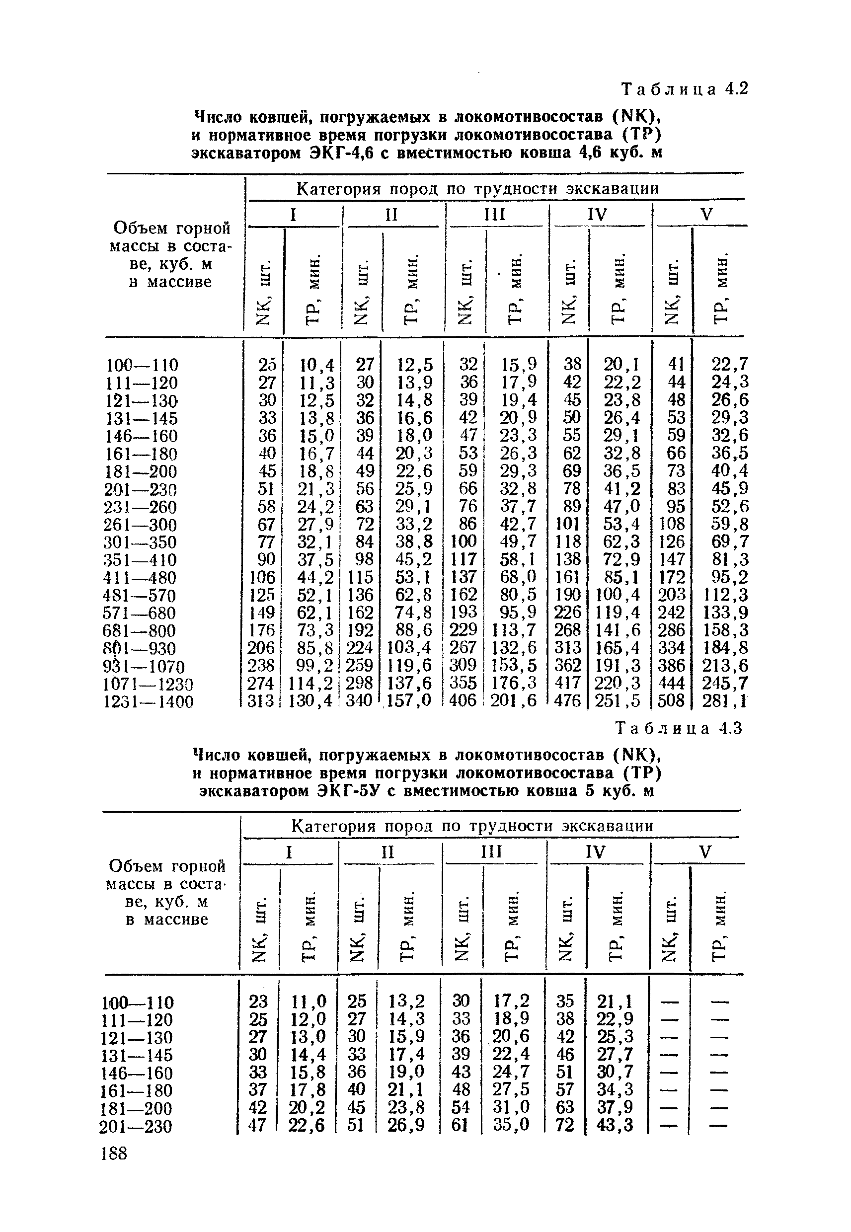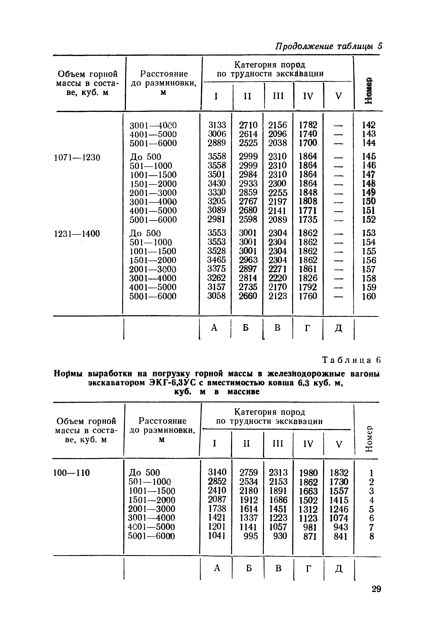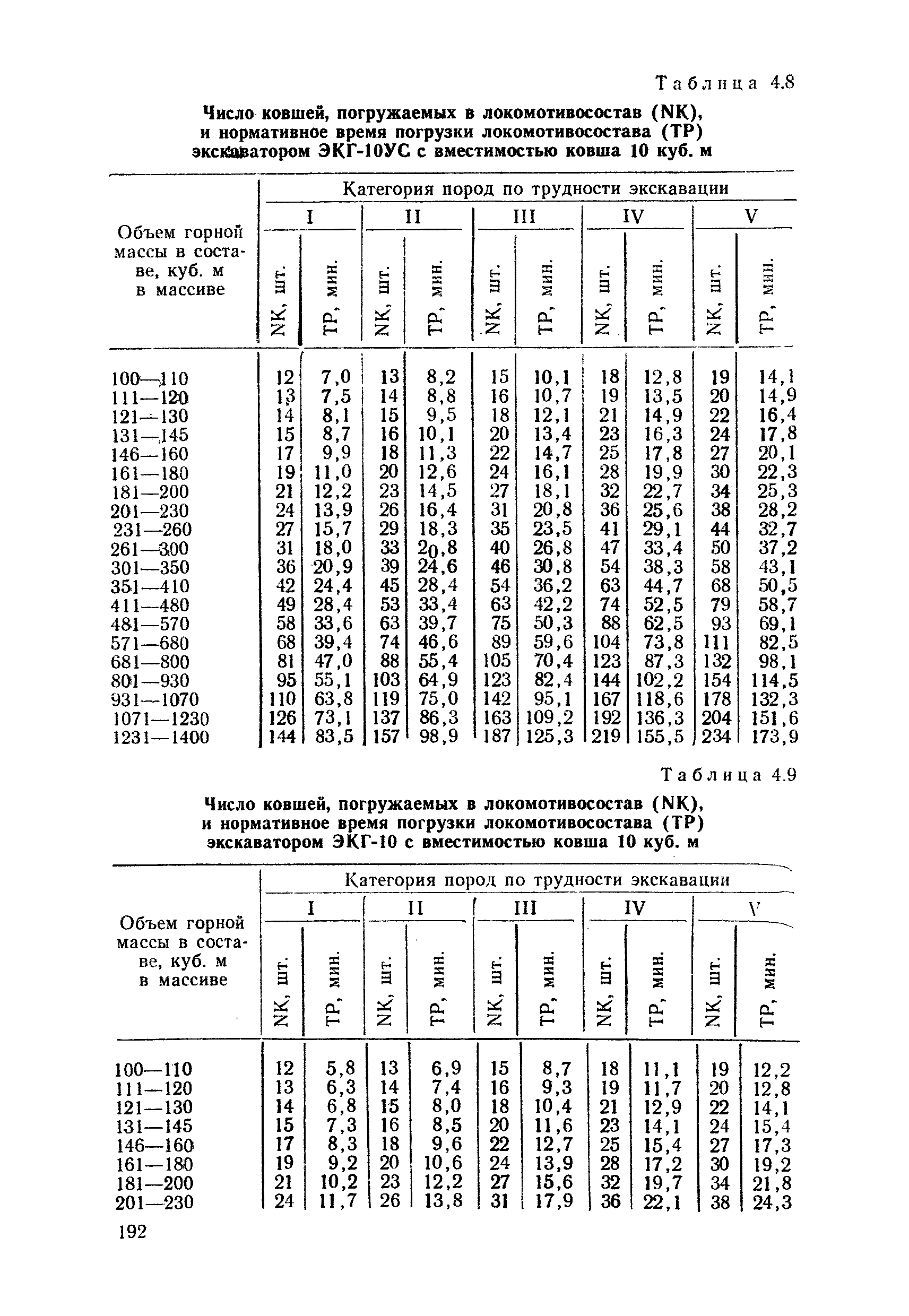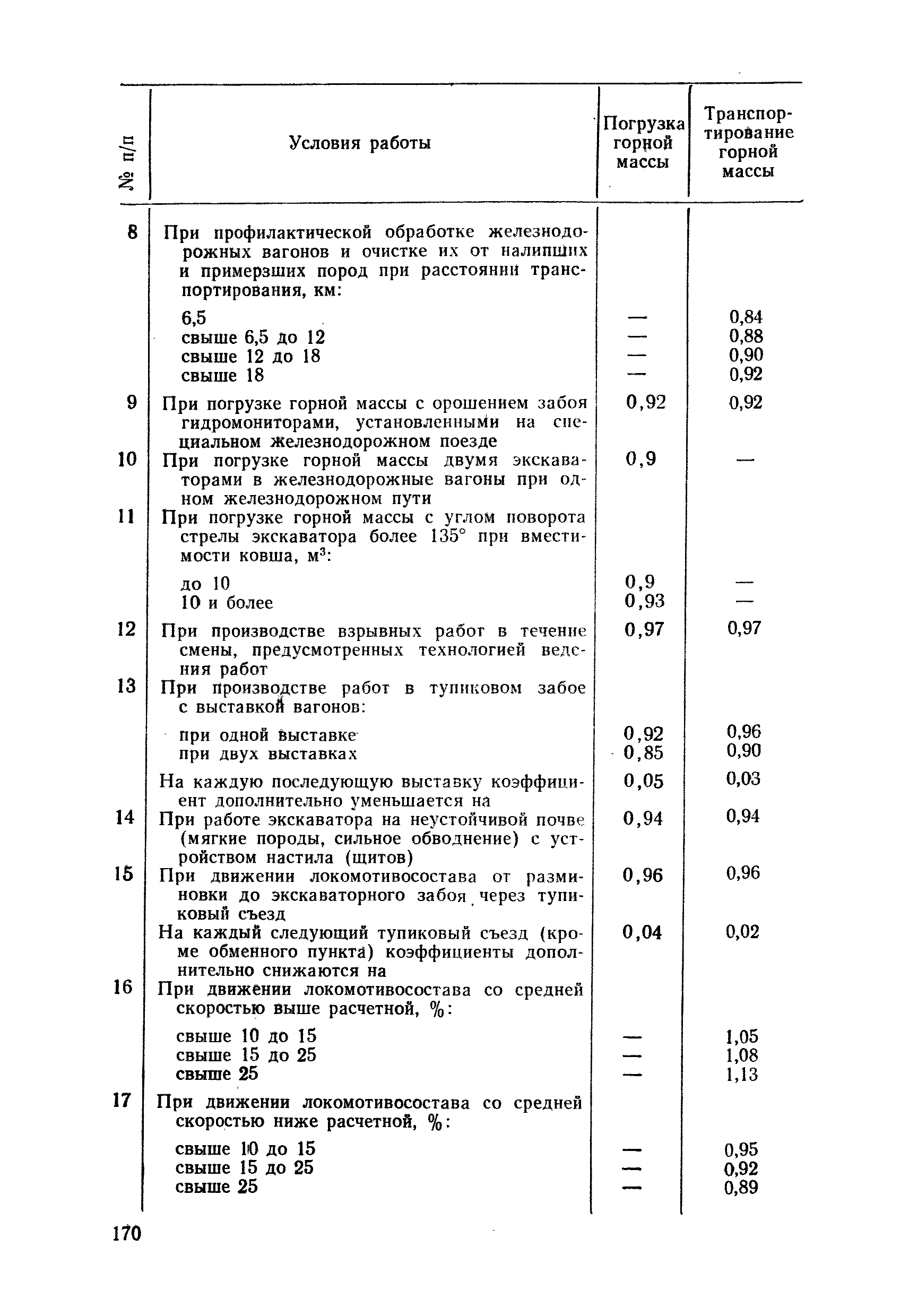 | Оглавление: | Общая часть Нормативная часть 1. Погрузка горной массы одноковшовыми экскаваторами типа прямая лопата и драглайн в железнодорожные вагоны (думпкары) 1.1. Организация работы 1.2. Содержание работы 1.3. Численный и профессиональный состав экипажа экскаватора 1.4. Факторы, влияющие на величину нормы выработки при погрузке горной массы Нормы выработки на погрузку горной нассы в железнодорожные вагоны, таблицы 1 - 14 2. Транспортирование горной массы локомотивосоставами 2.1. Организация работы 2.2. Содержание работы 2.3. Состав бригады 2.4. Факторы, влияющие на величину нормы выработки Нормы выработки на транспортирование горной массы локомотивосоставами при погрузке экскаваторами, таблицы 15 - 28 3. Поправочные коэффициенты к нормам выработки на погрузку и транспортирование горной массы Приложение 1. Методика расчета норм выработки Приложение 2. Технические и расчетные данные для расчета норм выработки Приложение 3. Нормативы времени на погрузку и транспортирование горной массы Приложение 4. Число ковшей, погружаемых в локомотивосостав, и нормативное время погрузки локомотивосостава Приложение 5. Допустимый объем горной массы в массиве и количество думпкаров в одном составе Приложение 6. Определение средневзвешенной нормы выработки Приложение 7. Определение нормы выработки при изменении объемного веса горных пород |