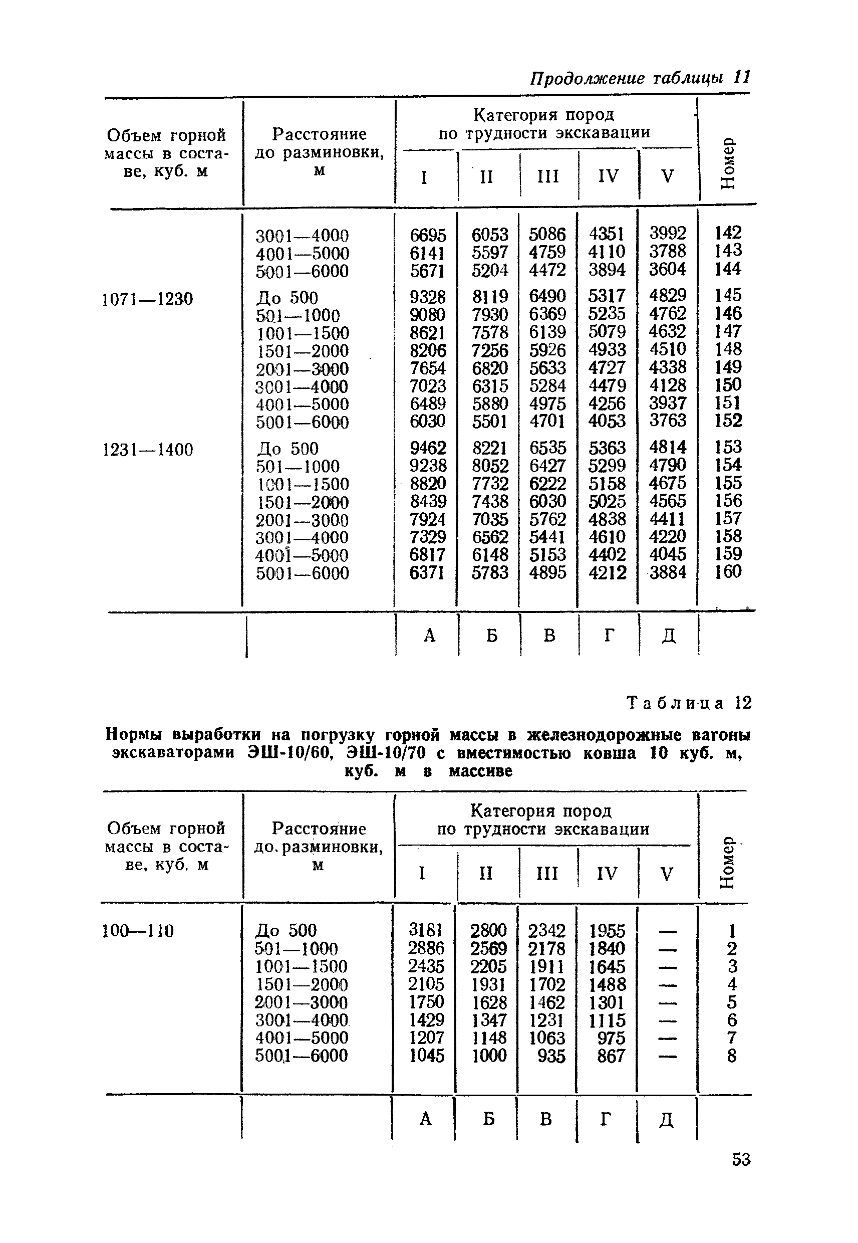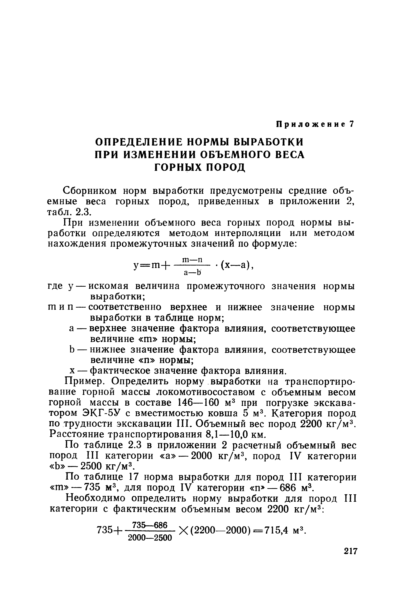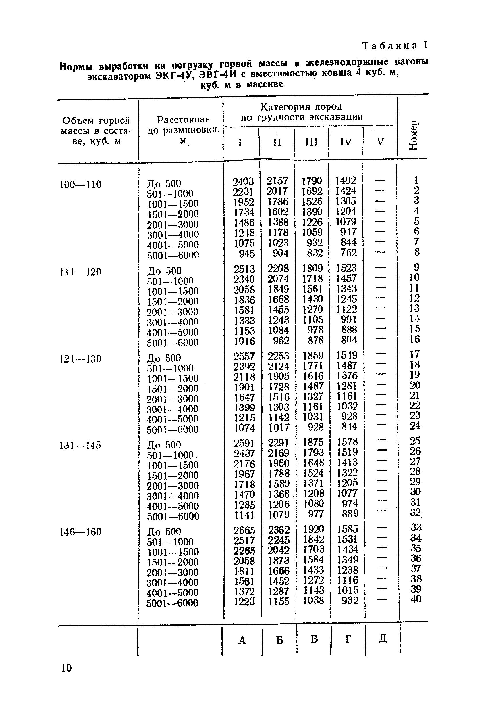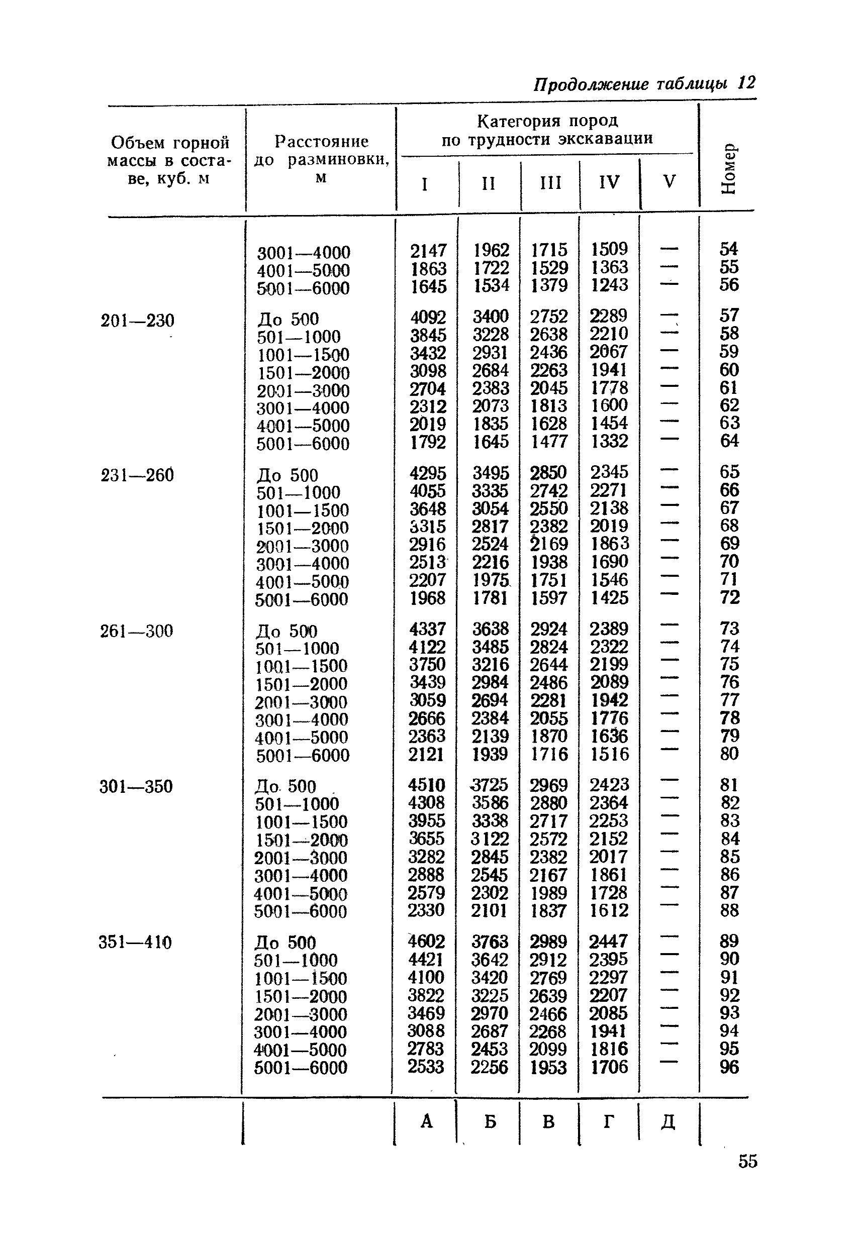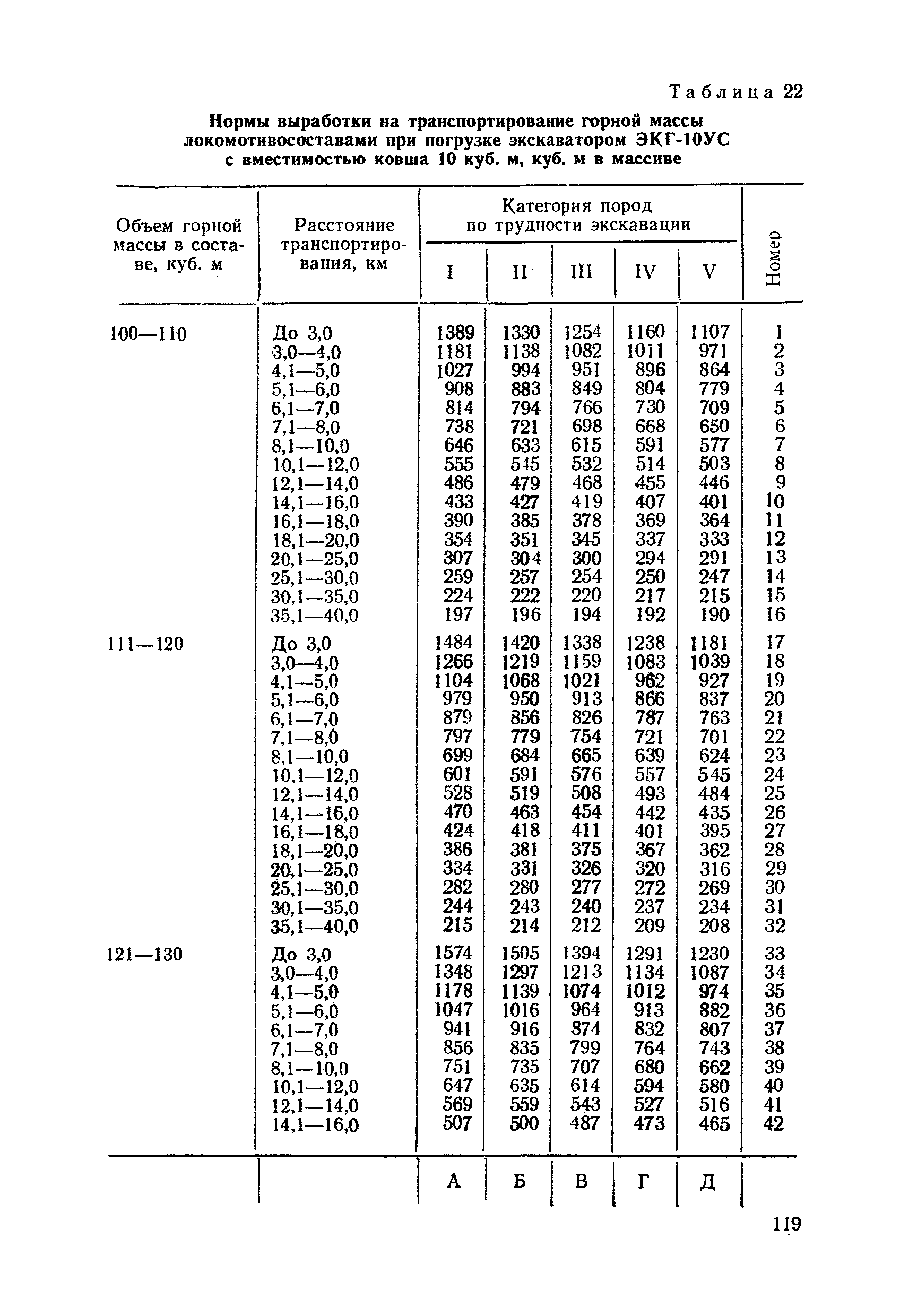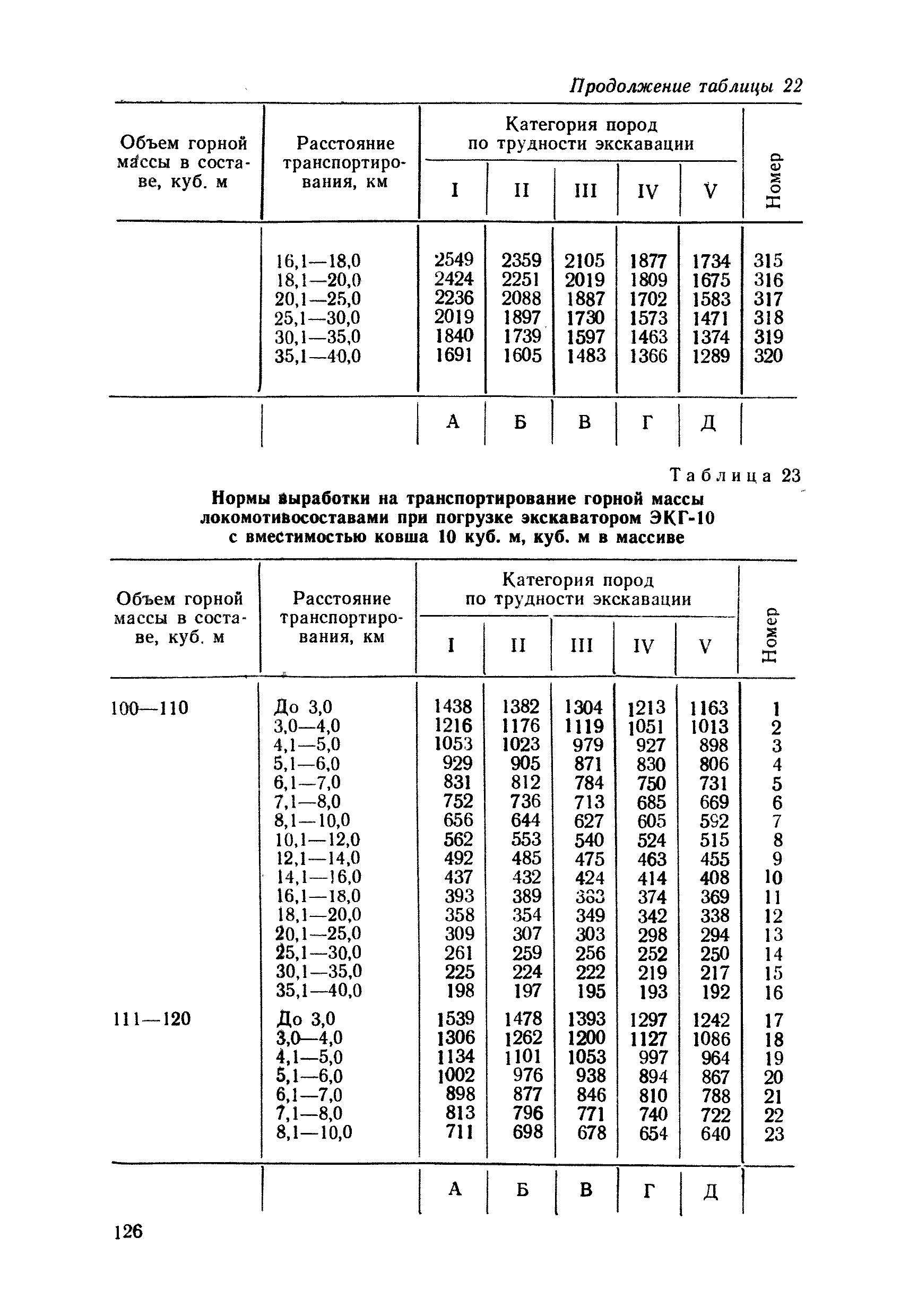 | Оглавление: | Общая часть Нормативная часть 1. Погрузка горной массы одноковшовыми экскаваторами типа прямая лопата и драглайн в железнодорожные вагоны (думпкары) 1.1. Организация работы 1.2. Содержание работы 1.3. Численный и профессиональный состав экипажа экскаватора 1.4. Факторы, влияющие на величину нормы выработки при погрузке горной массы Нормы выработки на погрузку горной нассы в железнодорожные вагоны, таблицы 1 - 14 2. Транспортирование горной массы локомотивосоставами 2.1. Организация работы 2.2. Содержание работы 2.3. Состав бригады 2.4. Факторы, влияющие на величину нормы выработки Нормы выработки на транспортирование горной массы локомотивосоставами при погрузке экскаваторами, таблицы 15 - 28 3. Поправочные коэффициенты к нормам выработки на погрузку и транспортирование горной массы Приложение 1. Методика расчета норм выработки Приложение 2. Технические и расчетные данные для расчета норм выработки Приложение 3. Нормативы времени на погрузку и транспортирование горной массы Приложение 4. Число ковшей, погружаемых в локомотивосостав, и нормативное время погрузки локомотивосостава Приложение 5. Допустимый объем горной массы в массиве и количество думпкаров в одном составе Приложение 6. Определение средневзвешенной нормы выработки Приложение 7. Определение нормы выработки при изменении объемного веса горных пород |