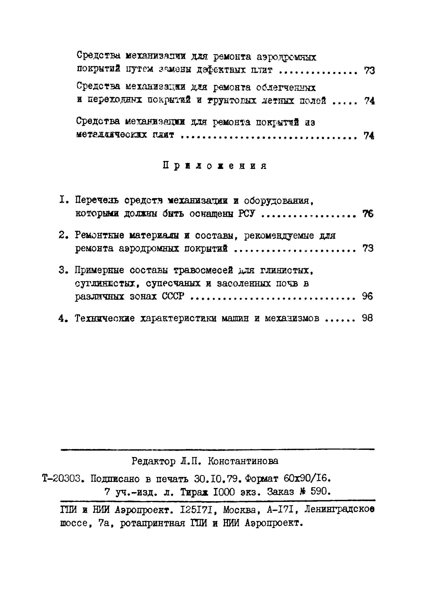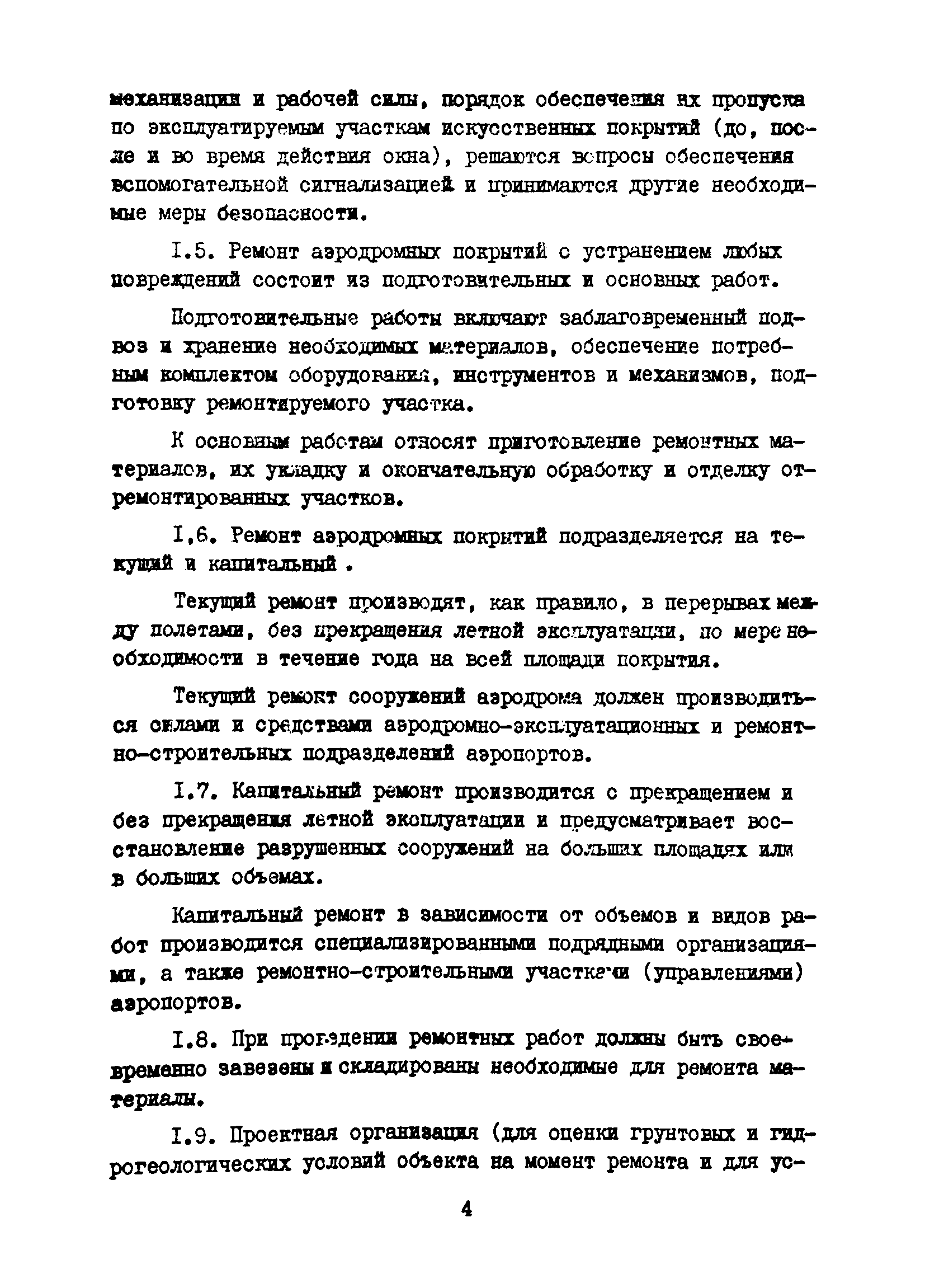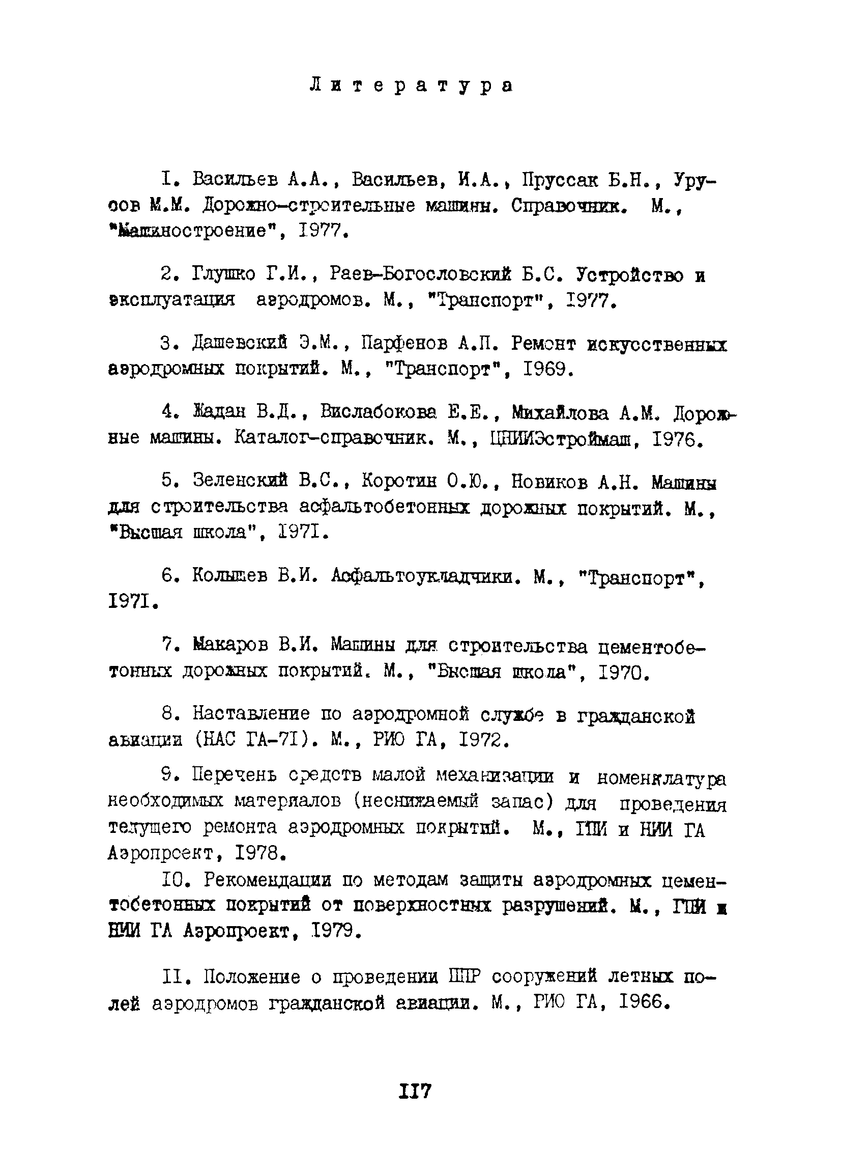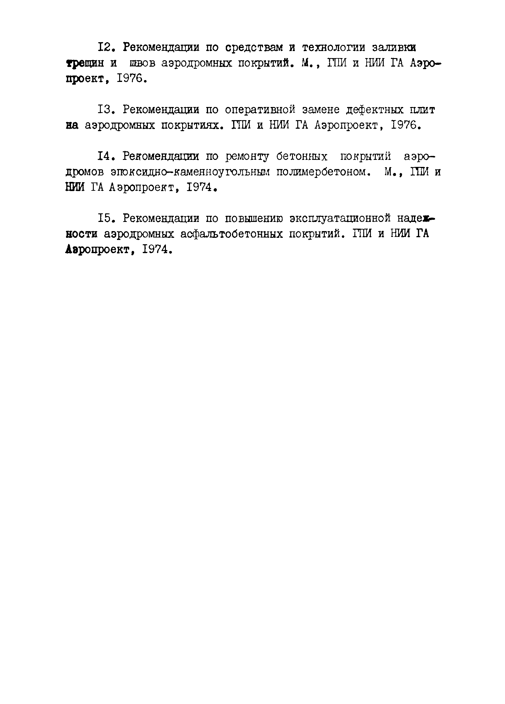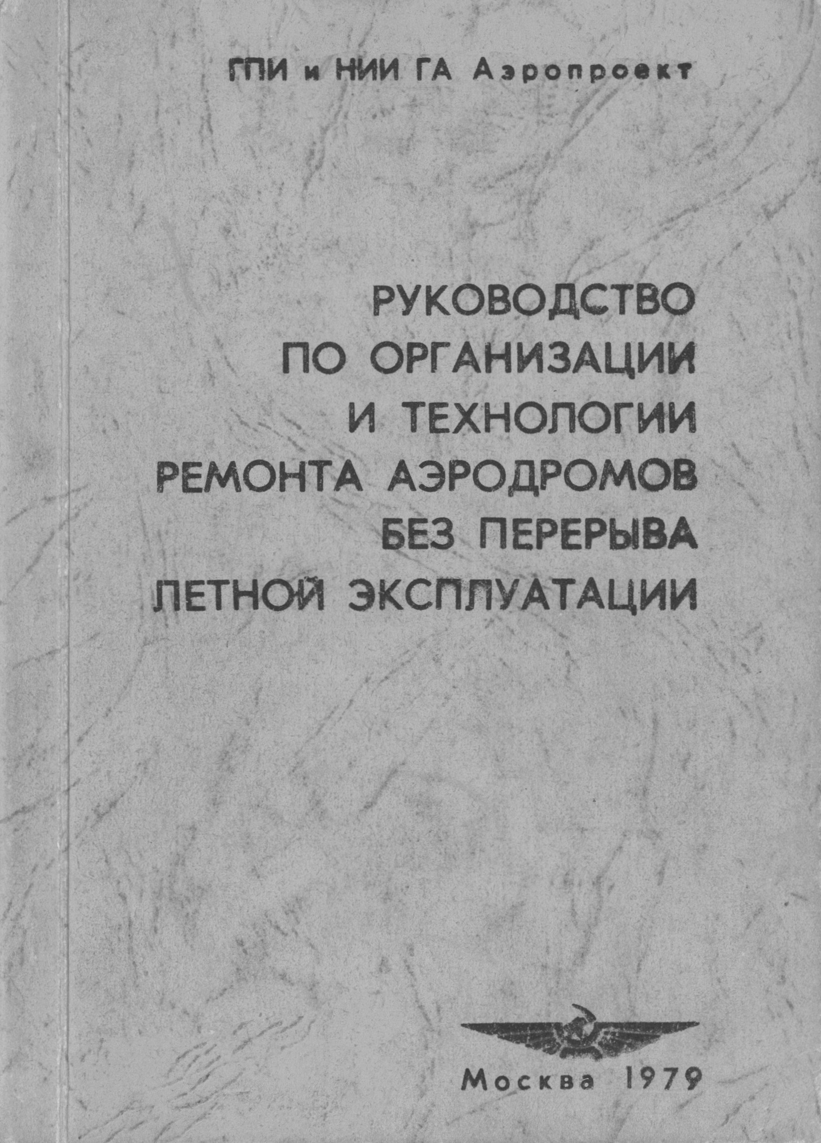 | Оглавление: | 1 Общие положения 2 Организация ремонта аэродромных покрытий Организация ремонтных служб в аэропортах Особенности организации текущего ремонта Особенности организации капитального ремонта 3 Технология ремонта аэродромных покрытий Текущий ремонт цементобетонных покрытий Капитальный ремонт цементобетонных покрытий и их разновидностей Текущий ремонт асфальтобетонных покрытий Капитальный ремонт асфальтобетонных покрытий Ремонт облегченных покрытий Ремонт покрытий переходного типа Ремонт покрытий из металлических плит Ремонт грунтовых летных полей 4 Технология ремонта водоотводных и дренажных систем 5 Механизация ремонтных работ Средства механизации для текущего ремонта цементобетонных аэродромных покрытий Средства механизации для текущего ремонта асфальтобетонных аэродромных покрытий Средства механизации для капитального ремонта цементобетонных аэродромных покрытий Средства механизации для капитального ремонта асфальтобетонных аэродромных покрытий Средства механизации для ремонта аэродромных покрытий путем замены дефектных плит Средства механизации для ремонта облегченных и переходных покрытий и грунтовых летных полей Средства механизации для ремонта покрытий из металлических плит Приложение 1. Перечень средств механизации и оборудования, которыми должны быть оснащены РСУ Приложение 2. Ремонтные материалы и составы, рекомендуемые для ремонта аэродромных покрытий Приложение 3. Примерные составы травосмесей для глинистых, суглинистых, супесчаных и засоленных почв в различных зонах СССР Приложение 4. Технические характеристики машин и механизмов |