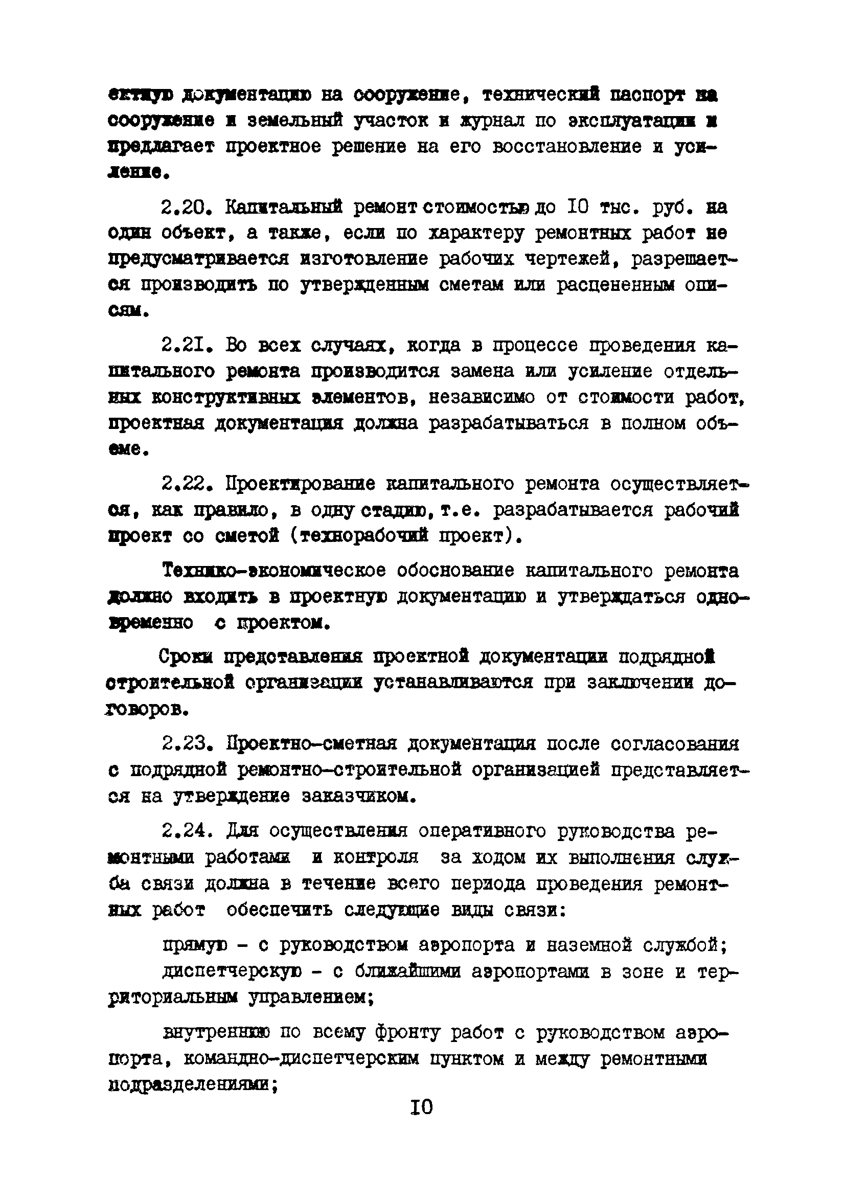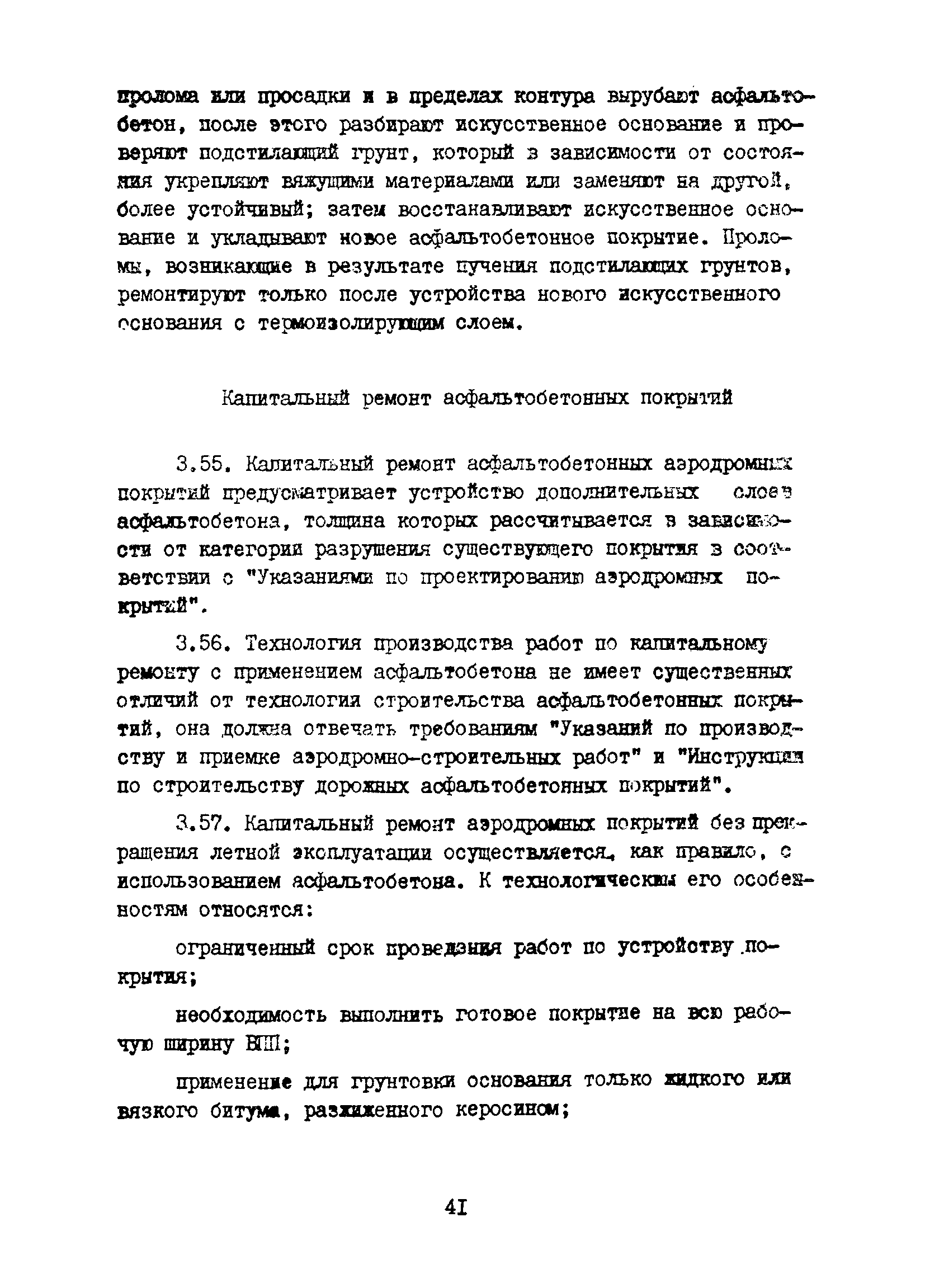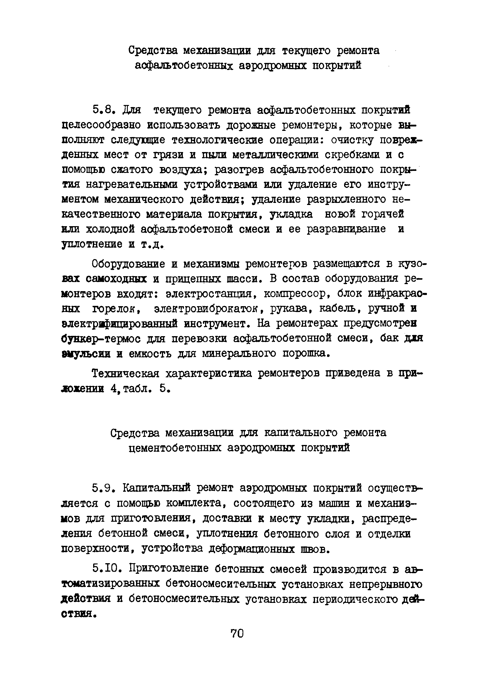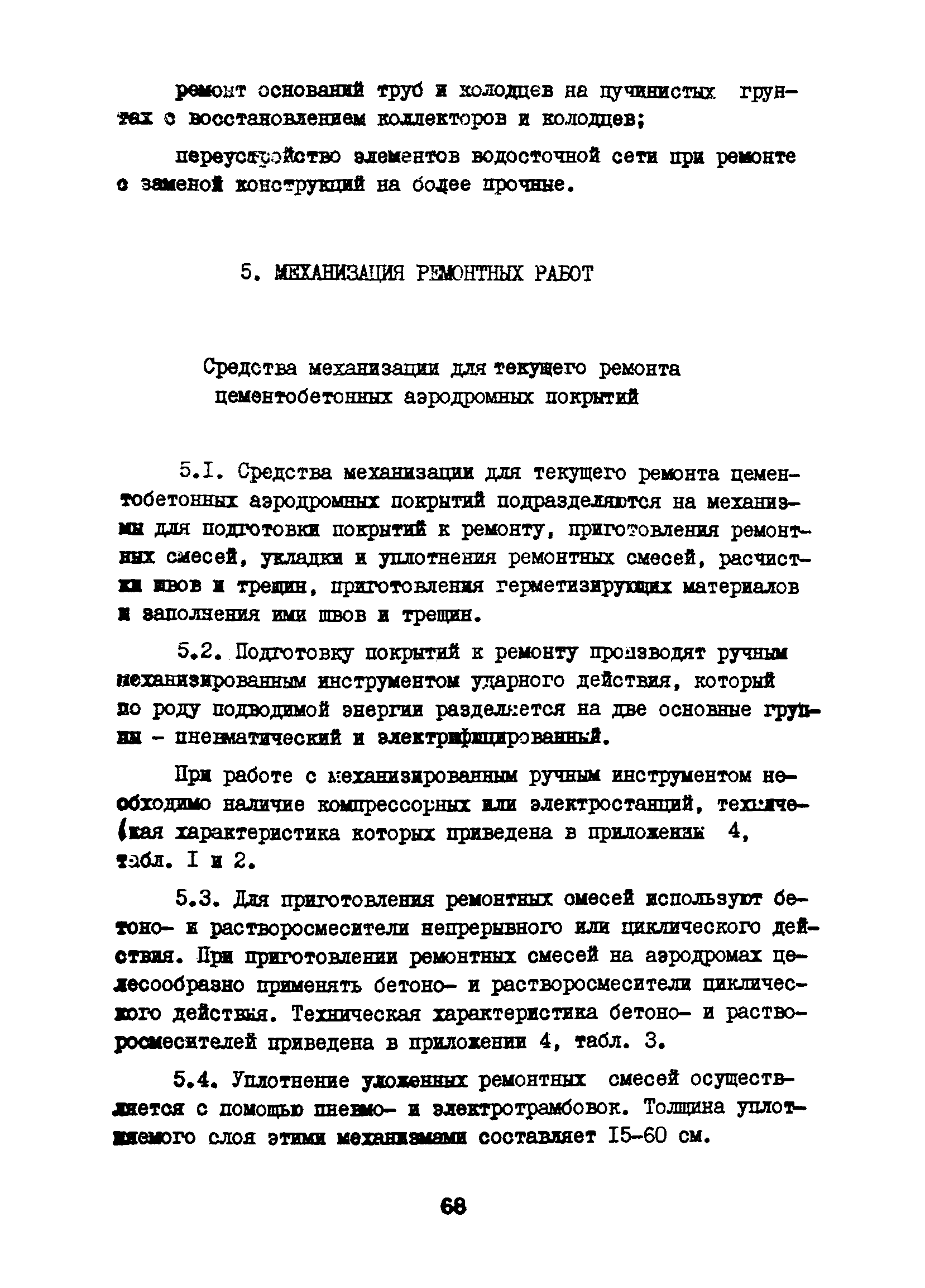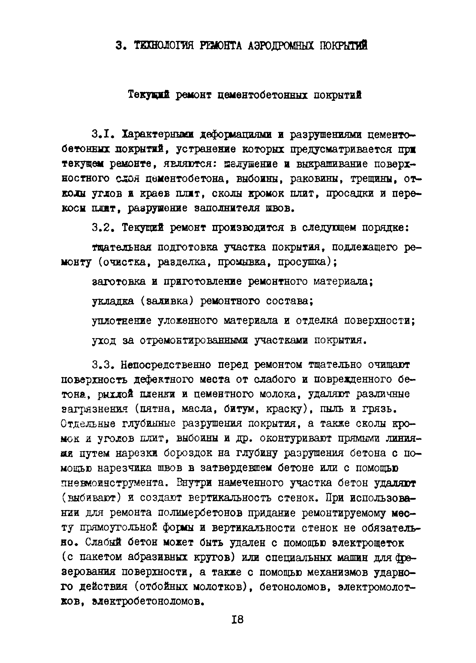 | Оглавление: | 1 Общие положения 2 Организация ремонта аэродромных покрытий Организация ремонтных служб в аэропортах Особенности организации текущего ремонта Особенности организации капитального ремонта 3 Технология ремонта аэродромных покрытий Текущий ремонт цементобетонных покрытий Капитальный ремонт цементобетонных покрытий и их разновидностей Текущий ремонт асфальтобетонных покрытий Капитальный ремонт асфальтобетонных покрытий Ремонт облегченных покрытий Ремонт покрытий переходного типа Ремонт покрытий из металлических плит Ремонт грунтовых летных полей 4 Технология ремонта водоотводных и дренажных систем 5 Механизация ремонтных работ Средства механизации для текущего ремонта цементобетонных аэродромных покрытий Средства механизации для текущего ремонта асфальтобетонных аэродромных покрытий Средства механизации для капитального ремонта цементобетонных аэродромных покрытий Средства механизации для капитального ремонта асфальтобетонных аэродромных покрытий Средства механизации для ремонта аэродромных покрытий путем замены дефектных плит Средства механизации для ремонта облегченных и переходных покрытий и грунтовых летных полей Средства механизации для ремонта покрытий из металлических плит Приложение 1. Перечень средств механизации и оборудования, которыми должны быть оснащены РСУ Приложение 2. Ремонтные материалы и составы, рекомендуемые для ремонта аэродромных покрытий Приложение 3. Примерные составы травосмесей для глинистых, суглинистых, супесчаных и засоленных почв в различных зонах СССР Приложение 4. Технические характеристики машин и механизмов |