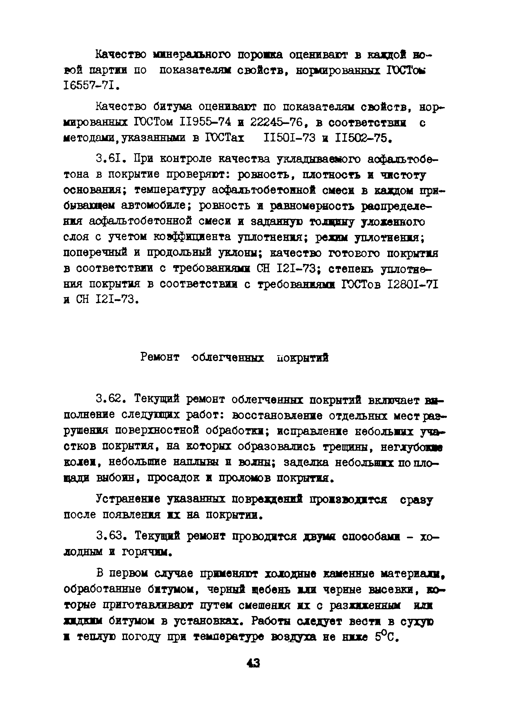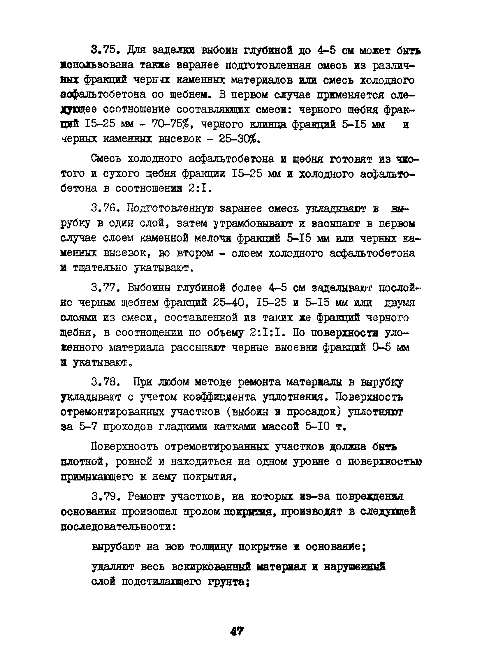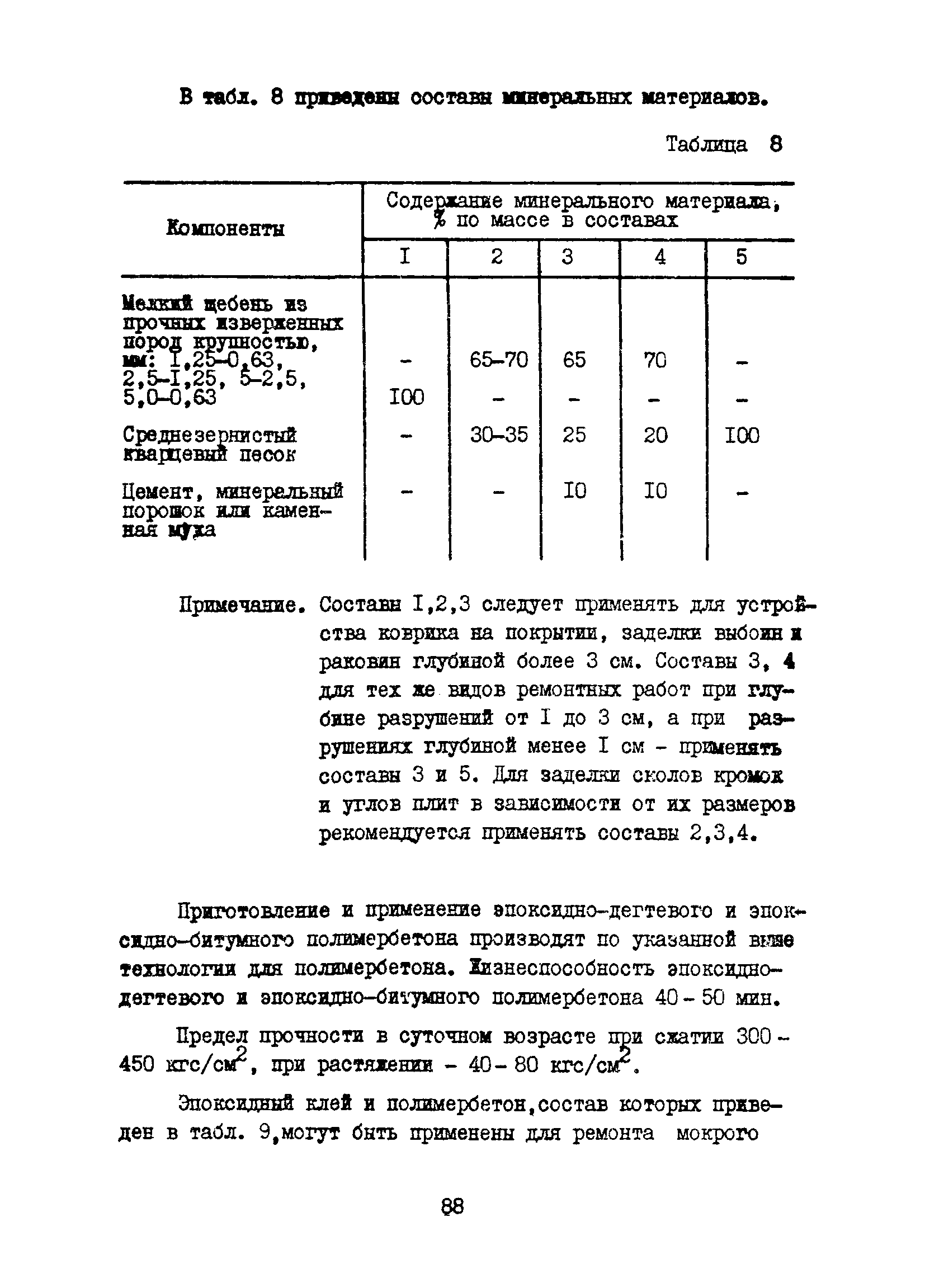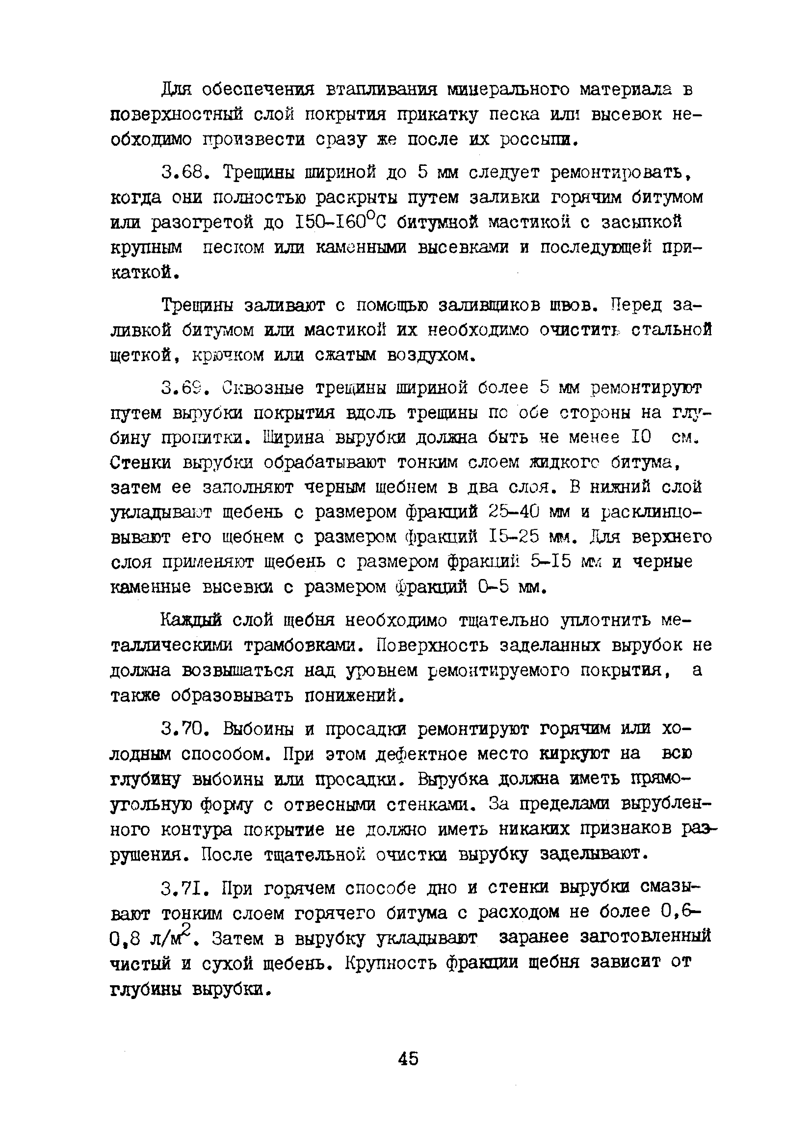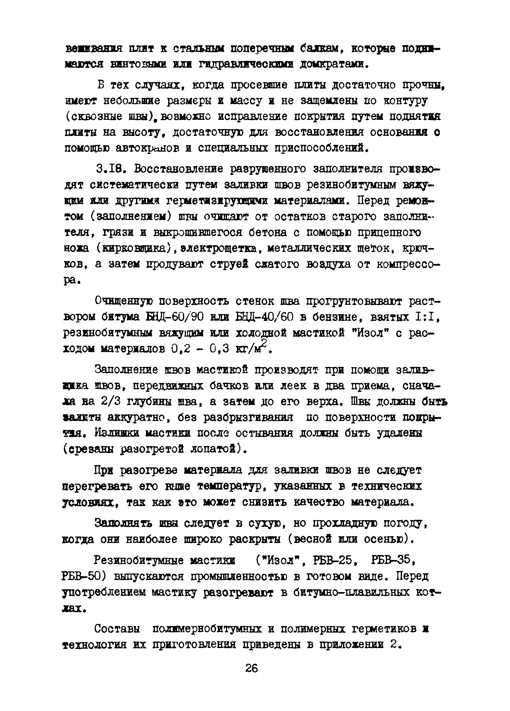 | Оглавление: | 1 Общие положения 2 Организация ремонта аэродромных покрытий Организация ремонтных служб в аэропортах Особенности организации текущего ремонта Особенности организации капитального ремонта 3 Технология ремонта аэродромных покрытий Текущий ремонт цементобетонных покрытий Капитальный ремонт цементобетонных покрытий и их разновидностей Текущий ремонт асфальтобетонных покрытий Капитальный ремонт асфальтобетонных покрытий Ремонт облегченных покрытий Ремонт покрытий переходного типа Ремонт покрытий из металлических плит Ремонт грунтовых летных полей 4 Технология ремонта водоотводных и дренажных систем 5 Механизация ремонтных работ Средства механизации для текущего ремонта цементобетонных аэродромных покрытий Средства механизации для текущего ремонта асфальтобетонных аэродромных покрытий Средства механизации для капитального ремонта цементобетонных аэродромных покрытий Средства механизации для капитального ремонта асфальтобетонных аэродромных покрытий Средства механизации для ремонта аэродромных покрытий путем замены дефектных плит Средства механизации для ремонта облегченных и переходных покрытий и грунтовых летных полей Средства механизации для ремонта покрытий из металлических плит Приложение 1. Перечень средств механизации и оборудования, которыми должны быть оснащены РСУ Приложение 2. Ремонтные материалы и составы, рекомендуемые для ремонта аэродромных покрытий Приложение 3. Примерные составы травосмесей для глинистых, суглинистых, супесчаных и засоленных почв в различных зонах СССР Приложение 4. Технические характеристики машин и механизмов |