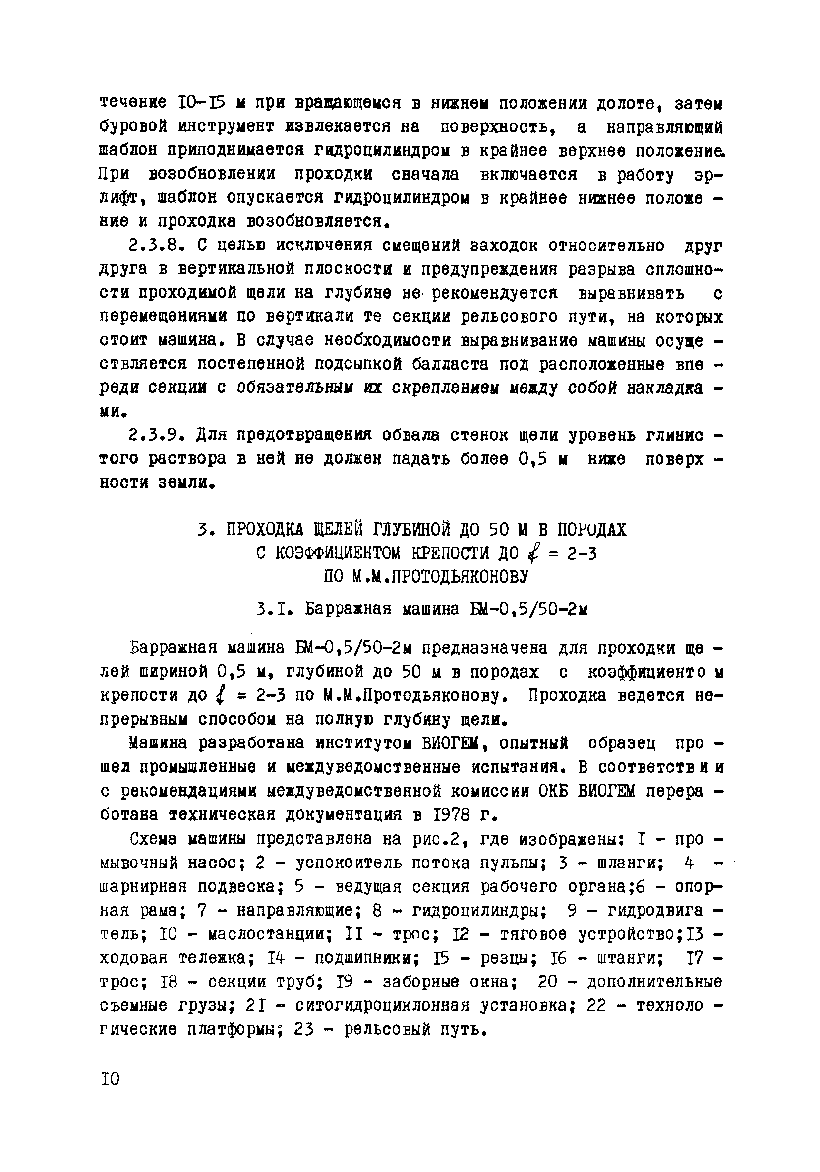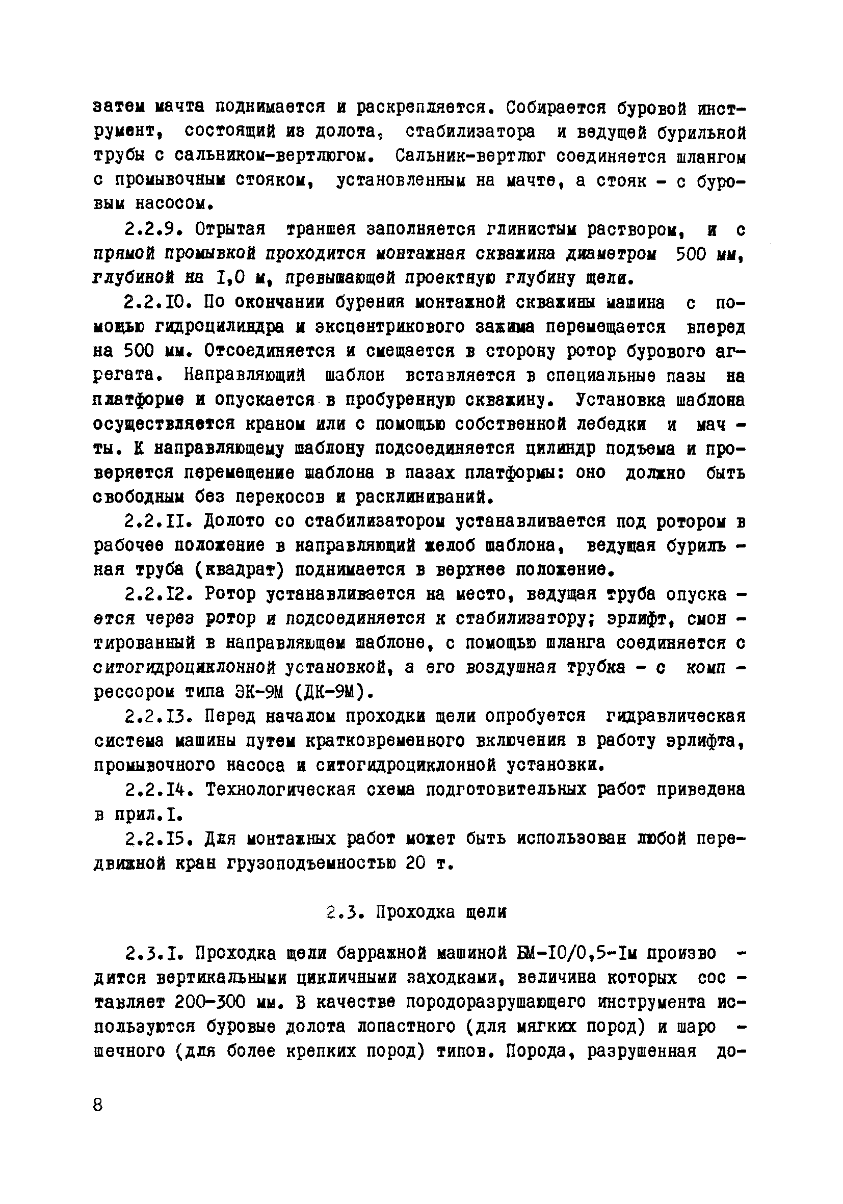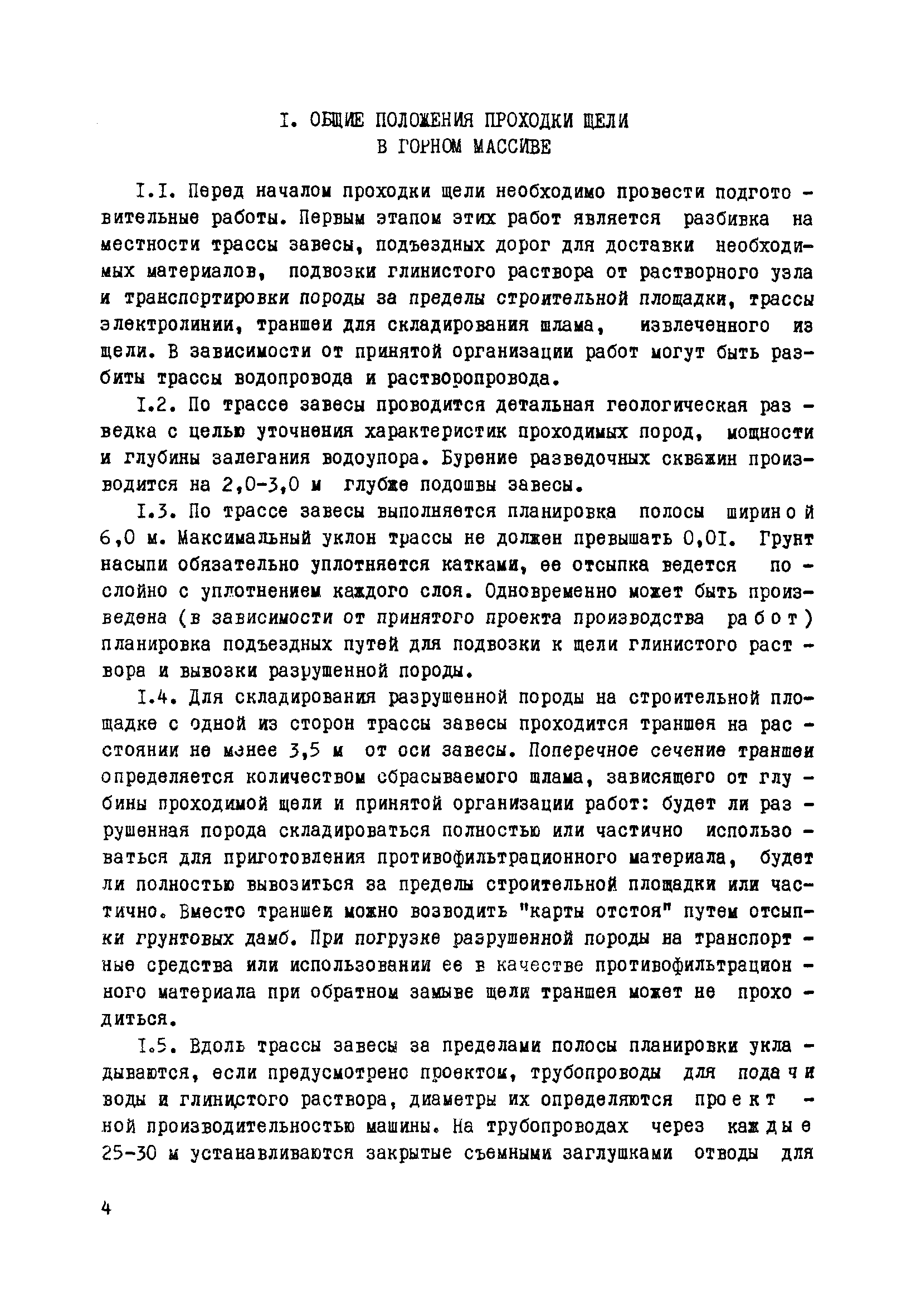 Методические указания по проходке щелей для противофильтрационных завес и несущих "стен в грунте"| Статус: | справочные материалы, мп, тпр | | Название рус.: | Методические указания по проходке щелей для противофильтрационных завес и несущих "стен в грунте" | | Дата добавления в базу: | 01.01.2018 | | Дата актуализации: | 01.01.2021 | | Дата введения: | 19.12.1979 | | Область применения: | Указания предназначены для использования при проектировании противофильтрационных завес и несущих "стен в грунте", а также для производственников, ведущих работы по проходке щелей | | Оглавление: | Введение 1 Общие положения проходки щели в горном массиве 2 Проходка щели глубиной до10 м в породах с коэффициентом крепости до f = 5 - 6 по М.М.Протодьяконову 2.1 Барражная машина БМ—10/0,5—1м 2.2 Подготовительные работы 2.3 Проходка щели 3 Проходка щели глубиной до 50 м в породах с коэффицентом крепости до f = 2—3 по М.М.Протодьяконову 3.1 Барражная машина БМ-0,5/50-2м 3.2 Подготовительные работы 3.3 Вывод машины БМ—05/50—2м на рабочий режим 3.4 Проходка щели Приложение 1. Технологическая схема работы машиной БМ—10/0,5—1м Приложение 2. Технологическая схема работы машиной БМ—0,5/20—2м | | Разработан: | ВИОГЕМ