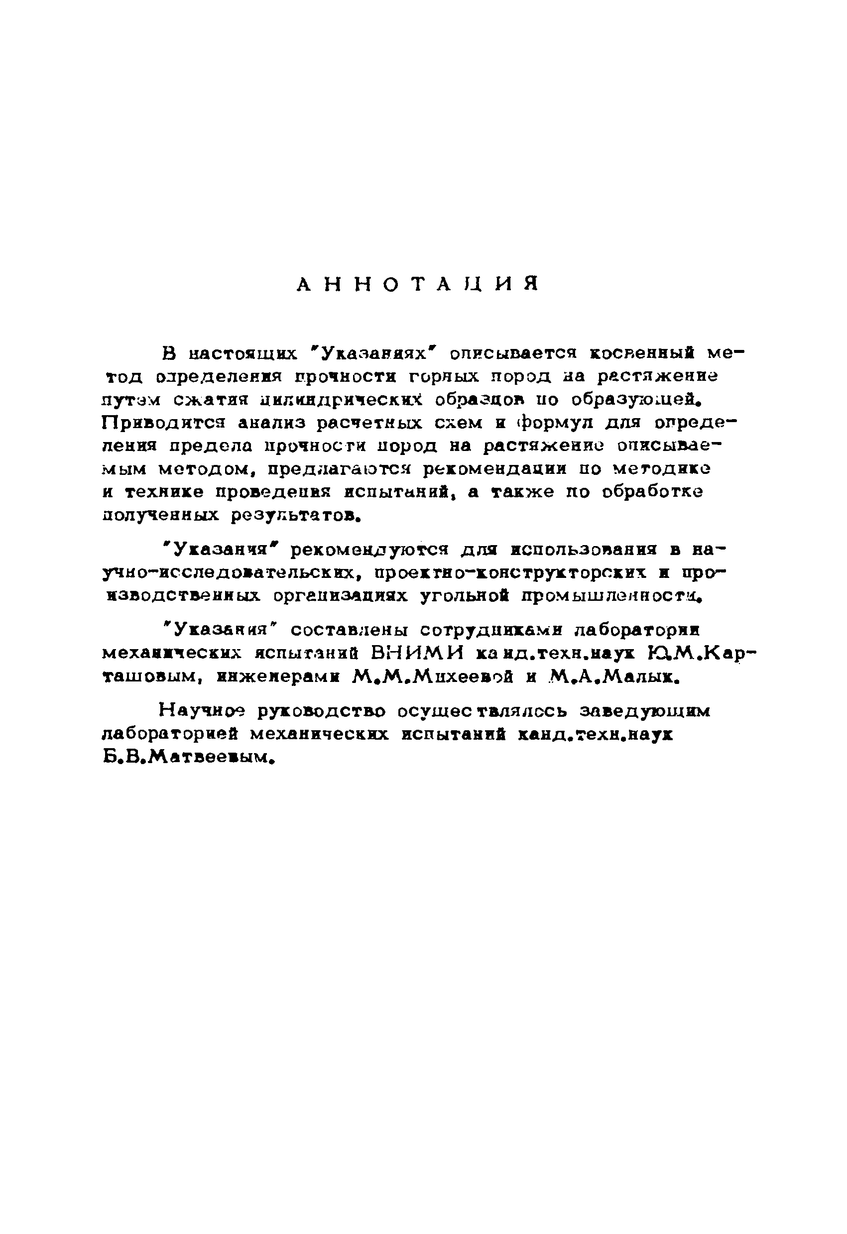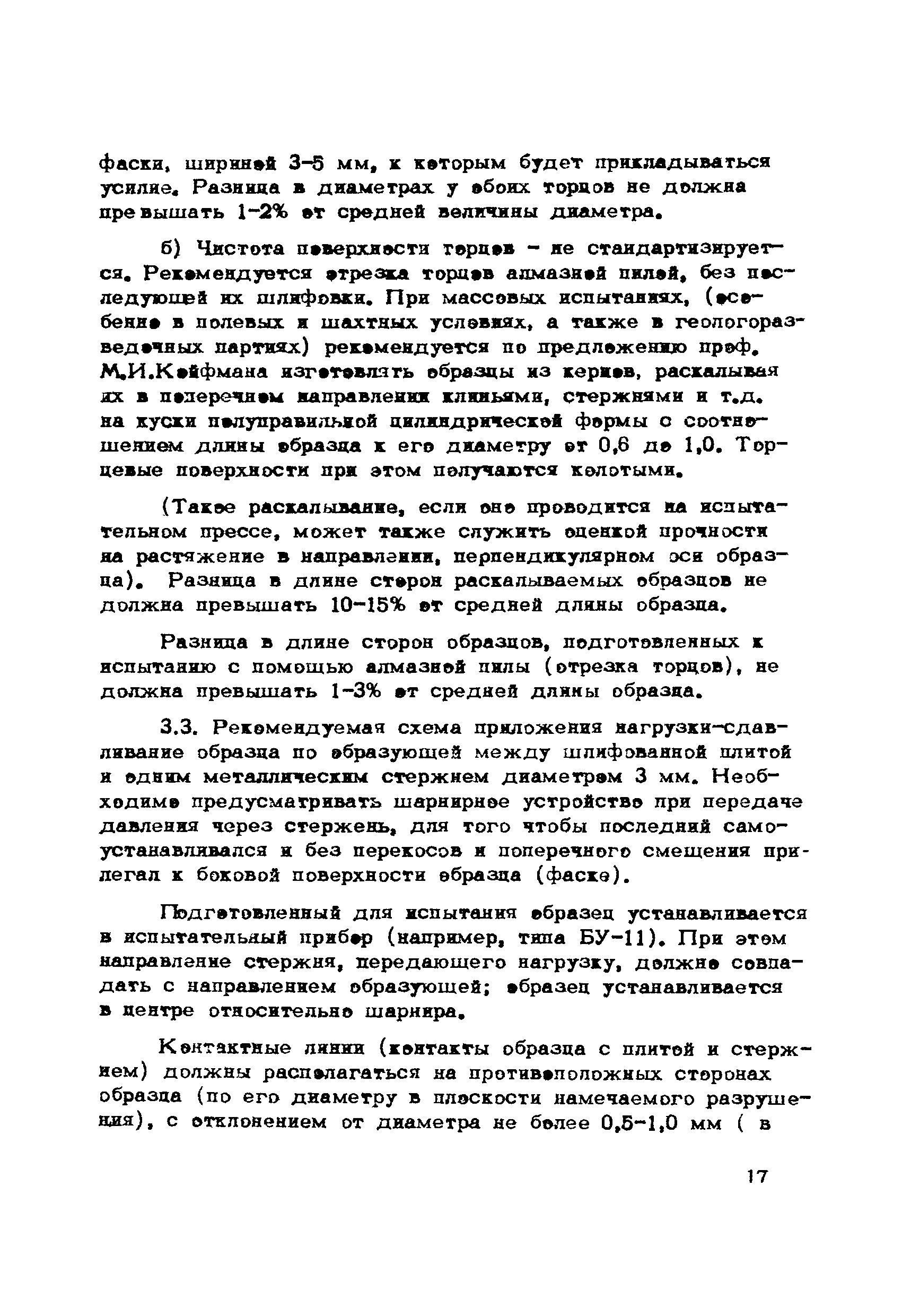 Методические указания по испытанию горных пород на растяжение методом сжатия цилиндрических образцов по образующей| Статус: | справочные материалы, мп, тпр | | Название рус.: | Методические указания по испытанию горных пород на растяжение методом сжатия цилиндрических образцов по образующей | | Дата добавления в базу: | 01.01.2018 | | Дата актуализации: | 01.01.2021 | | Область применения: | В документе описывается косвенный метод определения прочности горных пород на растяжение путем сжатия цилиндрических образцов по образующей и приводится анализ расчетных схем и формул для определения предела прочности пород на растяжение описываемым методом, предлагаются рекомендации по методике и технике проведения испытаний, а также по обработке полученных результатов | | Оглавление: | Введение 1 Состояние вопроса 2 Обоснование методики и техники проведения испытаний 3 Рекомендуемые методика и техника испытаний | | Разработан: | ВНИМИ