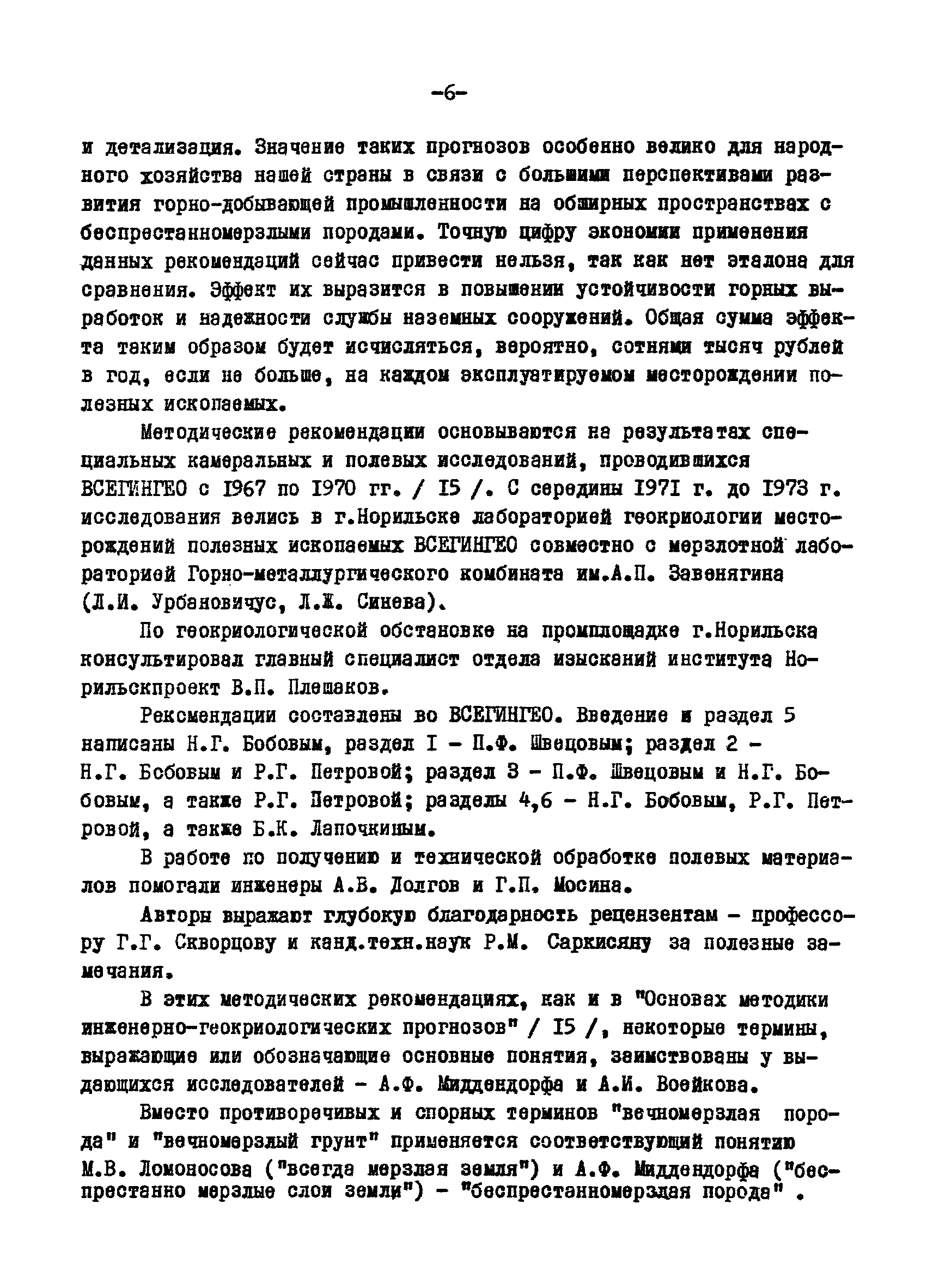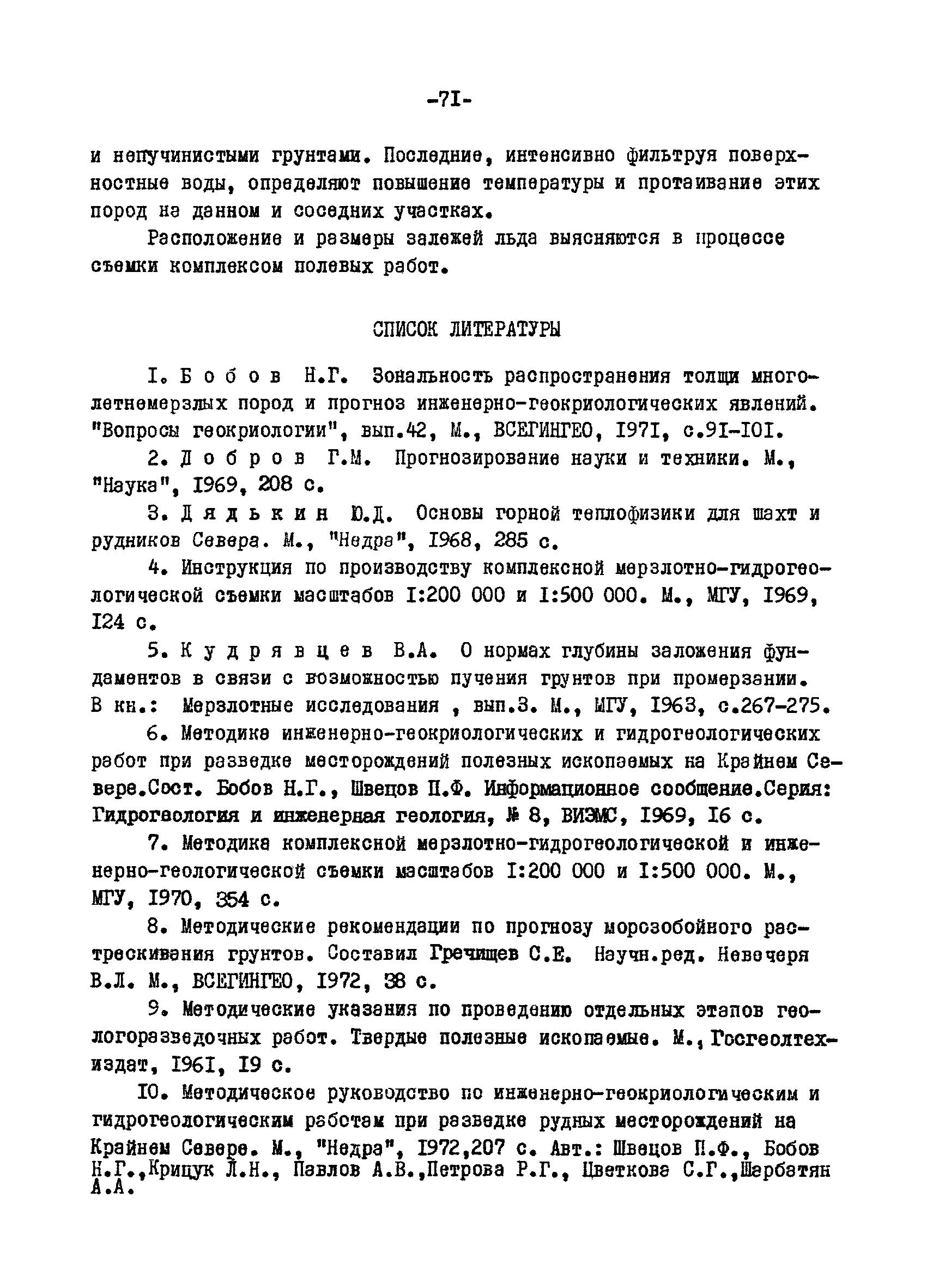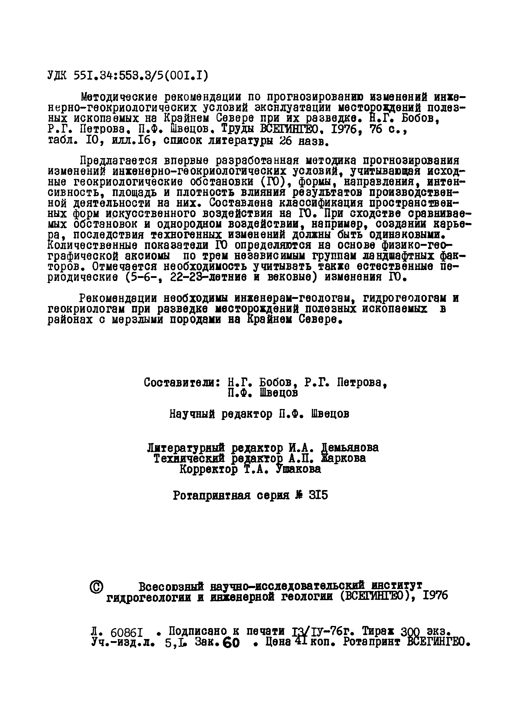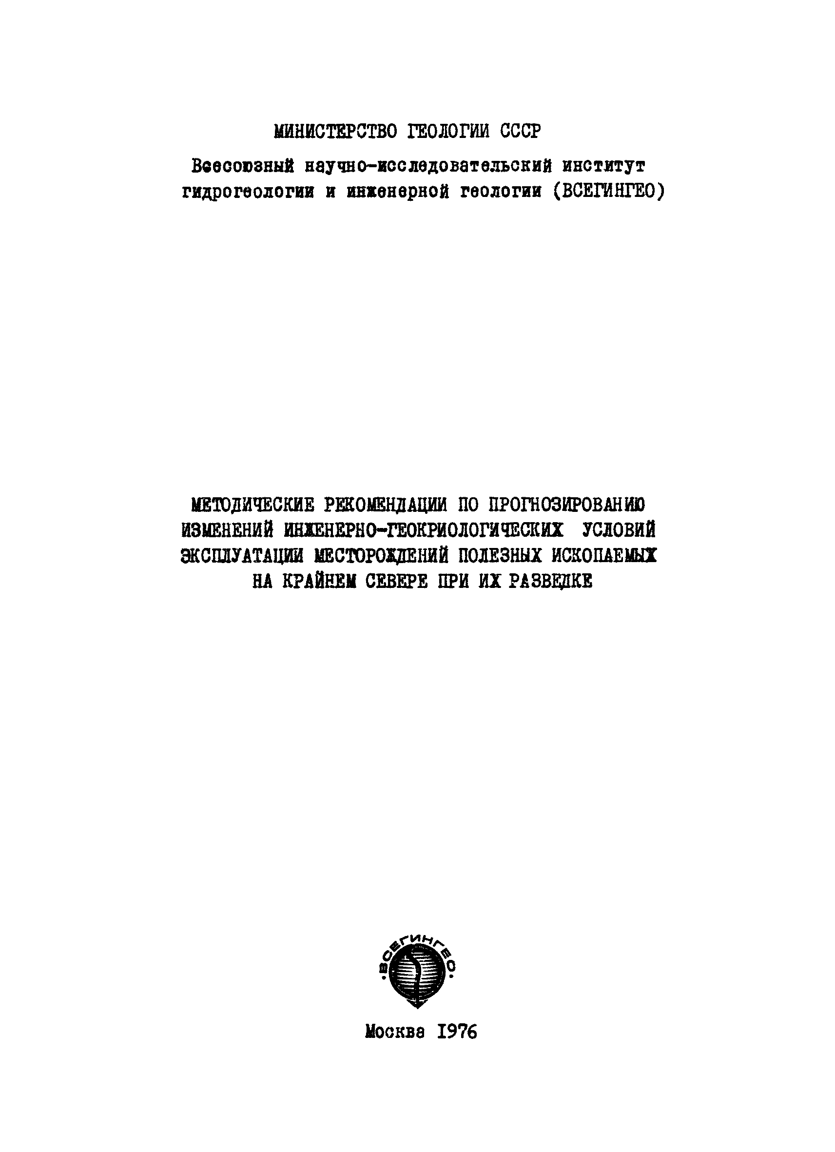 | Название рус.: | Методические рекомендации по прогнозированию изменений инженерно-геокриологических условий эксплуатации месторождений полезных ископаемых на Крайнем Севере при их разведке |