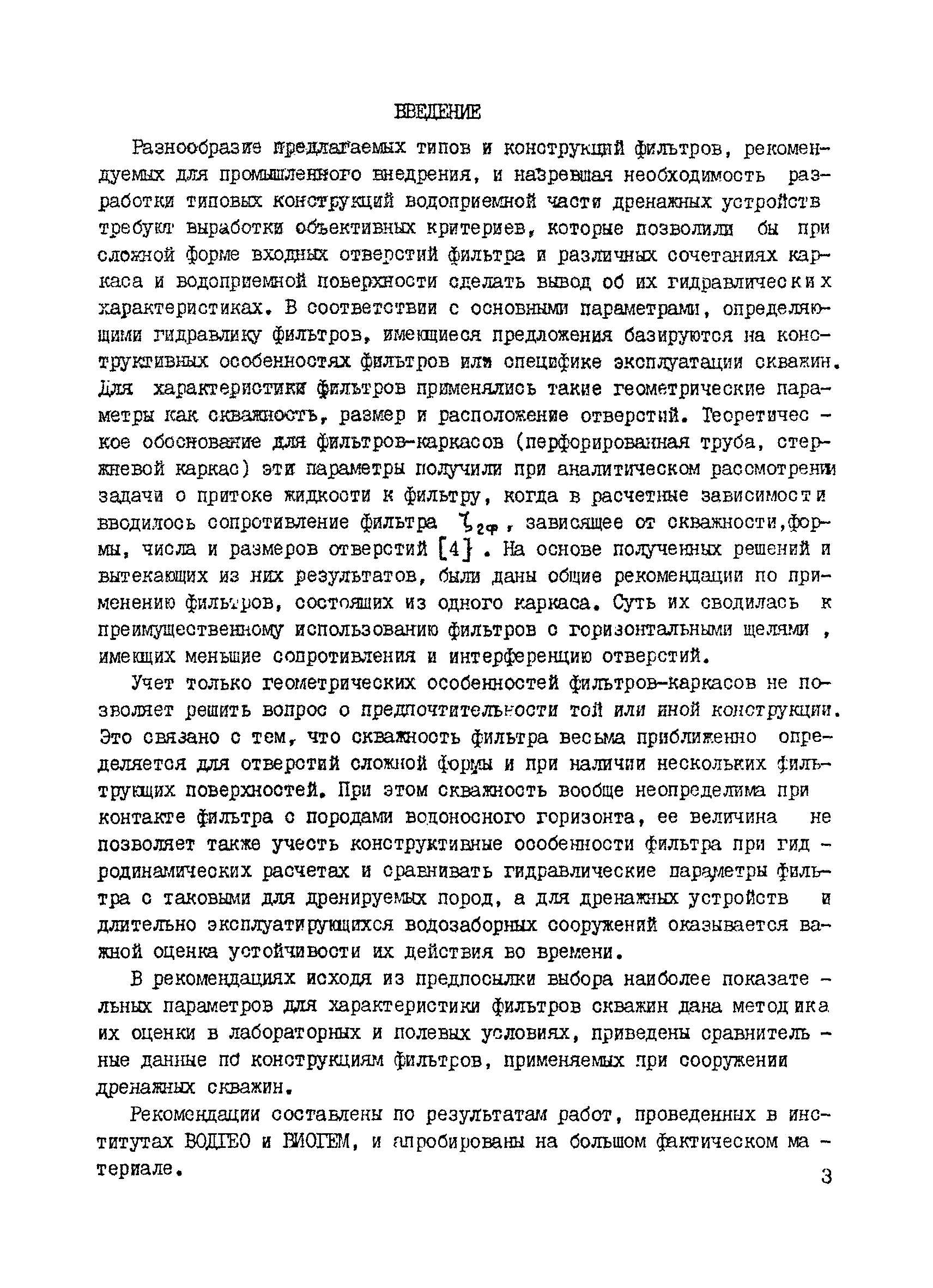 Методические рекомендации по оценке гидравлических параметров фильтров, применяемых при сооружении дренажных скважин| Статус: | справочные материалы, мп, тпр | | Название рус.: | Методические рекомендации по оценке гидравлических параметров фильтров, применяемых при сооружении дренажных скважин | | Дата добавления в базу: | 01.01.2018 | | Дата актуализации: | 01.01.2021 | | Область применения: | В работе изложена методика оценки гидравлических параметров фильтров в лабораторных и полевых условиях. Основу предлагаемой методики составляет определение коэффициента водопроницаемости фильтра на стендовой установке и коэффициента его старения в процессе эксплуатации дренажных скважин. Приводится сравнительная характеристика различных конструкций фильтров, даны рекомендации по их применению в производственных условиях. Рекомендации предназначены для производственных и проектных организаций, могут быть использованы при оценке новых конструкций фильтров, решении задач осушения месторождений полезных ископаемых, сооружении водозаборных скважин | | Оглавление: | Введение 1 Гидравлические параметры фильтров скважин 2 Оценкак коэффициентов водопроницаемости фильтров скважин 3 Параметры кольматации фильтров скважин 4 Сравнительная характеристика фильтров дренажных скважин 5 Сравнительная характеристика параметров кольматажа различных конструкций водоприемной части Литература | | Разработан: | ВОДГЕО ВИОГЕМ