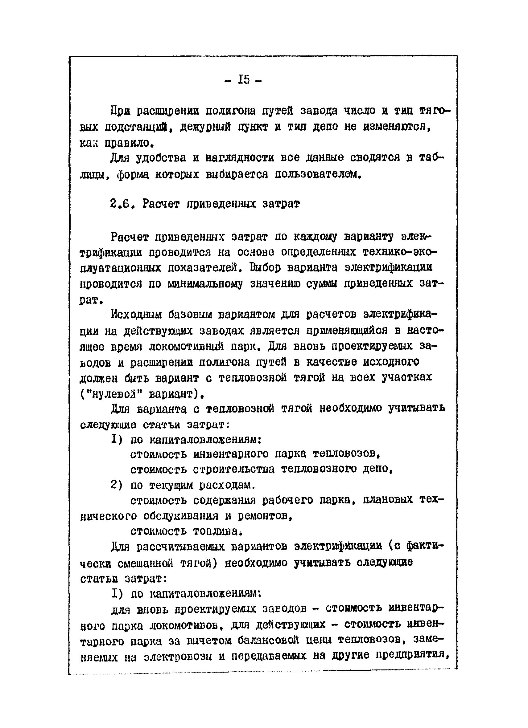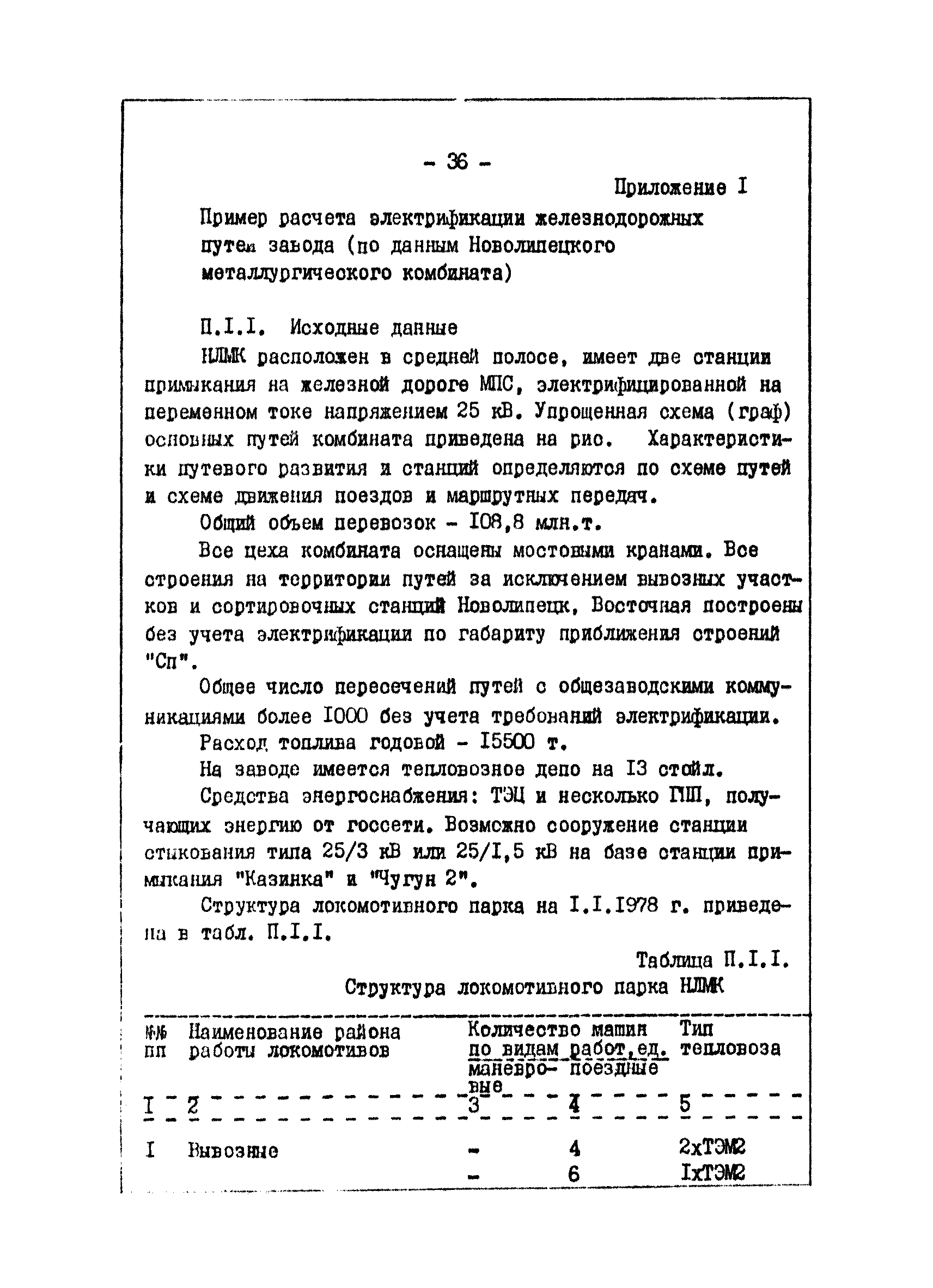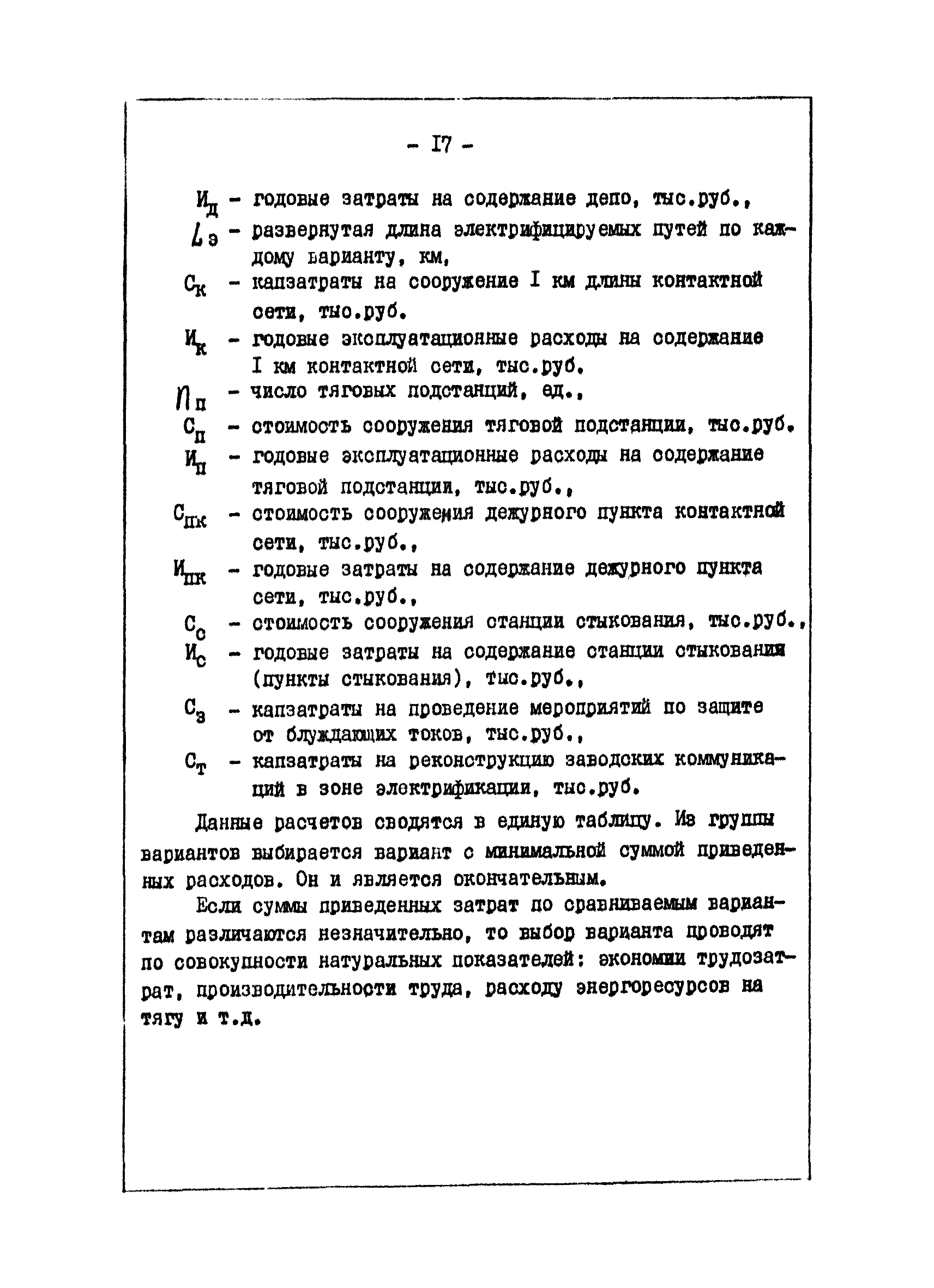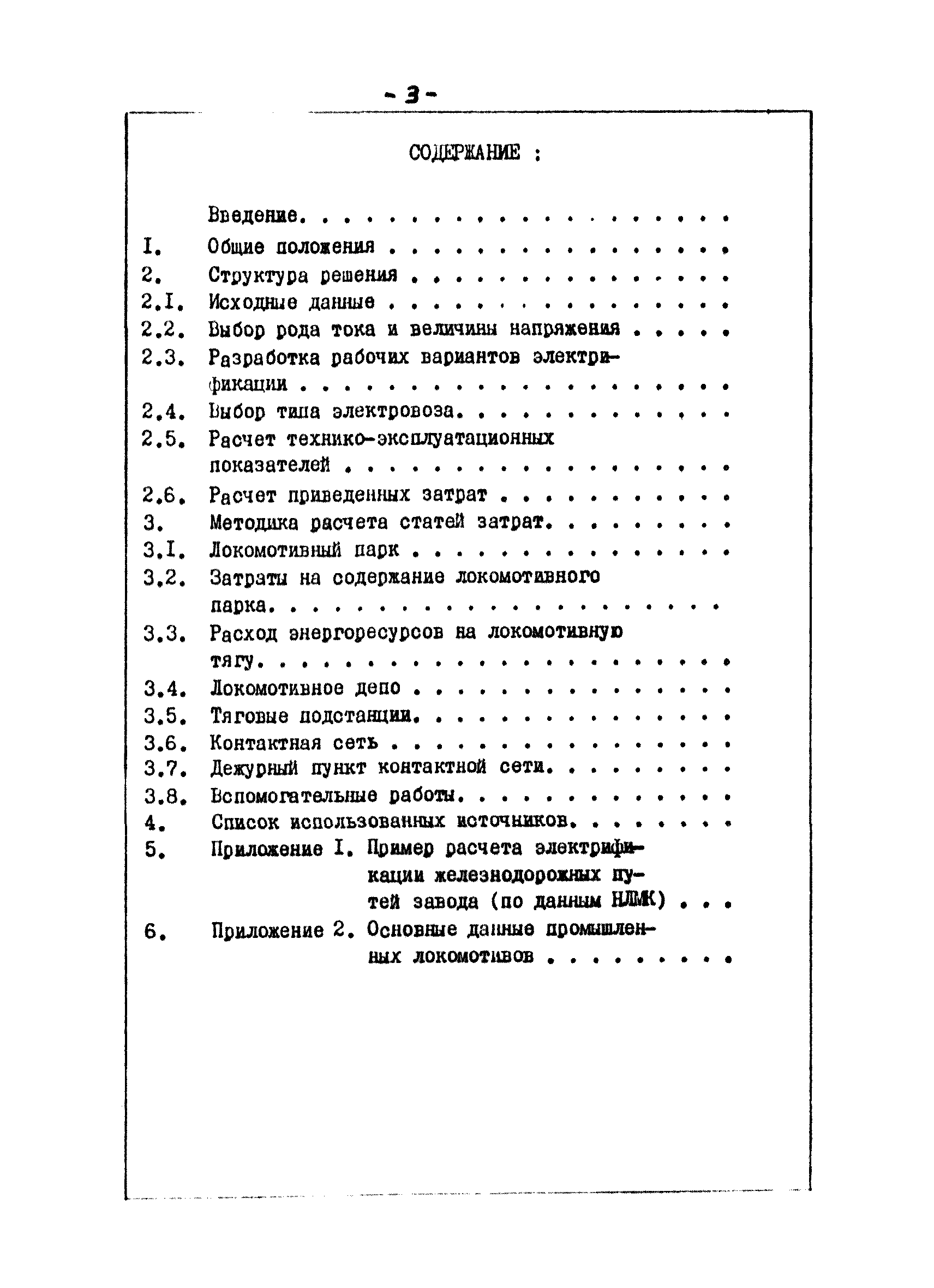 | Оглавление: | Введение 1 Общие положения 2 Структура решения 2.1 Исходные данные 2.2 Выбор рода тока и величины напряжения 2.3 Разработка рабочих вариантов электрификации 2.4 Выбор типа электровоза 2.5 Расчет технико—эксплуатационных показателей 2.6 Расчет приведенных затрат 3 Методика расчета статей затрат 3.1 Локомотивный парк 3.2 Затраты на содержание локомотивного парка 3.3 Расход энергоресурсов ка локомотивную тягу 3.4 Локомотивное депо 3.5 Тяговые подстанции 3.6 Контактная сеть 3.7 Дежурный лист контактной сети 3.8 Вспомогательные работы 4 Список использованных источников 5 Приложение 1. Пример расчета электрификации железнодорожных путей завода (по данным НЛМК) 6 Приложение 2. Основные данные промышленных локомотивов |