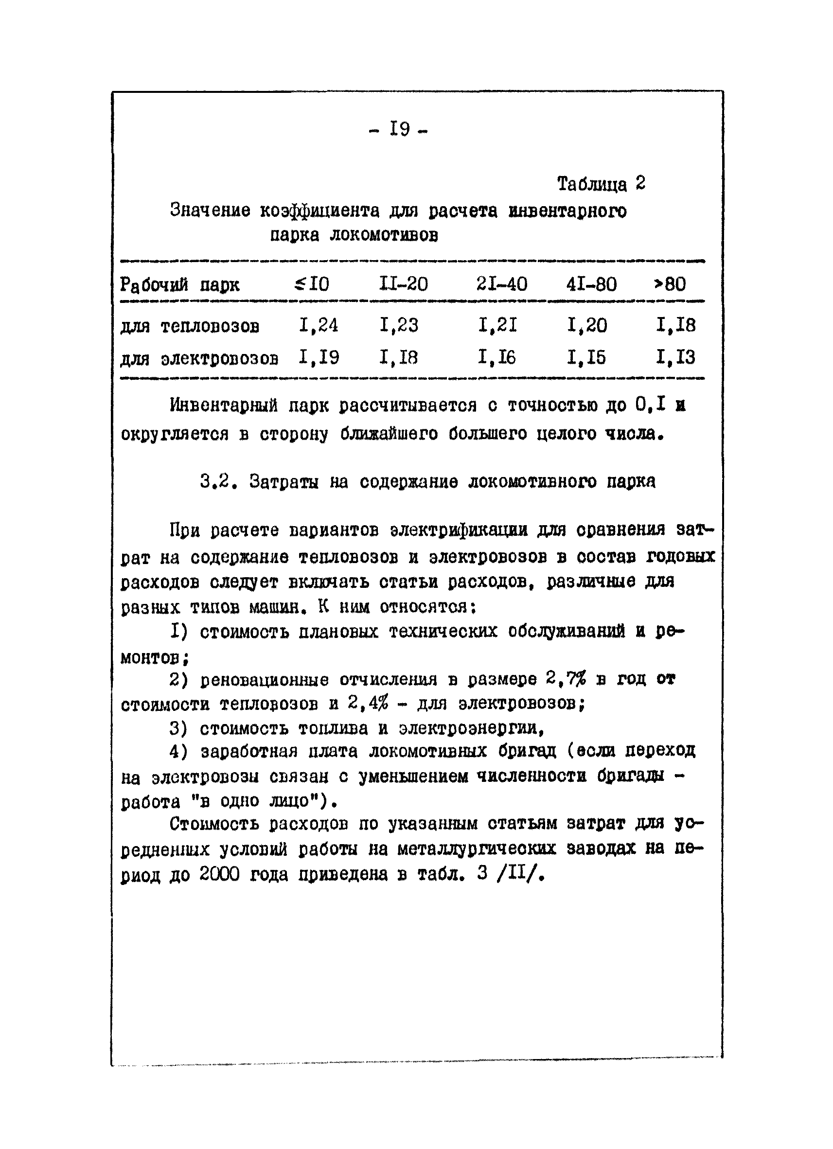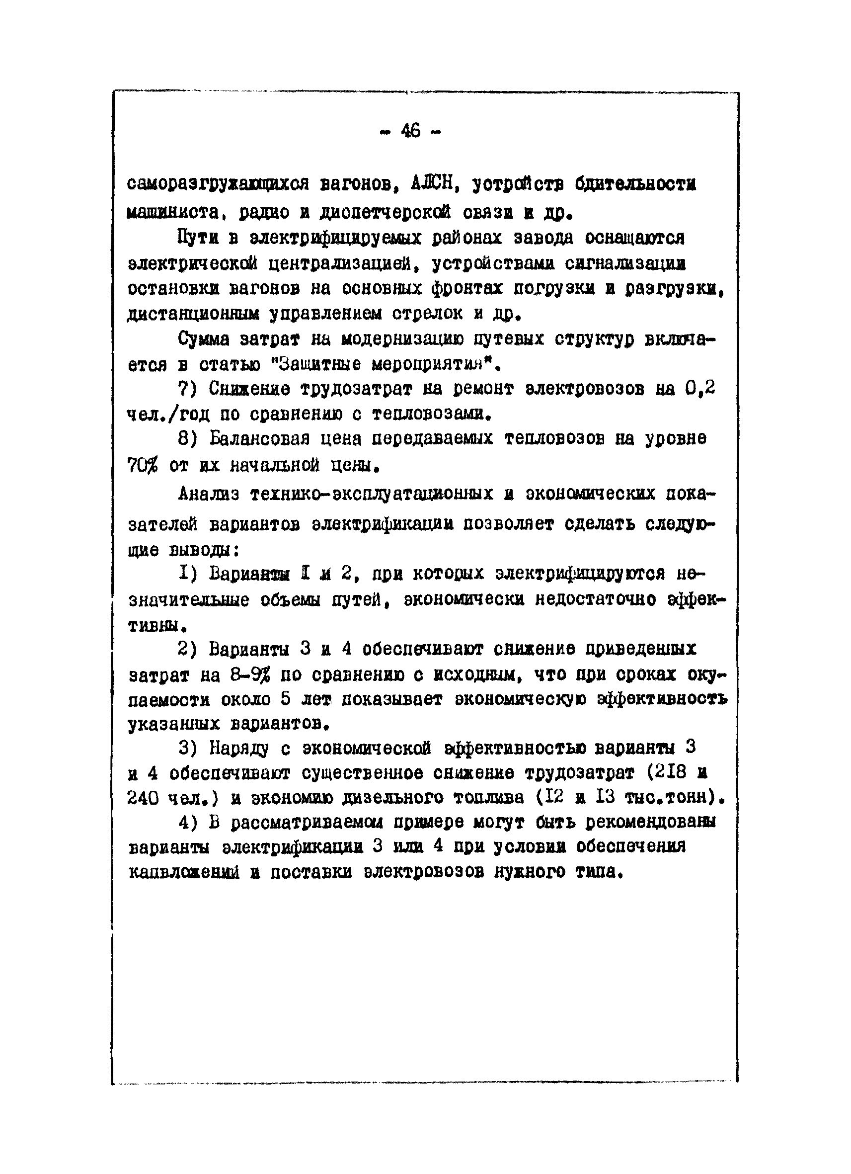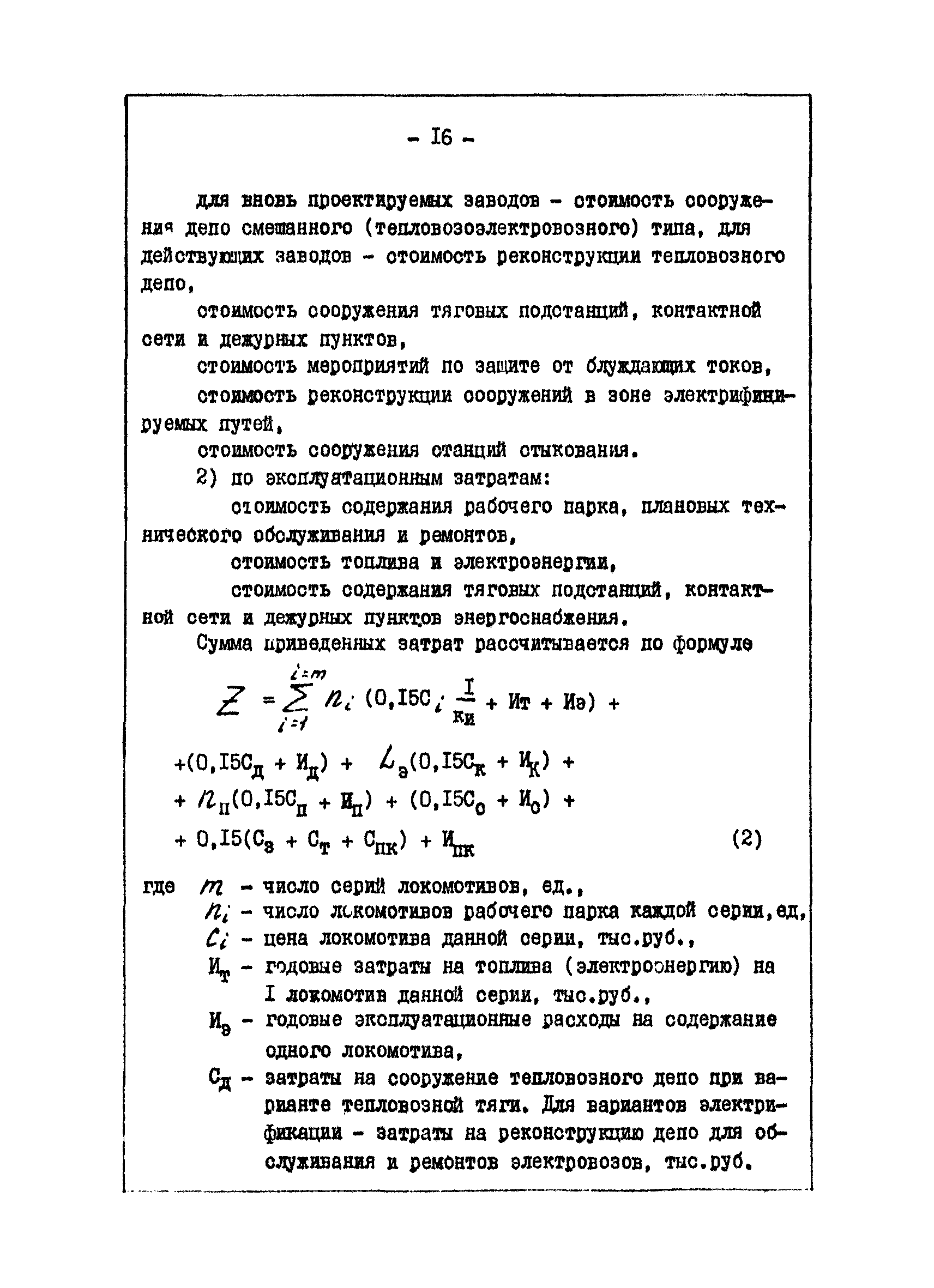 | Оглавление: | Введение 1 Общие положения 2 Структура решения 2.1 Исходные данные 2.2 Выбор рода тока и величины напряжения 2.3 Разработка рабочих вариантов электрификации 2.4 Выбор типа электровоза 2.5 Расчет технико—эксплуатационных показателей 2.6 Расчет приведенных затрат 3 Методика расчета статей затрат 3.1 Локомотивный парк 3.2 Затраты на содержание локомотивного парка 3.3 Расход энергоресурсов ка локомотивную тягу 3.4 Локомотивное депо 3.5 Тяговые подстанции 3.6 Контактная сеть 3.7 Дежурный лист контактной сети 3.8 Вспомогательные работы 4 Список использованных источников 5 Приложение 1. Пример расчета электрификации железнодорожных путей завода (по данным НЛМК) 6 Приложение 2. Основные данные промышленных локомотивов |
