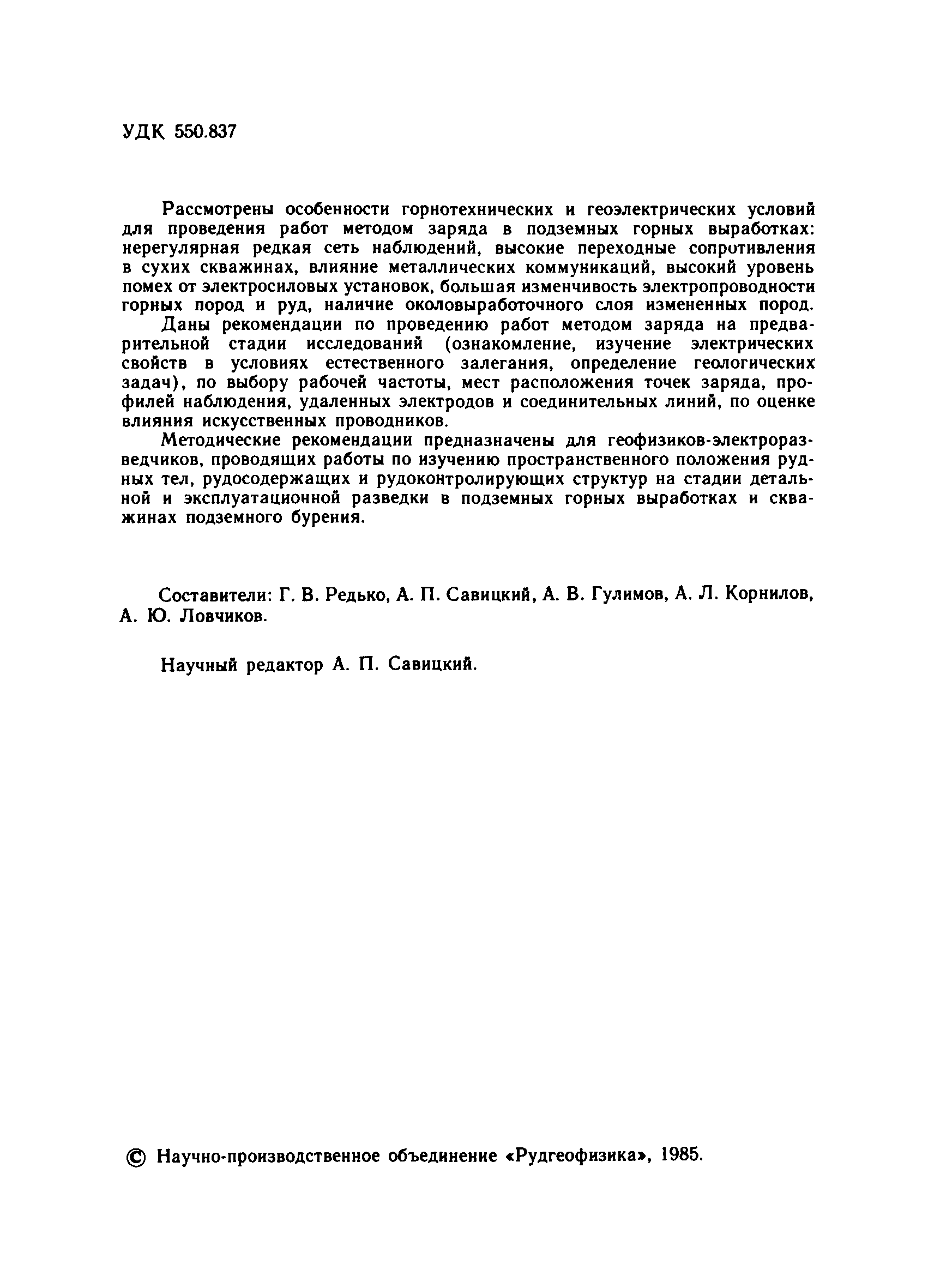 | Область применения: | Методические рекомендации предназначены для оказания помощи производственным организациям в постановке и проведении работ методом заряда в подземных выработках и скважинах. При рассмотрении методики работ уделяется внимание месту метода заряда в общем комплексе методов подземной электроразведки. |
