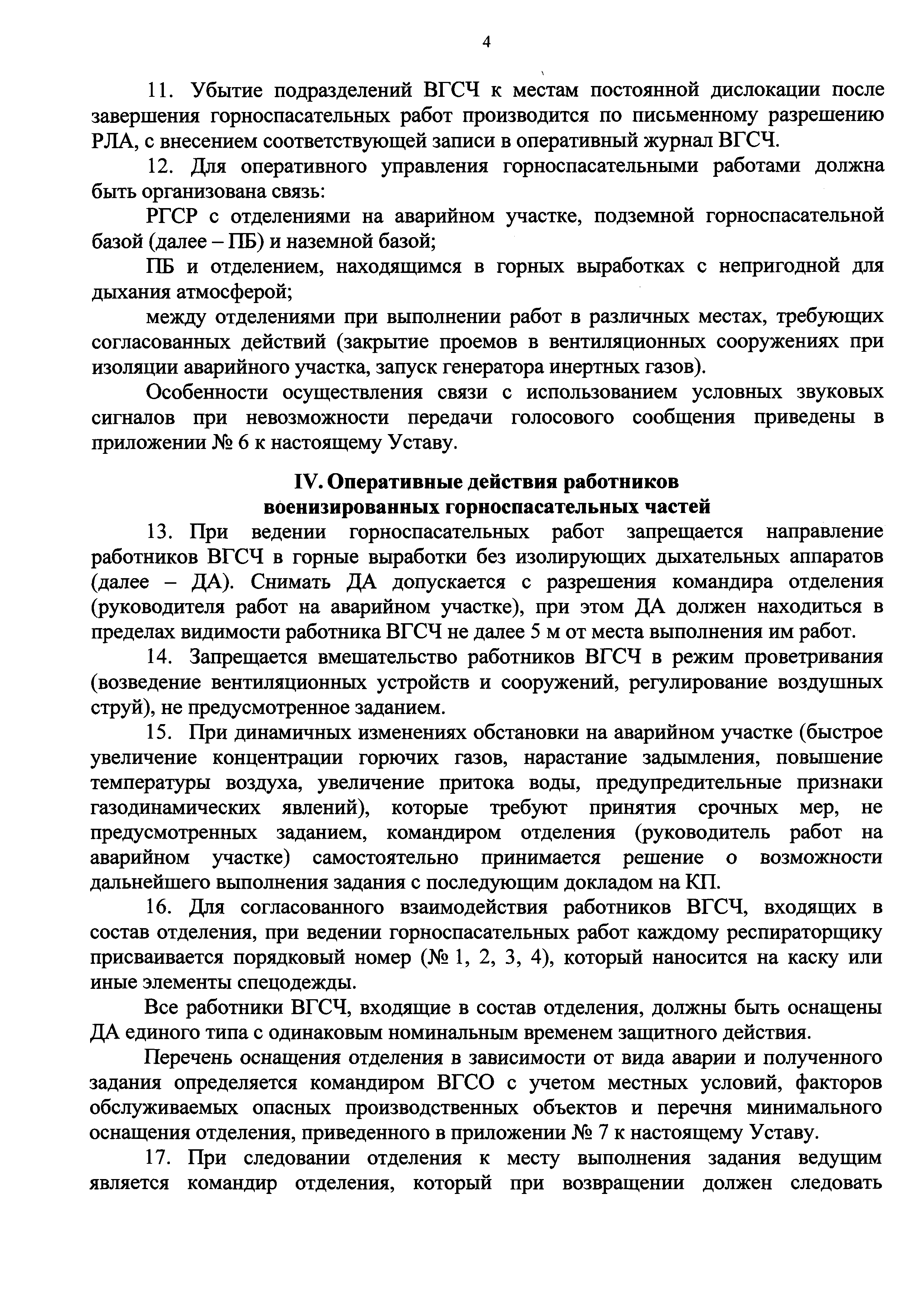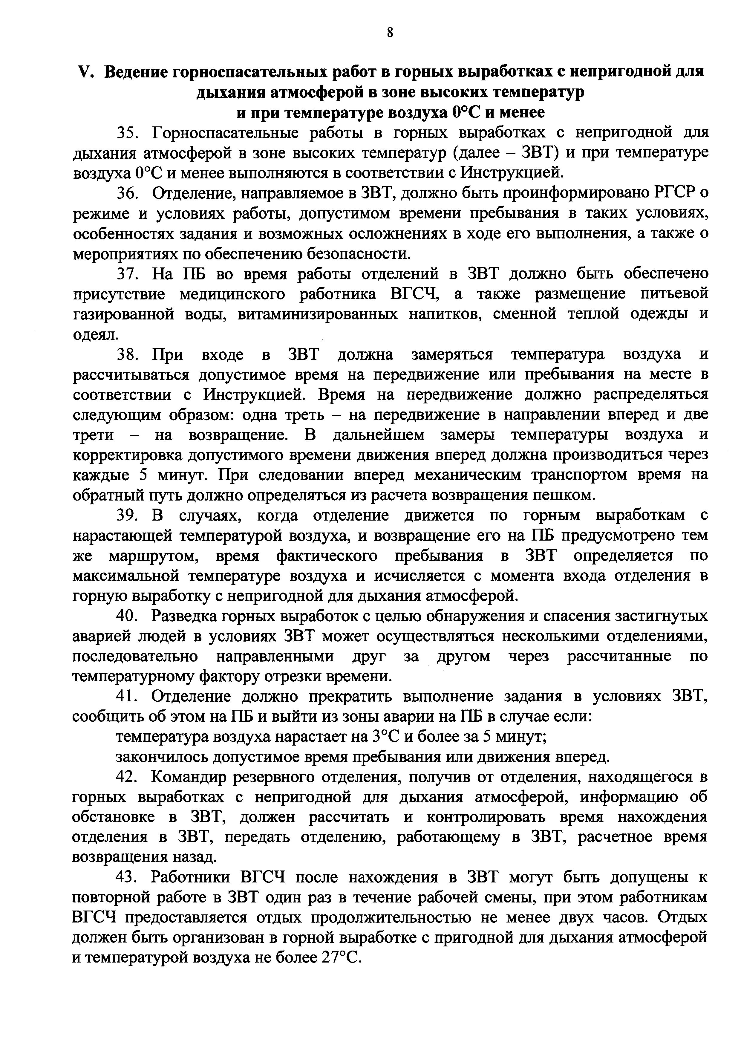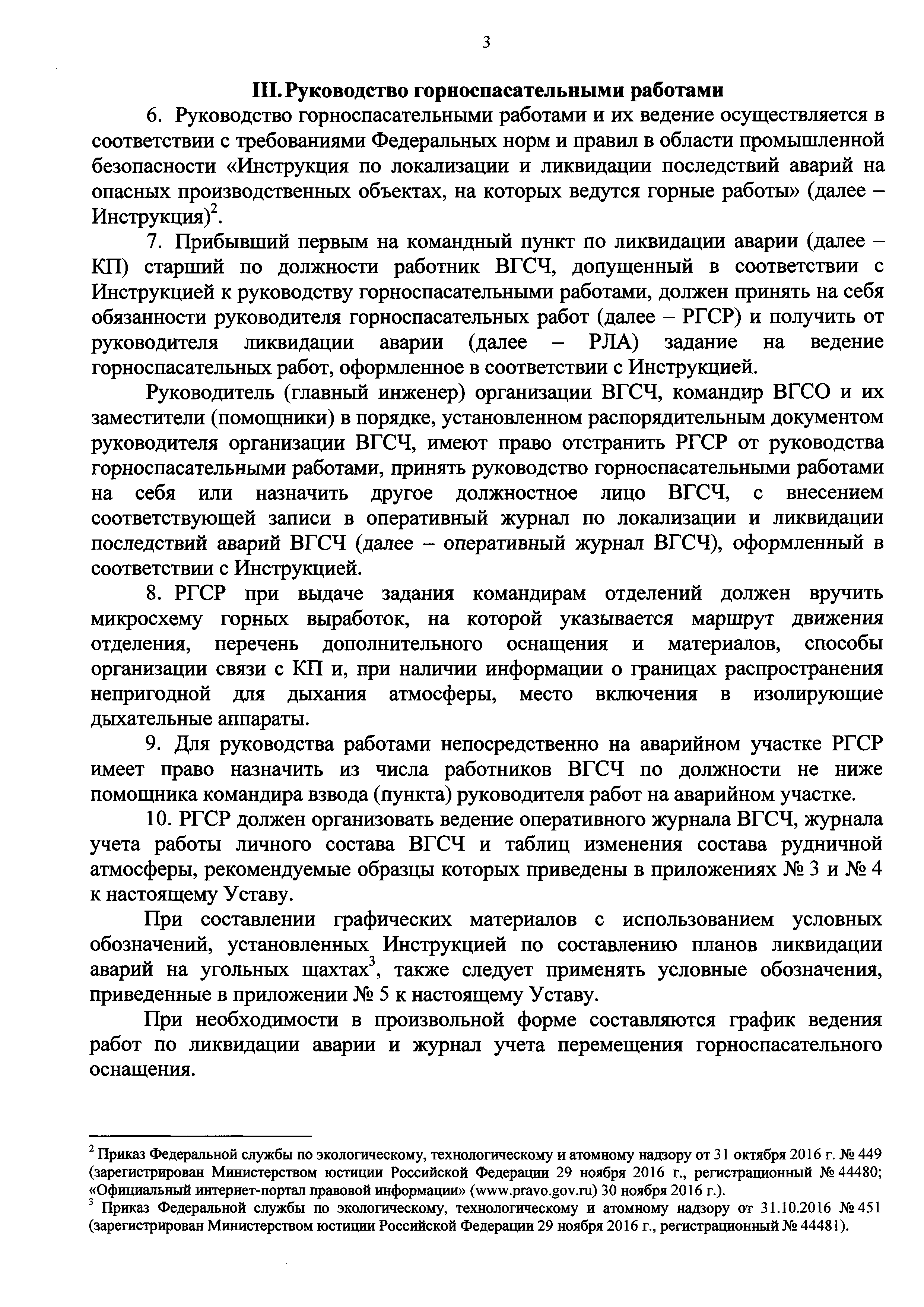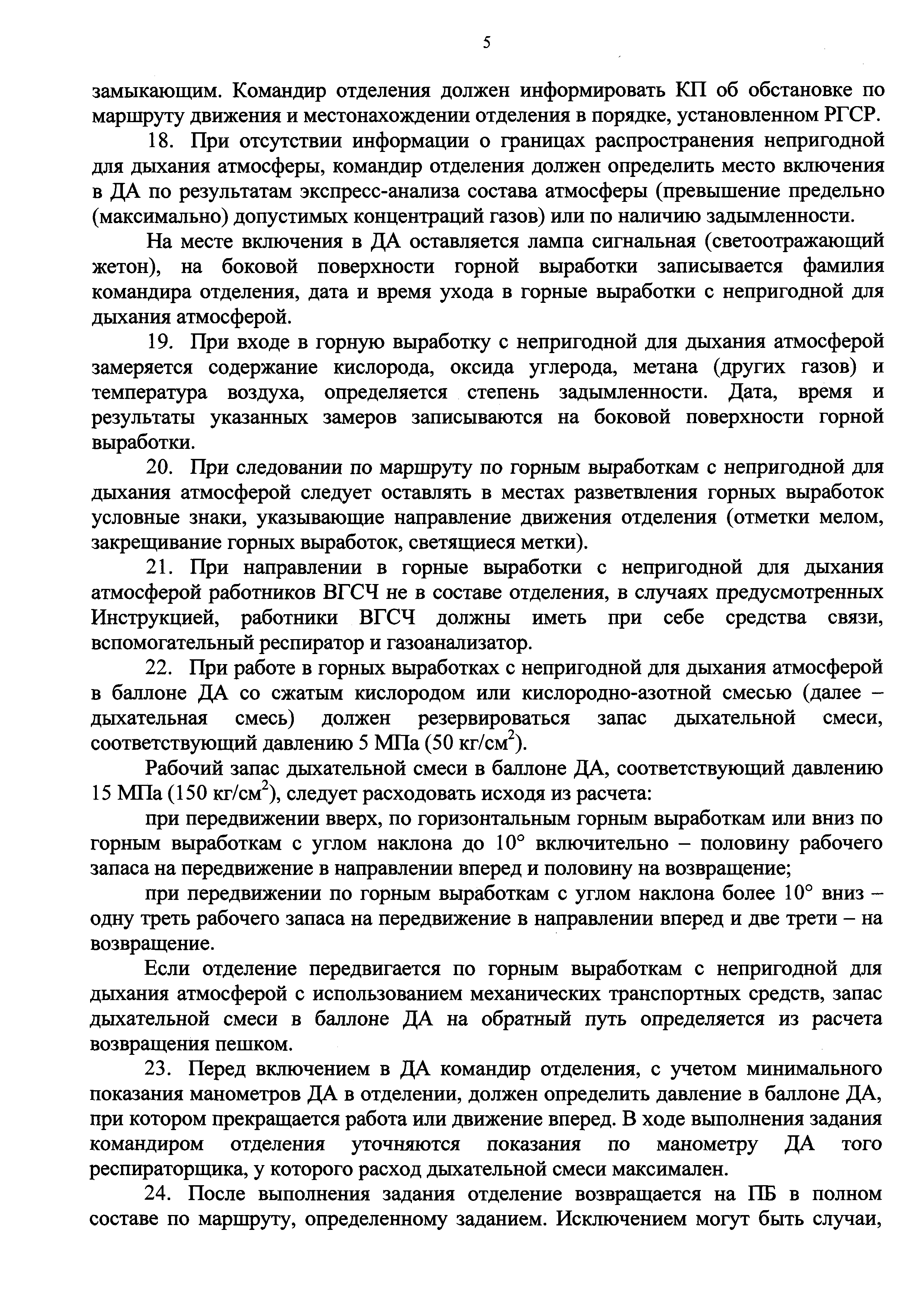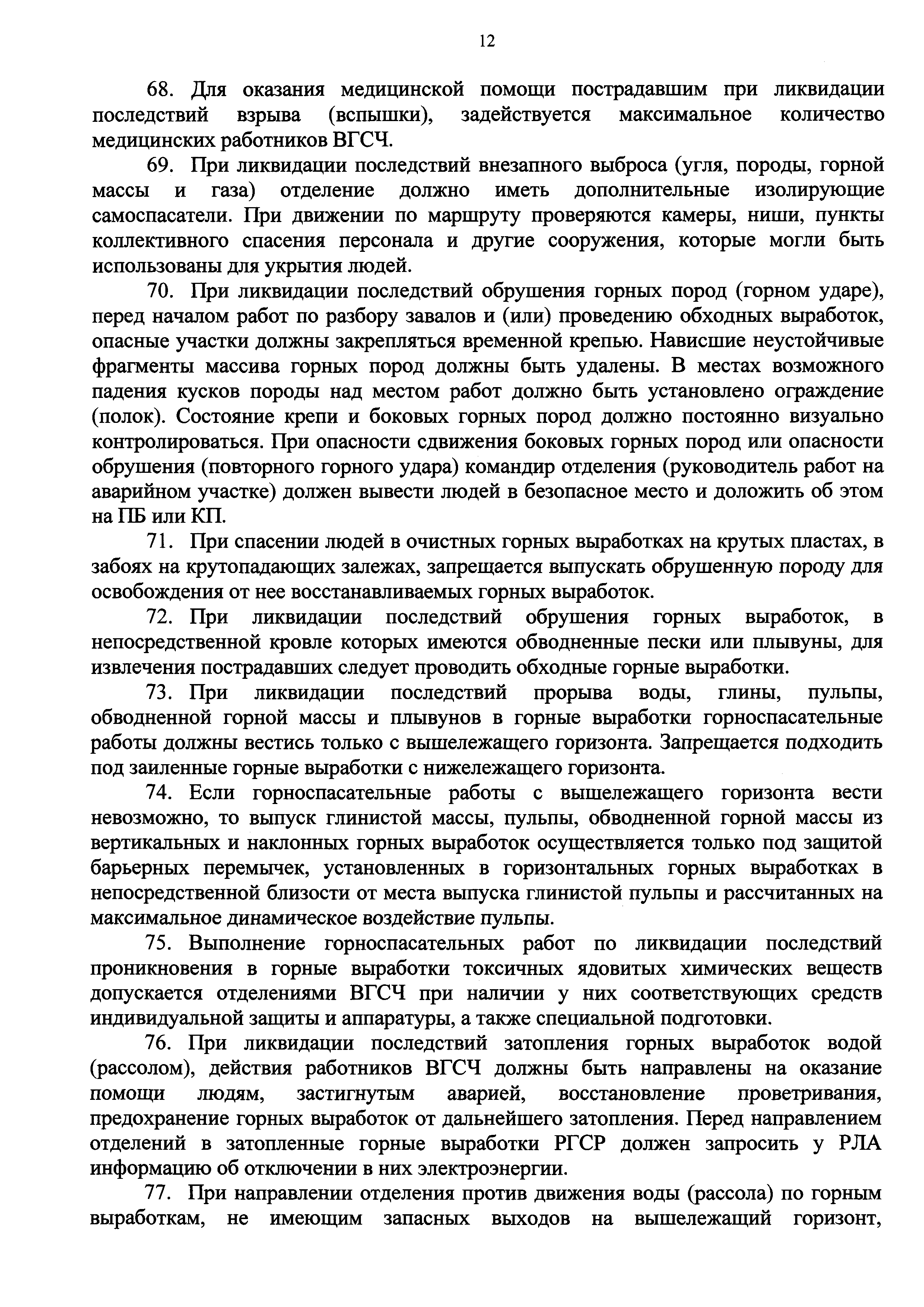 | Оглавление: | I. Общие положения II. Организация выезда подразделений военизированных горноспасательных частей III. Руководство горноспасательными работами IV. Оперативные действия работников военизированных горноспасательных частей V. Ведение горноспасательных работ в горных выработках с непригодной для дыхания атмосферой в зоне высоких температур и при температуре воздуха 0 °C и менее VI. Тушение пожаров в горных выработках VII. Тушение пожаров на опасных производственных объектах ведения подземных горных работ, опасных по газу и (или) пыли VIII. Горноспасательные работы при локализации и ликвидации других видов аварий на опасных производственных объектах IX. Выполнение специальных и противоаварийных работ X. Права и обязанности работников военизированных горноспасательных частей Приложение № 1. Диспозиция выездов подразделений ВГСО Приложение № 2. Путевка на выезд подразделения ВГСЧ на ликвидацию аварии Приложение № 3. Журнал учета работы личного состава ВГСЧ Приложение № 4. Таблица изменения состава рудничной атмосферы Приложение № 5. Условные обозначения Приложение № 6. Особенности осуществления связи с использованием условных звуковых сигналов при невозможности передачи голосового сообщения Приложение № 7. Перечень минимального оснащения отделения Приложение № 8. Описание опознавательного жетона и его дубликата Приложение № 9. План мероприятий по проведению технических работ Приложение № 10. План обслуживания массового взрыва Приложение № 11. Отчет о выполнении задания Приложение № 12. Бланк обнаружения пострадавшего |