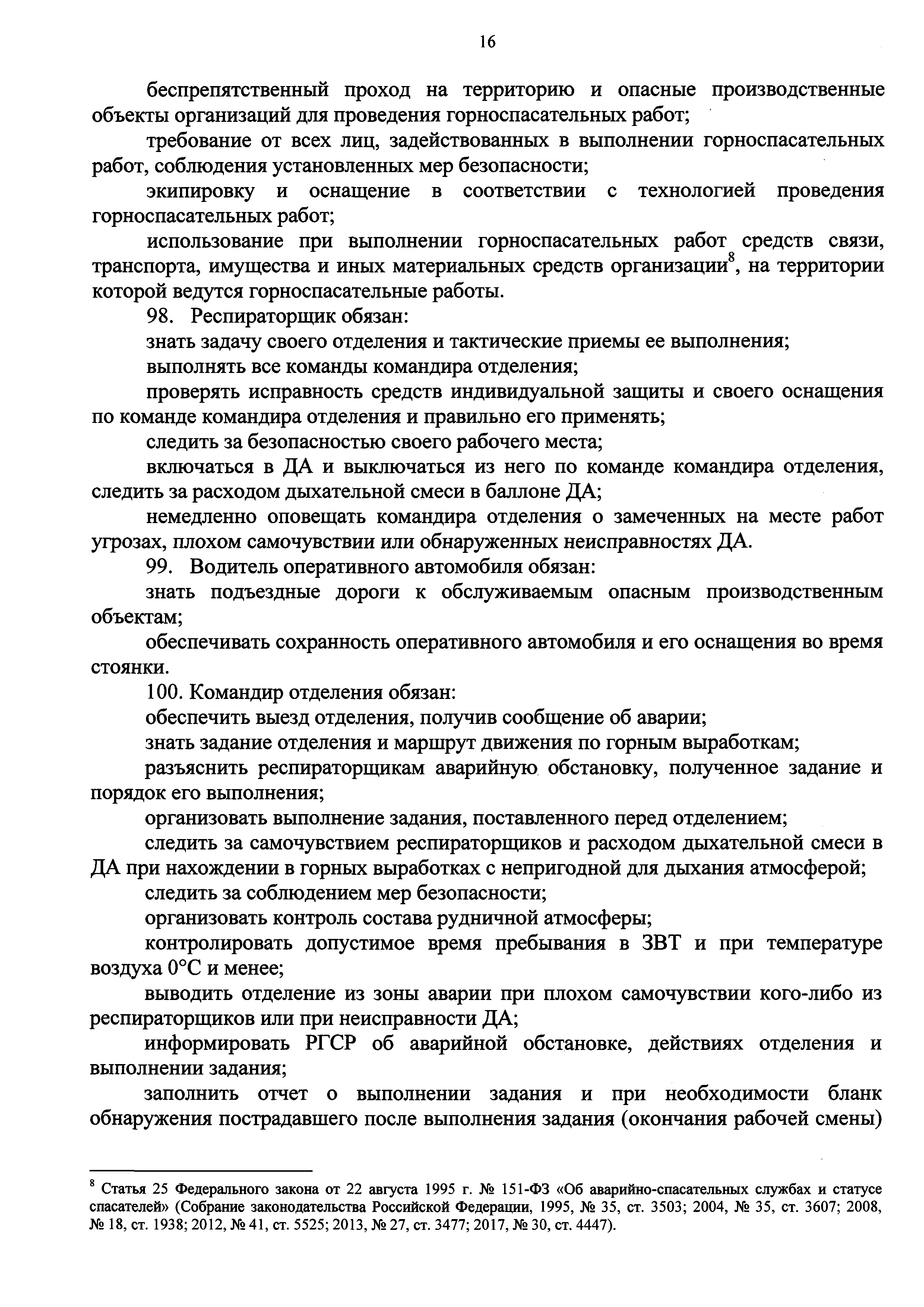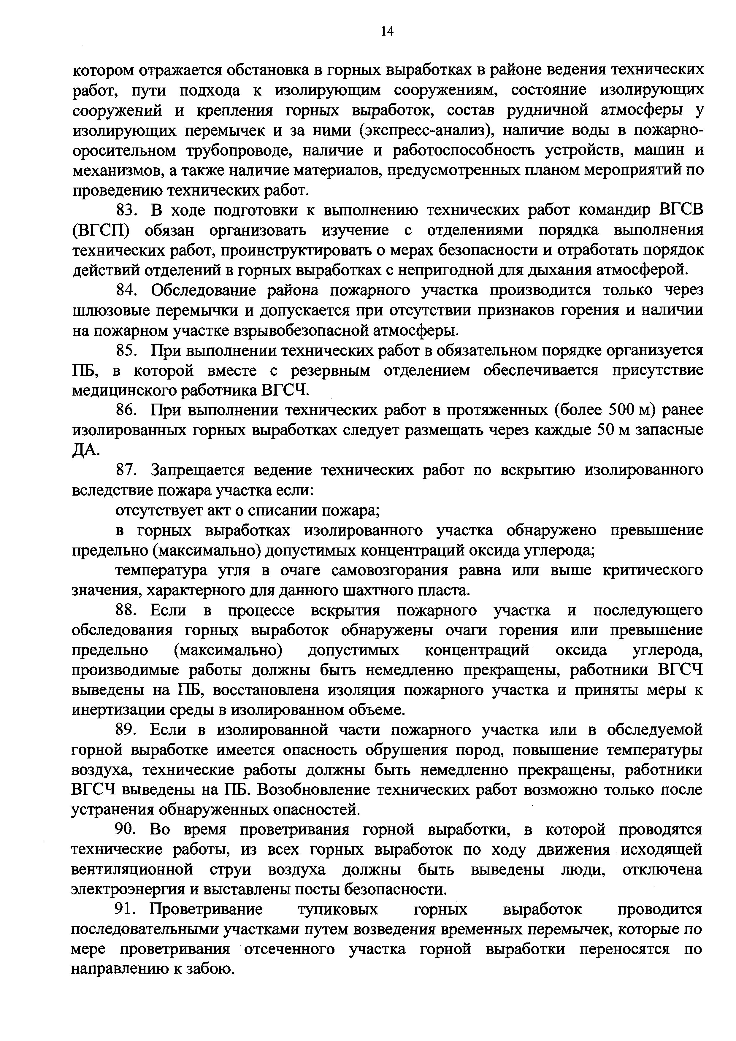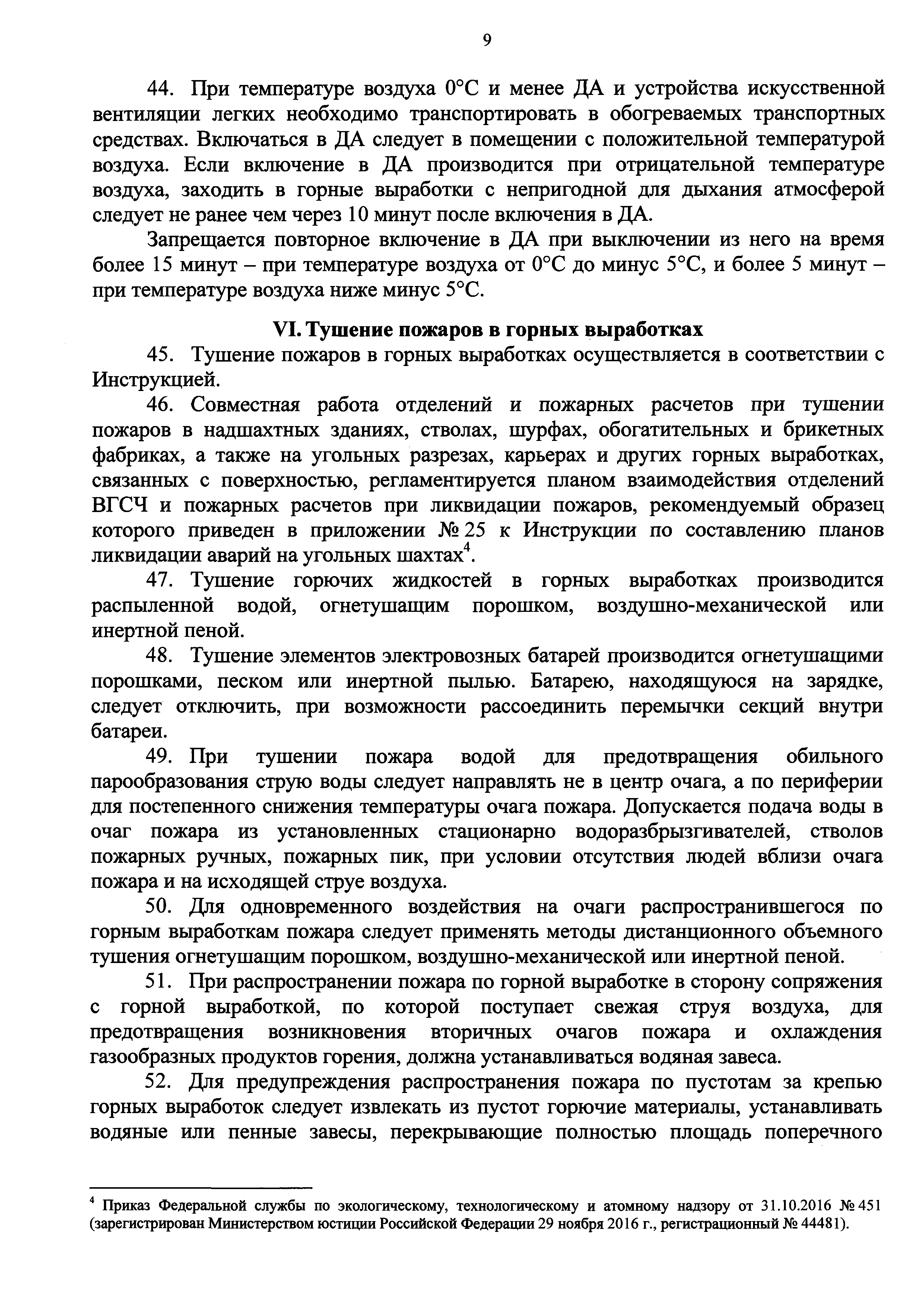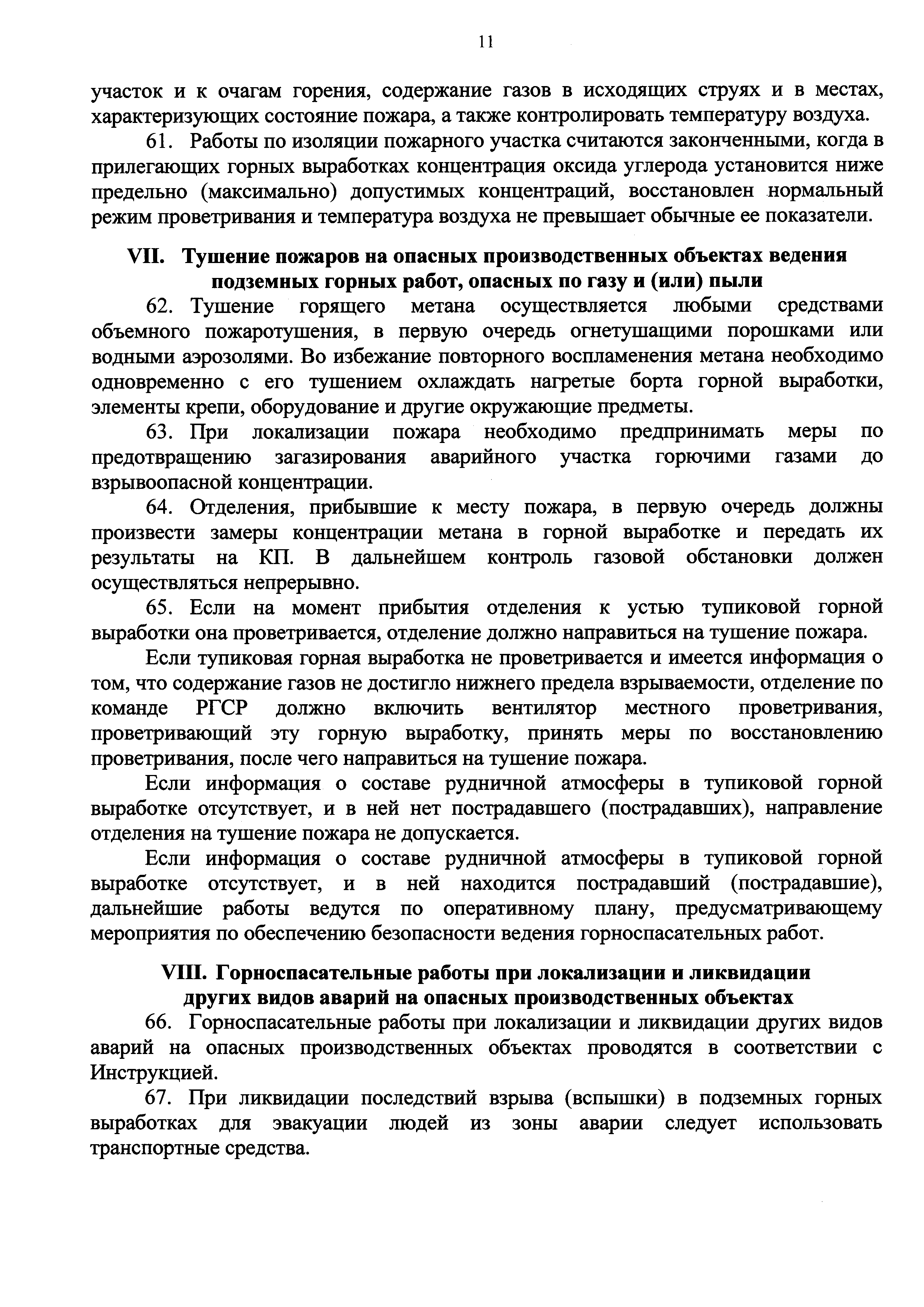 | Оглавление: | I. Общие положения II. Организация выезда подразделений военизированных горноспасательных частей III. Руководство горноспасательными работами IV. Оперативные действия работников военизированных горноспасательных частей V. Ведение горноспасательных работ в горных выработках с непригодной для дыхания атмосферой в зоне высоких температур и при температуре воздуха 0 °C и менее VI. Тушение пожаров в горных выработках VII. Тушение пожаров на опасных производственных объектах ведения подземных горных работ, опасных по газу и (или) пыли VIII. Горноспасательные работы при локализации и ликвидации других видов аварий на опасных производственных объектах IX. Выполнение специальных и противоаварийных работ X. Права и обязанности работников военизированных горноспасательных частей Приложение № 1. Диспозиция выездов подразделений ВГСО Приложение № 2. Путевка на выезд подразделения ВГСЧ на ликвидацию аварии Приложение № 3. Журнал учета работы личного состава ВГСЧ Приложение № 4. Таблица изменения состава рудничной атмосферы Приложение № 5. Условные обозначения Приложение № 6. Особенности осуществления связи с использованием условных звуковых сигналов при невозможности передачи голосового сообщения Приложение № 7. Перечень минимального оснащения отделения Приложение № 8. Описание опознавательного жетона и его дубликата Приложение № 9. План мероприятий по проведению технических работ Приложение № 10. План обслуживания массового взрыва Приложение № 11. Отчет о выполнении задания Приложение № 12. Бланк обнаружения пострадавшего |
