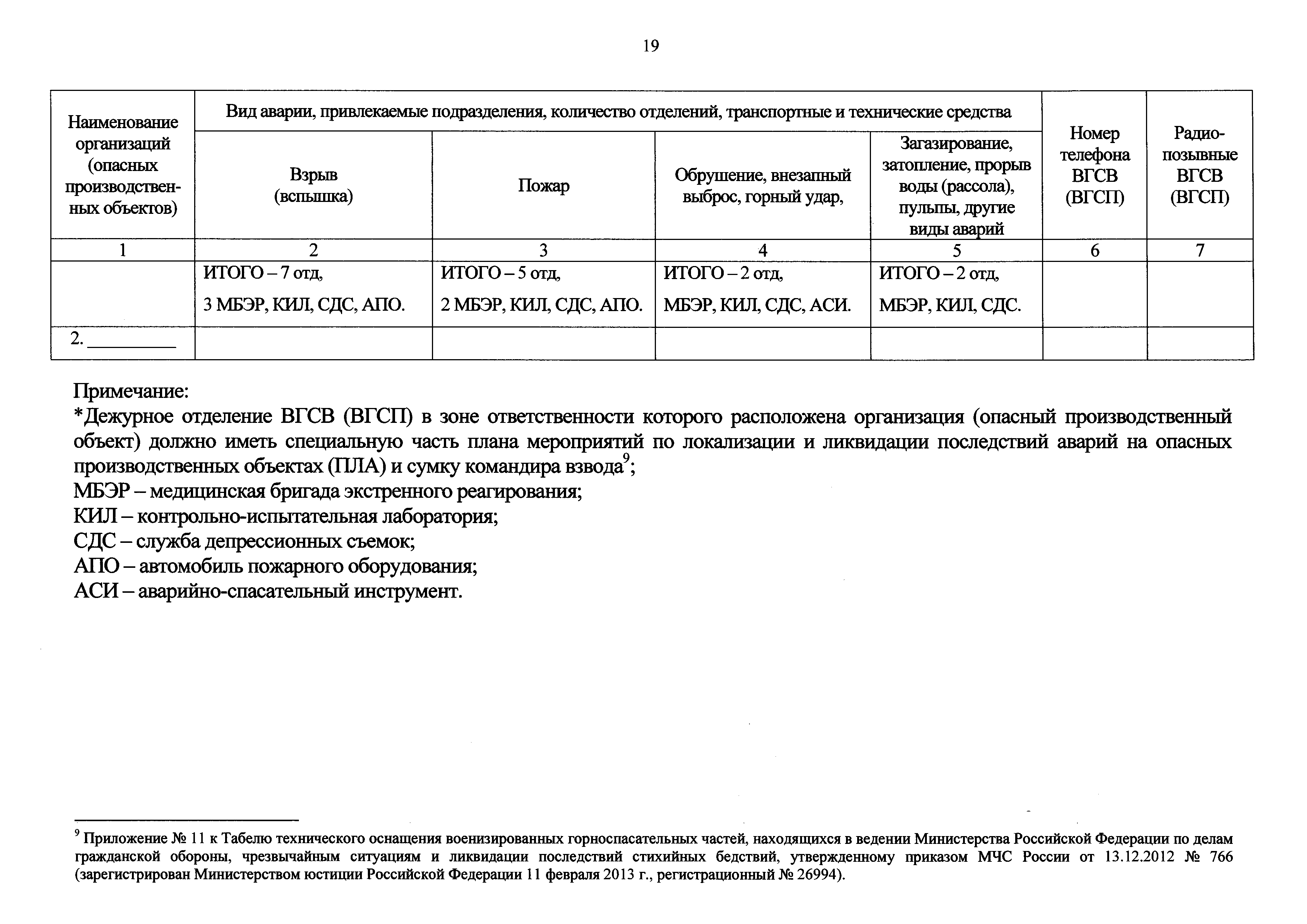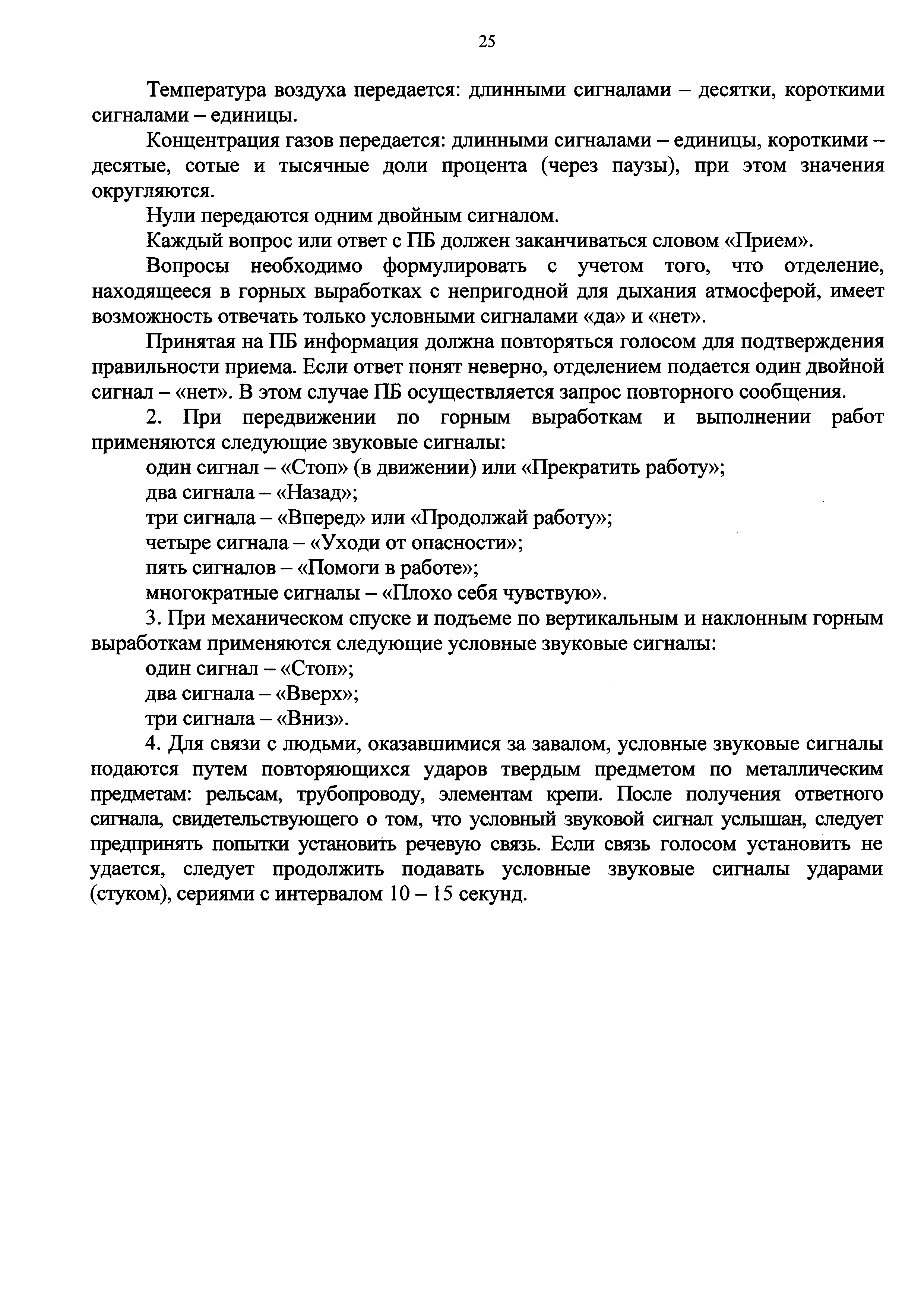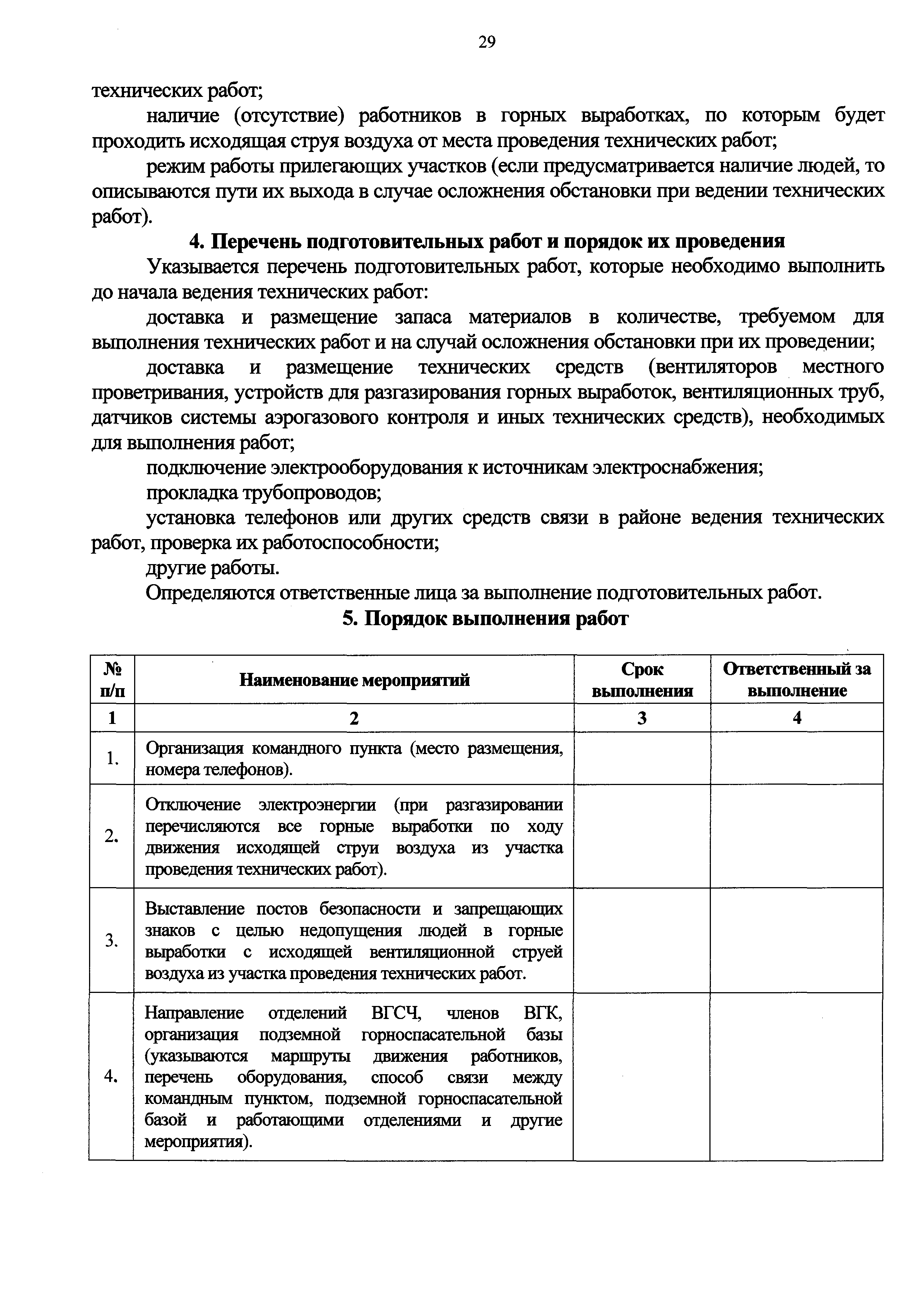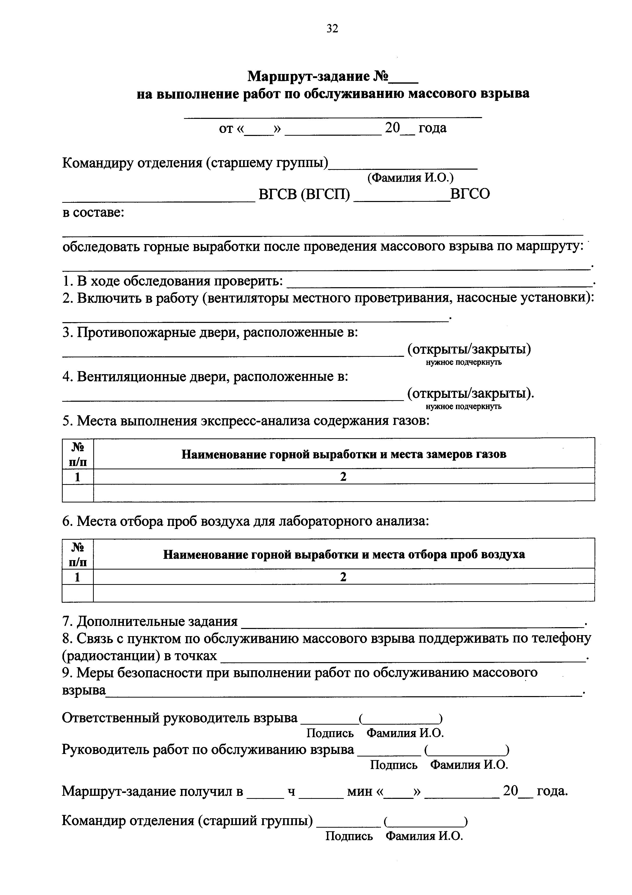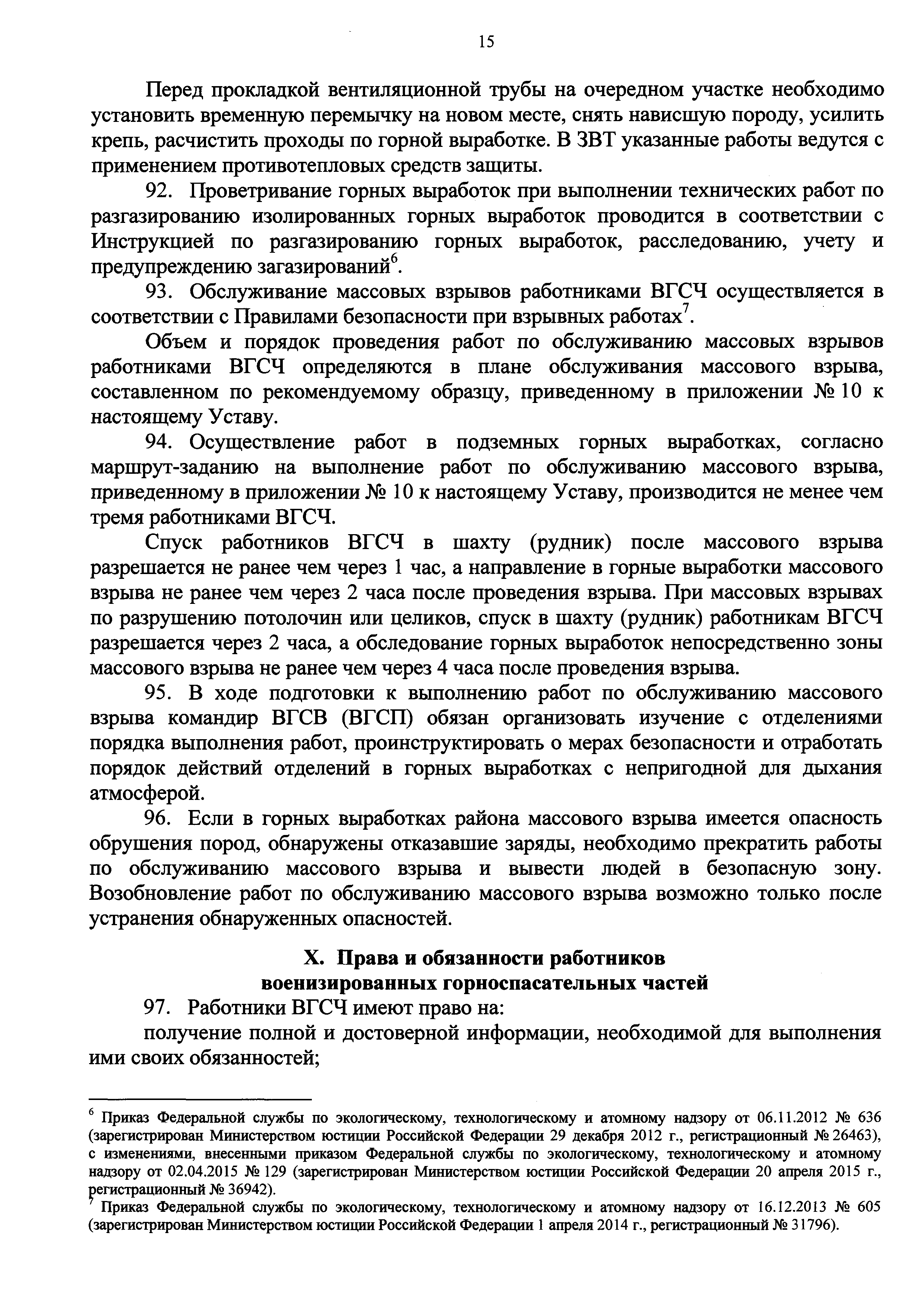 | Оглавление: | I. Общие положения II. Организация выезда подразделений военизированных горноспасательных частей III. Руководство горноспасательными работами IV. Оперативные действия работников военизированных горноспасательных частей V. Ведение горноспасательных работ в горных выработках с непригодной для дыхания атмосферой в зоне высоких температур и при температуре воздуха 0 °C и менее VI. Тушение пожаров в горных выработках VII. Тушение пожаров на опасных производственных объектах ведения подземных горных работ, опасных по газу и (или) пыли VIII. Горноспасательные работы при локализации и ликвидации других видов аварий на опасных производственных объектах IX. Выполнение специальных и противоаварийных работ X. Права и обязанности работников военизированных горноспасательных частей Приложение № 1. Диспозиция выездов подразделений ВГСО Приложение № 2. Путевка на выезд подразделения ВГСЧ на ликвидацию аварии Приложение № 3. Журнал учета работы личного состава ВГСЧ Приложение № 4. Таблица изменения состава рудничной атмосферы Приложение № 5. Условные обозначения Приложение № 6. Особенности осуществления связи с использованием условных звуковых сигналов при невозможности передачи голосового сообщения Приложение № 7. Перечень минимального оснащения отделения Приложение № 8. Описание опознавательного жетона и его дубликата Приложение № 9. План мероприятий по проведению технических работ Приложение № 10. План обслуживания массового взрыва Приложение № 11. Отчет о выполнении задания Приложение № 12. Бланк обнаружения пострадавшего |