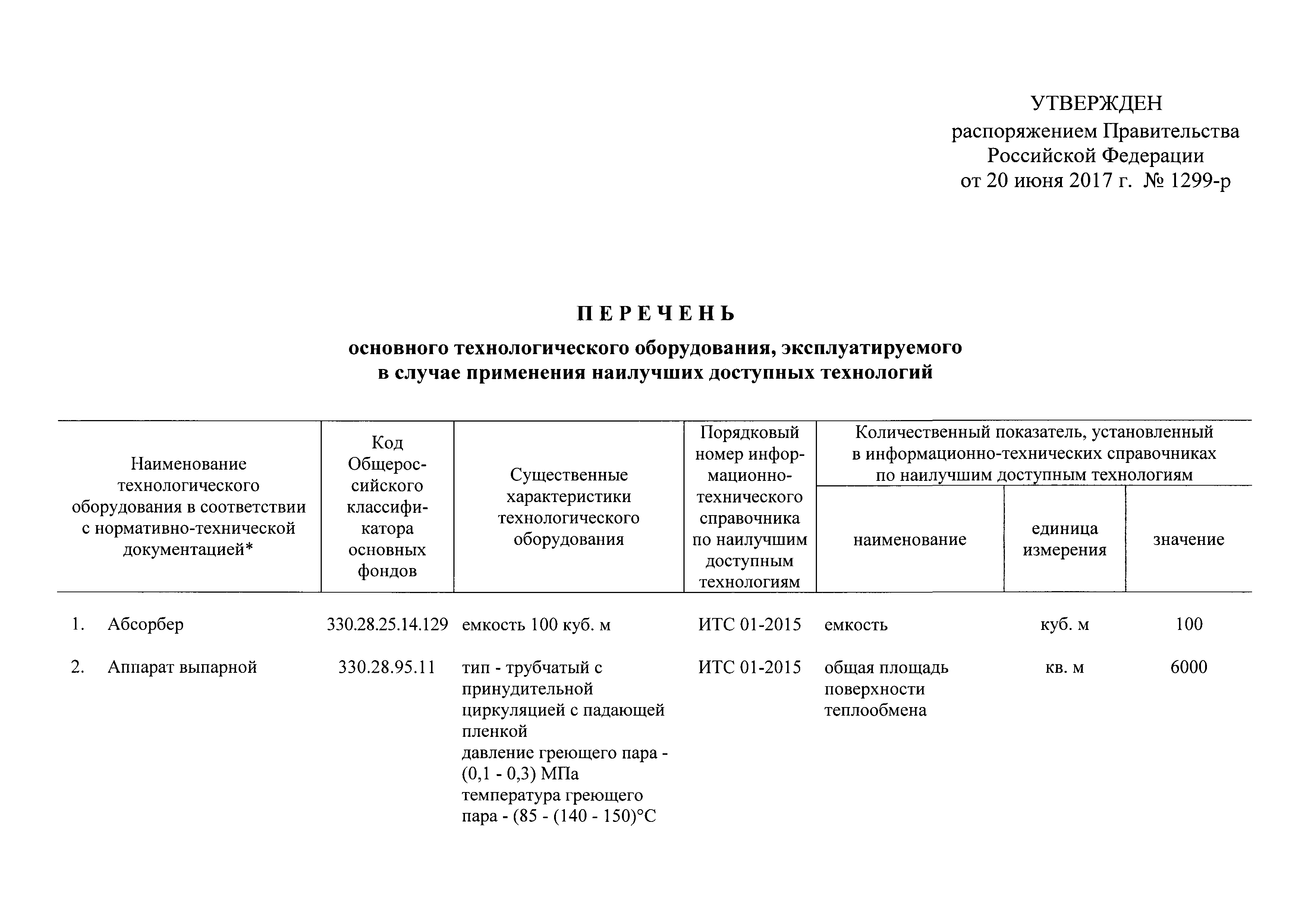 Перечень основного технологического оборудования, эксплуатируемого в случае применения наилучших доступных технологий| Статус: | действует | | Название рус.: | Перечень основного технологического оборудования, эксплуатируемого в случае применения наилучших доступных технологий | | Дата добавления в базу: | 01.01.2018 | | Дата актуализации: | 01.01.2021 | | Дата введения: | 01.01.2019 | | Утверждён: | 20.06.2017 Правительство Российской Федерации (1299-р)