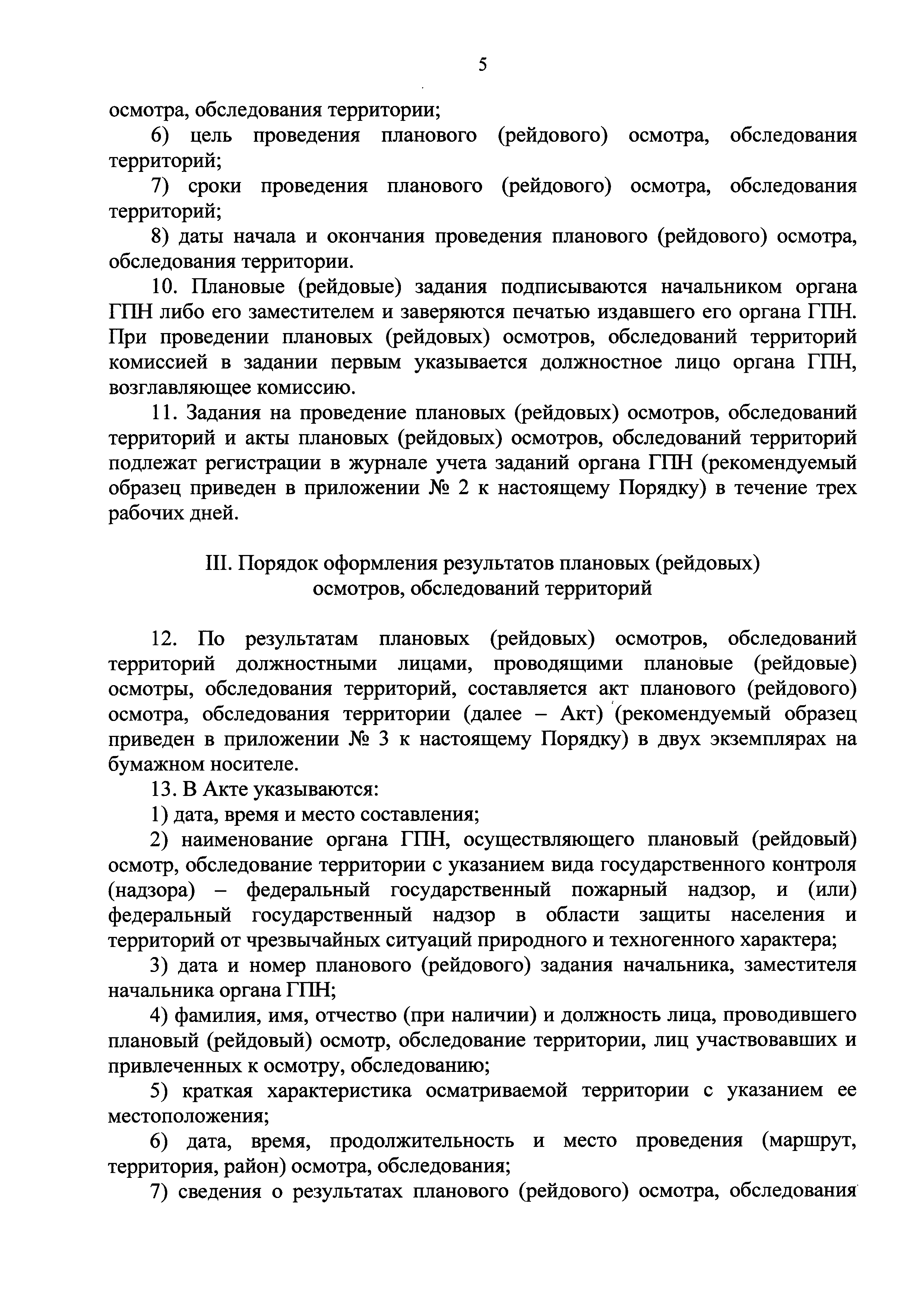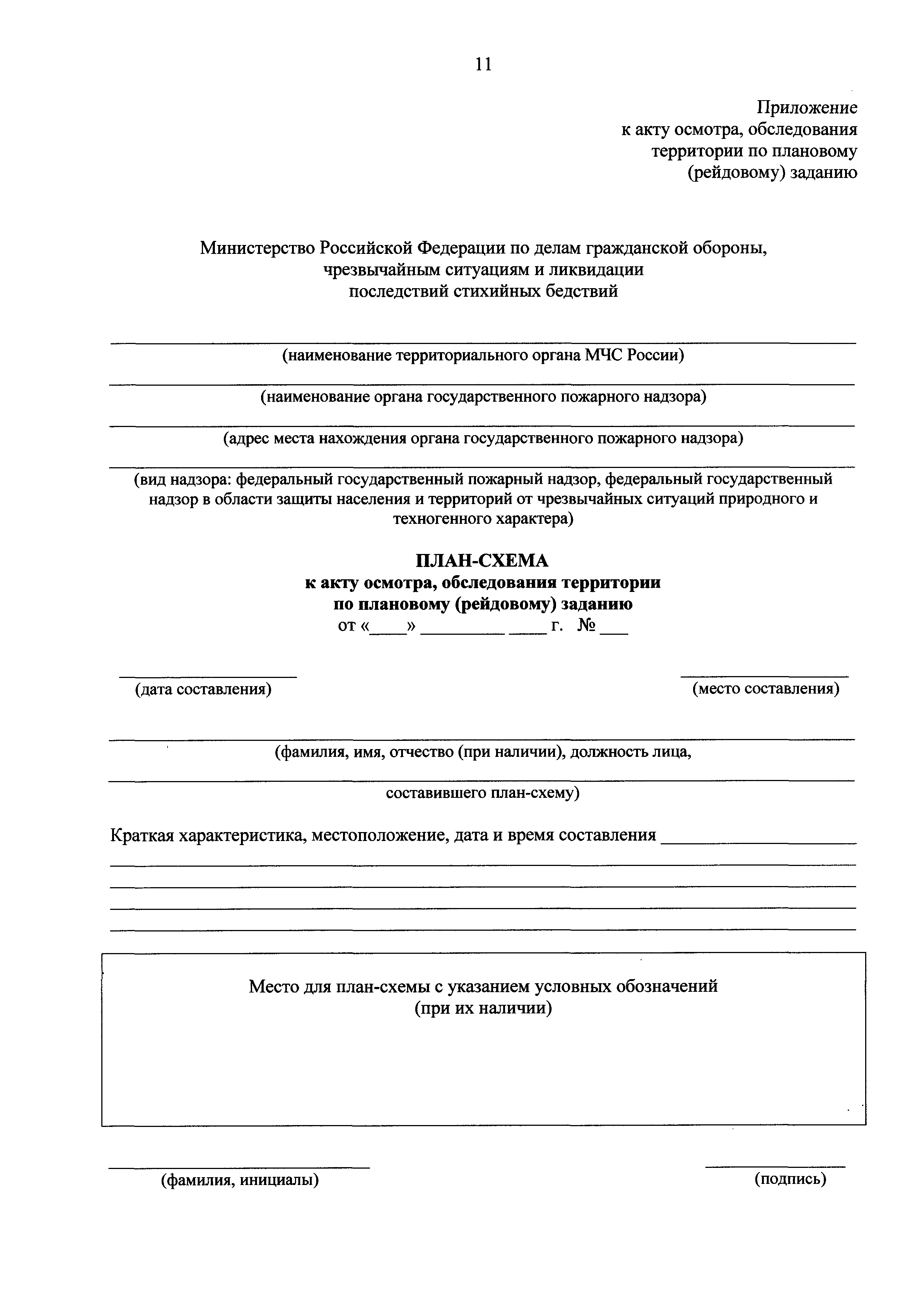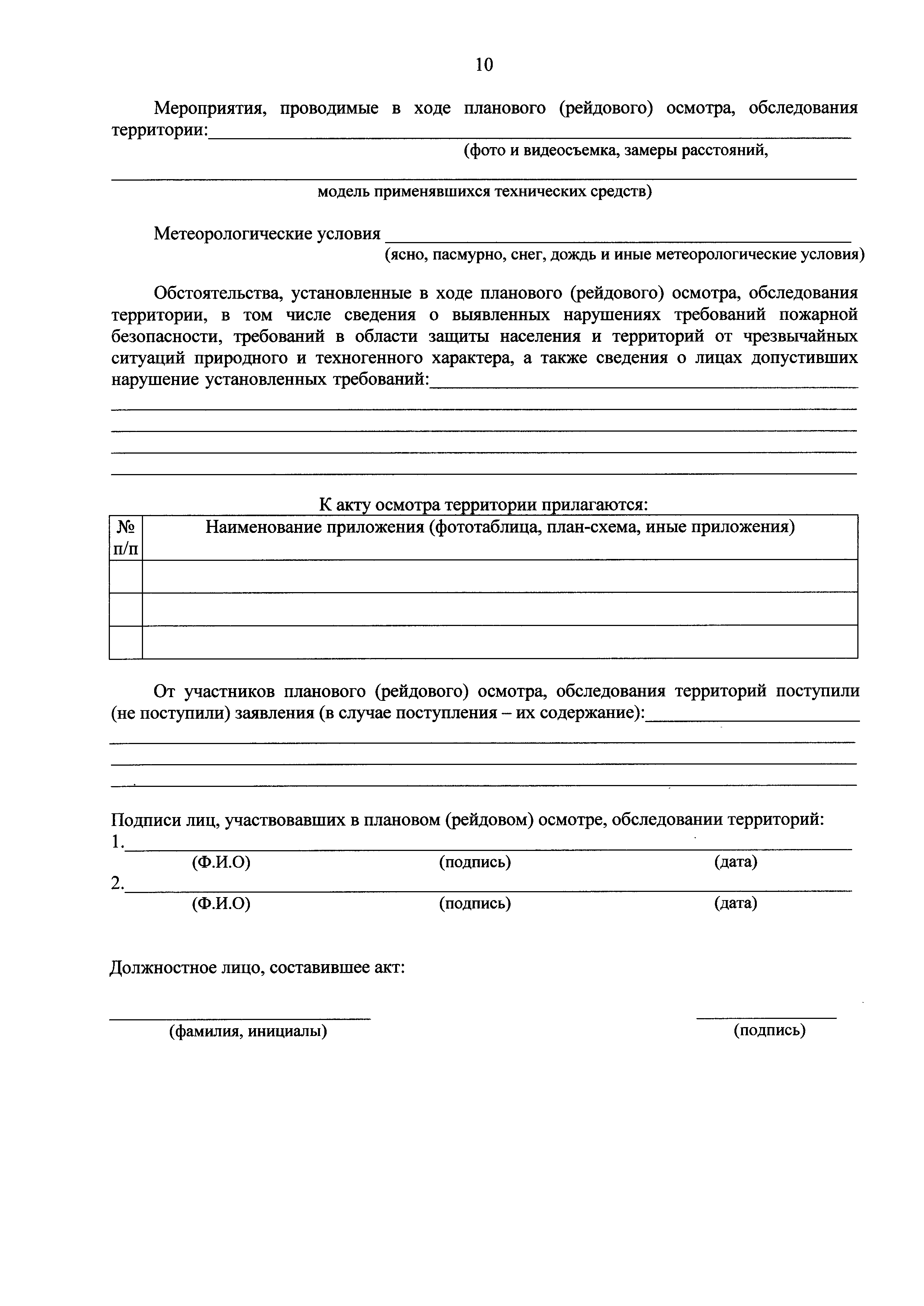 порядок оформления результатов плановых (рейдовых) осмотров, обследований территорий | | Оглавление: | I. Общие положения II. Оформление заданий на проведение плановых (рейдовых) осмотров, обследований территорий III. Порядок оформления результатов плановых (рейдовых) осмотров, обследований территорий Приложение № 1. Задание на проведение планового (рейдового) осмотра, обследования территорий Приложение № 2. Журнал регистрации плановых (рейдовых) заданий Приложение № 3. Акт осмотра, обследования территории по плановому (рейдовому) заданию Приложение. План-схема к акту осмотра, обследования территории по плановому (рейдовому) заданию Приложение. Фототаблица к акту осмотра, обследования территории по плановому (рейдовому) заданию | | Утверждён: | 24.03.2017 МЧС России (Russian Federation MChS 132)