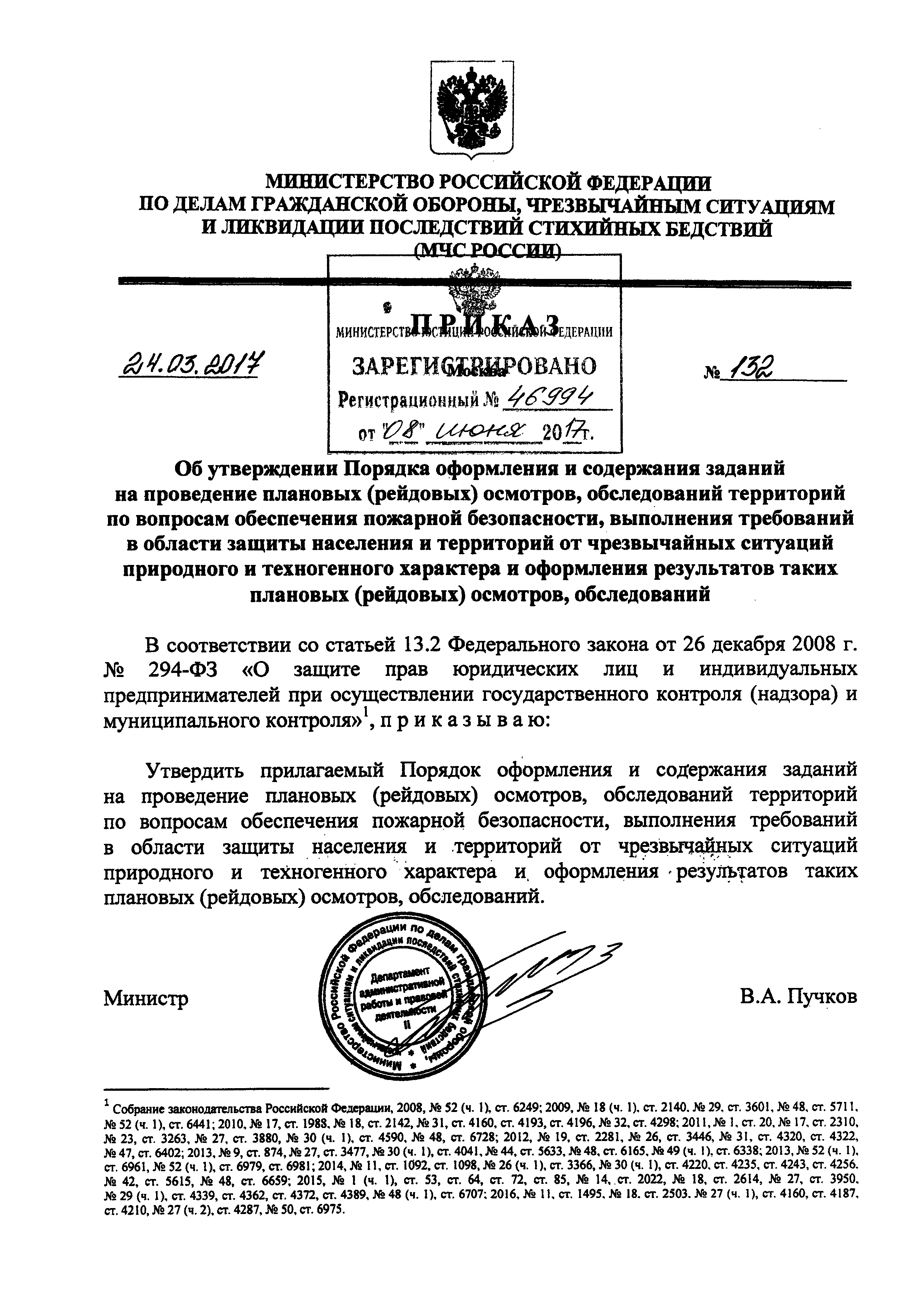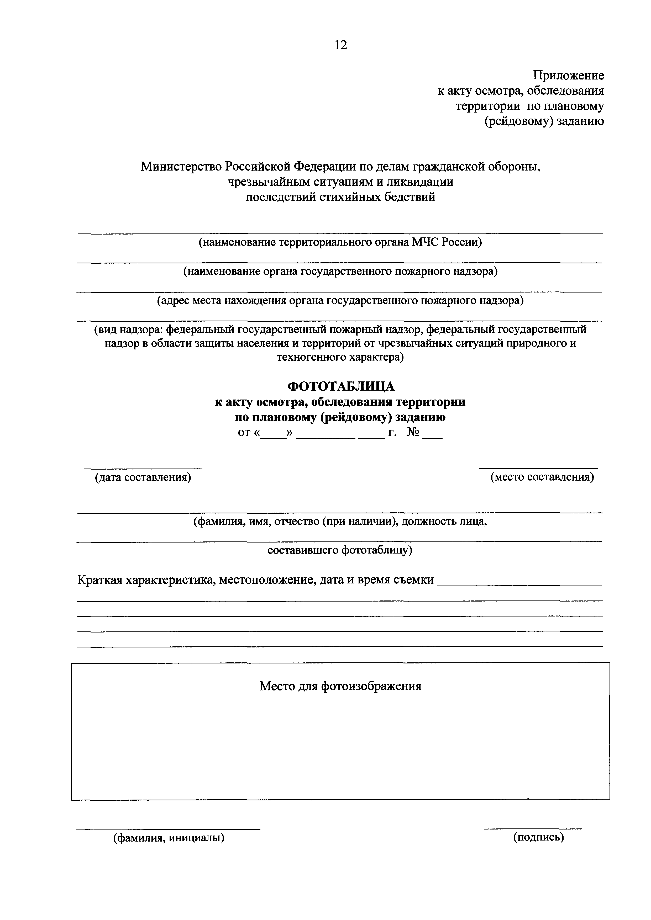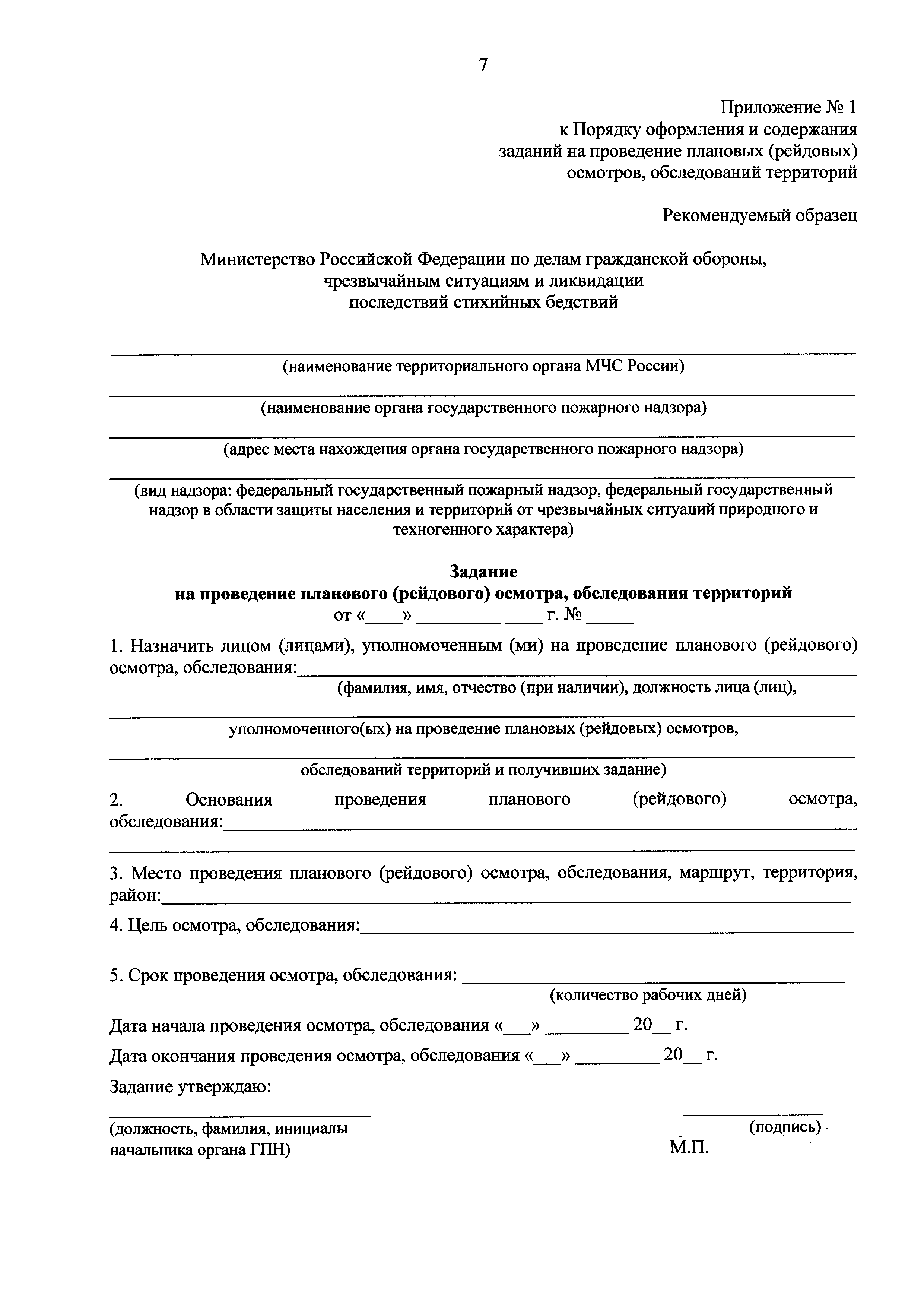 порядок оформления результатов плановых (рейдовых) осмотров, обследований территорий | | Оглавление: | I. Общие положения II. Оформление заданий на проведение плановых (рейдовых) осмотров, обследований территорий III. Порядок оформления результатов плановых (рейдовых) осмотров, обследований территорий Приложение № 1. Задание на проведение планового (рейдового) осмотра, обследования территорий Приложение № 2. Журнал регистрации плановых (рейдовых) заданий Приложение № 3. Акт осмотра, обследования территории по плановому (рейдовому) заданию Приложение. План-схема к акту осмотра, обследования территории по плановому (рейдовому) заданию Приложение. Фототаблица к акту осмотра, обследования территории по плановому (рейдовому) заданию | | Утверждён: | 24.03.2017 МЧС России (Russian Federation MChS 132)