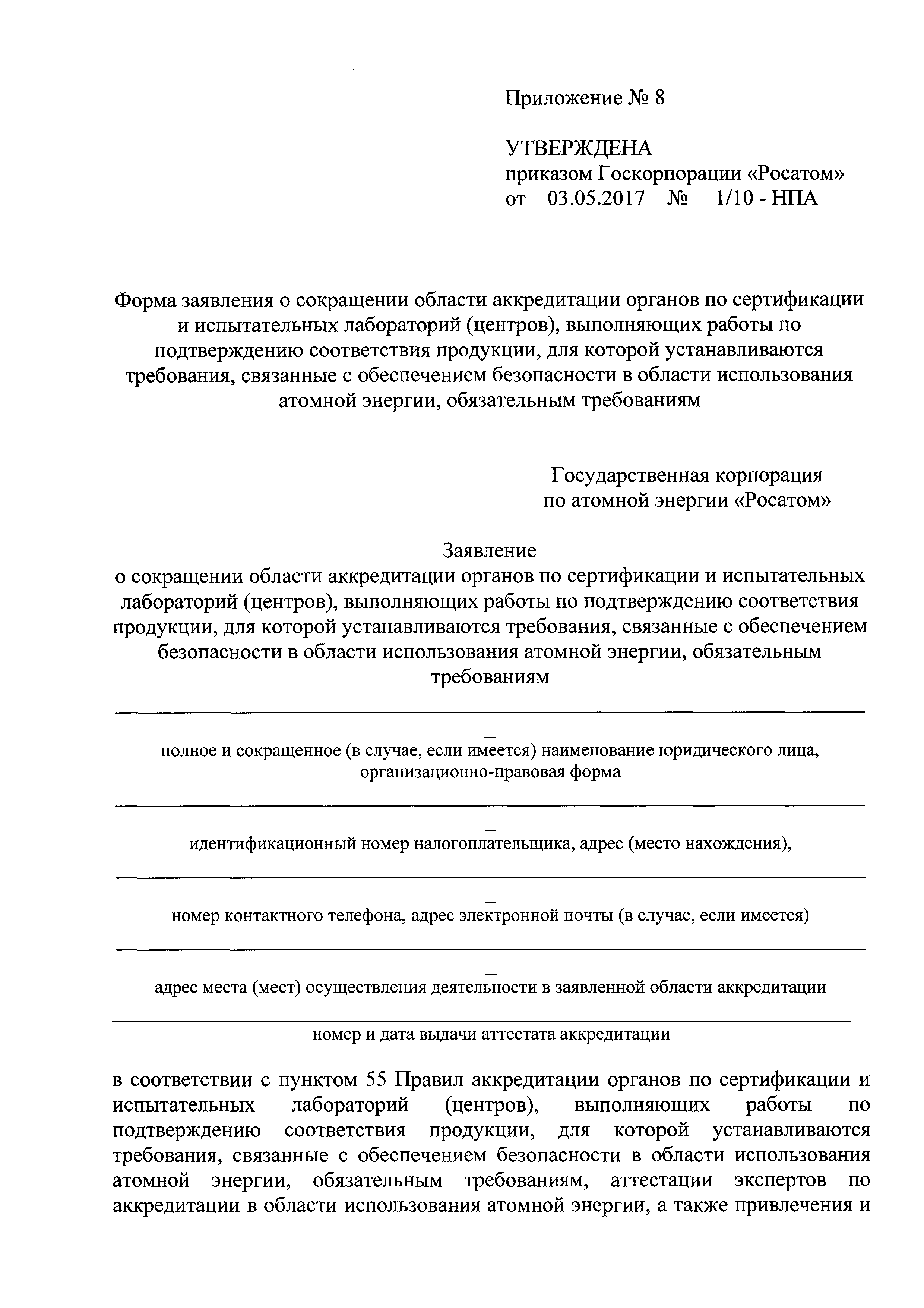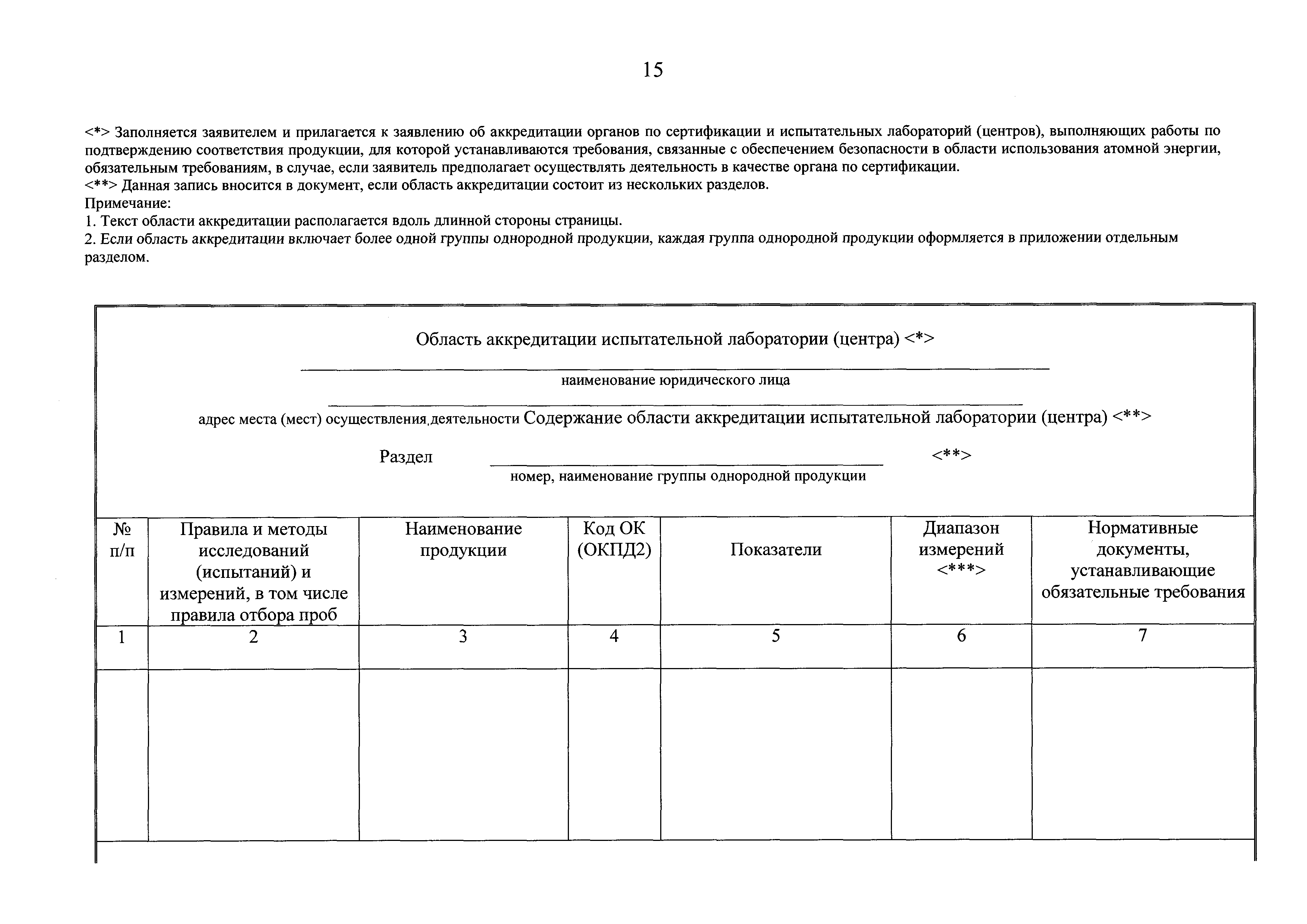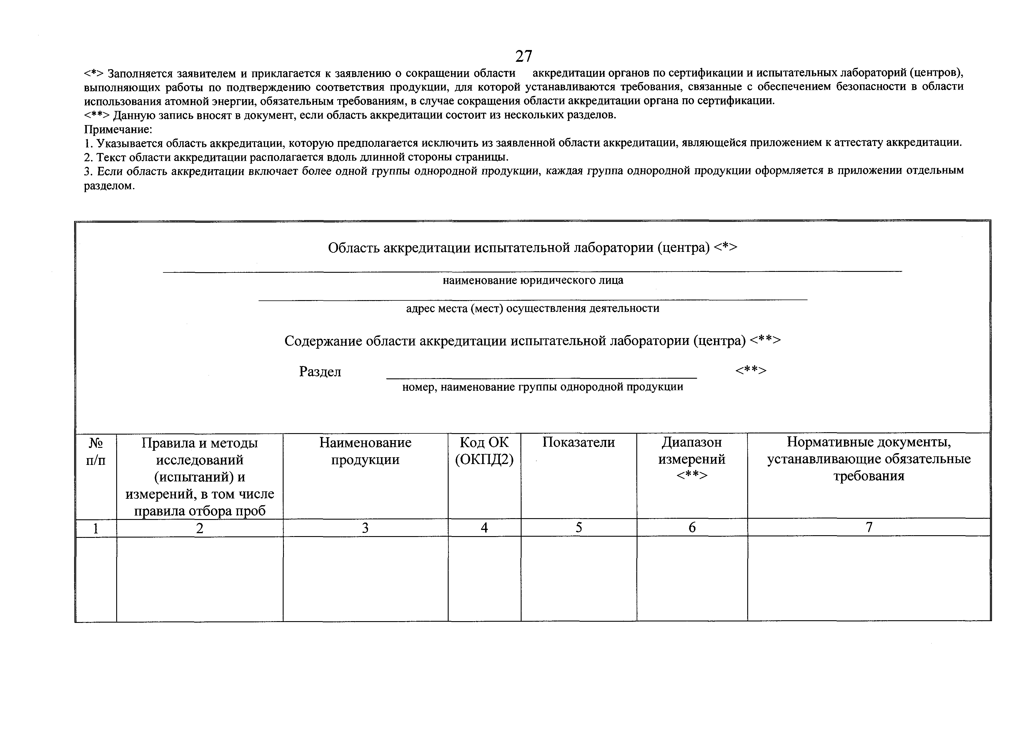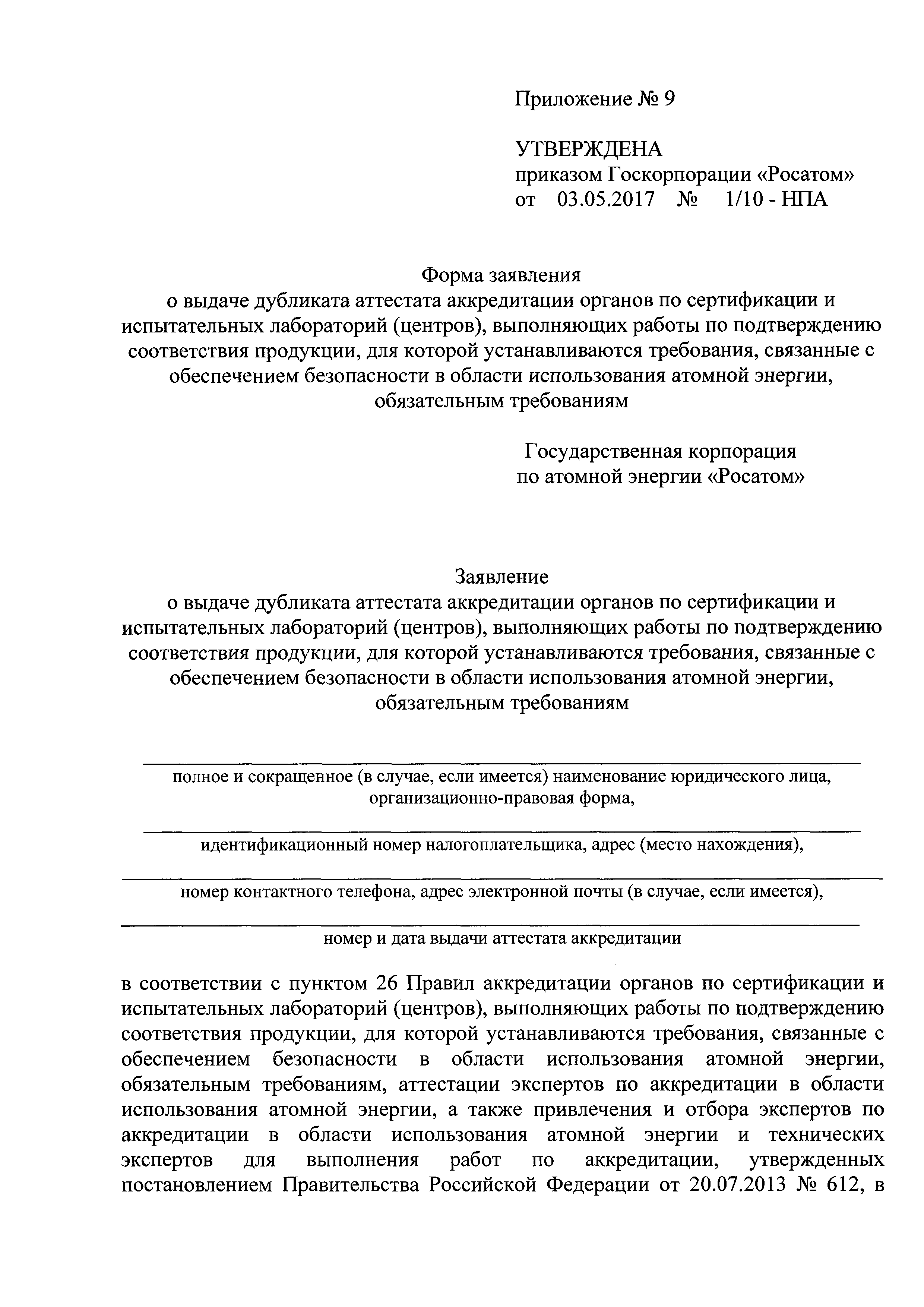 | Оглавление: | Приложение № 1. Форма аттестата аккредитации органов по сертификации и испытательных лабораторий (центров), выполняющих работы по подтверждению соответствия продукции, для которой устанавливаются требования, связанные с обеспечением безопасности в области использования атомной энергии, обязательным требованиям Приложение № 2. Форма приложения к аттестату аккредитации органа по сертификации, испытательной лаборатории (центра), выполняющих работы по подтверждению соответствия продукции, для которой устанавливаются требования, связанные с обеспечением безопасности в области использования атомной энергии, обязательным требованиям для органа по сертификации Приложение № 3. Форма приложения к аттестату аккредитации органа по сертификации, испытательной лаборатории (центра), выполняющих работы по подтверждению соответствия продукции, для которой устанавливаются требования, связанные с обеспечением безопасности в области использования атомной энергии, обязательным требованиям для испытательной лаборатории (центра) Приложение № 4. Форма решения органа по аккредитации о проведении оценки соответствия заявителя критериям аккредитации органов по сертификации и испытательных лабораторий (центров), выполняющих работы по подтверждению соответствия продукции, для которой устанавливаются требования, связанные с обеспечением безопасности в области использования атомной энергии, обязательным требованиям, и требованиям к ним Приложение № 5. Форма заявления об аккредитации органов по сертификации и испытательных лабораторий (центров), выполняющих работы по подтверждению соответствия продукции, для которой устанавливаются требования, связанные с обеспечением безопасности в области использования атомной энергии, обязательным требованиям Приложение № 6. Форма заявления о переоформлении аттестата аккредитации органов по сертификации и испытательных лабораторий (центров), выполняющих работы по подтверждению соответствия продукции, для которой устанавливаются требования, связанные с обеспечением безопасности в области использования атомной энергии, обязательным требованиям Приложение № 7. Форма заявления о расширении области аккредитации органов по сертификации и испытательных лабораторий (центров), выполняющих работы по подтверждению соответствия продукции, для которой устанавливаются требования, связанные с обеспечением безопасности в области использования атомной энергии, обязательным требованиям Приложение № 8. Форма заявления о сокращении области аккредитации органов по сертификации и испытательных лабораторий (центров), выполняющих работы по подтверждению соответствия продукции, для которой устанавливаются требования, связанные с обеспечением безопасности в области использования атомной энергии, обязательным требованиям Приложение № 9. Форма заявления о выдаче дубликата аттестата аккредитации органов по сертификации и испытательных лабораторий (центров), выполняющих работы по подтверждению соответствия продукции, для которой устанавливаются требования, связанные с обеспечением безопасности в области использования атомной энергии, обязательным требованиям Приложение № 10. Форма заявления о прекращении действия аттестата аккредитации органов по сертификации и испыт