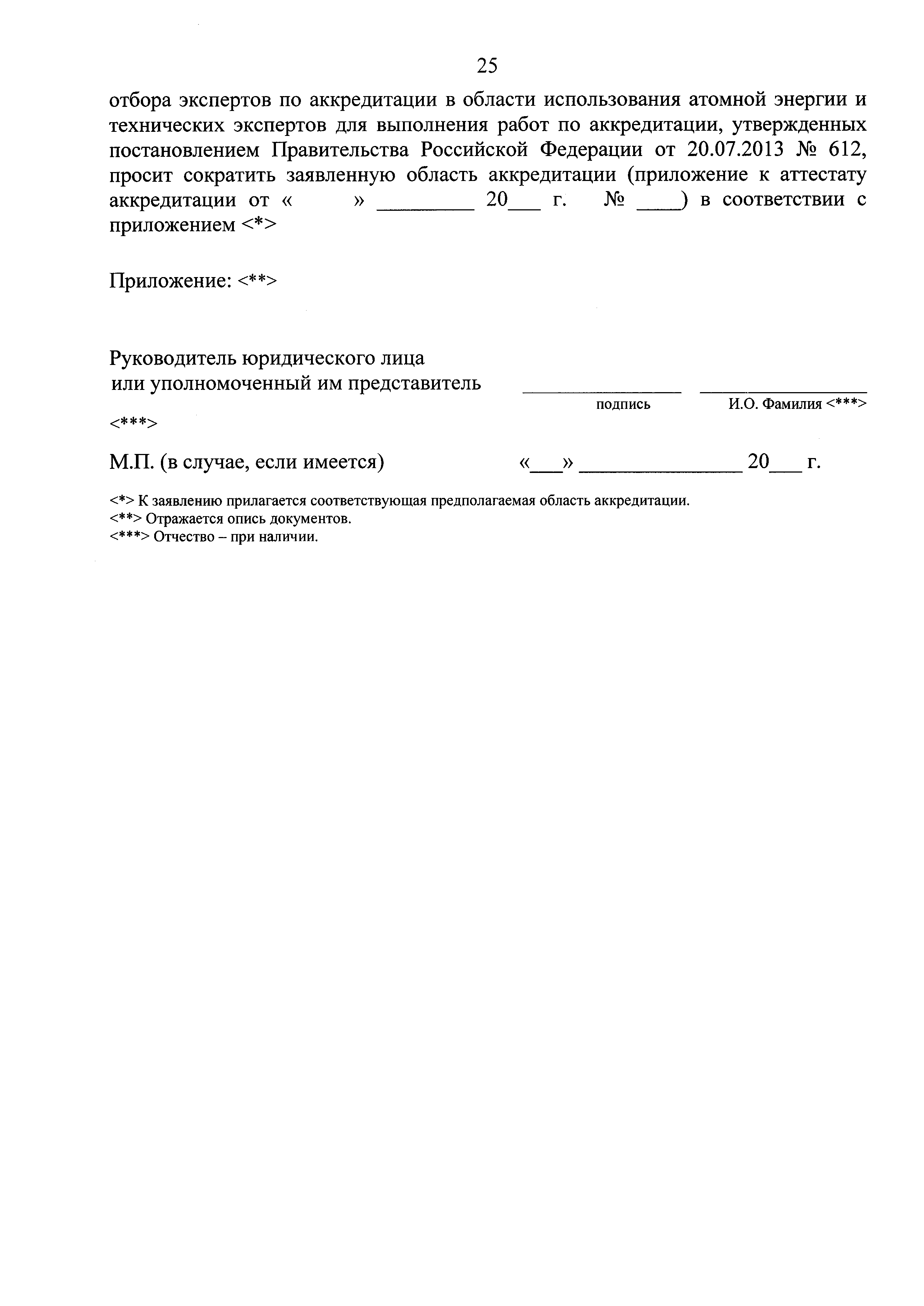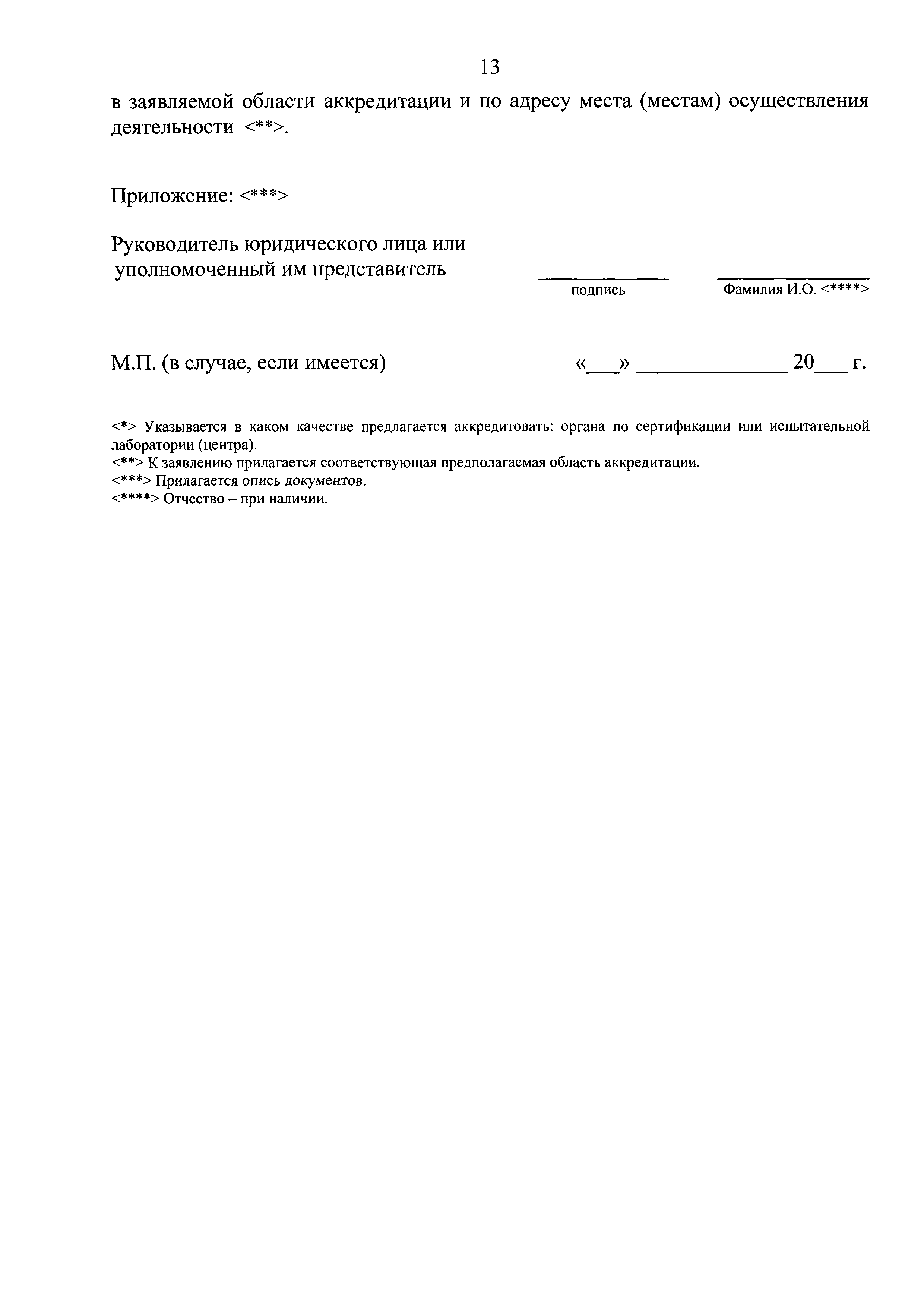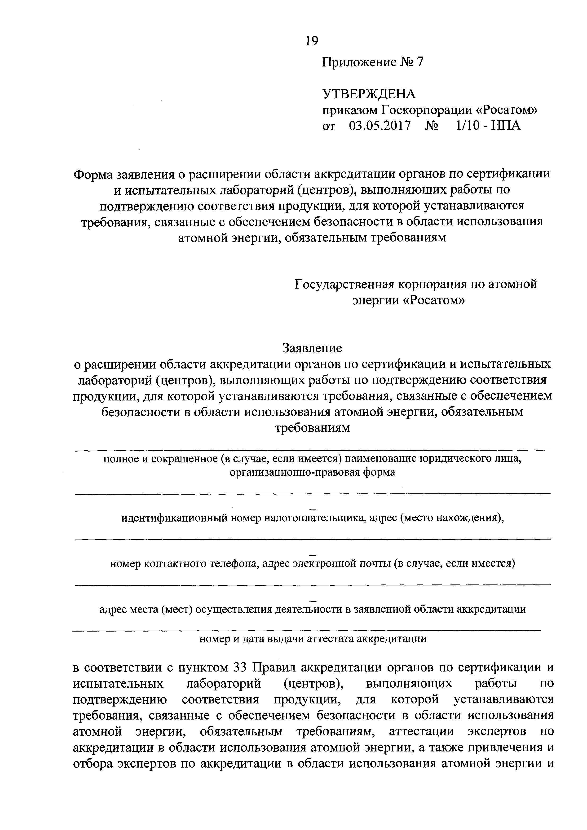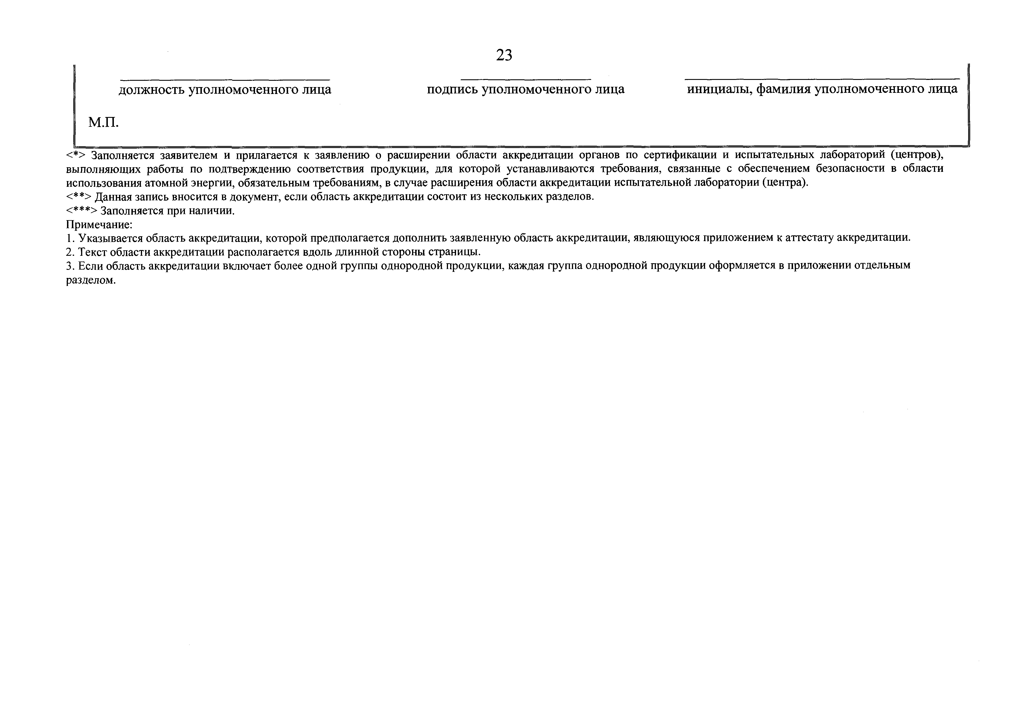 | Оглавление: | Приложение № 1. Форма аттестата аккредитации органов по сертификации и испытательных лабораторий (центров), выполняющих работы по подтверждению соответствия продукции, для которой устанавливаются требования, связанные с обеспечением безопасности в области использования атомной энергии, обязательным требованиям Приложение № 2. Форма приложения к аттестату аккредитации органа по сертификации, испытательной лаборатории (центра), выполняющих работы по подтверждению соответствия продукции, для которой устанавливаются требования, связанные с обеспечением безопасности в области использования атомной энергии, обязательным требованиям для органа по сертификации Приложение № 3. Форма приложения к аттестату аккредитации органа по сертификации, испытательной лаборатории (центра), выполняющих работы по подтверждению соответствия продукции, для которой устанавливаются требования, связанные с обеспечением безопасности в области использования атомной энергии, обязательным требованиям для испытательной лаборатории (центра) Приложение № 4. Форма решения органа по аккредитации о проведении оценки соответствия заявителя критериям аккредитации органов по сертификации и испытательных лабораторий (центров), выполняющих работы по подтверждению соответствия продукции, для которой устанавливаются требования, связанные с обеспечением безопасности в области использования атомной энергии, обязательным требованиям, и требованиям к ним Приложение № 5. Форма заявления об аккредитации органов по сертификации и испытательных лабораторий (центров), выполняющих работы по подтверждению соответствия продукции, для которой устанавливаются требования, связанные с обеспечением безопасности в области использования атомной энергии, обязательным требованиям Приложение № 6. Форма заявления о переоформлении аттестата аккредитации органов по сертификации и испытательных лабораторий (центров), выполняющих работы по подтверждению соответствия продукции, для которой устанавливаются требования, связанные с обеспечением безопасности в области использования атомной энергии, обязательным требованиям Приложение № 7. Форма заявления о расширении области аккредитации органов по сертификации и испытательных лабораторий (центров), выполняющих работы по подтверждению соответствия продукции, для которой устанавливаются требования, связанные с обеспечением безопасности в области использования атомной энергии, обязательным требованиям Приложение № 8. Форма заявления о сокращении области аккредитации органов по сертификации и испытательных лабораторий (центров), выполняющих работы по подтверждению соответствия продукции, для которой устанавливаются требования, связанные с обеспечением безопасности в области использования атомной энергии, обязательным требованиям Приложение № 9. Форма заявления о выдаче дубликата аттестата аккредитации органов по сертификации и испытательных лабораторий (центров), выполняющих работы по подтверждению соответствия продукции, для которой устанавливаются требования, связанные с обеспечением безопасности в области использования атомной энергии, обязательным требованиям Приложение № 10. Форма заявления о прекращении действия аттестата аккредитации органов по сертификации и испыт