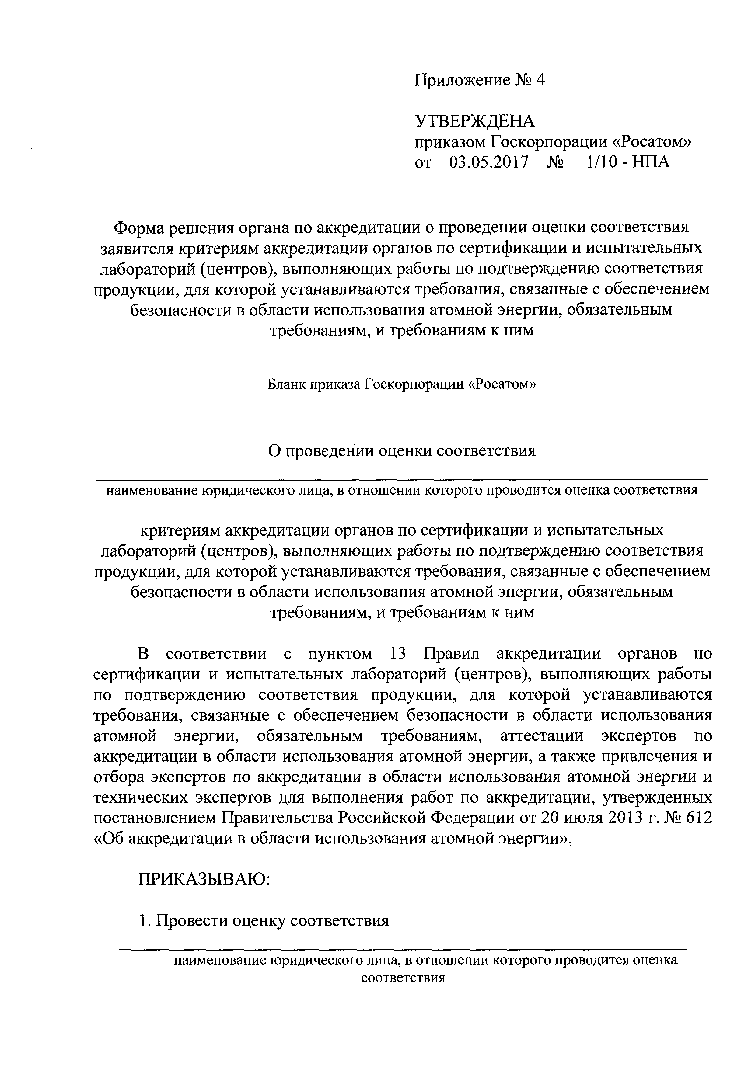 | Название рус.: | Об утверждении формы аттестата аккредитации органа по сертификации, испытательной лаборатории (центра), выполняющих работы по подтверждению соответствия продукции, для которой устанавливаются требования, связанные с обеспечением безопасности в области использования атомной энергии, обязательным требованиям и форм приложений к нему, формы решения органа по аккредитации о проведении оценки соответствия заявителя критериям аккредитации органов по сертификации и испытательных лабораторий (центров), выполняющих работы по подтверждению соответствия продукции, для которой устанавливаются требования, связанные с обеспечением безопасности в области использования атомной энергии, обязательным требованиям, и форм заявлений, подаваемых юридическими лицами, претендующими на аккредитацию в качестве органа по сертификации, испытательной лаборатории (центра), и органами по сертификации и испытательными лабораториями (центрами), выполняющими работы по подтверждению соответствия продукции, для которой устанавливаются требования, связанные с обеспечением безопасности в области использования атомной энергии, обязательным требованиям |