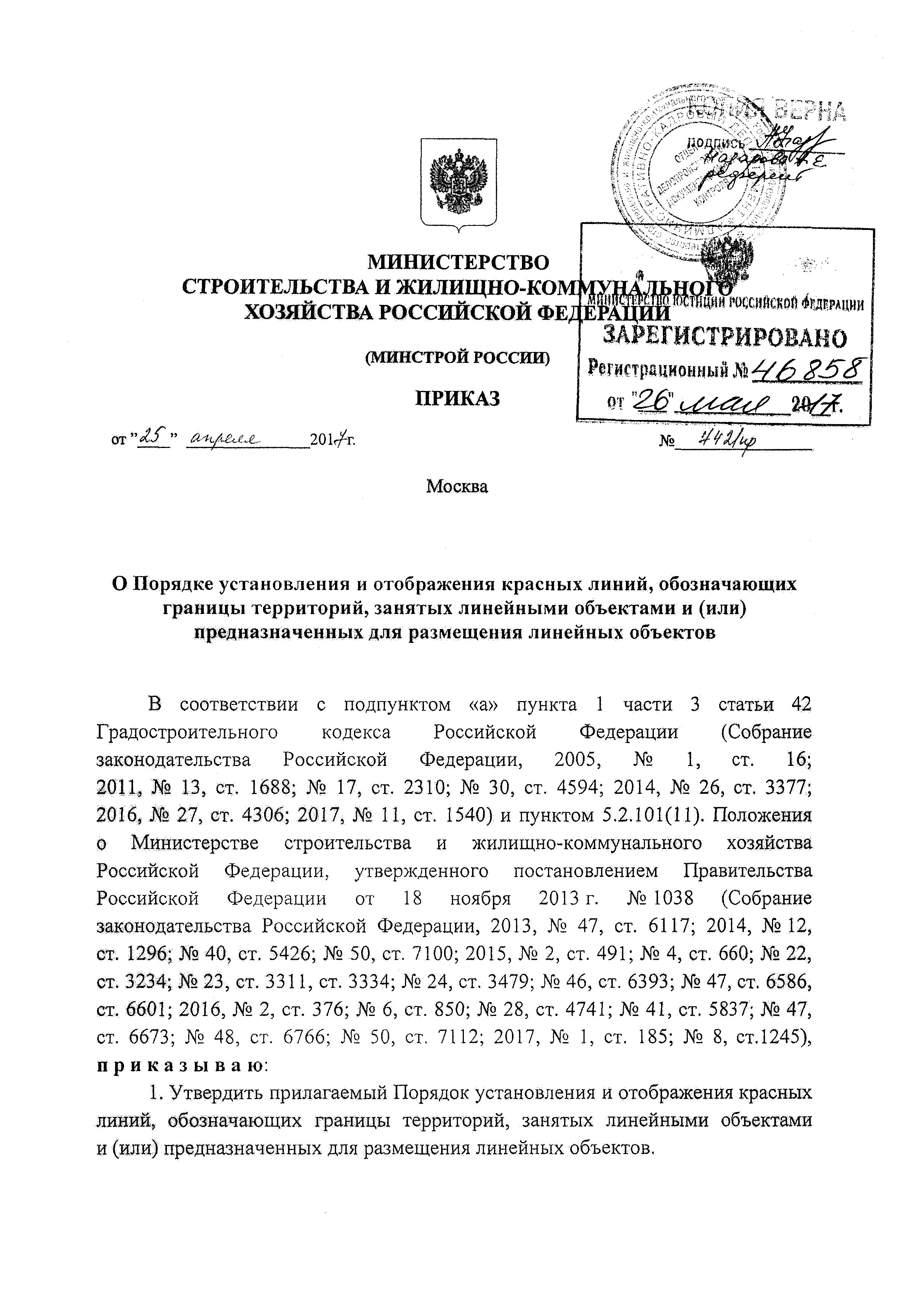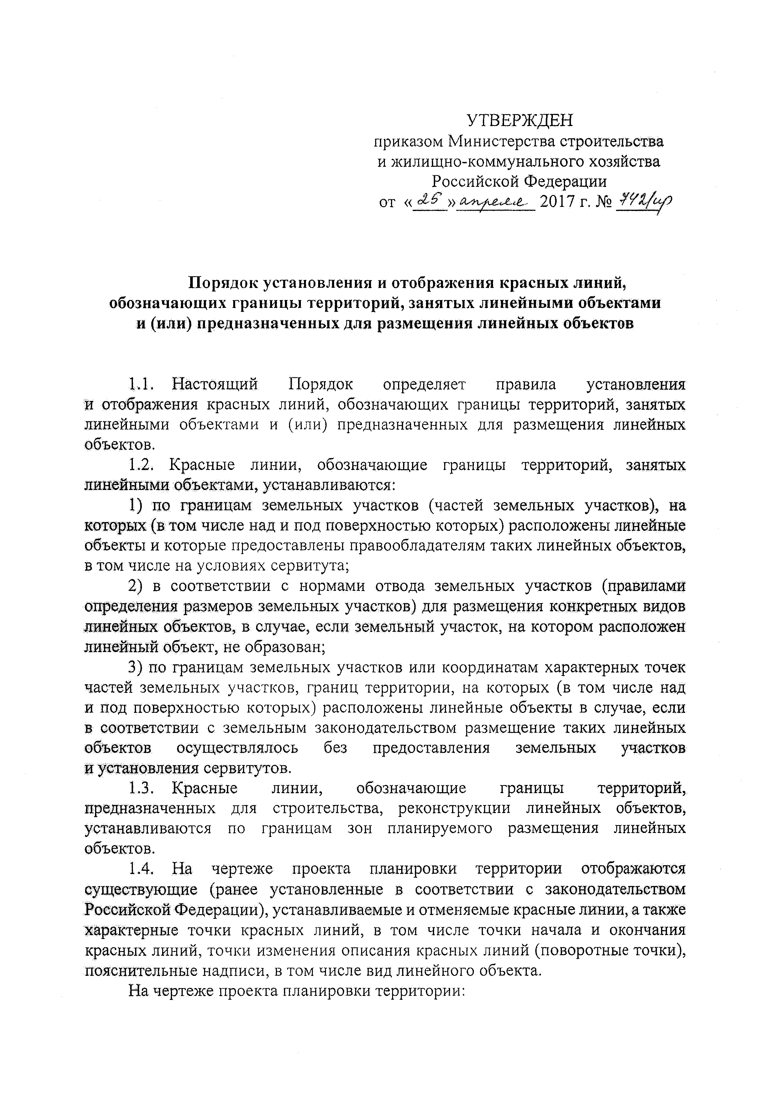 Порядок установления и отображения красных линий, обозначающих границы территорий, занятых линейными объектами и (или) предназначенных для размещения линейных объектов| Статус: | утратил силу | | Название рус.: | Порядок установления и отображения красных линий, обозначающих границы территорий, занятых линейными объектами и (или) предназначенных для размещения линейных объектов | | Дата добавления в базу: | 01.01.2018 | | Дата актуализации: | 01.01.2021 | | Дата введения: | 09.06.2017 | | Дата окончания срока действия: | 08.02.2020 | | Область применения: | Порядок определяет правила установления и отображения красных линий, обозначающих границы территорий, занятых линейными объектами и (или) предназначенных для размещения линейных объектов | | Утверждён: | 25.04.2017 Министерство строительства и жилищно-коммунального хозяйства Российской Федерации (742/пр)