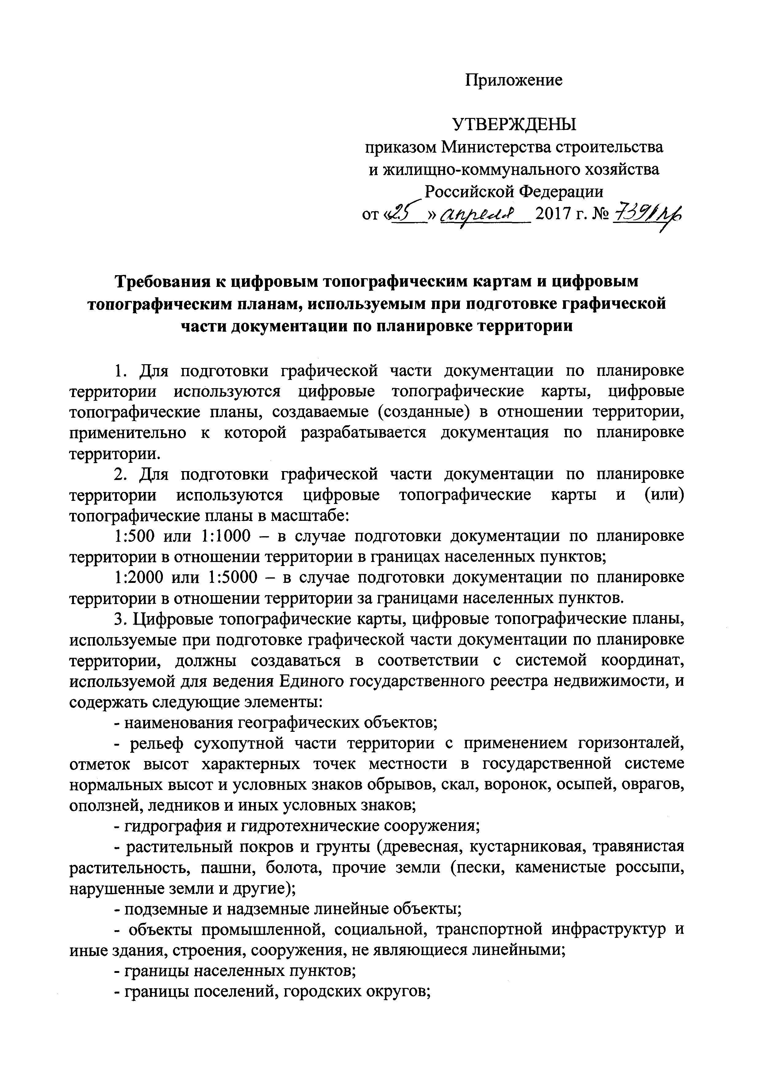 Требования к цифровым топографическим картам и цифровым топографическим планам, используемым при подготовке графической части документации по планировке территории| Статус: | действует | | Название рус.: | Требования к цифровым топографическим картам и цифровым топографическим планам, используемым при подготовке графической части документации по планировке территории | | Дата добавления в базу: | 01.01.2018 | | Дата актуализации: | 01.01.2021 | | Дата введения: | 05.06.2017 | | Утверждён: | 25.04.2017 Министерство строительства и жилищно-коммунального хозяйства Российской Федерации (739/пр)