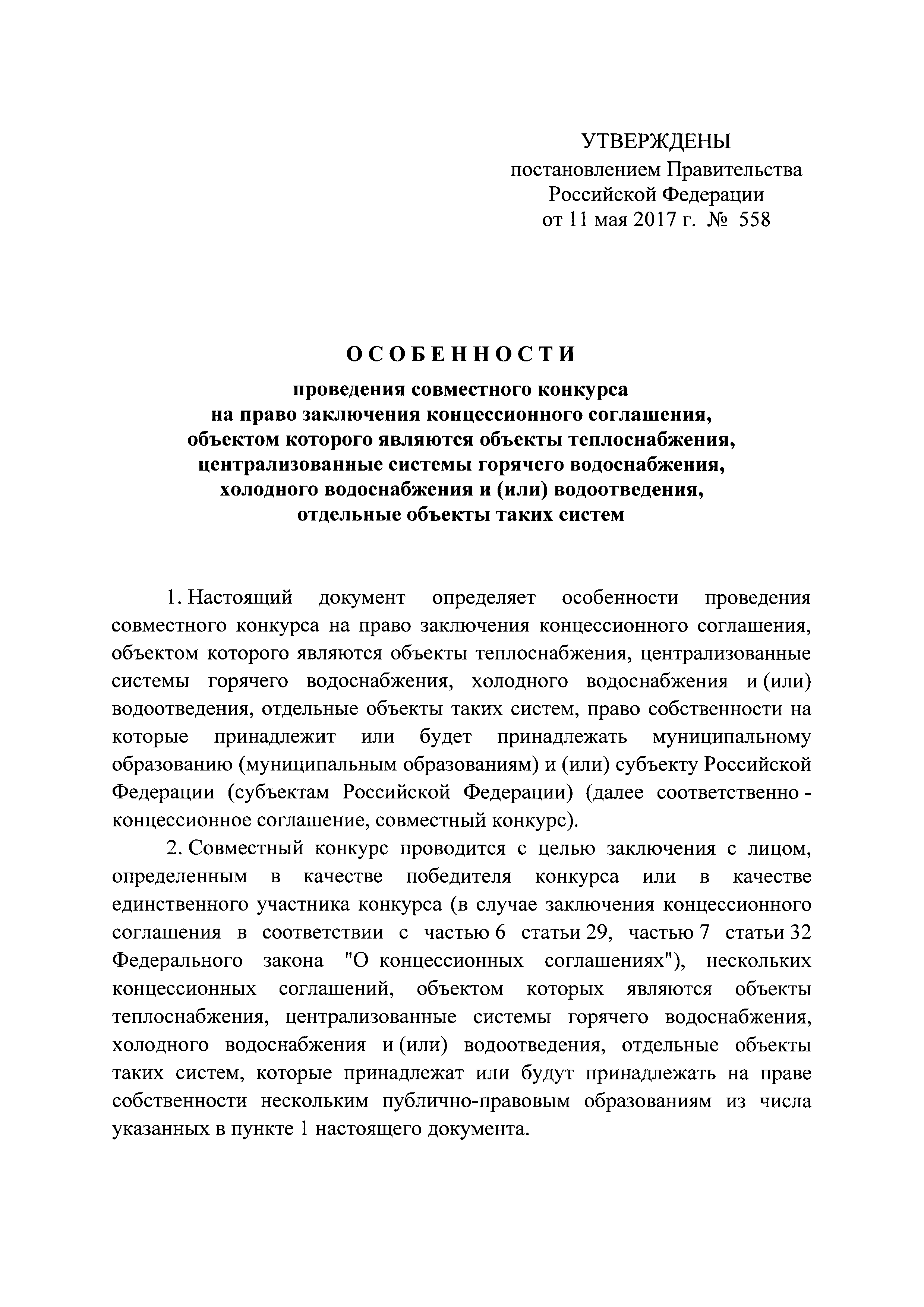 Особенности проведения совместного конкурса на право заключения концессионного соглашения, объектом которого являются объекты теплоснабжения, централизованные системы горячего водоснабжения, холодного водоснабжения и (или) водоотведения, отдельные объекты таких систем| Статус: | действует | | Название рус.: | Особенности проведения совместного конкурса на право заключения концессионного соглашения, объектом которого являются объекты теплоснабжения, централизованные системы горячего водоснабжения, холодного водоснабжения и (или) водоотведения, отдельные объекты таких систем | | Дата добавления в базу: | 01.01.2018 | | Дата актуализации: | 01.01.2021 | | Дата введения: | 24.05.2017 | | Утверждён: | 11.05.2017 Правительство Российской Федерации (558)