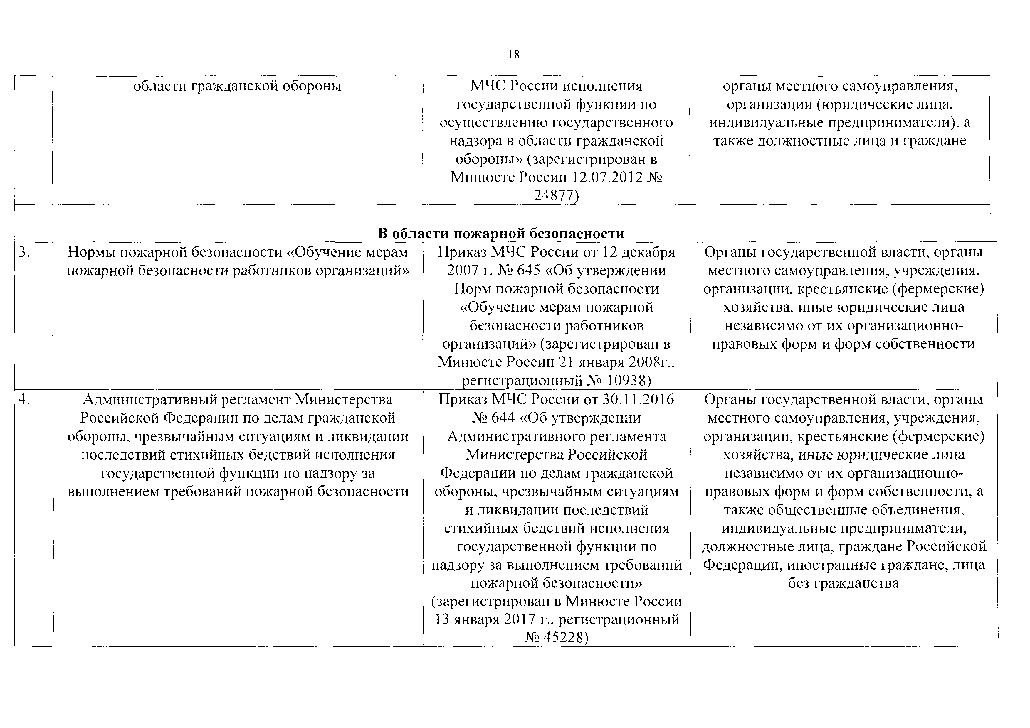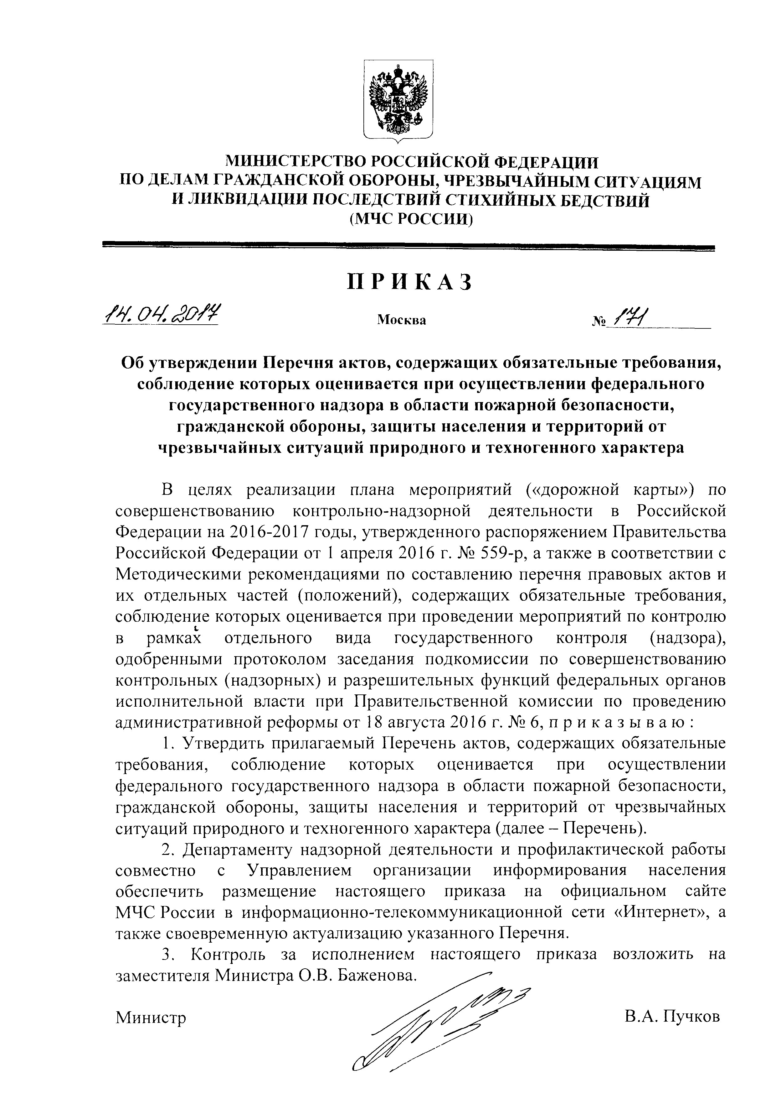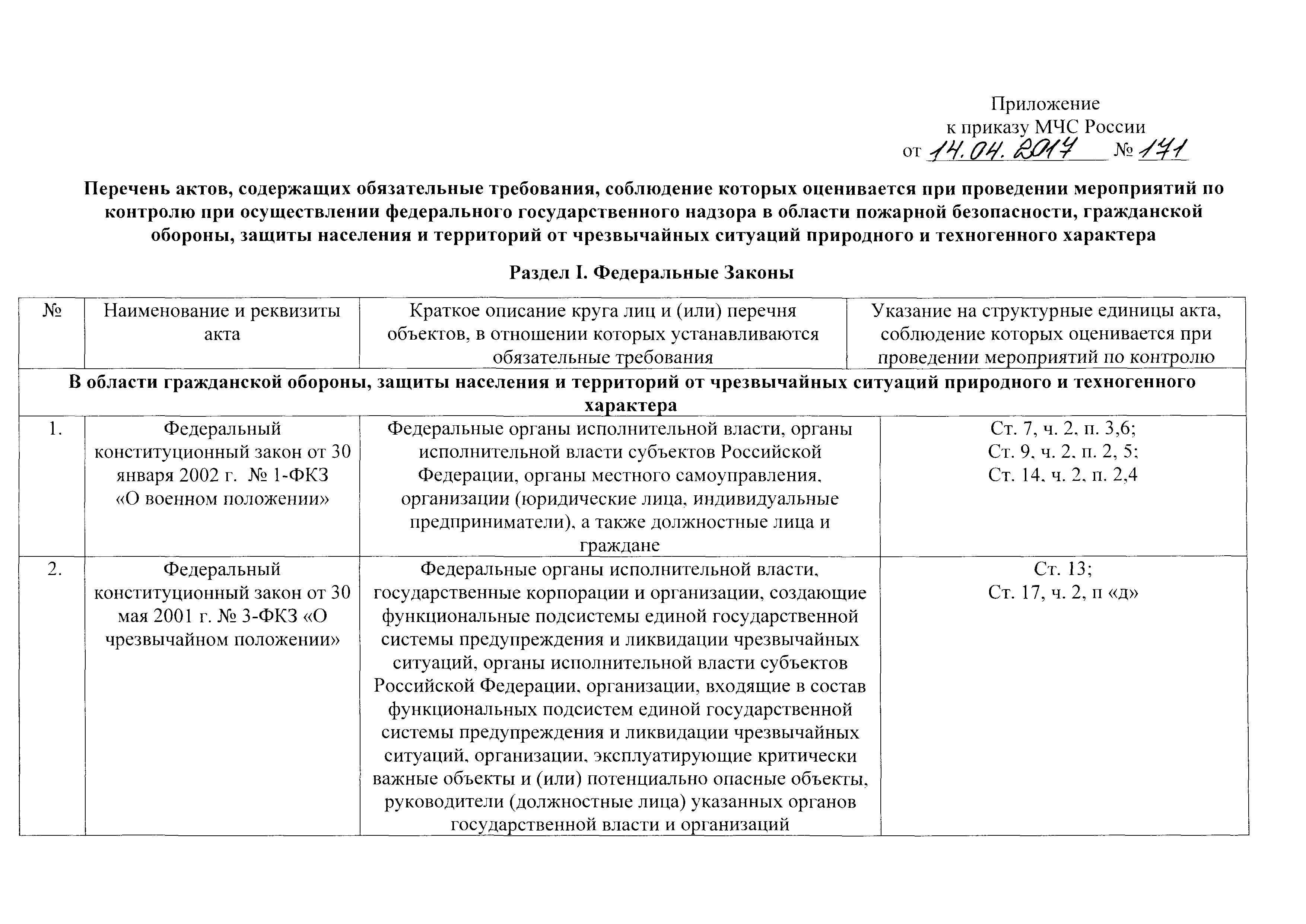 | Название рус.: | Перечень актов, содержащих обязательные требования, соблюдение которых оценивается при проведении мероприятий по контролю при осуществлении федерального государственного надзора в области пожарной безопасности, гражданской обороны, защиты населения и территорий от чрезвычайных ситуаций природного и техногенного характера |