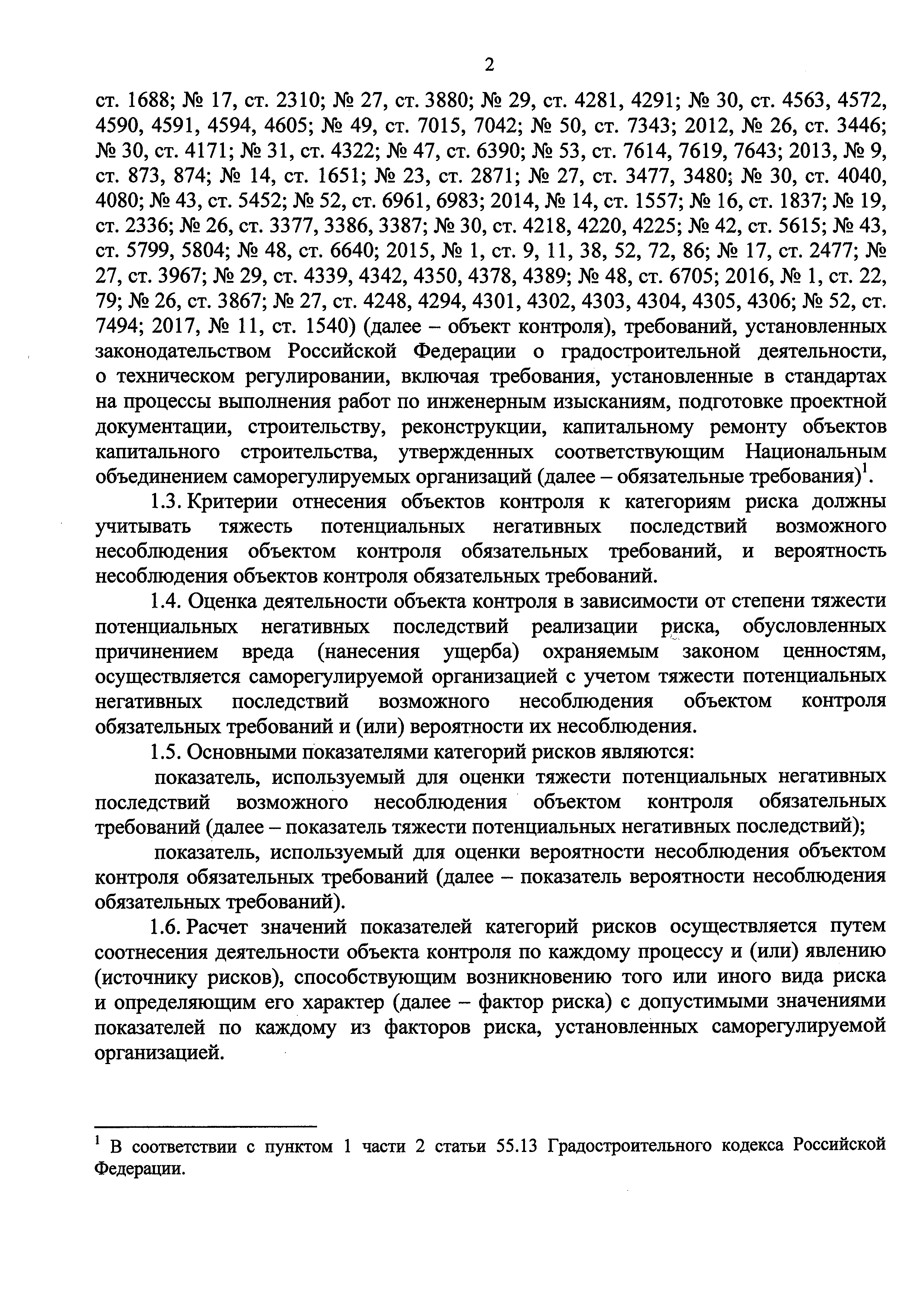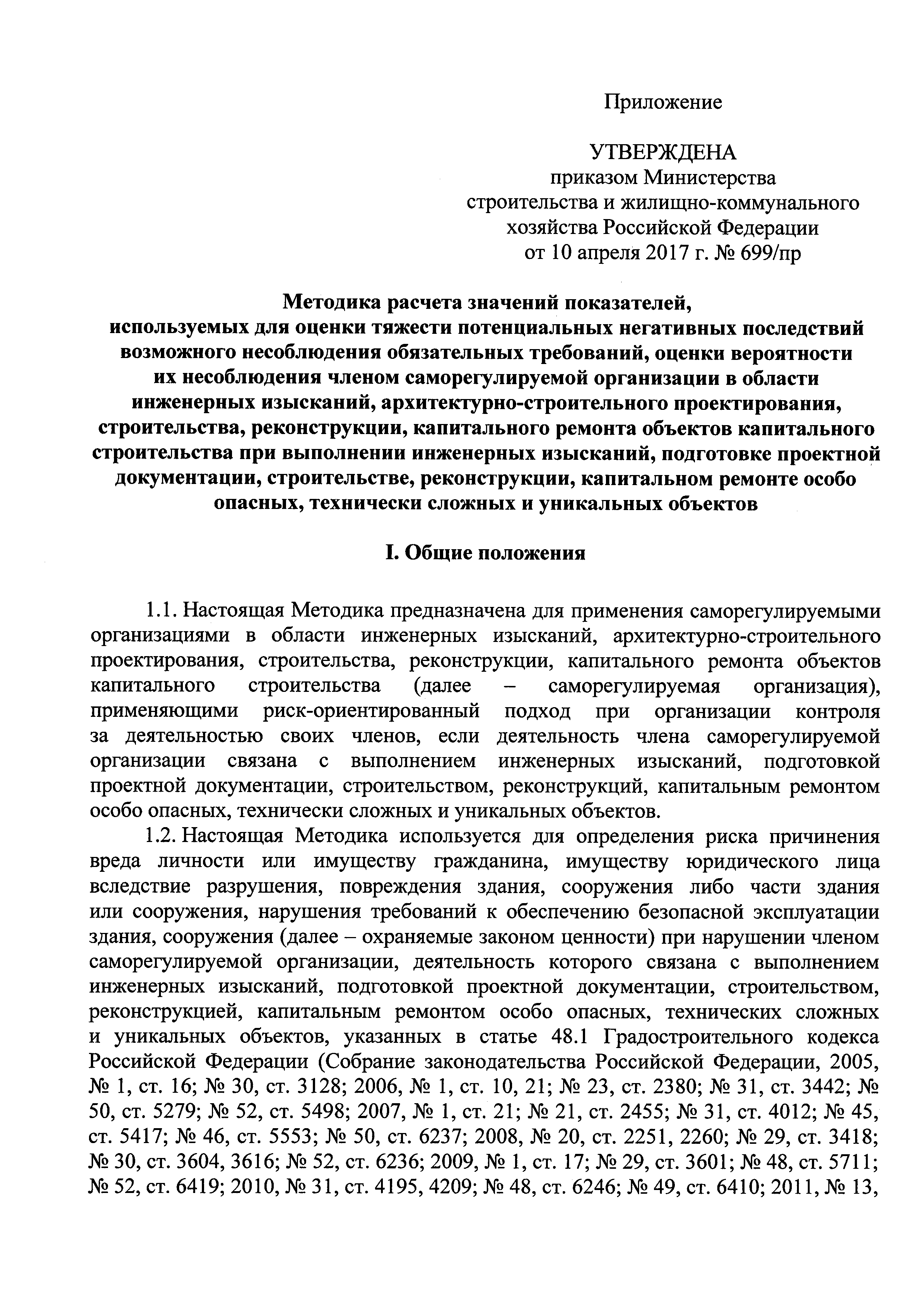 Методика расчета значений показателей, используемых для оценки тяжести потенциальных негативных последствий возможного несоблюдения обязательных требований, оценки вероятности их несоблюдения членом саморегулируемой организации в области инженерных изысканий, архитектурно-строительного проектирования, строительства, реконструкции, капитального ремонта объектов капитального строительства при выполнении инженерных изысканий, подготовке проектной документации, строительстве, реконструкции, капитальном ремонте особо опасных, технически сложных и уникальных объектов| Статус: | действует | | Название рус.: | Методика расчета значений показателей, используемых для оценки тяжести потенциальных негативных последствий возможного несоблюдения обязательных требований, оценки вероятности их несоблюдения членом саморегулируемой организации в области инженерных изысканий, архитектурно-строительного проектирования, строительства, реконструкции, капитального ремонта объектов капитального строительства при выполнении инженерных изысканий, подготовке проектной документации, строительстве, реконструкции, капитальном ремонте особо опасных, технически сложных и уникальных объектов | | Дата добавления в базу: | 01.01.2018 | | Дата актуализации: | 01.01.2021 | | Дата введения: | 01.07.2017 | | Область применения: | Методика предназначена для применения саморегулируемыми организациями в области инженерных изысканий, архитектурно-строительного проектирования, строительства, реконструкции, капитального ремонта объектов капитального строительства, применяющими риск-ориентированный подход при организации контроля за деятельностью своих членов, если деятельность члена саморегулируемой организации связана с выполнением инженерных изысканий, подготовкой проектной документации, строительством, реконструкций, капитальным ремонтом особо опасных, технически сложных и уникальных объектов | | Оглавление: | I. Общие положения II. Расчет значений показателей тяжести потенциальных негативных последствий III. Расчет значений показателей вероятности несоблюдения обязательных требований | | Утверждён: | 10.04.2017 Министерство строительства и жилищно-коммунального хозяйства Российской Федерации (699/пр)