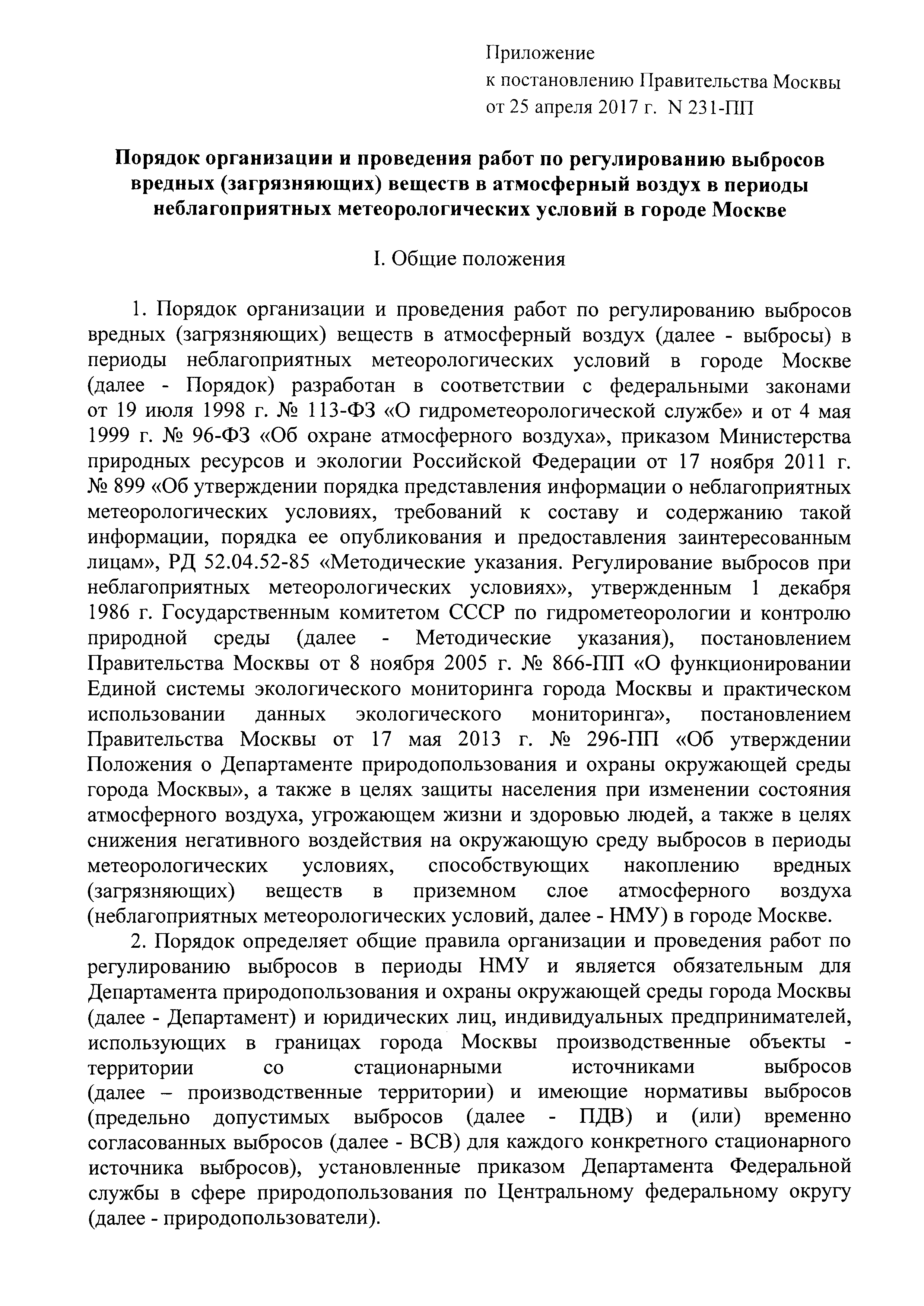 | Область применения: | Порядок определяет общие правила организации и проведения работ по регулированию выбросов в периоды НМУ и является обязательным для Департамента природопользования и охраны окружающей среды города Москвы и юридических лиц, индивидуальных предпринимателей, использующих в границах города Москвы производственные объекты - территории со стационарными источниками выбросов и имеющие нормативы выбросов (предельно допустимых выбросов и (или) временно согласованных выбросов для каждого конкретного стационарного источника выбросов), установленные приказом Департамента Федеральной службы в сфере природопользования по Центральному федеральному округу |