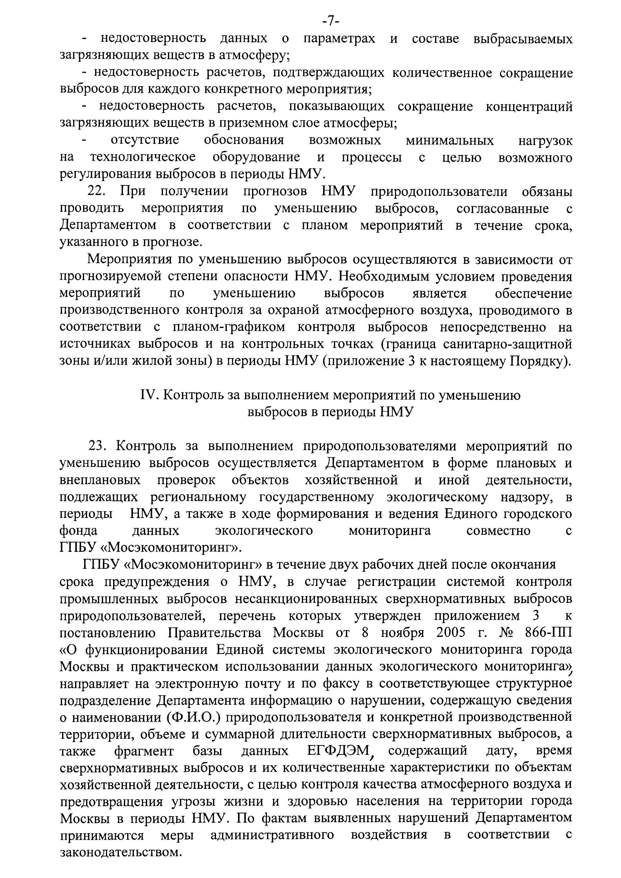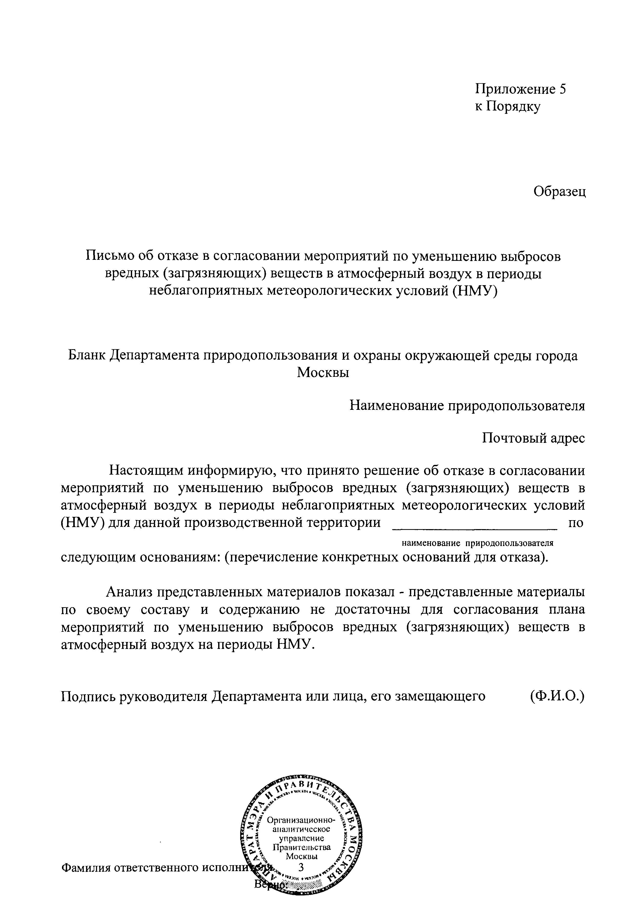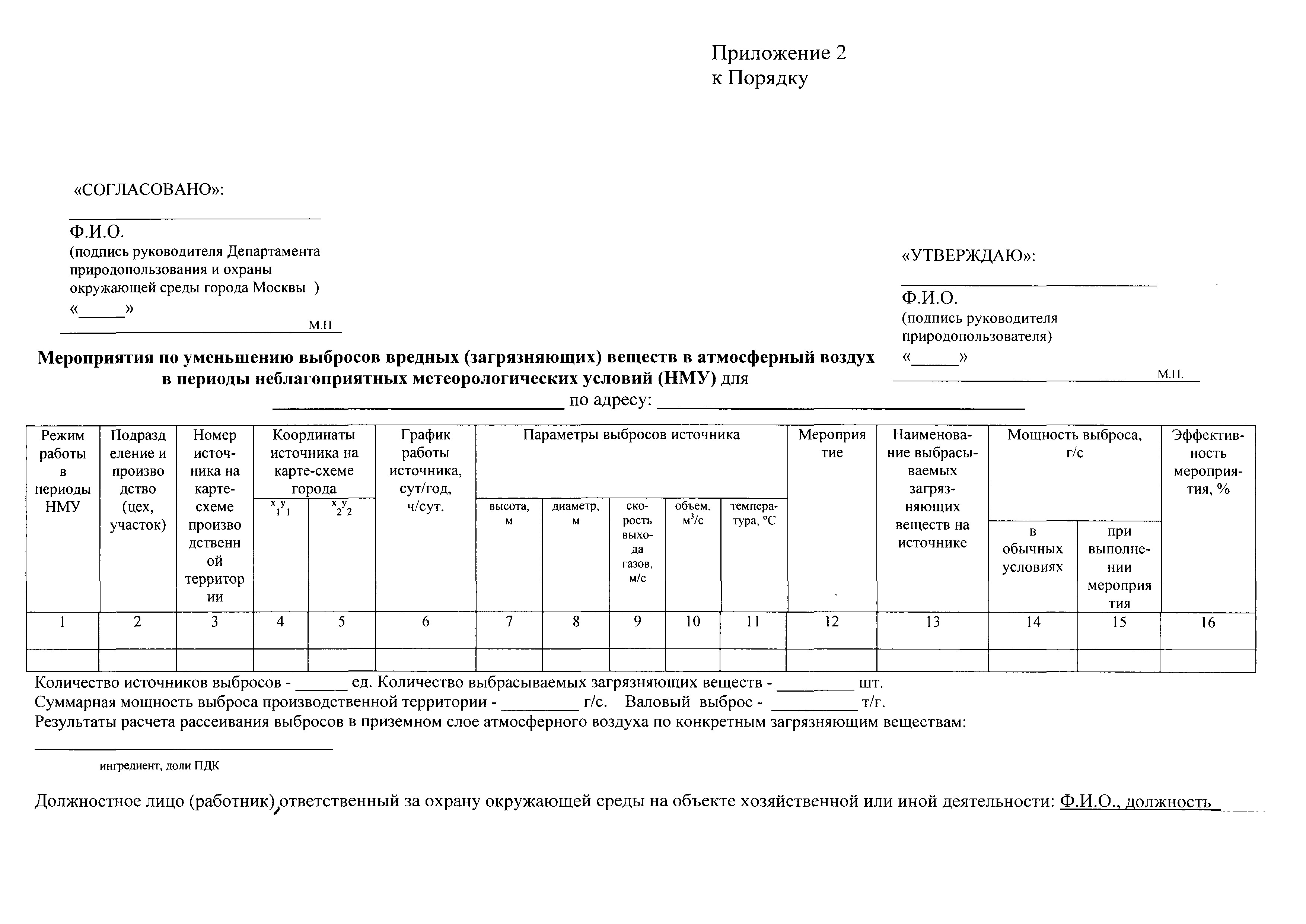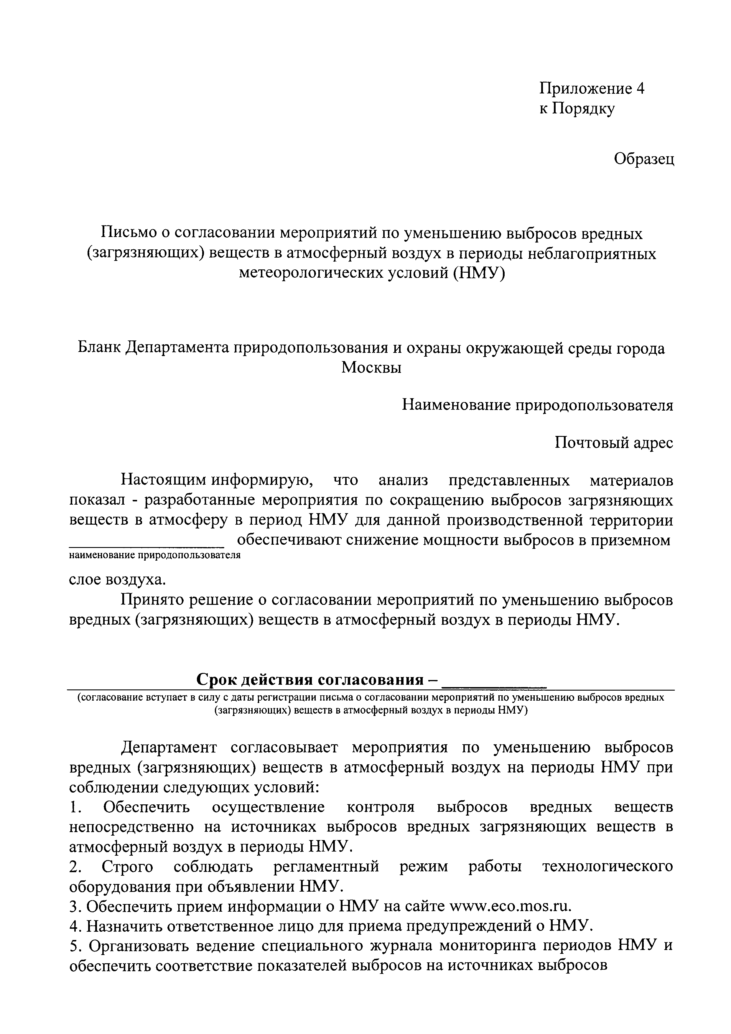 | Оглавление: | I. Общие положения II. Прогнозирование НМУ, порядок передачи предупреждений о наступлении НМУ, информирование природопользователей о НМУ III. Порядок разработки, согласования и проведение природопользователями мероприятий по уменьшению выбросов в периоды НМУ IV. Контроль за выполнением мероприятий по уменьшению выбросов в периоды НМУ Приложение 1. Журнал для записи информации (предупреждений, оповещений) о неблагоприятных метеорологических условиях (НМУ) Приложение 2. Мероприятия по уменьшению выбросов вредных (загрязняющих) веществ в атмосферный воздух в периоды неблагоприятных метеорологических условий (НМУ) Приложение 3. План-график контроля выбросов вредных (загрязняющих) веществ в атмосферу в периоды неблагоприятных метеорологических условиях (НМУ) Приложение 4. Письмо о согласовании мероприятий по уменьшению выбросов вредных (загрязняющих) веществ в атмосферный воздух в периоды неблагоприятных метеорологических условий (НМУ) Приложение 5. Письмо об отказе в согласовании мероприятий по уменьшению выбросов вредных (загрязняющих) веществ в атмосферный воздух в периоды неблагоприятных метеорологических условий (НМУ) |
