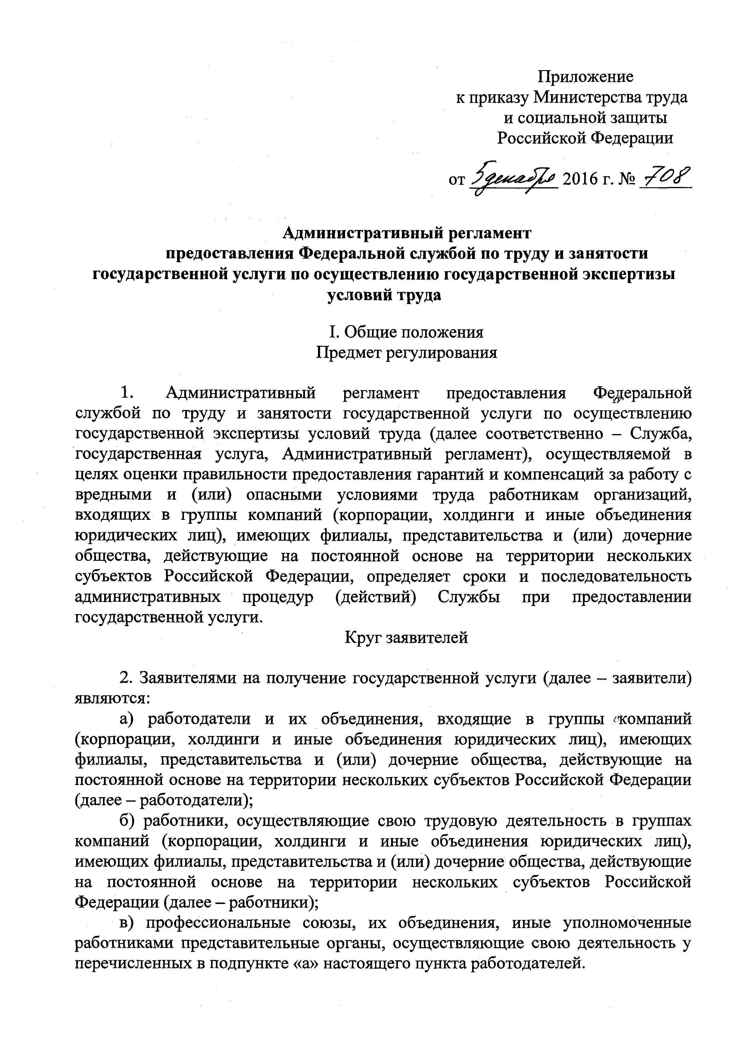 | Область применения: | Административный регламент предоставления Федеральной службой по труду и занятости государственной услуги по осуществлению государственной экспертизы условий, осуществляемой в целях оценки правильности предоставления гарантий и компенсаций за работу с вредными и (или) опасными условиями труда работникам организаций, входящих в группы компаний (корпорации, холдинги и иные объединения юридических лиц), имеющих филиалы, представительства и (или) дочерние общества, действующие на постоянной основе на территории нескольких субъектов Российской Федерации, определяет сроки и последовательность административных процедур (действий) Службы при предоставлении государственной услуги |