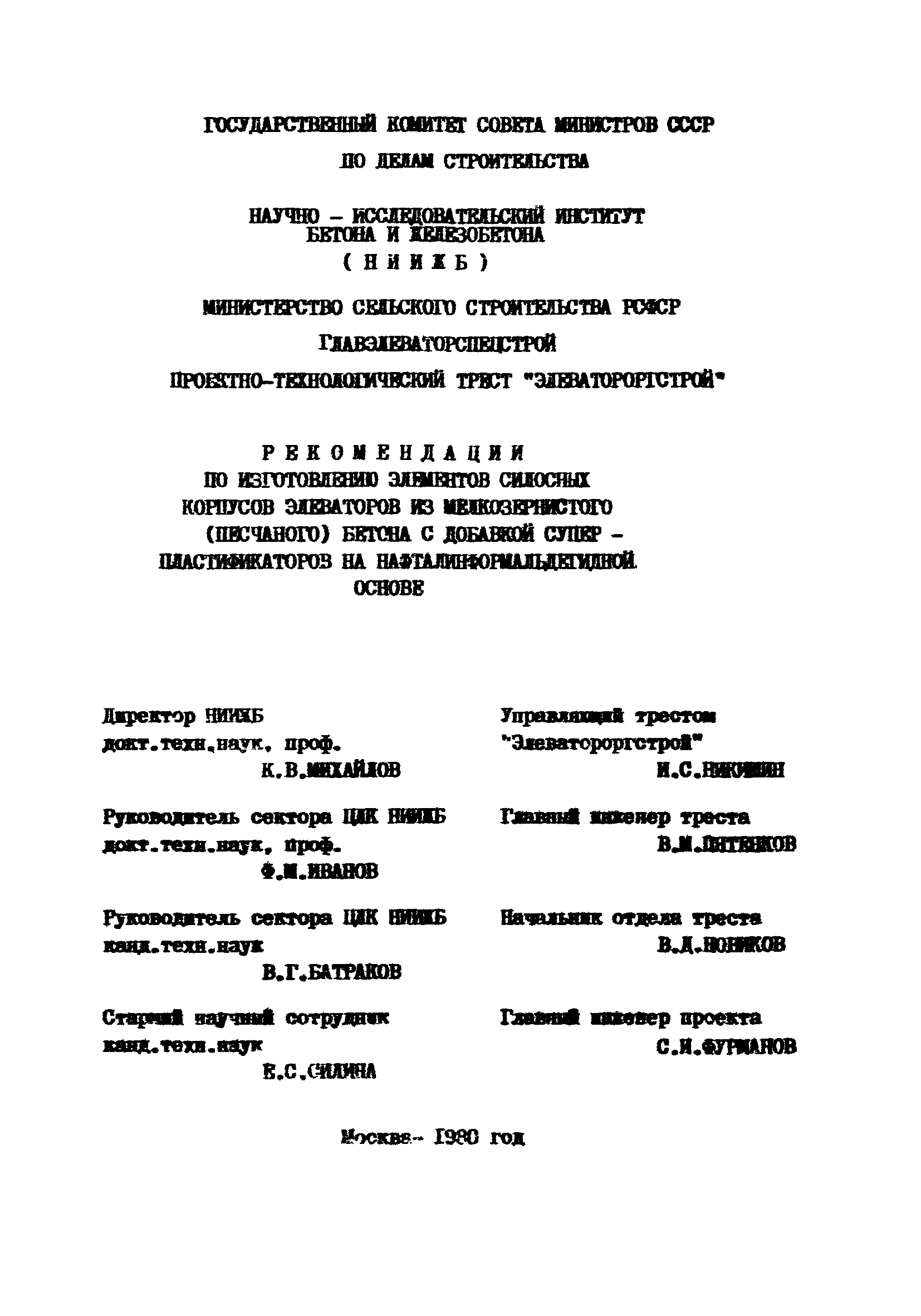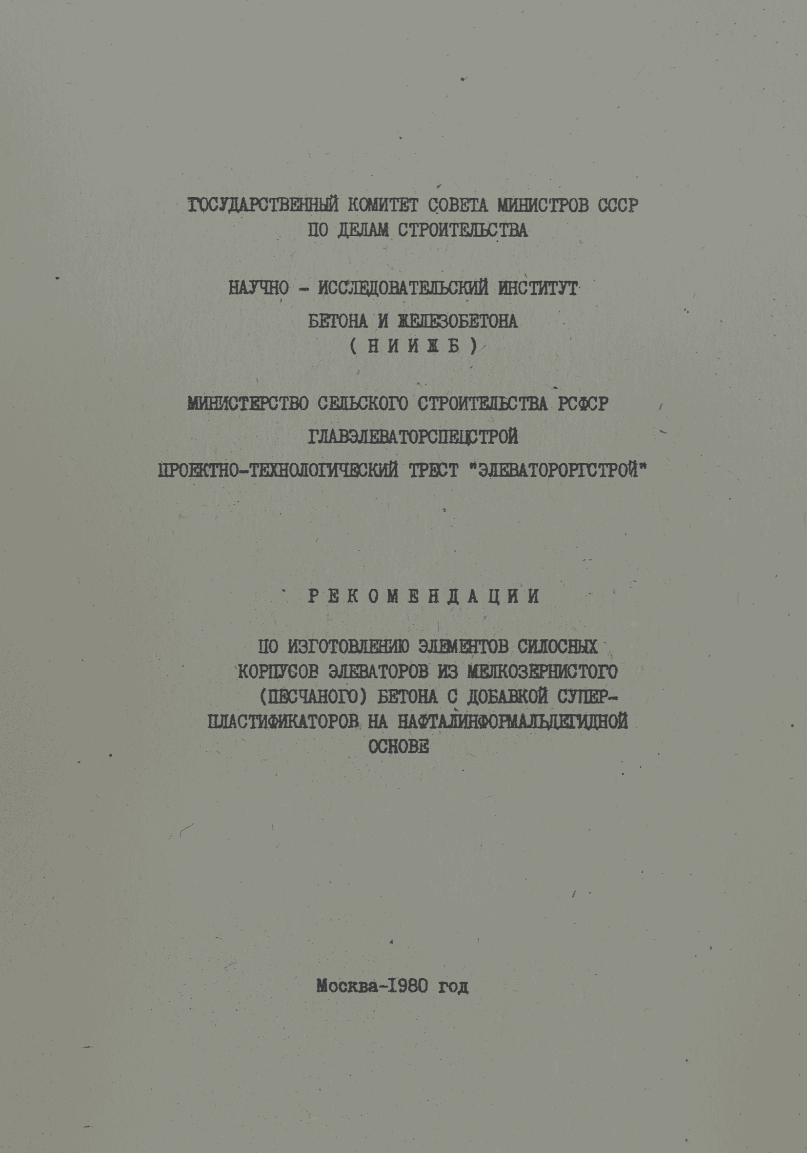 | Название рус.: | Рекомендации по изготовлению элементов силосных корпусов элеваторов из мелкозернистого (песчаного) бетона с добавкой суперпластификаторов на нафталинформальдегидной основе |