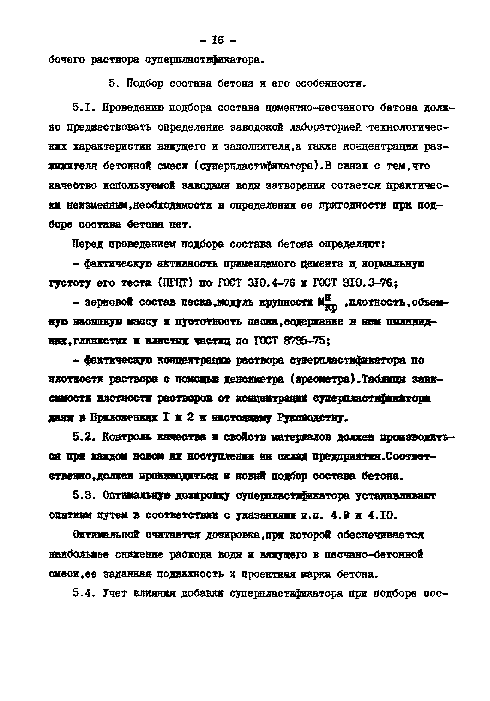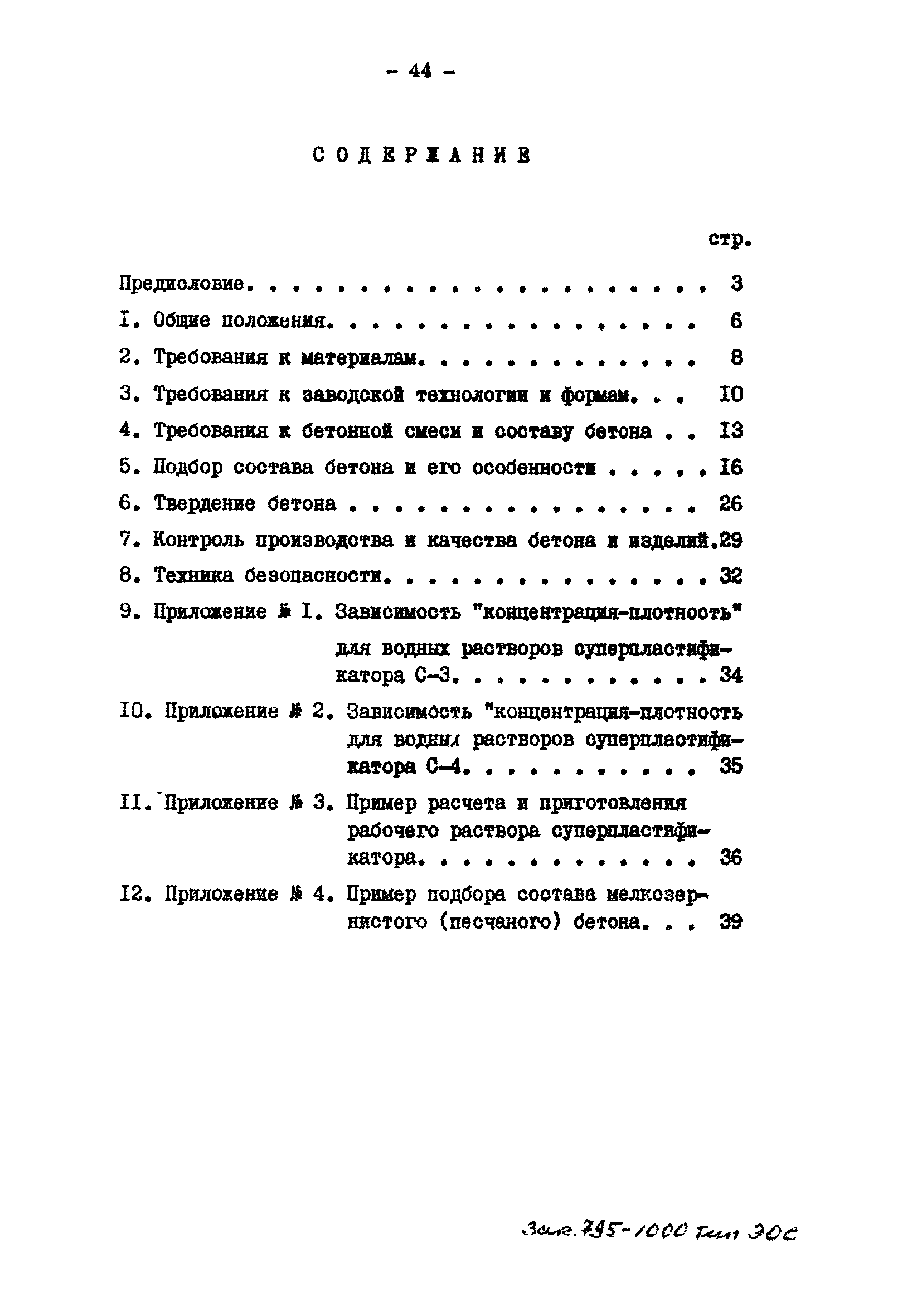 | Оглавление: | Предисловие 1 Общие положения 2 Требования к материалам 3 Требования к заводской технологии и формам 4 Требования к бетонной смеси и составу бетона 5 Подбор состава бетона и его особенности 6 Твердение бетона 7 Контроль производства и качества бетона и изделий 8 Техника безопасности Приложение 1. Зависимость "концентрация-плотность" для водных растворов суперпластификатора С-3 Приложение 2. Зависимость "концентрация—плотность" для водных растворов суперпластификатора С-4 Приложение 3. Пример расчета и приготовления рабочего раствора суперпластификатора Приложение 4. Пример подбора состава мелкозернистого (песчаного) бетона |
