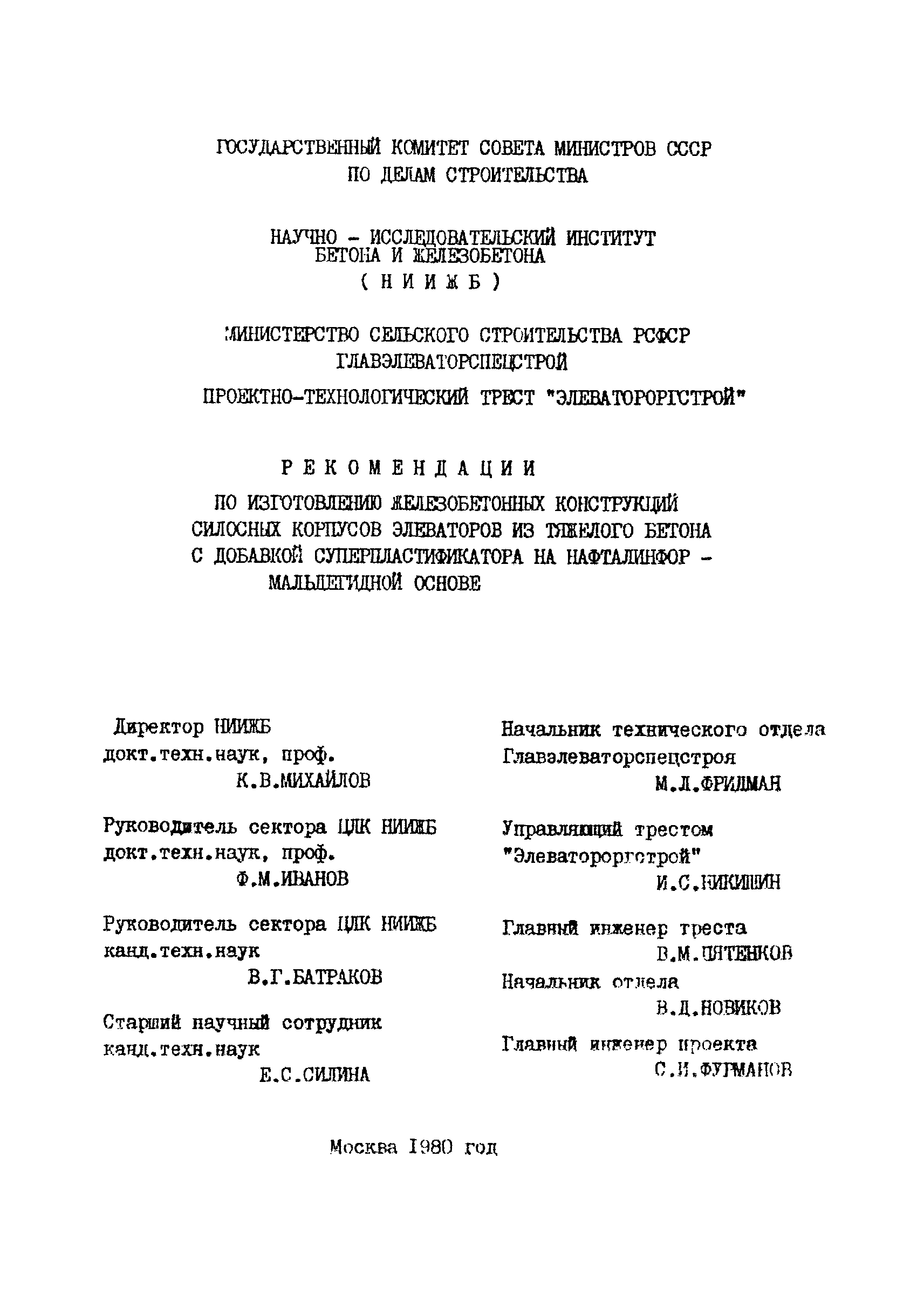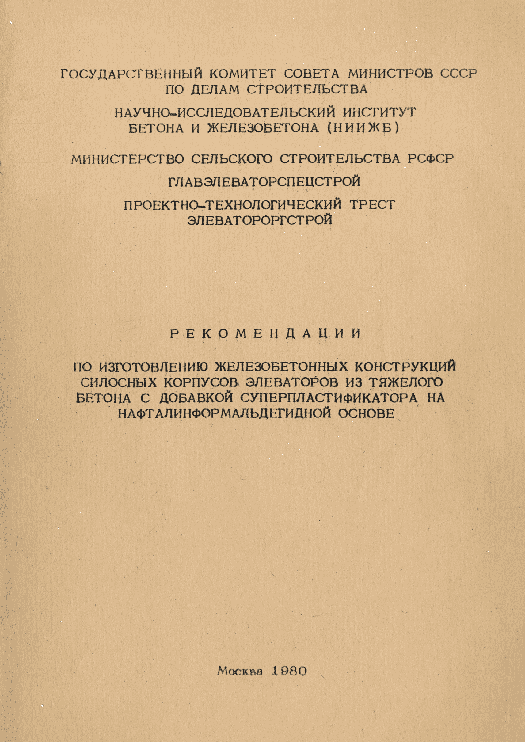| Название рус.: | Рекомендации по изготовлению железобетонных конструкций силосных корпусов элеваторов из тяжелого бетона с добавкой суперпластификатора на нафталинформальдегидной основе |