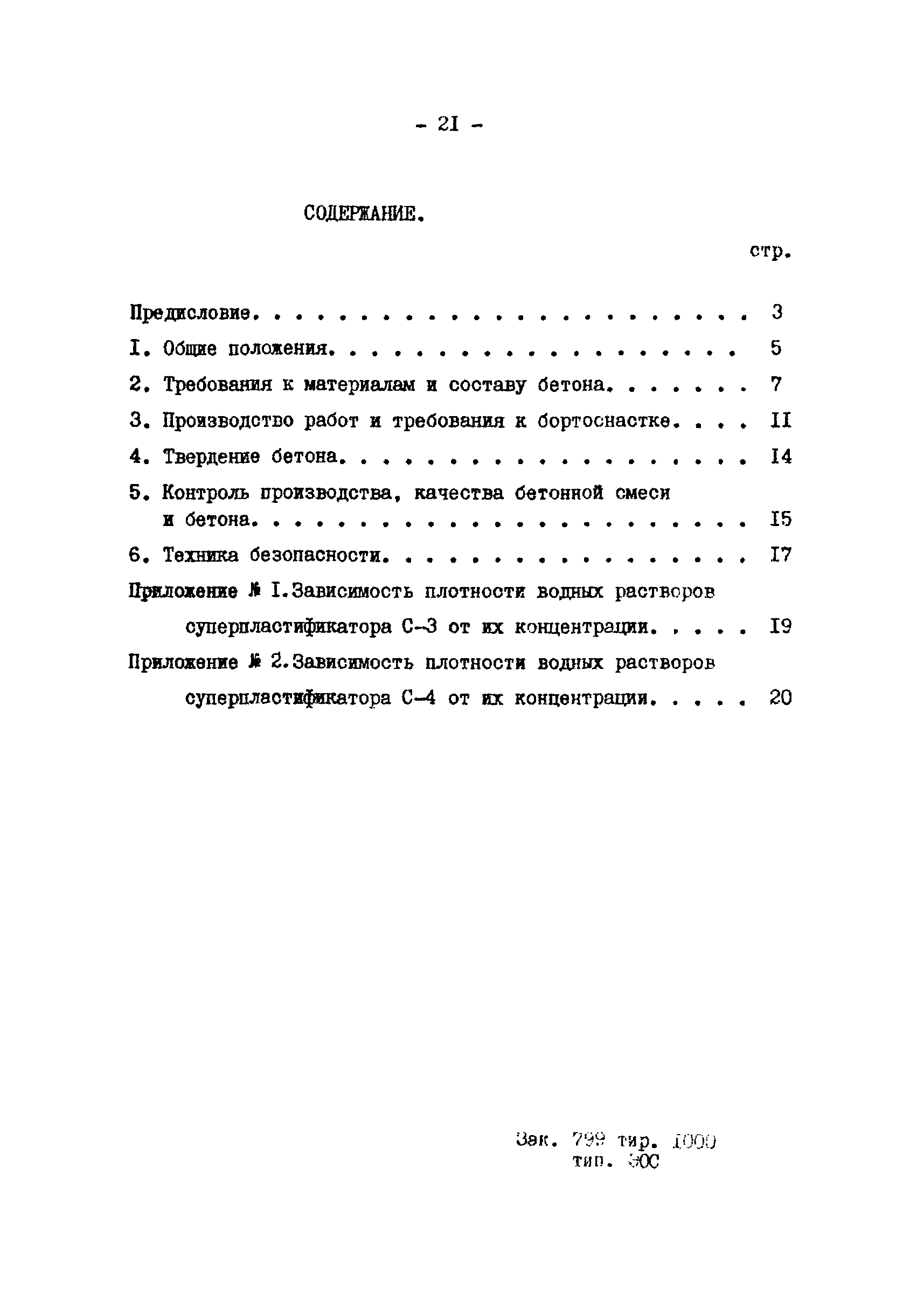 | Оглавление: | Предисловие 1 Общие положения 2 Требования к материалам и составу бетона 3 Производство работ и требования к бортоснастке 4 Твердение бетона 5 Контроль производства, качества бетонной смеси и бетона 6 Техника безопасности Приложение 1. Зависимость плотности водных растворов суперпластификатора С—3 от их концентрации Приложение 2. Зависимость плотности водных растворов суперпластификатора С-4 от их концентрации |