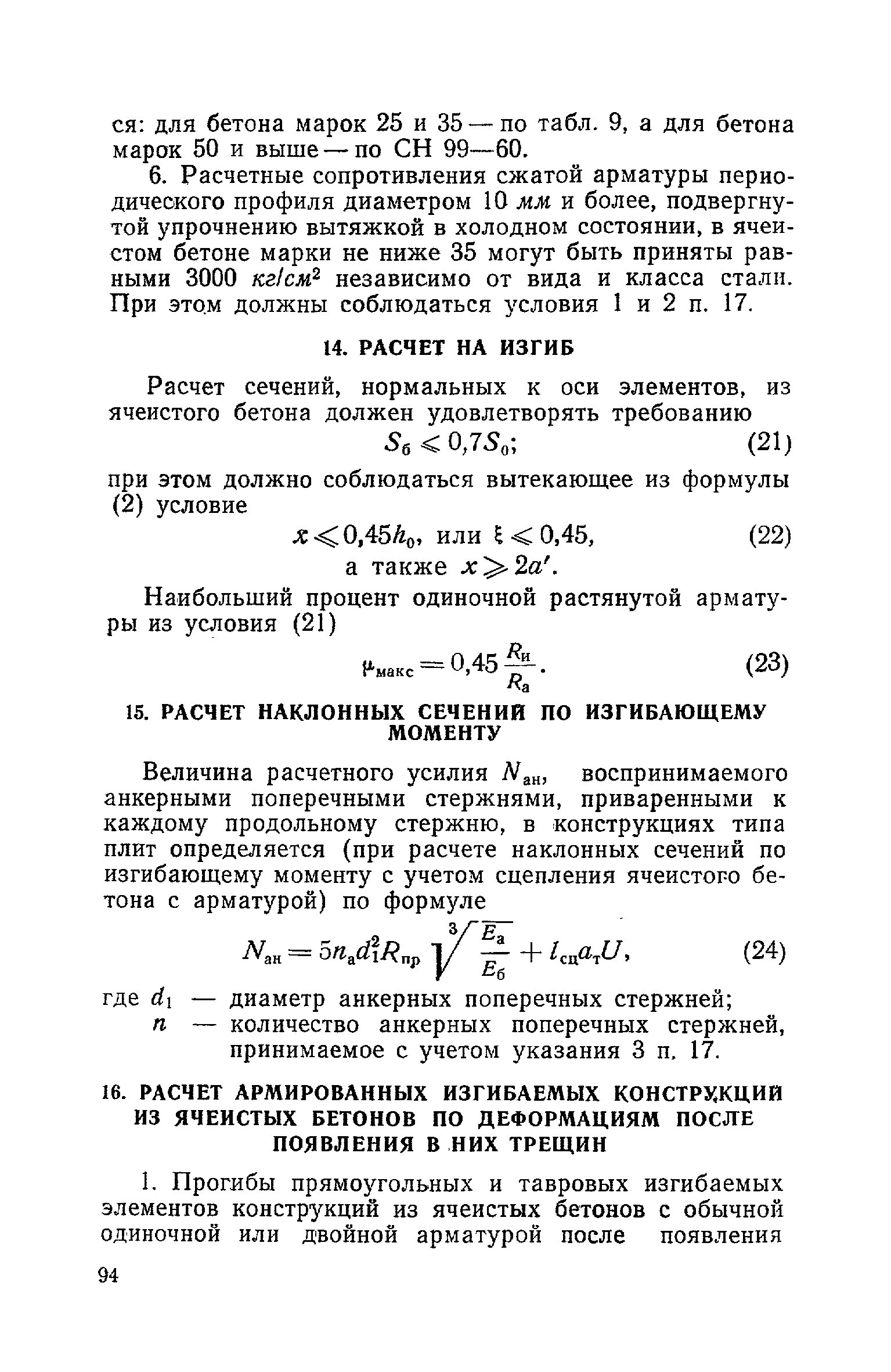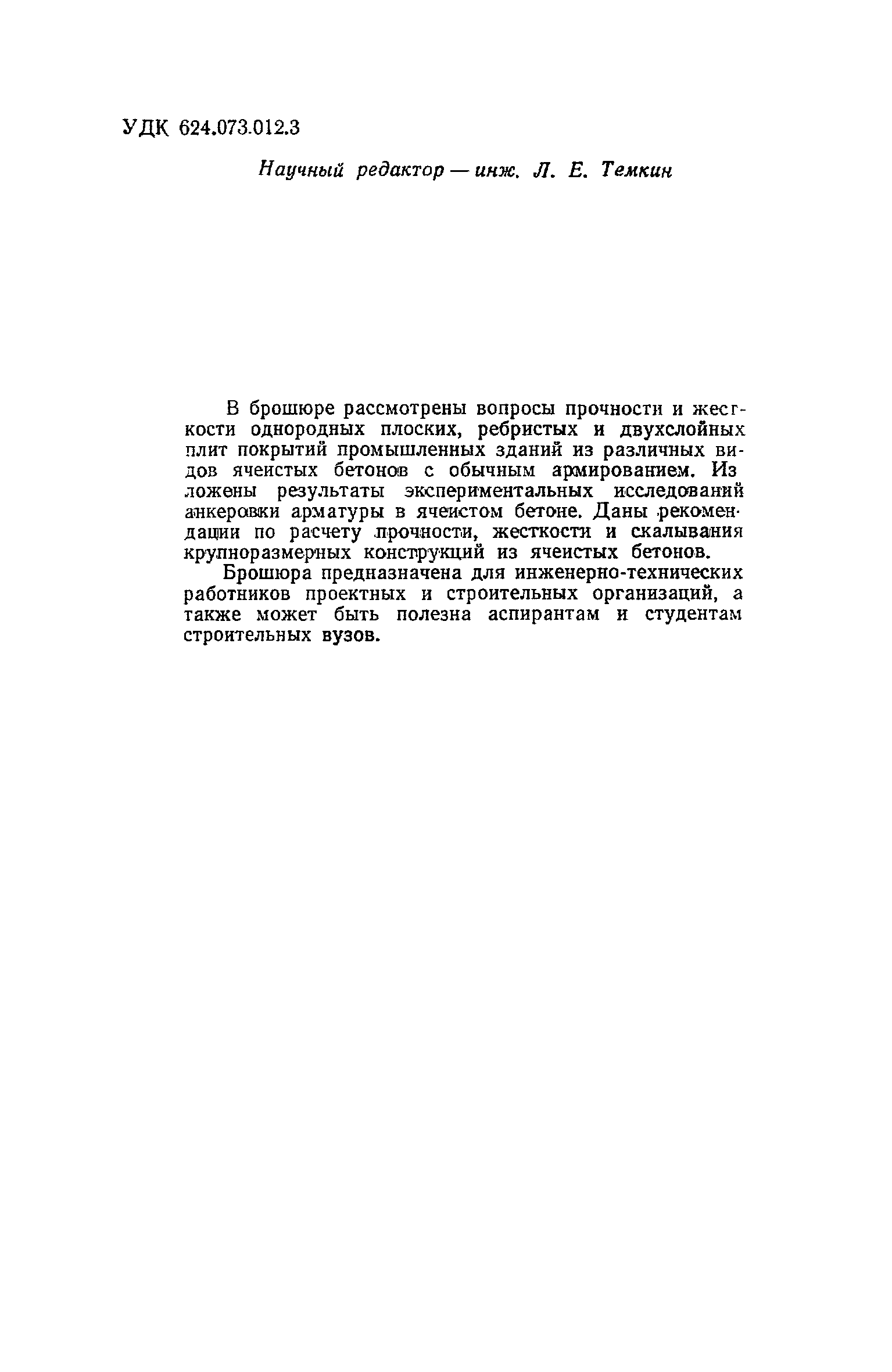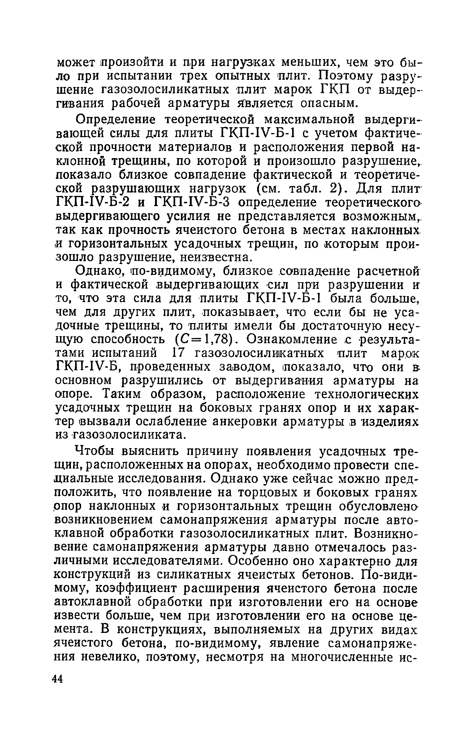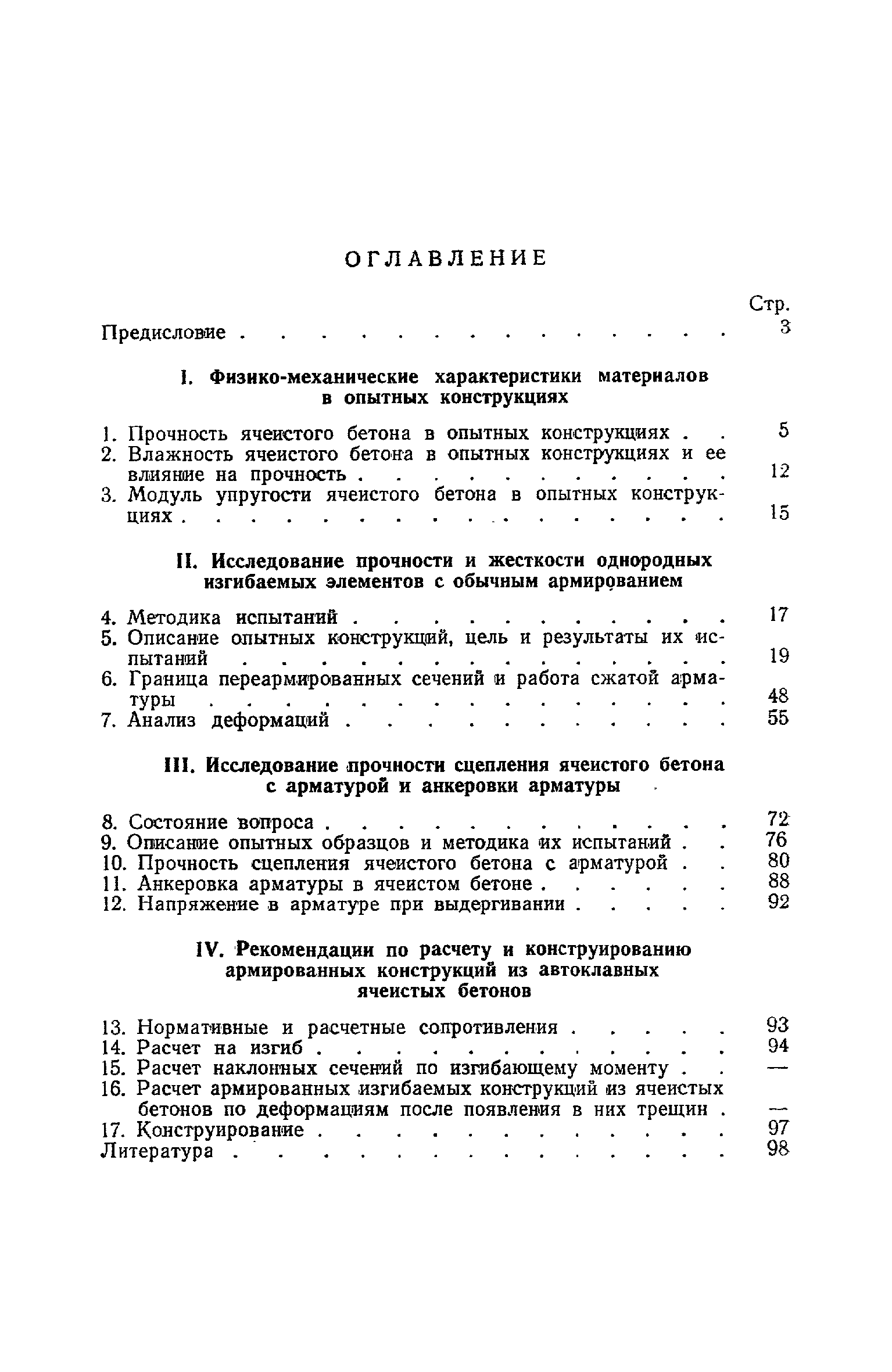 | Оглавление: | Предисловие I Физико-механические характеристики материалов в опытных конструкциях 1. Прочность ячеистого бетона в опытных конструкциях 2. Влажность ячеистого бетона в опытных конструкциях и ее влияние на прочность 3. Модуль упругости ячеистого бетона в опытных конструкциях II Исследование прочности и жесткости однородных изгибаемых элементов с обычным армированием 4. Методика испытаний 5. Описание опытных конструкций, цель и результаты их испытаний 6. Граница переармированных сечений и работа сжатой арматуры 7. Анализ деформаций III Исследование прочности сцепления ячеистого бетона с арматурой и анкеровки арматуры 8. Состояние вопроса 9. Описание опытных образцов и методика их испытаний 10. Прочность сцепления ячеистого бетона с арматурой 11. Анкеровка арматуры в ячеистом бетоне 12. Напряжение в арматуре при выдергивании IV Рекомендации по расчету и конструированию армированных конструкций из автоклавных ячеистых бетонов 13. Нормативные и расчетные сопротивления 14. Расчет на изгиб 15. Расчет наклонных сечений по изгибающему моменту 16. Расчет армированных изгибаемых конструкций из ячеистых бетонов по деформациям после появления в них трещин 17. Конструирование Литература |