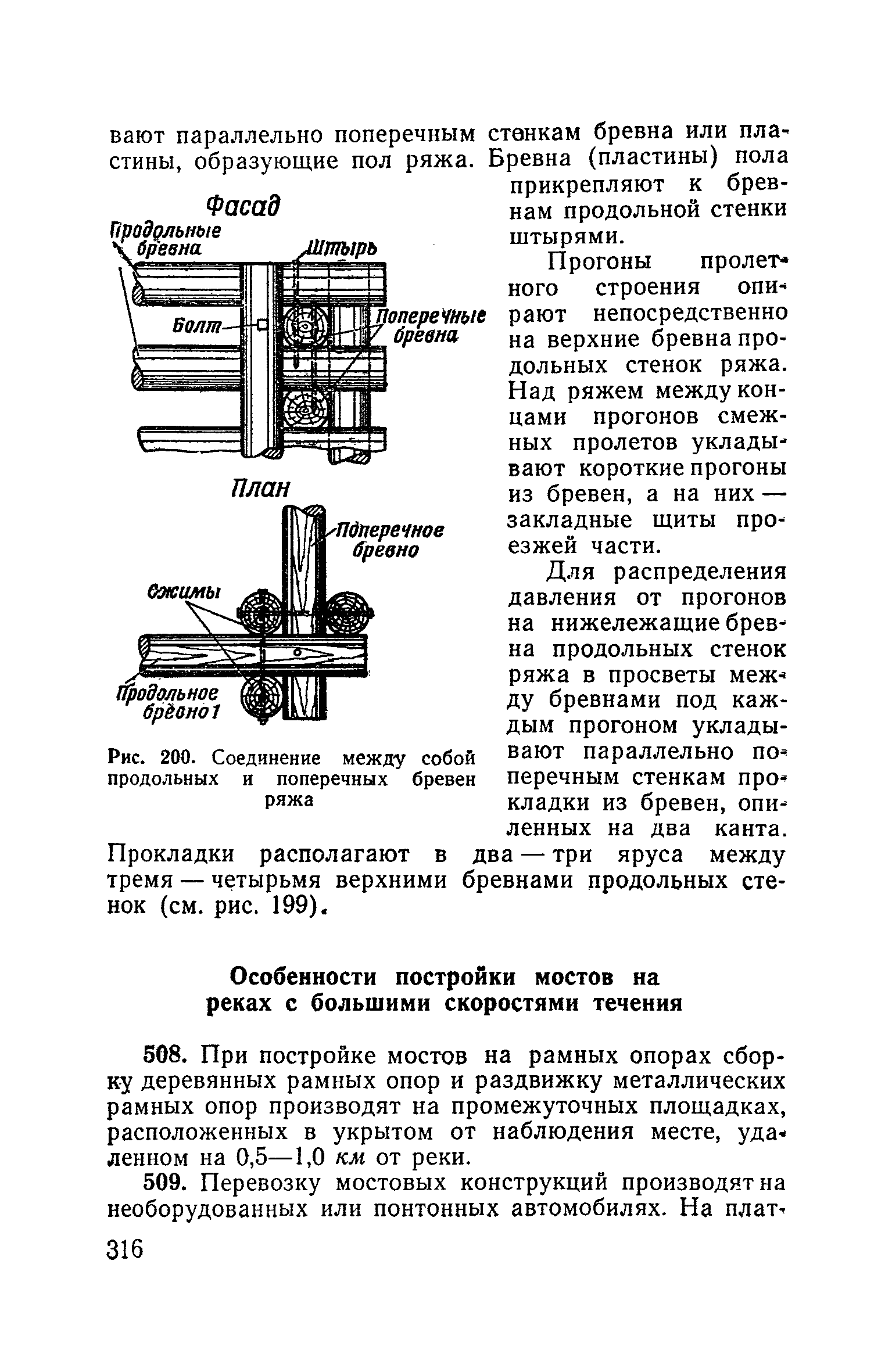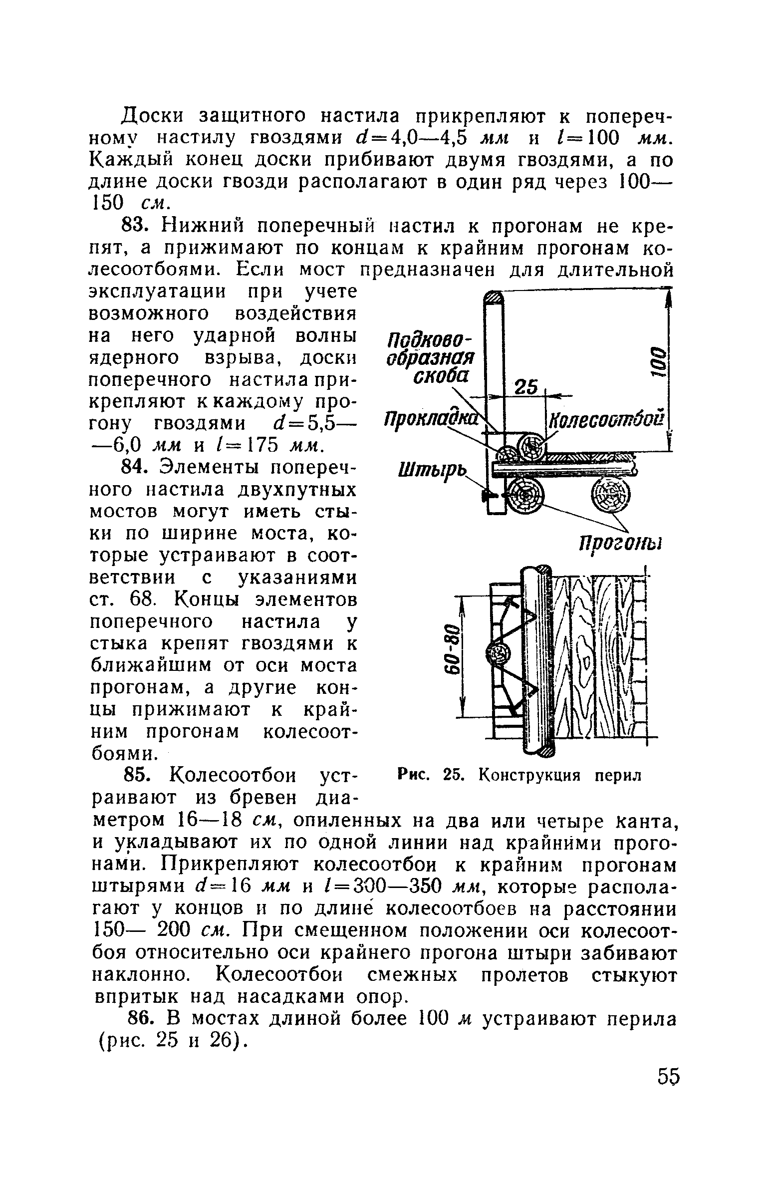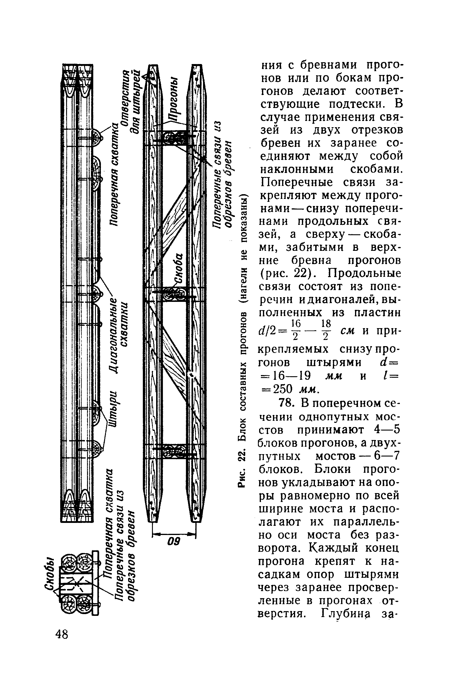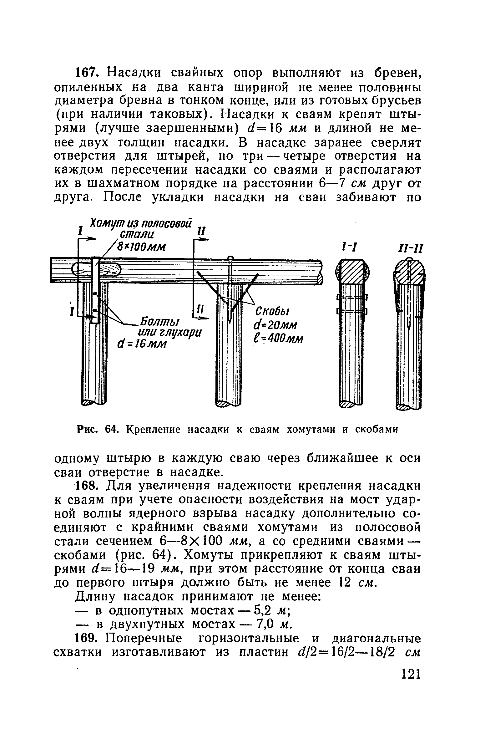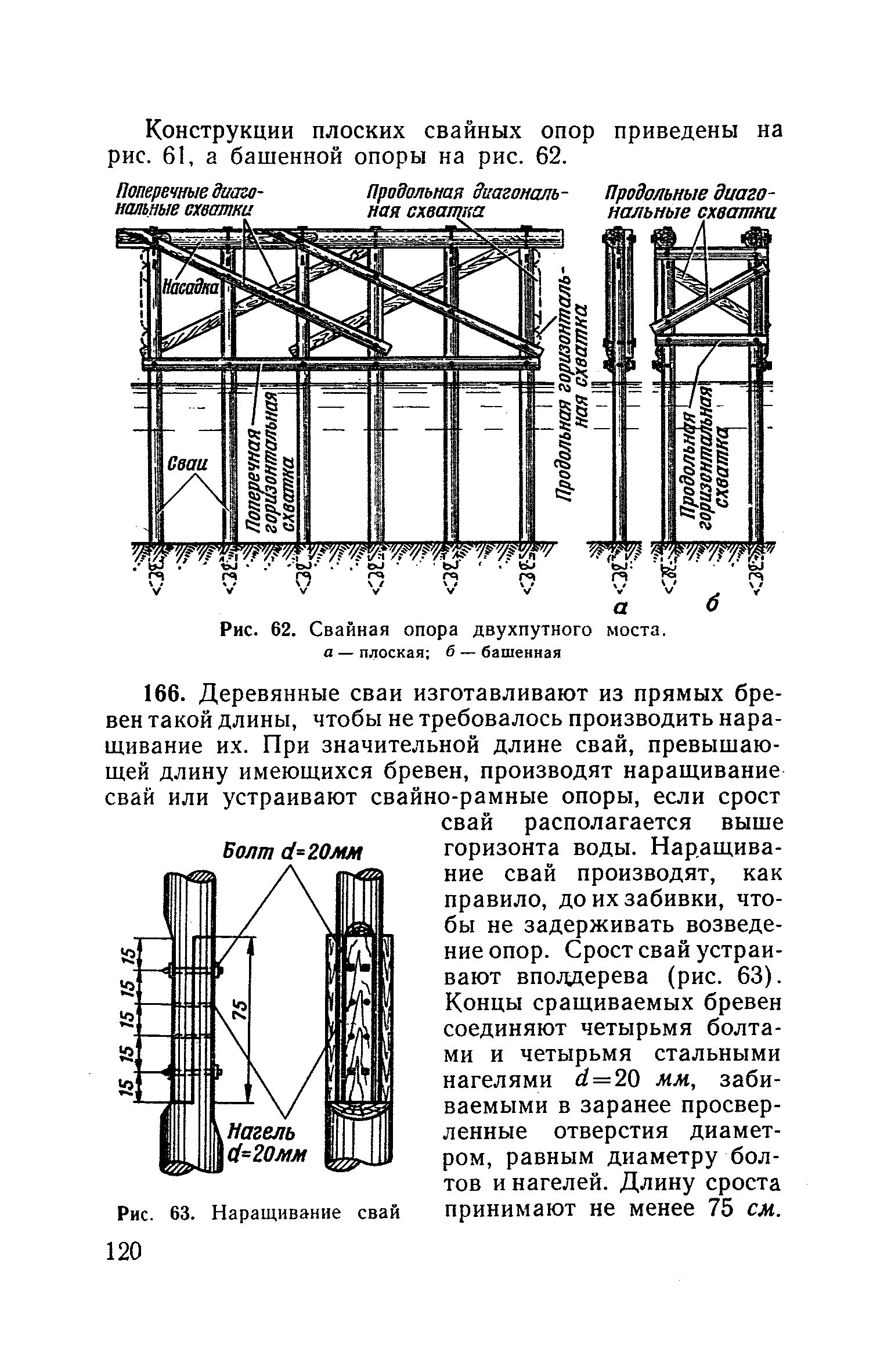 | Оглавление: | Глава 1. Общие положения Глава 2. Инженерная разведка района постройки моста Глава 3. Конструкции деревянных пролетных строений низководных мостов 1. Блочные пролетные строения Пролетные строения из колейных блоков Пролетные строения из блоков прогонов и щитов проезжей части а) Блоки простых прогонов б) Блоки сложных прогонов в) Блоки составных прогонов 2. Пролетные строения из отдельных элементов с простыми и сложными прогонами Проезжая часть Простые прогоны Сложные прогоны Глава 4. Конструкции металлических пролетных строений низководных мостов 1. Блочные пролетные строения Блоки из четырех прогонов Блоки из двух прогонов Проезжая часть 2. Пролетные строения из отдельных элементов Несущая конструкция с простыми прогонами и пакетами Несущая конструкция с составными прогонами Проезжая часть Глава 5. Промежуточные опоры низководных мостов 1. Свайные опоры 2. Рамные деревянные опоры 3. Клеточные опоры 4. Обеспечение продольной устойчивости моста Глава 6. Береговые опоры и сопряжение моста с берегами Глава 7. Изготовление и транспортировка мостовых конструкций 1. Общие положения 2. Изготовление конструкций низководных деревянных мостов Лесозаготовительные работы Лесопильные работы Работы по изготовлению деревянных мостовых конструкций Изготовление колейных блоков Сборка блоков прогонов Изготовление конструкций пролетного строения из блоков прогонов и щитов проезжей части Особенности сборки блоков сложных прогонов Изготовление составных прогонов на стальных цилиндрических нагелях и сборка блоков из двух прогонов Изготовление свай Изготовление насадок и лежней опор Изготовление элементов и сборка рамных опор Особенности изготовления элементов мостовых конструкций при постройке мостов из отдельных элементов 3. Изготовление конструкций металлических мостов Общие положения Изготовление металлических элементов Изготовление элементов проезжей части Изготовление блоков прогонов Изготовление пролетных строений из отдельных элементов 4. Транспортировка мостовых конструкций Глава 8. Постройка низководных мостов 1. Общие положения 2. Разбивка оси моста и осей опор 3. Средства механизации работ при постройке мостов 4. Глубина забивки свай в опорах 5. Организация в производство работ при постройке низководных мостов Общие положения Постройка мостов на свайных опорах при помощи комплекта мостостроительных средств КМС Постройка мостов на свайных опорах при помощи дизель-молотов ДМ-150 с одностреловыми копрами ОСК и дизель-молотов ДБ-45 с приспособлениями ПУС-1 для установки свай Постройка мостов на рамных опорах при помощи паромов с домкратами из комплекта КМС Устройство береговых опор и сопряжений моста с берегами Постройка мостов из отдельных элементов Особенности постройки двухпутных мостов на свайных опорах Особенности постройки мостов на свайных опорах с увеличенными пролетами Глава 9. Подводные мосты 1. Общие положения 2. Особенности конструкции промежуточных опор 3. Береговые опоры и сопряжение подводного моста с берегами 4. Особенности конструкции пролетных строений подводных мостов 5. Особенности постройки подводных мостов на свайных опорах 6. Особенности постройки подводных мостов на рамных опорах 7. Особенности постройки подводных мостов с металлическими прогонами Глава 10. Особенности к