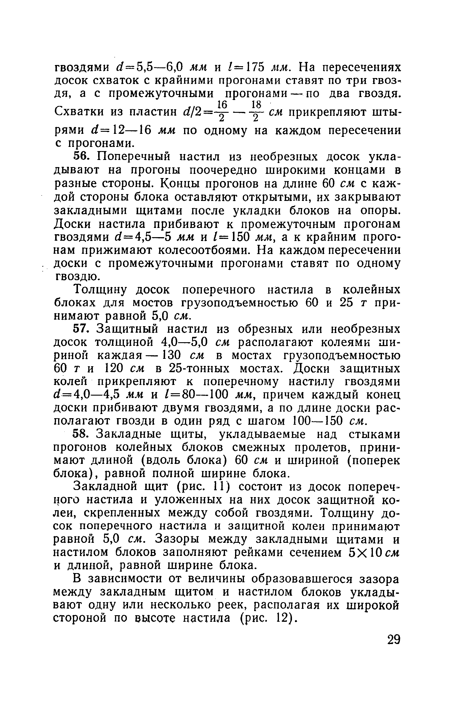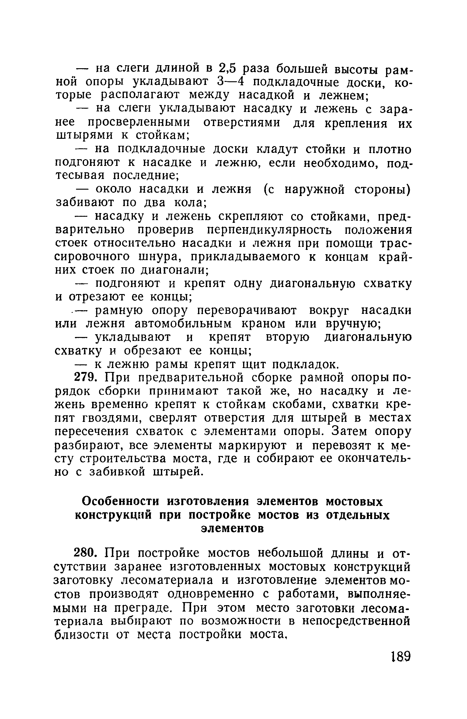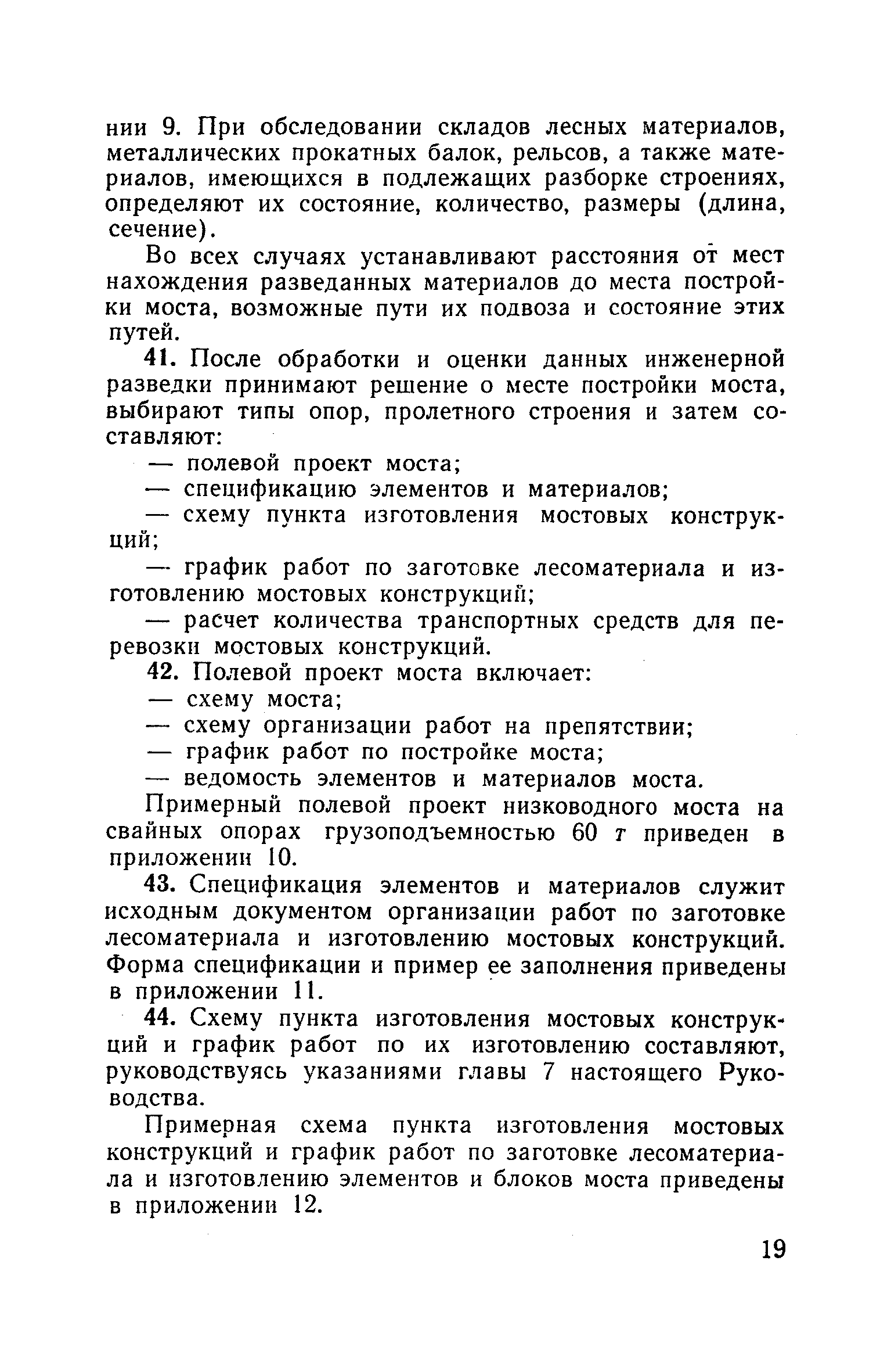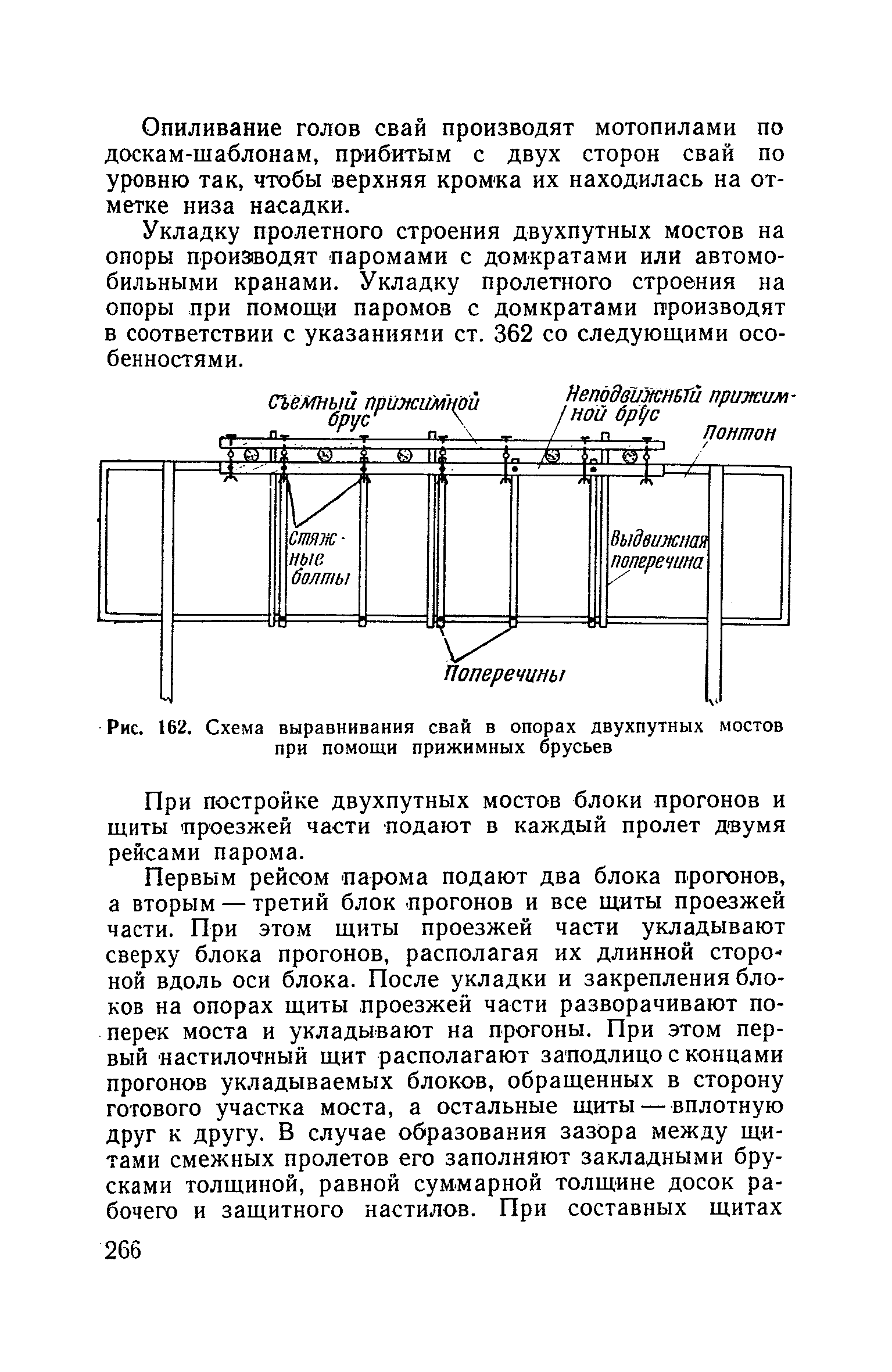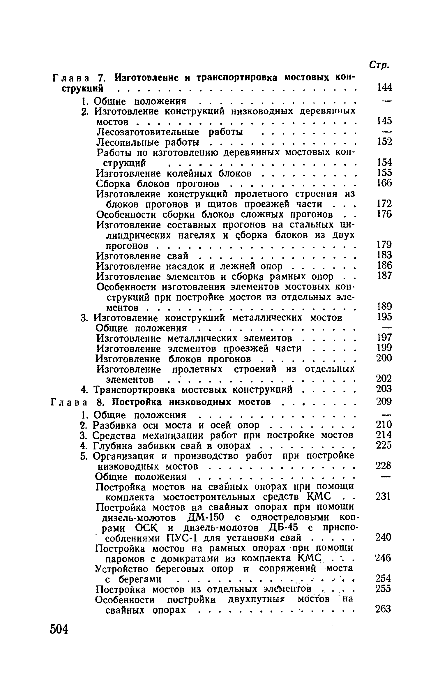 | Оглавление: | Глава 1. Общие положения Глава 2. Инженерная разведка района постройки моста Глава 3. Конструкции деревянных пролетных строений низководных мостов 1. Блочные пролетные строения Пролетные строения из колейных блоков Пролетные строения из блоков прогонов и щитов проезжей части а) Блоки простых прогонов б) Блоки сложных прогонов в) Блоки составных прогонов 2. Пролетные строения из отдельных элементов с простыми и сложными прогонами Проезжая часть Простые прогоны Сложные прогоны Глава 4. Конструкции металлических пролетных строений низководных мостов 1. Блочные пролетные строения Блоки из четырех прогонов Блоки из двух прогонов Проезжая часть 2. Пролетные строения из отдельных элементов Несущая конструкция с простыми прогонами и пакетами Несущая конструкция с составными прогонами Проезжая часть Глава 5. Промежуточные опоры низководных мостов 1. Свайные опоры 2. Рамные деревянные опоры 3. Клеточные опоры 4. Обеспечение продольной устойчивости моста Глава 6. Береговые опоры и сопряжение моста с берегами Глава 7. Изготовление и транспортировка мостовых конструкций 1. Общие положения 2. Изготовление конструкций низководных деревянных мостов Лесозаготовительные работы Лесопильные работы Работы по изготовлению деревянных мостовых конструкций Изготовление колейных блоков Сборка блоков прогонов Изготовление конструкций пролетного строения из блоков прогонов и щитов проезжей части Особенности сборки блоков сложных прогонов Изготовление составных прогонов на стальных цилиндрических нагелях и сборка блоков из двух прогонов Изготовление свай Изготовление насадок и лежней опор Изготовление элементов и сборка рамных опор Особенности изготовления элементов мостовых конструкций при постройке мостов из отдельных элементов 3. Изготовление конструкций металлических мостов Общие положения Изготовление металлических элементов Изготовление элементов проезжей части Изготовление блоков прогонов Изготовление пролетных строений из отдельных элементов 4. Транспортировка мостовых конструкций Глава 8. Постройка низководных мостов 1. Общие положения 2. Разбивка оси моста и осей опор 3. Средства механизации работ при постройке мостов 4. Глубина забивки свай в опорах 5. Организация в производство работ при постройке низководных мостов Общие положения Постройка мостов на свайных опорах при помощи комплекта мостостроительных средств КМС Постройка мостов на свайных опорах при помощи дизель-молотов ДМ-150 с одностреловыми копрами ОСК и дизель-молотов ДБ-45 с приспособлениями ПУС-1 для установки свай Постройка мостов на рамных опорах при помощи паромов с домкратами из комплекта КМС Устройство береговых опор и сопряжений моста с берегами Постройка мостов из отдельных элементов Особенности постройки двухпутных мостов на свайных опорах Особенности постройки мостов на свайных опорах с увеличенными пролетами Глава 9. Подводные мосты 1. Общие положения 2. Особенности конструкции промежуточных опор 3. Береговые опоры и сопряжение подводного моста с берегами 4. Особенности конструкции пролетных строений подводных мостов 5. Особенности постройки подводных мостов на свайных опорах 6. Особенности постройки подводных мостов на рамных опорах 7. Особенности постройки подводных мостов с металлическими прогонами Глава 10. Особенности к