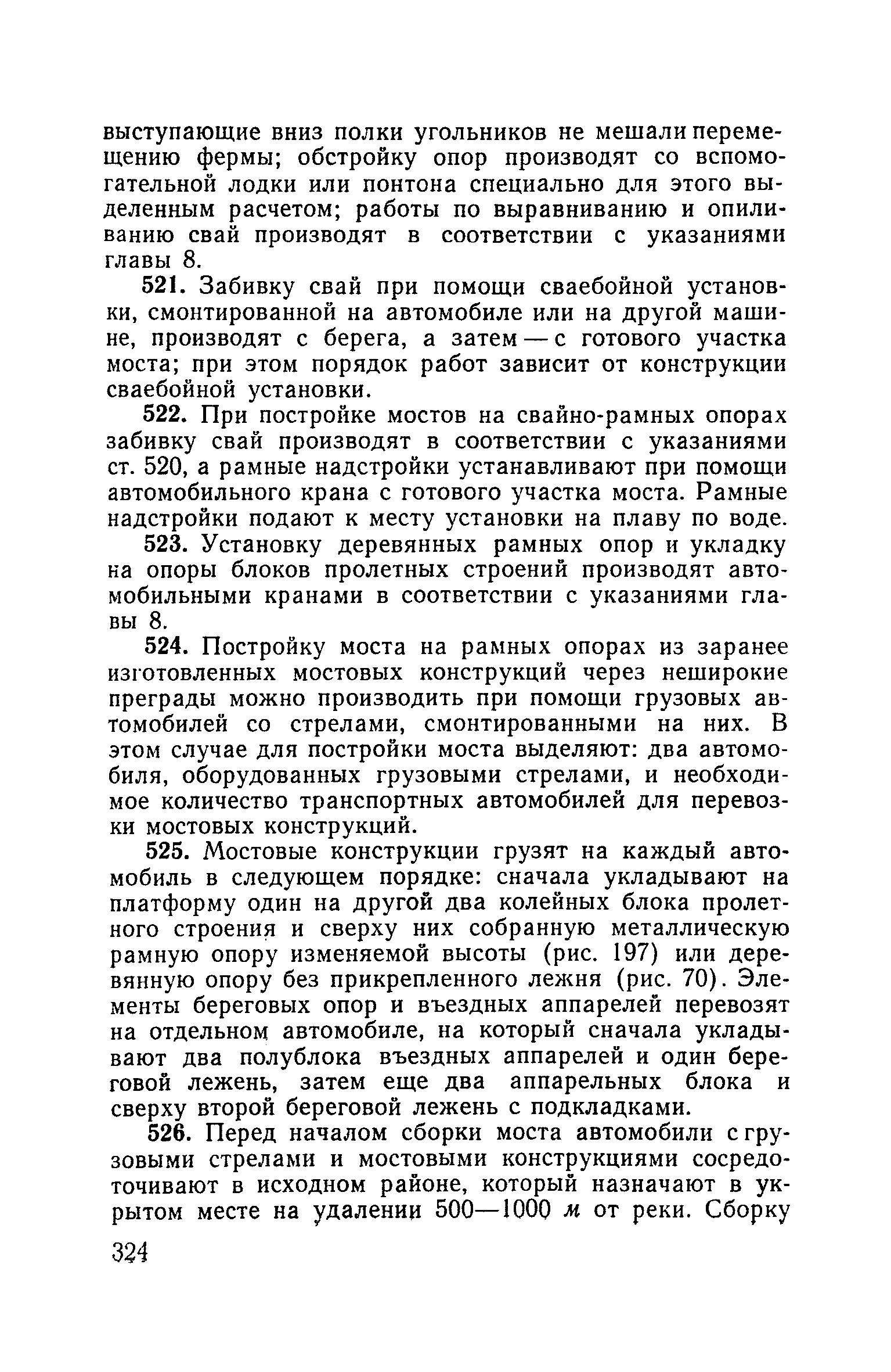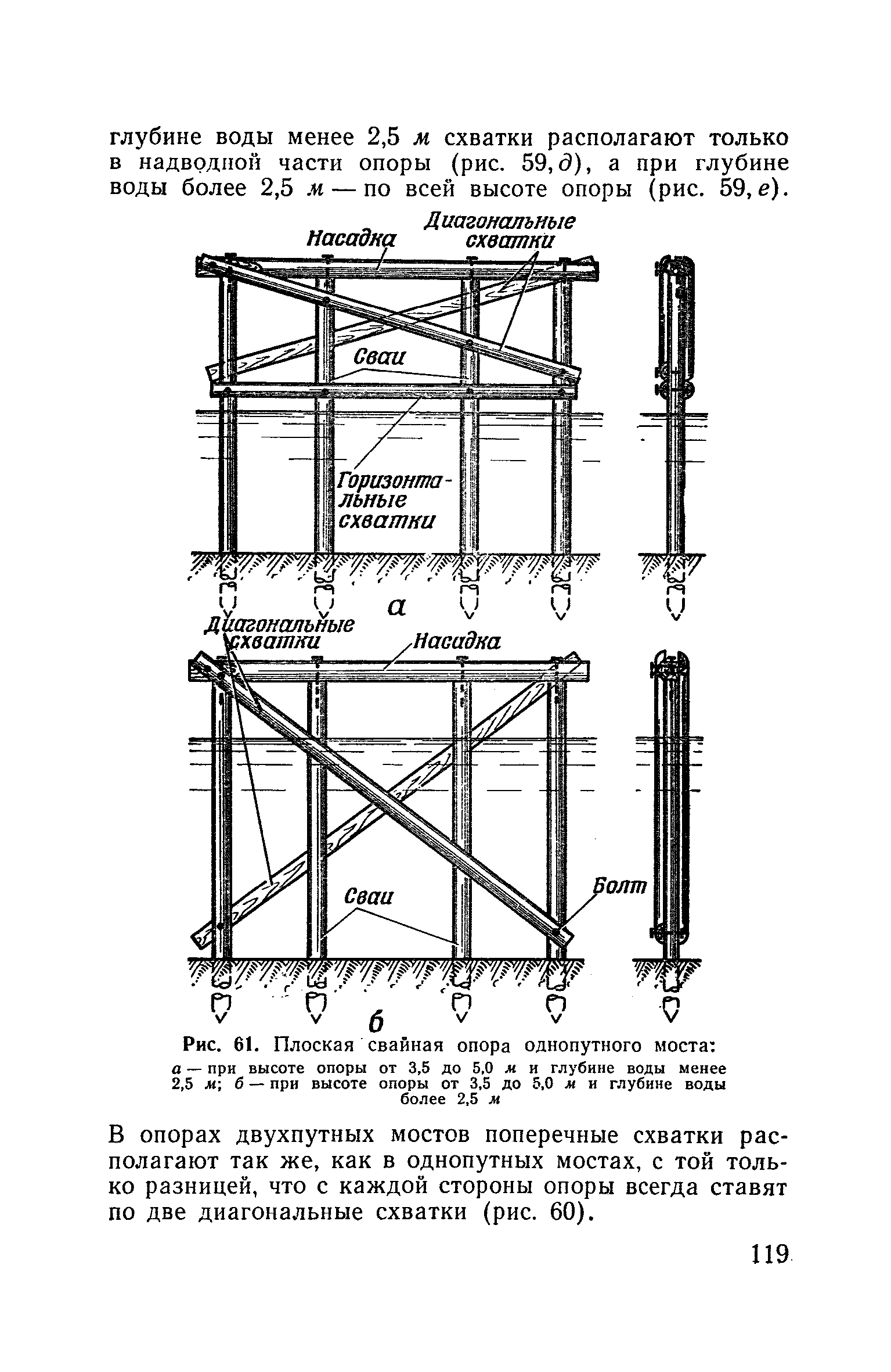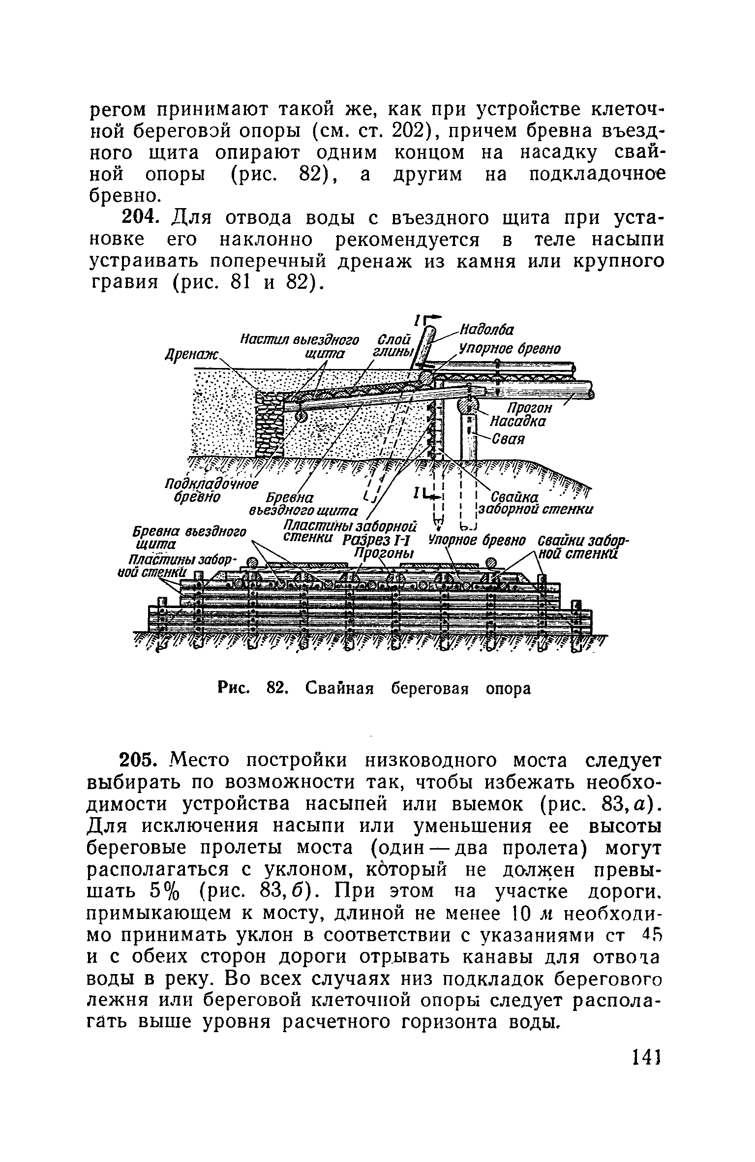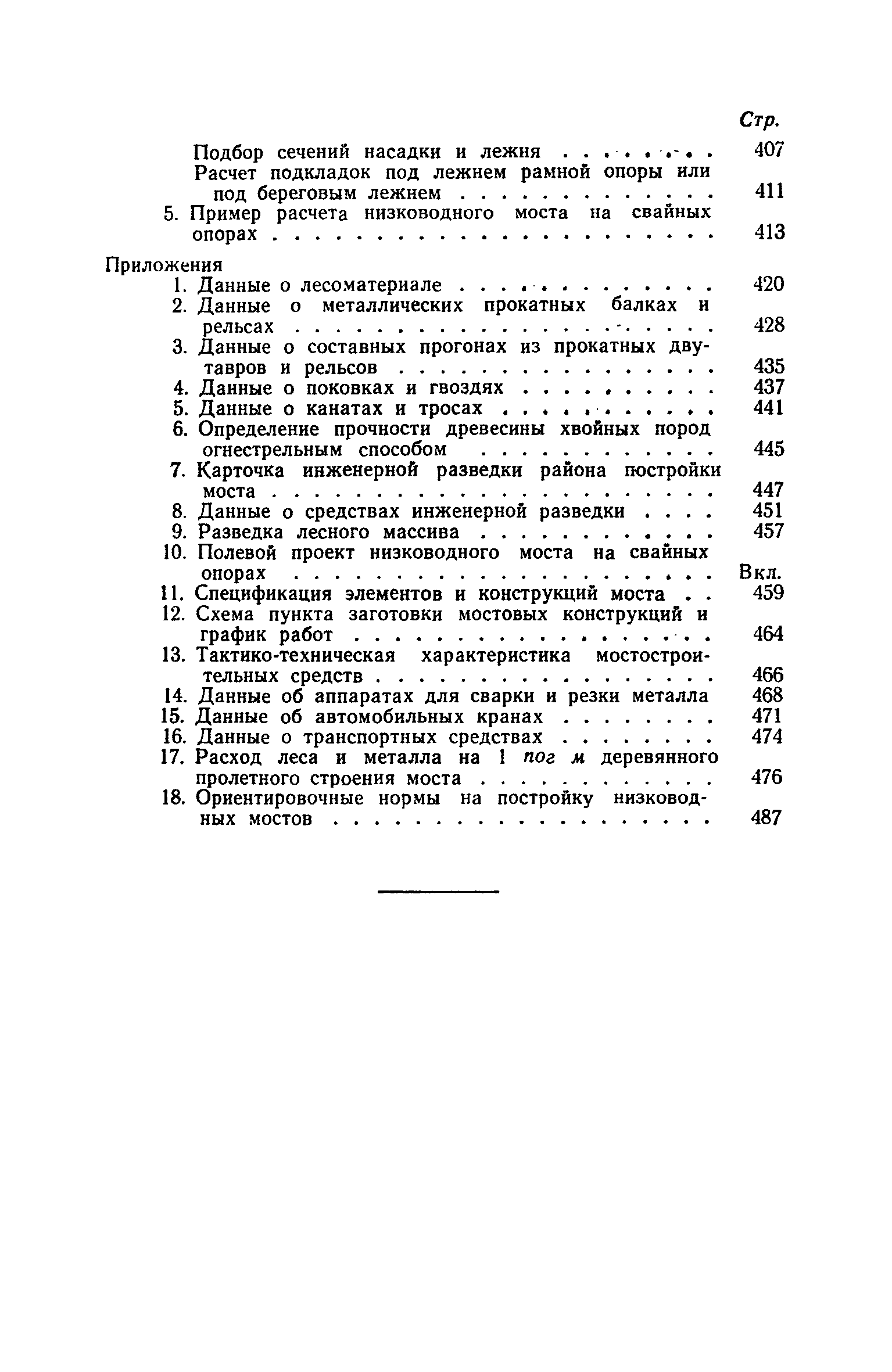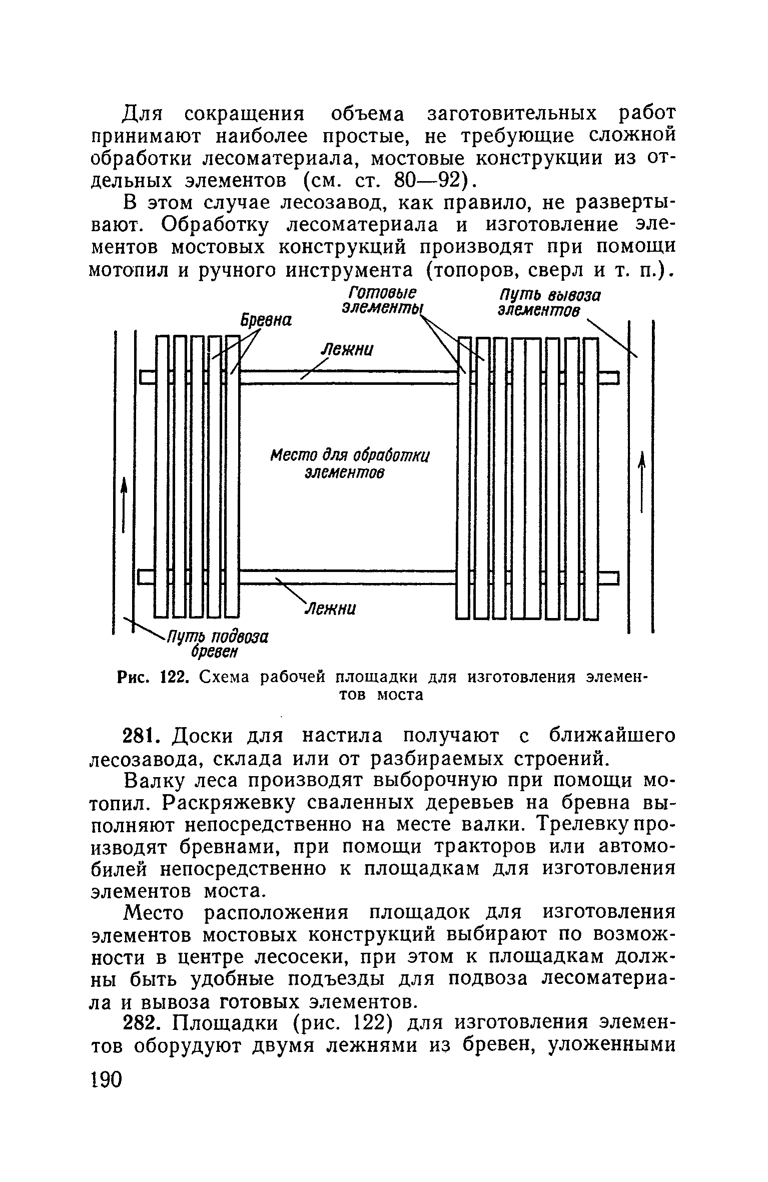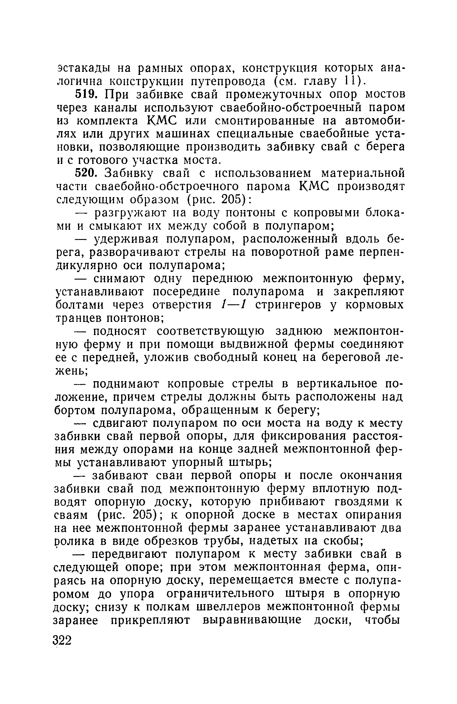 | Оглавление: | Глава 1. Общие положения Глава 2. Инженерная разведка района постройки моста Глава 3. Конструкции деревянных пролетных строений низководных мостов 1. Блочные пролетные строения Пролетные строения из колейных блоков Пролетные строения из блоков прогонов и щитов проезжей части а) Блоки простых прогонов б) Блоки сложных прогонов в) Блоки составных прогонов 2. Пролетные строения из отдельных элементов с простыми и сложными прогонами Проезжая часть Простые прогоны Сложные прогоны Глава 4. Конструкции металлических пролетных строений низководных мостов 1. Блочные пролетные строения Блоки из четырех прогонов Блоки из двух прогонов Проезжая часть 2. Пролетные строения из отдельных элементов Несущая конструкция с простыми прогонами и пакетами Несущая конструкция с составными прогонами Проезжая часть Глава 5. Промежуточные опоры низководных мостов 1. Свайные опоры 2. Рамные деревянные опоры 3. Клеточные опоры 4. Обеспечение продольной устойчивости моста Глава 6. Береговые опоры и сопряжение моста с берегами Глава 7. Изготовление и транспортировка мостовых конструкций 1. Общие положения 2. Изготовление конструкций низководных деревянных мостов Лесозаготовительные работы Лесопильные работы Работы по изготовлению деревянных мостовых конструкций Изготовление колейных блоков Сборка блоков прогонов Изготовление конструкций пролетного строения из блоков прогонов и щитов проезжей части Особенности сборки блоков сложных прогонов Изготовление составных прогонов на стальных цилиндрических нагелях и сборка блоков из двух прогонов Изготовление свай Изготовление насадок и лежней опор Изготовление элементов и сборка рамных опор Особенности изготовления элементов мостовых конструкций при постройке мостов из отдельных элементов 3. Изготовление конструкций металлических мостов Общие положения Изготовление металлических элементов Изготовление элементов проезжей части Изготовление блоков прогонов Изготовление пролетных строений из отдельных элементов 4. Транспортировка мостовых конструкций Глава 8. Постройка низководных мостов 1. Общие положения 2. Разбивка оси моста и осей опор 3. Средства механизации работ при постройке мостов 4. Глубина забивки свай в опорах 5. Организация в производство работ при постройке низководных мостов Общие положения Постройка мостов на свайных опорах при помощи комплекта мостостроительных средств КМС Постройка мостов на свайных опорах при помощи дизель-молотов ДМ-150 с одностреловыми копрами ОСК и дизель-молотов ДБ-45 с приспособлениями ПУС-1 для установки свай Постройка мостов на рамных опорах при помощи паромов с домкратами из комплекта КМС Устройство береговых опор и сопряжений моста с берегами Постройка мостов из отдельных элементов Особенности постройки двухпутных мостов на свайных опорах Особенности постройки мостов на свайных опорах с увеличенными пролетами Глава 9. Подводные мосты 1. Общие положения 2. Особенности конструкции промежуточных опор 3. Береговые опоры и сопряжение подводного моста с берегами 4. Особенности конструкции пролетных строений подводных мостов 5. Особенности постройки подводных мостов на свайных опорах 6. Особенности постройки подводных мостов на рамных опорах 7. Особенности постройки подводных мостов с металлическими прогонами Глава 10. Особенности к