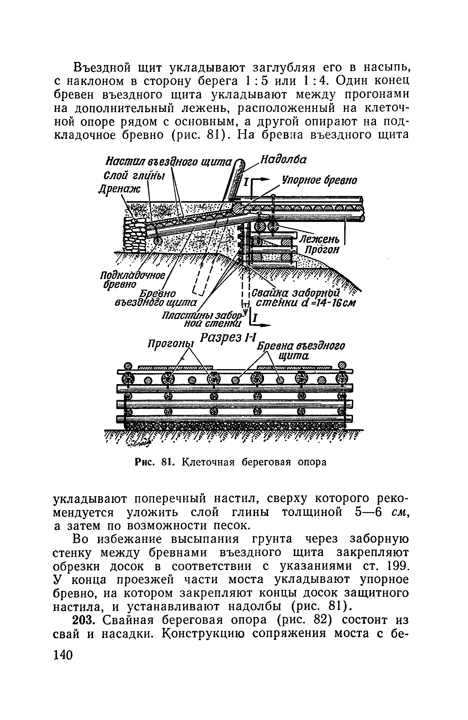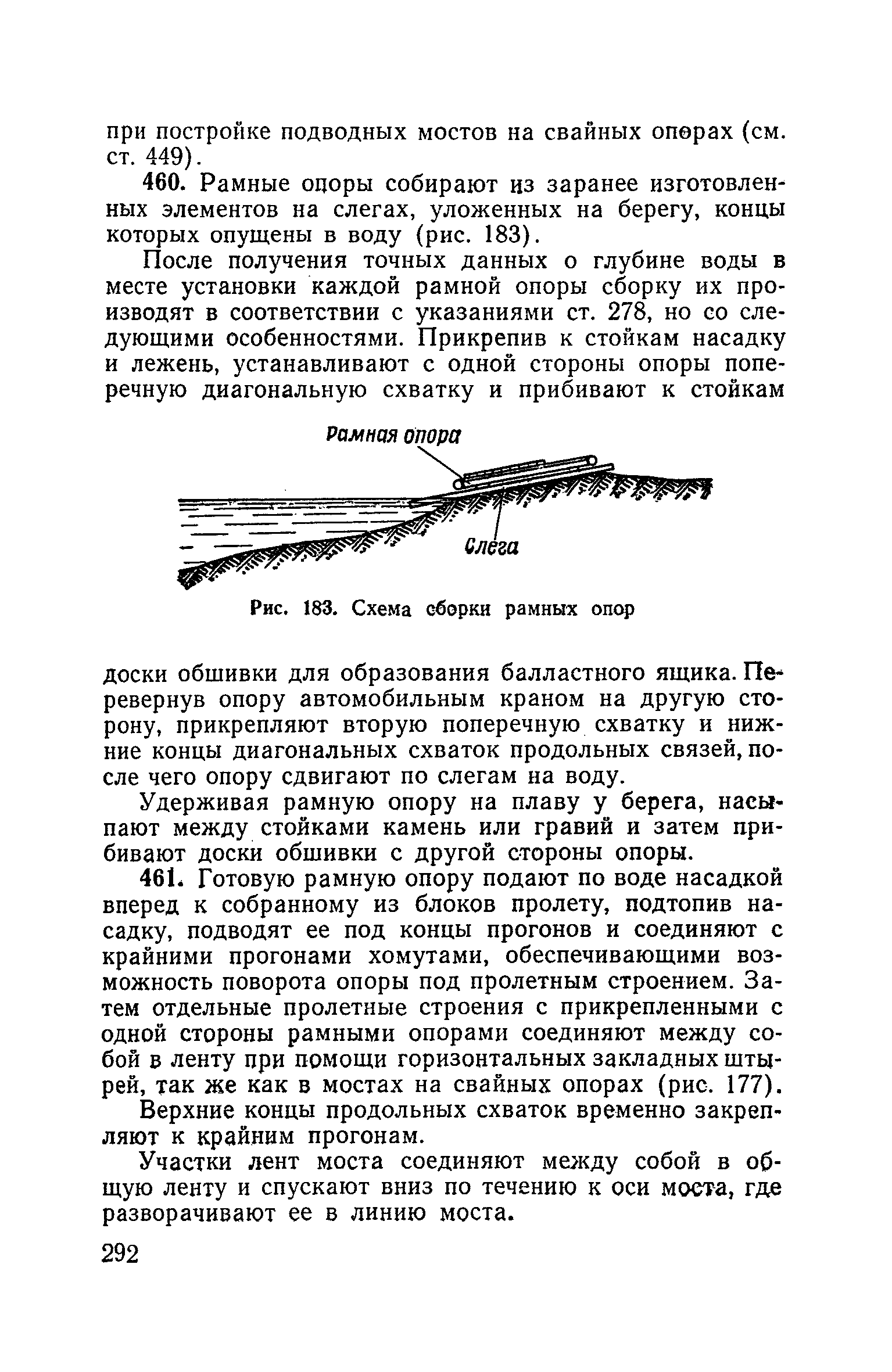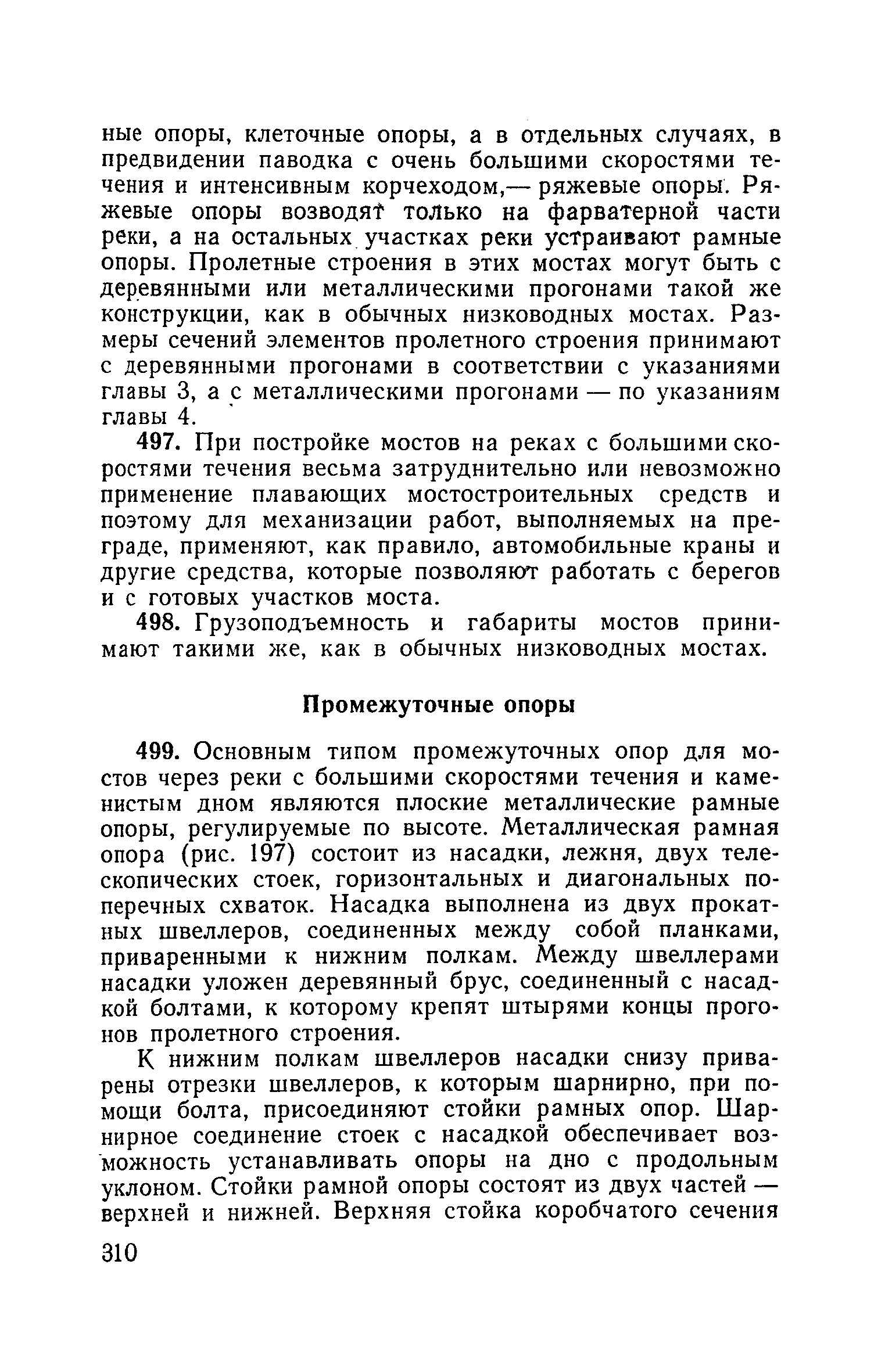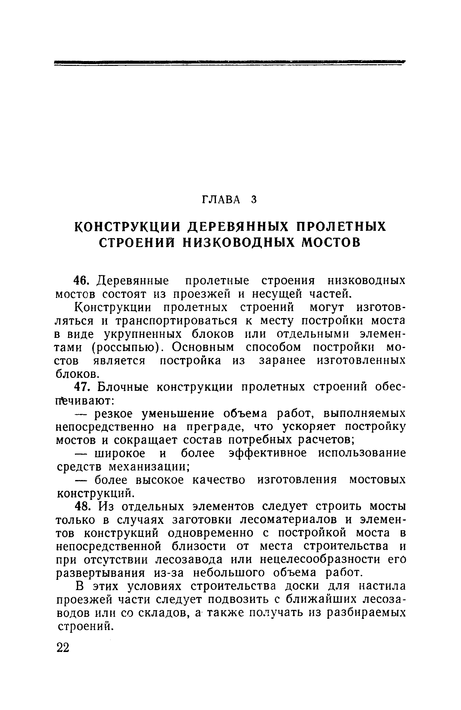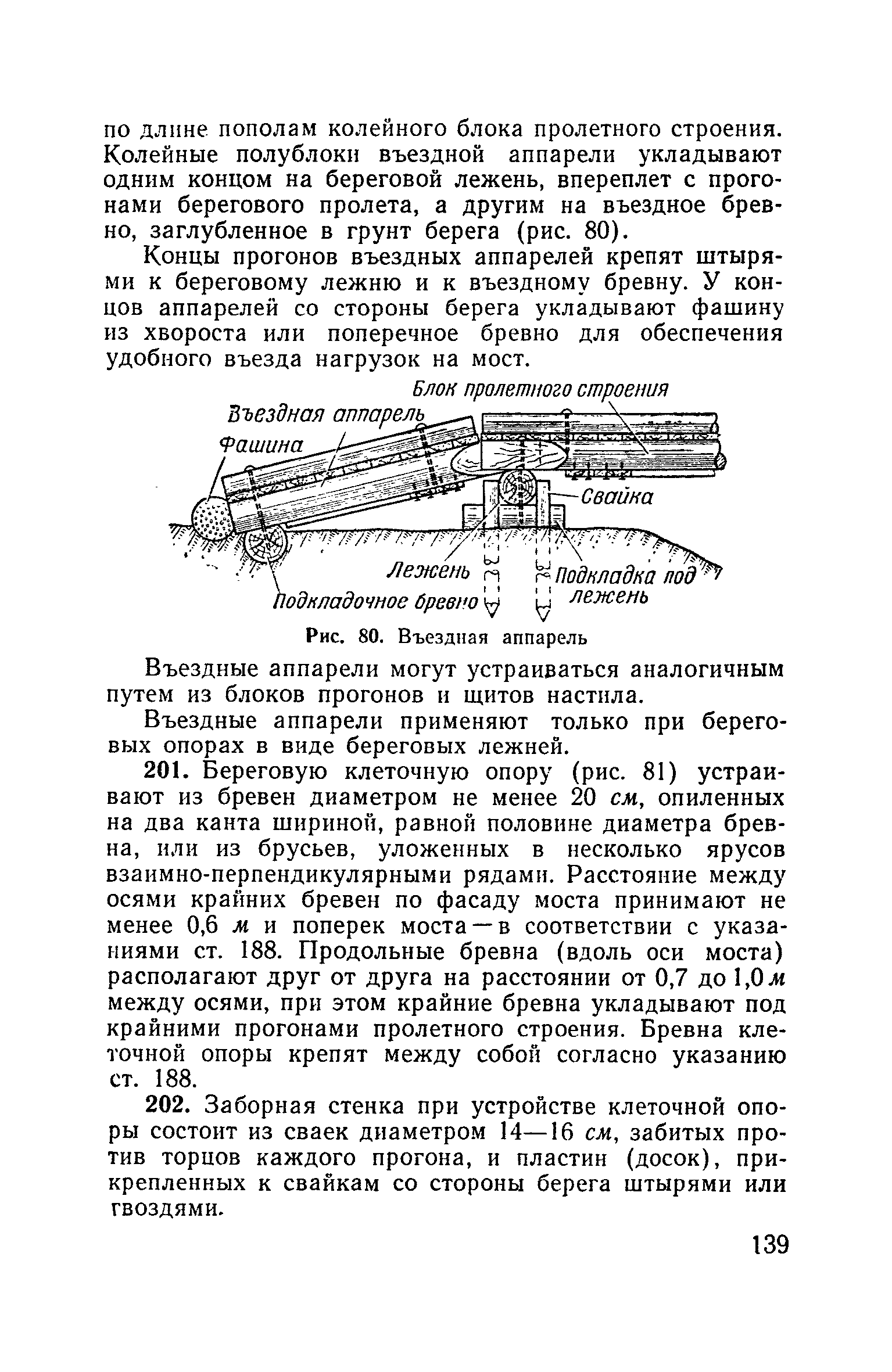 | Оглавление: | Глава 1. Общие положения Глава 2. Инженерная разведка района постройки моста Глава 3. Конструкции деревянных пролетных строений низководных мостов 1. Блочные пролетные строения Пролетные строения из колейных блоков Пролетные строения из блоков прогонов и щитов проезжей части а) Блоки простых прогонов б) Блоки сложных прогонов в) Блоки составных прогонов 2. Пролетные строения из отдельных элементов с простыми и сложными прогонами Проезжая часть Простые прогоны Сложные прогоны Глава 4. Конструкции металлических пролетных строений низководных мостов 1. Блочные пролетные строения Блоки из четырех прогонов Блоки из двух прогонов Проезжая часть 2. Пролетные строения из отдельных элементов Несущая конструкция с простыми прогонами и пакетами Несущая конструкция с составными прогонами Проезжая часть Глава 5. Промежуточные опоры низководных мостов 1. Свайные опоры 2. Рамные деревянные опоры 3. Клеточные опоры 4. Обеспечение продольной устойчивости моста Глава 6. Береговые опоры и сопряжение моста с берегами Глава 7. Изготовление и транспортировка мостовых конструкций 1. Общие положения 2. Изготовление конструкций низководных деревянных мостов Лесозаготовительные работы Лесопильные работы Работы по изготовлению деревянных мостовых конструкций Изготовление колейных блоков Сборка блоков прогонов Изготовление конструкций пролетного строения из блоков прогонов и щитов проезжей части Особенности сборки блоков сложных прогонов Изготовление составных прогонов на стальных цилиндрических нагелях и сборка блоков из двух прогонов Изготовление свай Изготовление насадок и лежней опор Изготовление элементов и сборка рамных опор Особенности изготовления элементов мостовых конструкций при постройке мостов из отдельных элементов 3. Изготовление конструкций металлических мостов Общие положения Изготовление металлических элементов Изготовление элементов проезжей части Изготовление блоков прогонов Изготовление пролетных строений из отдельных элементов 4. Транспортировка мостовых конструкций Глава 8. Постройка низководных мостов 1. Общие положения 2. Разбивка оси моста и осей опор 3. Средства механизации работ при постройке мостов 4. Глубина забивки свай в опорах 5. Организация в производство работ при постройке низководных мостов Общие положения Постройка мостов на свайных опорах при помощи комплекта мостостроительных средств КМС Постройка мостов на свайных опорах при помощи дизель-молотов ДМ-150 с одностреловыми копрами ОСК и дизель-молотов ДБ-45 с приспособлениями ПУС-1 для установки свай Постройка мостов на рамных опорах при помощи паромов с домкратами из комплекта КМС Устройство береговых опор и сопряжений моста с берегами Постройка мостов из отдельных элементов Особенности постройки двухпутных мостов на свайных опорах Особенности постройки мостов на свайных опорах с увеличенными пролетами Глава 9. Подводные мосты 1. Общие положения 2. Особенности конструкции промежуточных опор 3. Береговые опоры и сопряжение подводного моста с берегами 4. Особенности конструкции пролетных строений подводных мостов 5. Особенности постройки подводных мостов на свайных опорах 6. Особенности постройки подводных мостов на рамных опорах 7. Особенности постройки подводных мостов с металлическими прогонами Глава 10. Особенности к