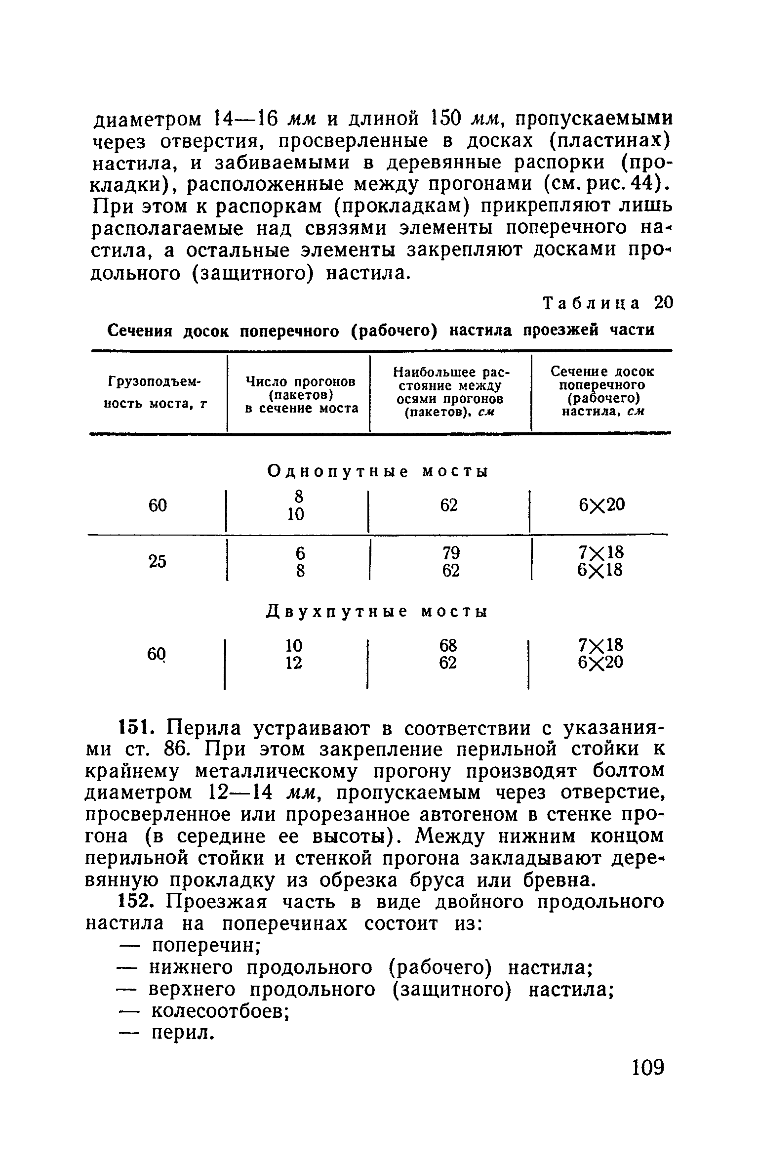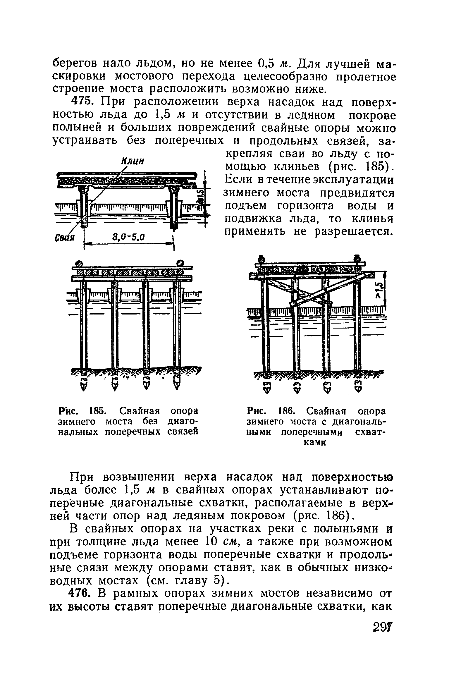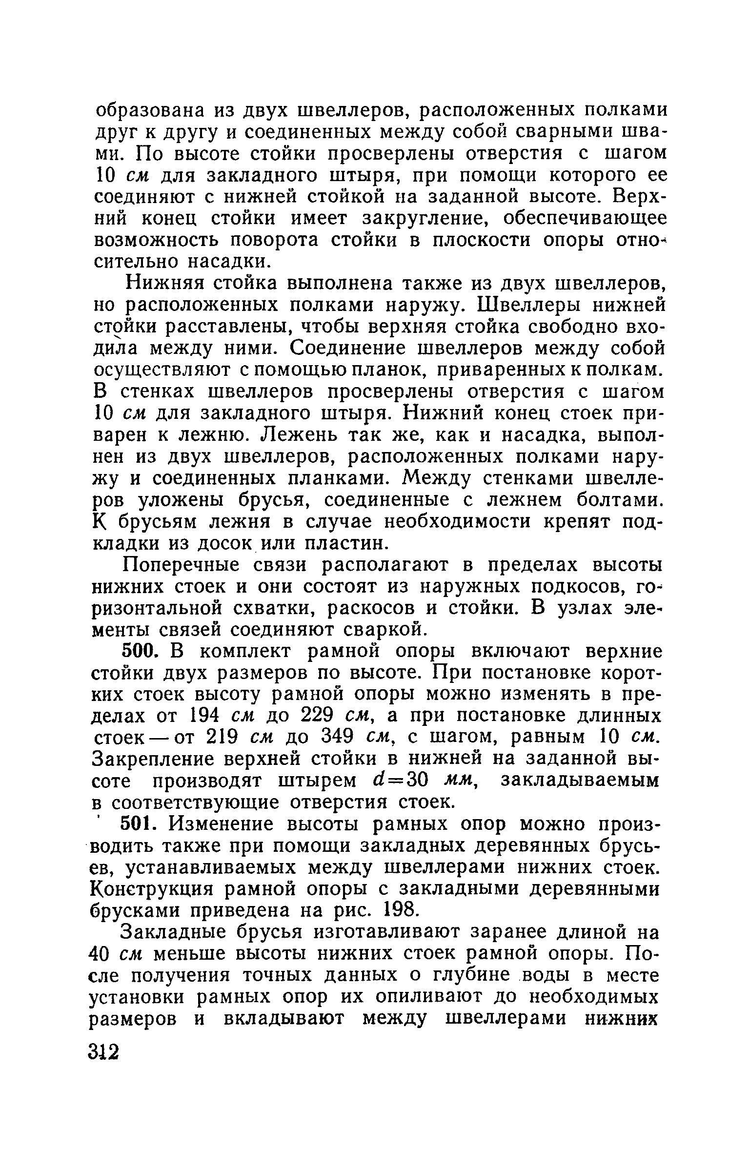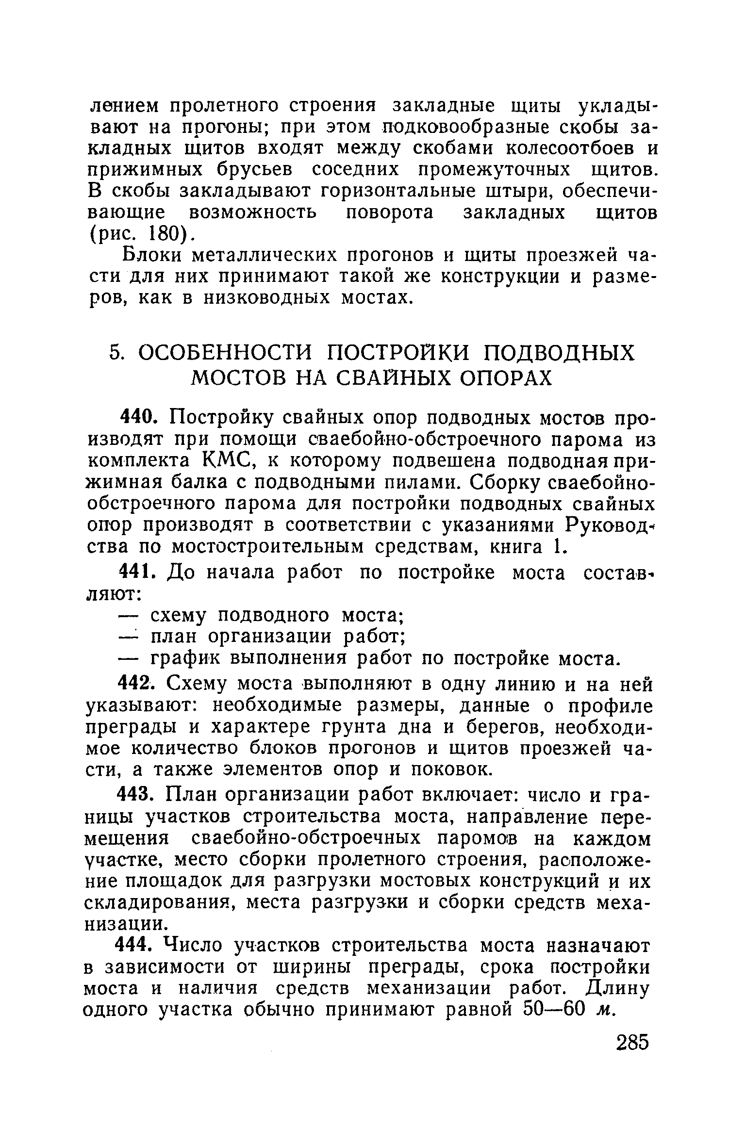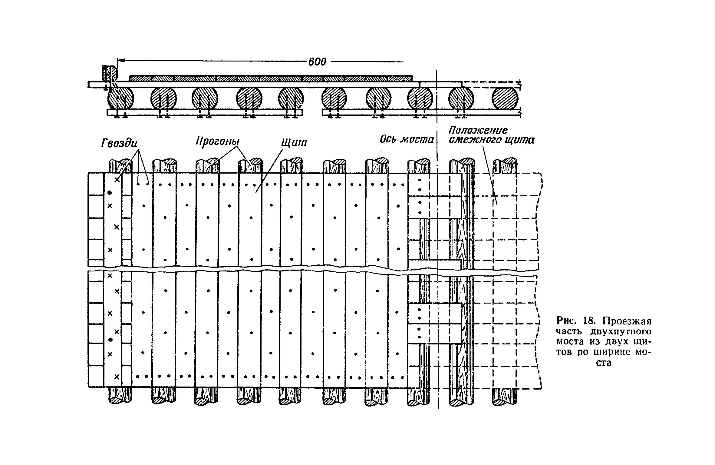 | Оглавление: | Глава 1. Общие положения Глава 2. Инженерная разведка района постройки моста Глава 3. Конструкции деревянных пролетных строений низководных мостов 1. Блочные пролетные строения Пролетные строения из колейных блоков Пролетные строения из блоков прогонов и щитов проезжей части а) Блоки простых прогонов б) Блоки сложных прогонов в) Блоки составных прогонов 2. Пролетные строения из отдельных элементов с простыми и сложными прогонами Проезжая часть Простые прогоны Сложные прогоны Глава 4. Конструкции металлических пролетных строений низководных мостов 1. Блочные пролетные строения Блоки из четырех прогонов Блоки из двух прогонов Проезжая часть 2. Пролетные строения из отдельных элементов Несущая конструкция с простыми прогонами и пакетами Несущая конструкция с составными прогонами Проезжая часть Глава 5. Промежуточные опоры низководных мостов 1. Свайные опоры 2. Рамные деревянные опоры 3. Клеточные опоры 4. Обеспечение продольной устойчивости моста Глава 6. Береговые опоры и сопряжение моста с берегами Глава 7. Изготовление и транспортировка мостовых конструкций 1. Общие положения 2. Изготовление конструкций низководных деревянных мостов Лесозаготовительные работы Лесопильные работы Работы по изготовлению деревянных мостовых конструкций Изготовление колейных блоков Сборка блоков прогонов Изготовление конструкций пролетного строения из блоков прогонов и щитов проезжей части Особенности сборки блоков сложных прогонов Изготовление составных прогонов на стальных цилиндрических нагелях и сборка блоков из двух прогонов Изготовление свай Изготовление насадок и лежней опор Изготовление элементов и сборка рамных опор Особенности изготовления элементов мостовых конструкций при постройке мостов из отдельных элементов 3. Изготовление конструкций металлических мостов Общие положения Изготовление металлических элементов Изготовление элементов проезжей части Изготовление блоков прогонов Изготовление пролетных строений из отдельных элементов 4. Транспортировка мостовых конструкций Глава 8. Постройка низководных мостов 1. Общие положения 2. Разбивка оси моста и осей опор 3. Средства механизации работ при постройке мостов 4. Глубина забивки свай в опорах 5. Организация в производство работ при постройке низководных мостов Общие положения Постройка мостов на свайных опорах при помощи комплекта мостостроительных средств КМС Постройка мостов на свайных опорах при помощи дизель-молотов ДМ-150 с одностреловыми копрами ОСК и дизель-молотов ДБ-45 с приспособлениями ПУС-1 для установки свай Постройка мостов на рамных опорах при помощи паромов с домкратами из комплекта КМС Устройство береговых опор и сопряжений моста с берегами Постройка мостов из отдельных элементов Особенности постройки двухпутных мостов на свайных опорах Особенности постройки мостов на свайных опорах с увеличенными пролетами Глава 9. Подводные мосты 1. Общие положения 2. Особенности конструкции промежуточных опор 3. Береговые опоры и сопряжение подводного моста с берегами 4. Особенности конструкции пролетных строений подводных мостов 5. Особенности постройки подводных мостов на свайных опорах 6. Особенности постройки подводных мостов на рамных опорах 7. Особенности постройки подводных мостов с металлическими прогонами Глава 10. Особенности к