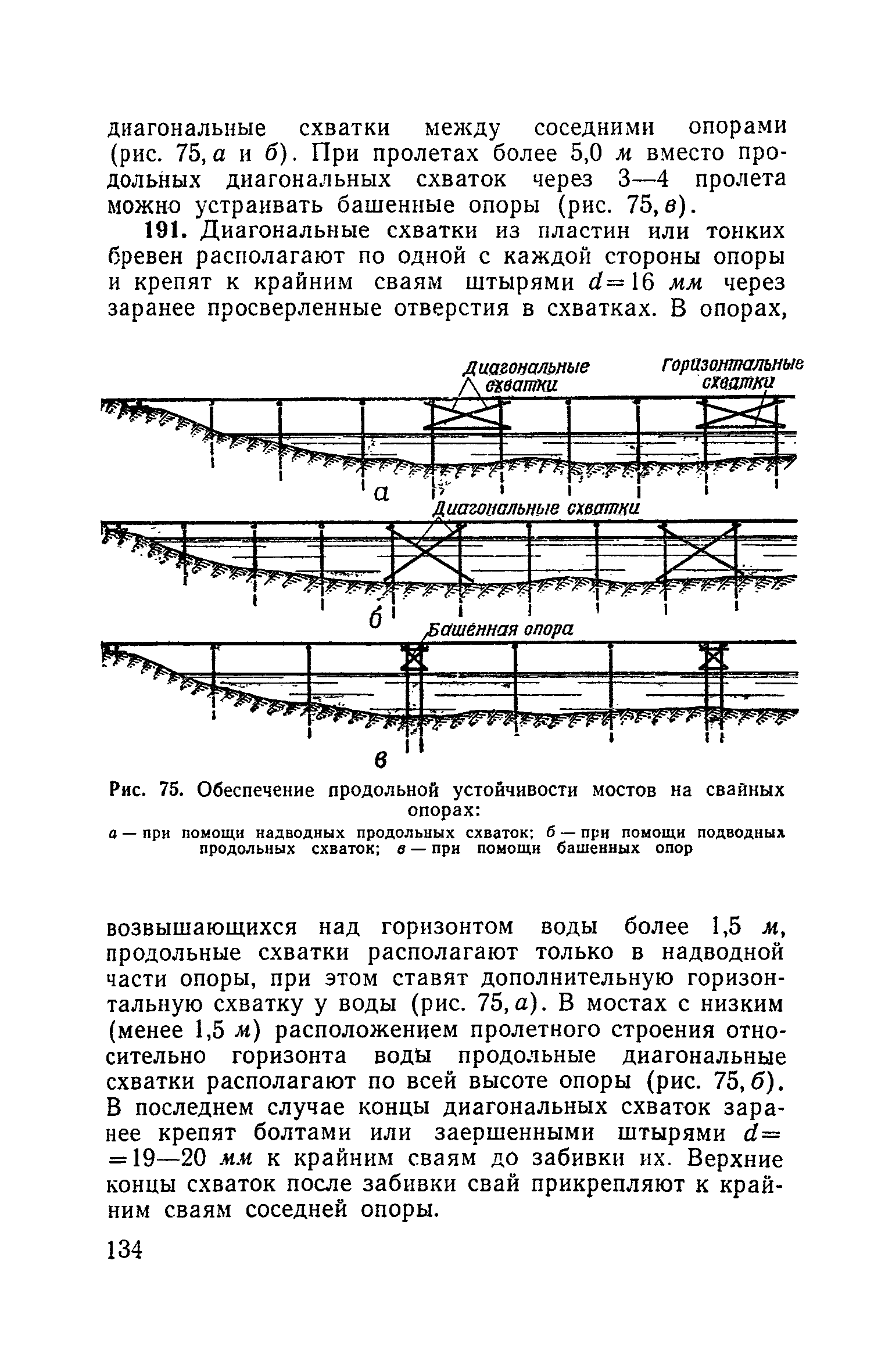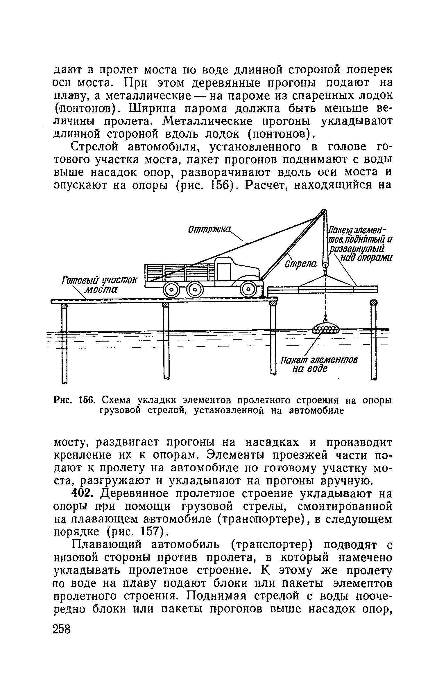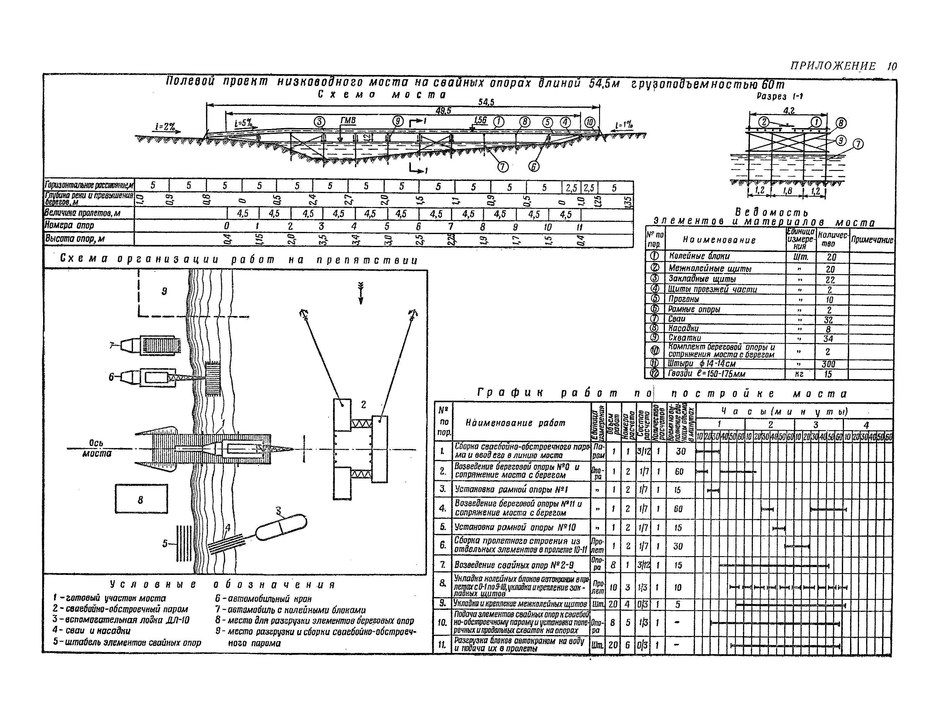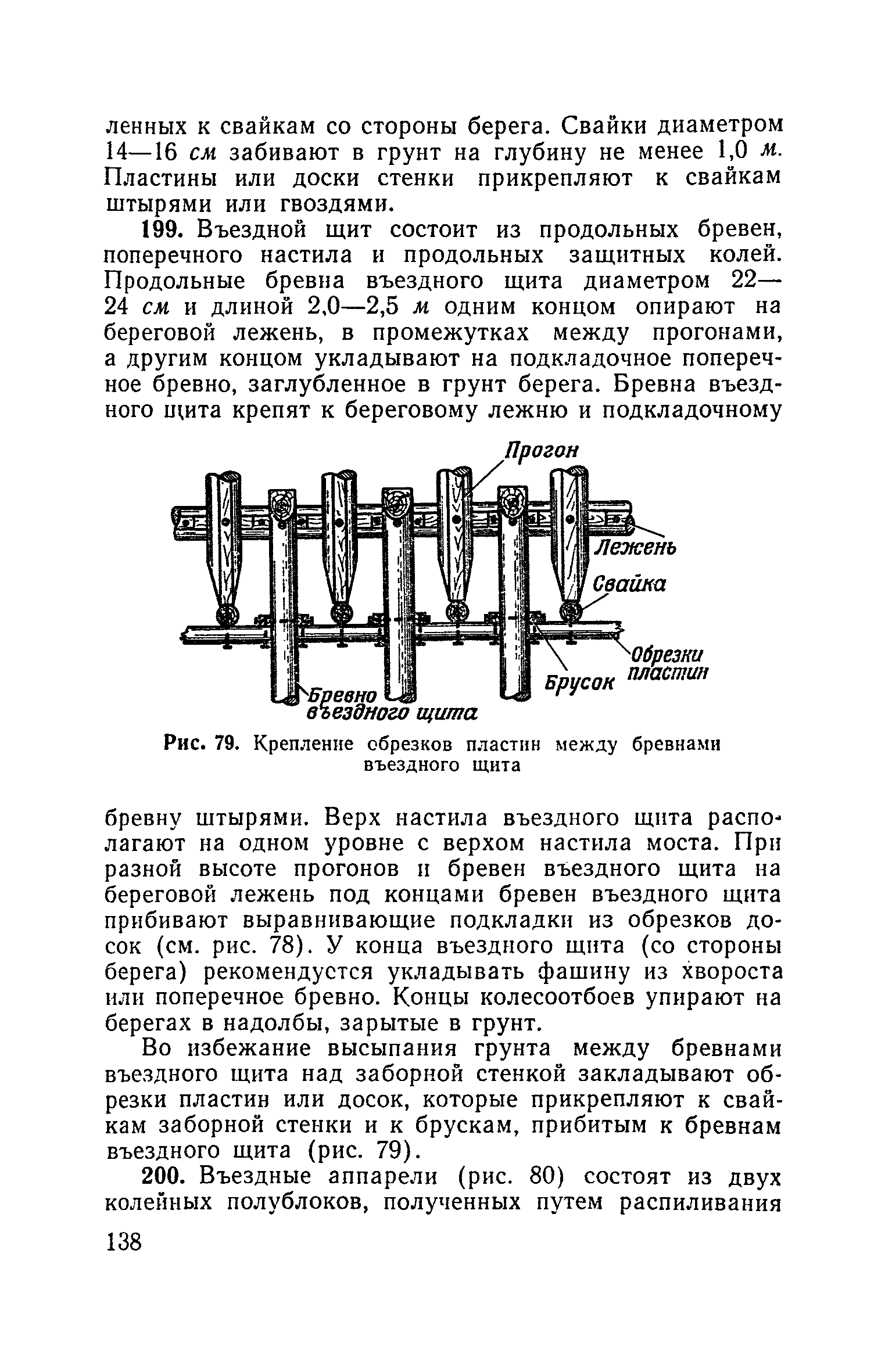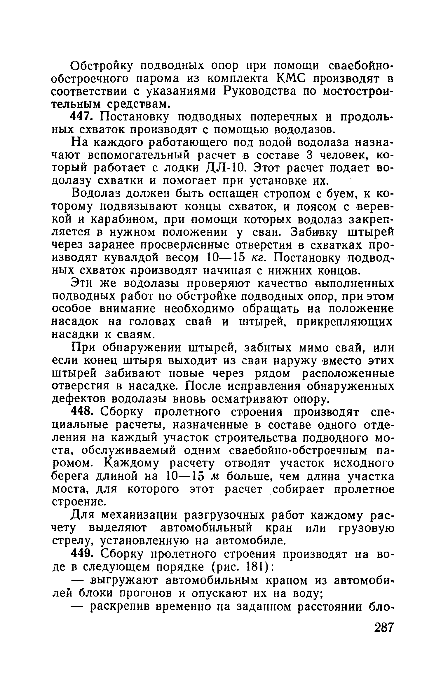 | Оглавление: | Глава 1. Общие положения Глава 2. Инженерная разведка района постройки моста Глава 3. Конструкции деревянных пролетных строений низководных мостов 1. Блочные пролетные строения Пролетные строения из колейных блоков Пролетные строения из блоков прогонов и щитов проезжей части а) Блоки простых прогонов б) Блоки сложных прогонов в) Блоки составных прогонов 2. Пролетные строения из отдельных элементов с простыми и сложными прогонами Проезжая часть Простые прогоны Сложные прогоны Глава 4. Конструкции металлических пролетных строений низководных мостов 1. Блочные пролетные строения Блоки из четырех прогонов Блоки из двух прогонов Проезжая часть 2. Пролетные строения из отдельных элементов Несущая конструкция с простыми прогонами и пакетами Несущая конструкция с составными прогонами Проезжая часть Глава 5. Промежуточные опоры низководных мостов 1. Свайные опоры 2. Рамные деревянные опоры 3. Клеточные опоры 4. Обеспечение продольной устойчивости моста Глава 6. Береговые опоры и сопряжение моста с берегами Глава 7. Изготовление и транспортировка мостовых конструкций 1. Общие положения 2. Изготовление конструкций низководных деревянных мостов Лесозаготовительные работы Лесопильные работы Работы по изготовлению деревянных мостовых конструкций Изготовление колейных блоков Сборка блоков прогонов Изготовление конструкций пролетного строения из блоков прогонов и щитов проезжей части Особенности сборки блоков сложных прогонов Изготовление составных прогонов на стальных цилиндрических нагелях и сборка блоков из двух прогонов Изготовление свай Изготовление насадок и лежней опор Изготовление элементов и сборка рамных опор Особенности изготовления элементов мостовых конструкций при постройке мостов из отдельных элементов 3. Изготовление конструкций металлических мостов Общие положения Изготовление металлических элементов Изготовление элементов проезжей части Изготовление блоков прогонов Изготовление пролетных строений из отдельных элементов 4. Транспортировка мостовых конструкций Глава 8. Постройка низководных мостов 1. Общие положения 2. Разбивка оси моста и осей опор 3. Средства механизации работ при постройке мостов 4. Глубина забивки свай в опорах 5. Организация в производство работ при постройке низководных мостов Общие положения Постройка мостов на свайных опорах при помощи комплекта мостостроительных средств КМС Постройка мостов на свайных опорах при помощи дизель-молотов ДМ-150 с одностреловыми копрами ОСК и дизель-молотов ДБ-45 с приспособлениями ПУС-1 для установки свай Постройка мостов на рамных опорах при помощи паромов с домкратами из комплекта КМС Устройство береговых опор и сопряжений моста с берегами Постройка мостов из отдельных элементов Особенности постройки двухпутных мостов на свайных опорах Особенности постройки мостов на свайных опорах с увеличенными пролетами Глава 9. Подводные мосты 1. Общие положения 2. Особенности конструкции промежуточных опор 3. Береговые опоры и сопряжение подводного моста с берегами 4. Особенности конструкции пролетных строений подводных мостов 5. Особенности постройки подводных мостов на свайных опорах 6. Особенности постройки подводных мостов на рамных опорах 7. Особенности постройки подводных мостов с металлическими прогонами Глава 10. Особенности к