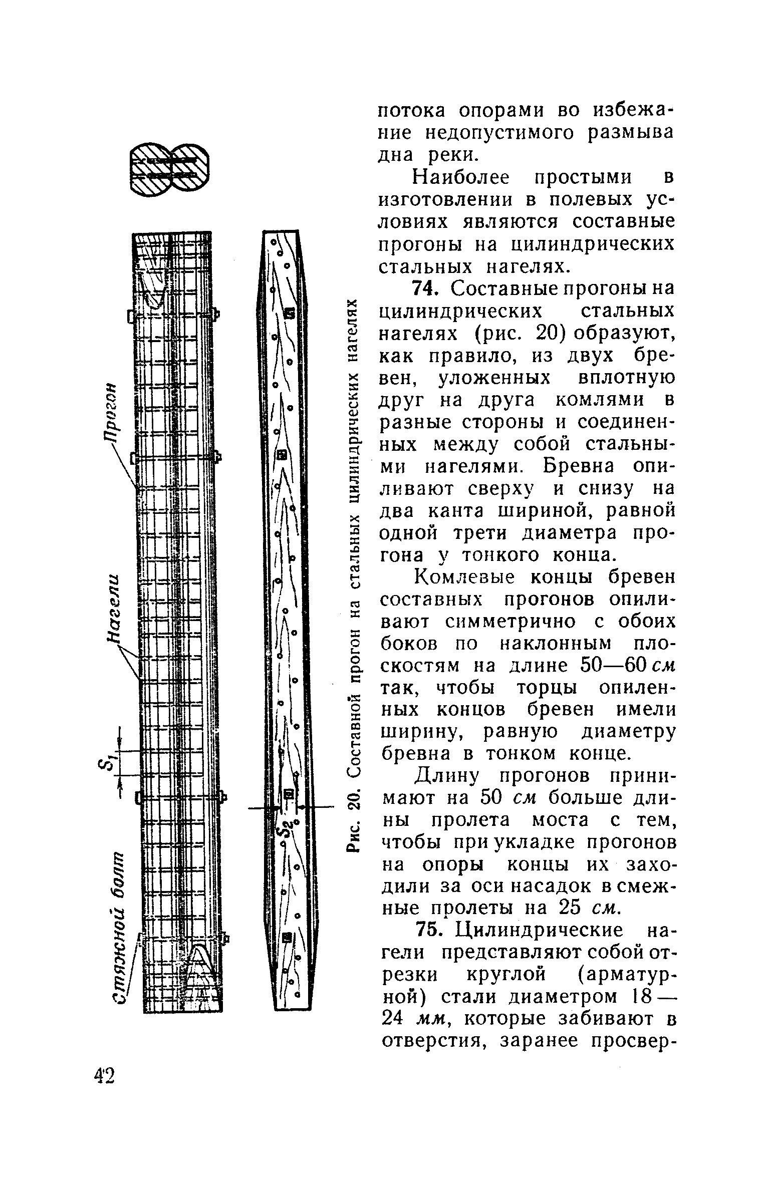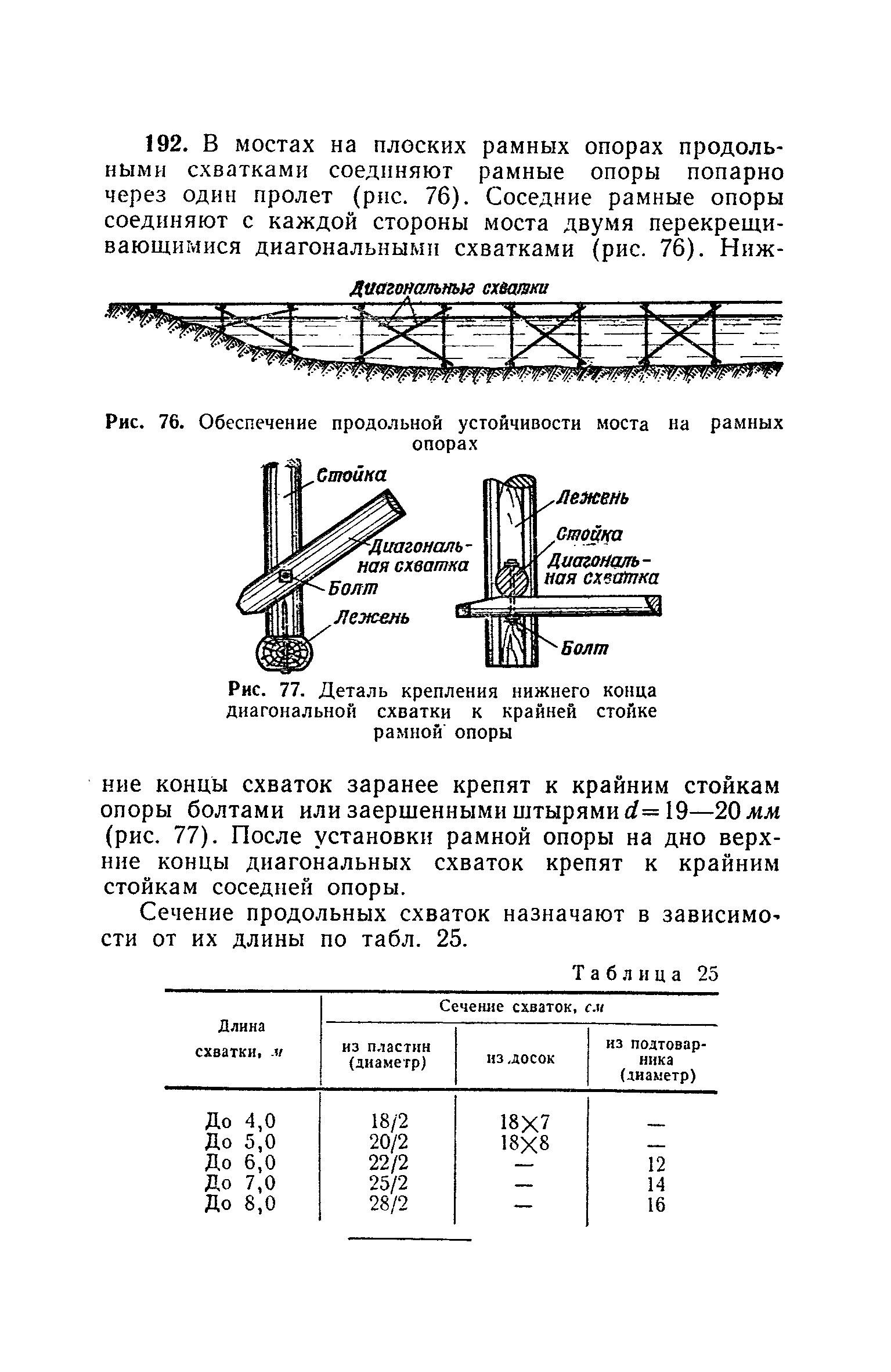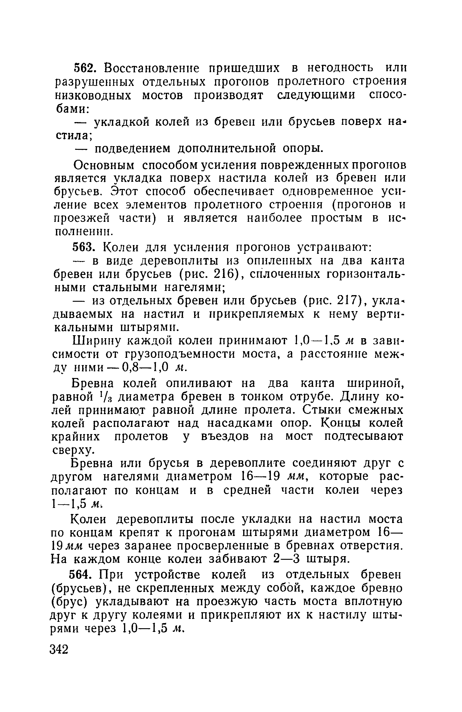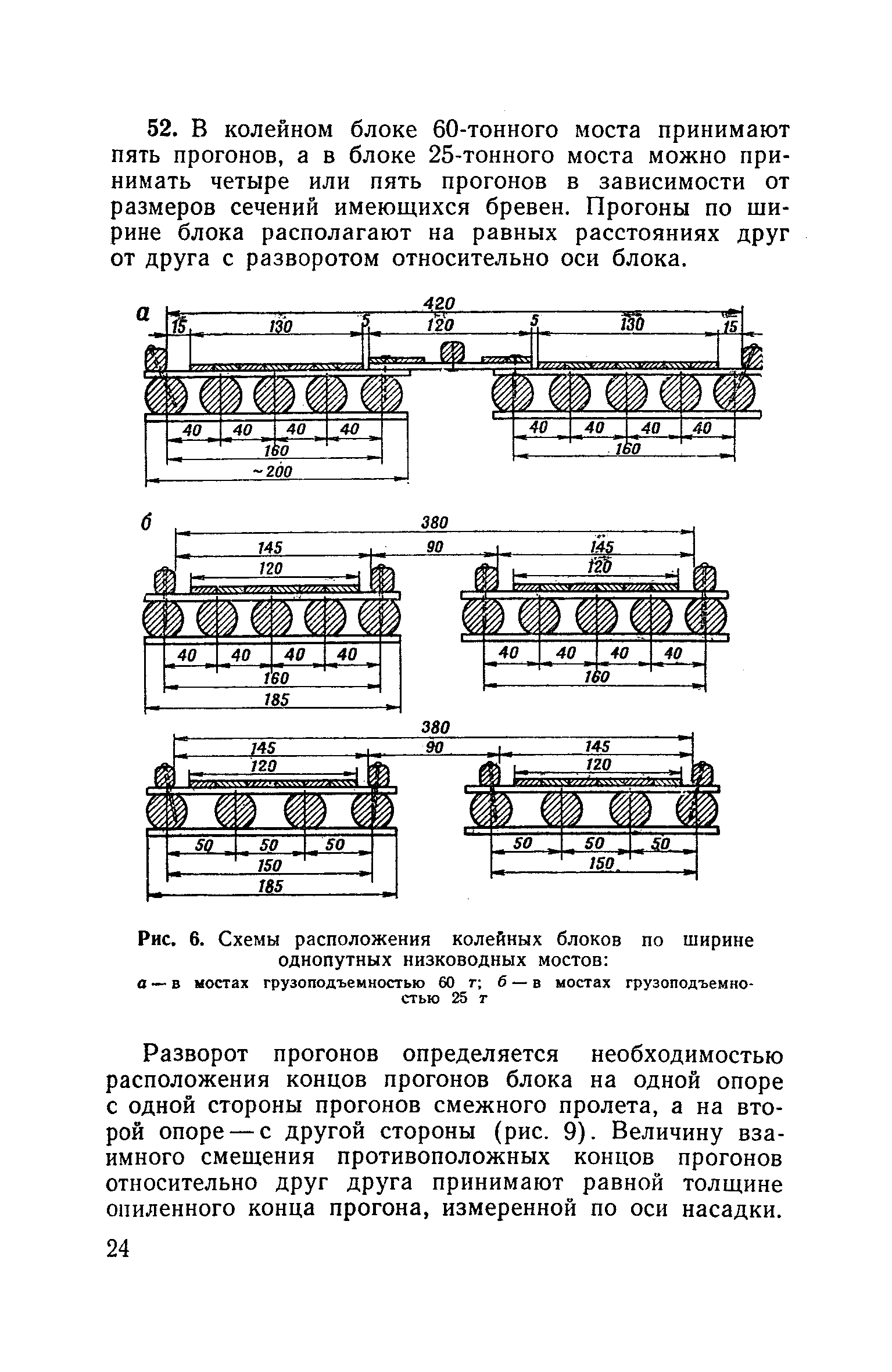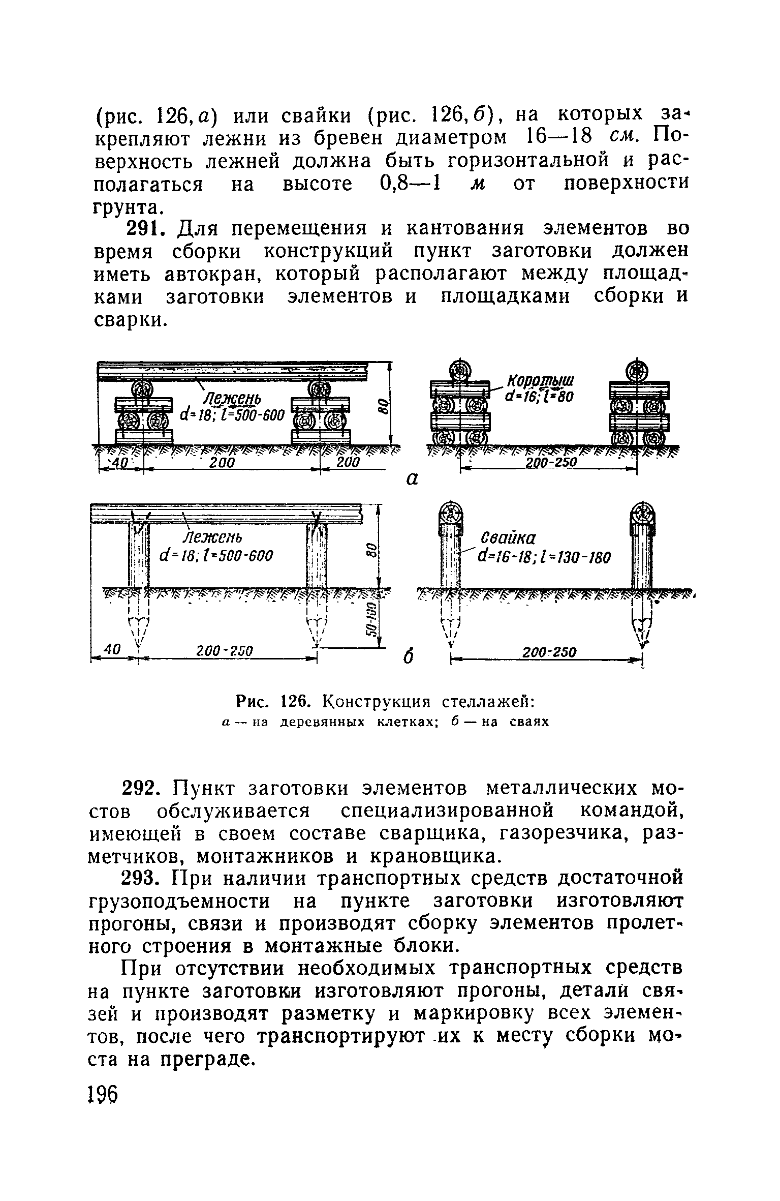 | Оглавление: | Глава 1. Общие положения Глава 2. Инженерная разведка района постройки моста Глава 3. Конструкции деревянных пролетных строений низководных мостов 1. Блочные пролетные строения Пролетные строения из колейных блоков Пролетные строения из блоков прогонов и щитов проезжей части а) Блоки простых прогонов б) Блоки сложных прогонов в) Блоки составных прогонов 2. Пролетные строения из отдельных элементов с простыми и сложными прогонами Проезжая часть Простые прогоны Сложные прогоны Глава 4. Конструкции металлических пролетных строений низководных мостов 1. Блочные пролетные строения Блоки из четырех прогонов Блоки из двух прогонов Проезжая часть 2. Пролетные строения из отдельных элементов Несущая конструкция с простыми прогонами и пакетами Несущая конструкция с составными прогонами Проезжая часть Глава 5. Промежуточные опоры низководных мостов 1. Свайные опоры 2. Рамные деревянные опоры 3. Клеточные опоры 4. Обеспечение продольной устойчивости моста Глава 6. Береговые опоры и сопряжение моста с берегами Глава 7. Изготовление и транспортировка мостовых конструкций 1. Общие положения 2. Изготовление конструкций низководных деревянных мостов Лесозаготовительные работы Лесопильные работы Работы по изготовлению деревянных мостовых конструкций Изготовление колейных блоков Сборка блоков прогонов Изготовление конструкций пролетного строения из блоков прогонов и щитов проезжей части Особенности сборки блоков сложных прогонов Изготовление составных прогонов на стальных цилиндрических нагелях и сборка блоков из двух прогонов Изготовление свай Изготовление насадок и лежней опор Изготовление элементов и сборка рамных опор Особенности изготовления элементов мостовых конструкций при постройке мостов из отдельных элементов 3. Изготовление конструкций металлических мостов Общие положения Изготовление металлических элементов Изготовление элементов проезжей части Изготовление блоков прогонов Изготовление пролетных строений из отдельных элементов 4. Транспортировка мостовых конструкций Глава 8. Постройка низководных мостов 1. Общие положения 2. Разбивка оси моста и осей опор 3. Средства механизации работ при постройке мостов 4. Глубина забивки свай в опорах 5. Организация в производство работ при постройке низководных мостов Общие положения Постройка мостов на свайных опорах при помощи комплекта мостостроительных средств КМС Постройка мостов на свайных опорах при помощи дизель-молотов ДМ-150 с одностреловыми копрами ОСК и дизель-молотов ДБ-45 с приспособлениями ПУС-1 для установки свай Постройка мостов на рамных опорах при помощи паромов с домкратами из комплекта КМС Устройство береговых опор и сопряжений моста с берегами Постройка мостов из отдельных элементов Особенности постройки двухпутных мостов на свайных опорах Особенности постройки мостов на свайных опорах с увеличенными пролетами Глава 9. Подводные мосты 1. Общие положения 2. Особенности конструкции промежуточных опор 3. Береговые опоры и сопряжение подводного моста с берегами 4. Особенности конструкции пролетных строений подводных мостов 5. Особенности постройки подводных мостов на свайных опорах 6. Особенности постройки подводных мостов на рамных опорах 7. Особенности постройки подводных мостов с металлическими прогонами Глава 10. Особенности к