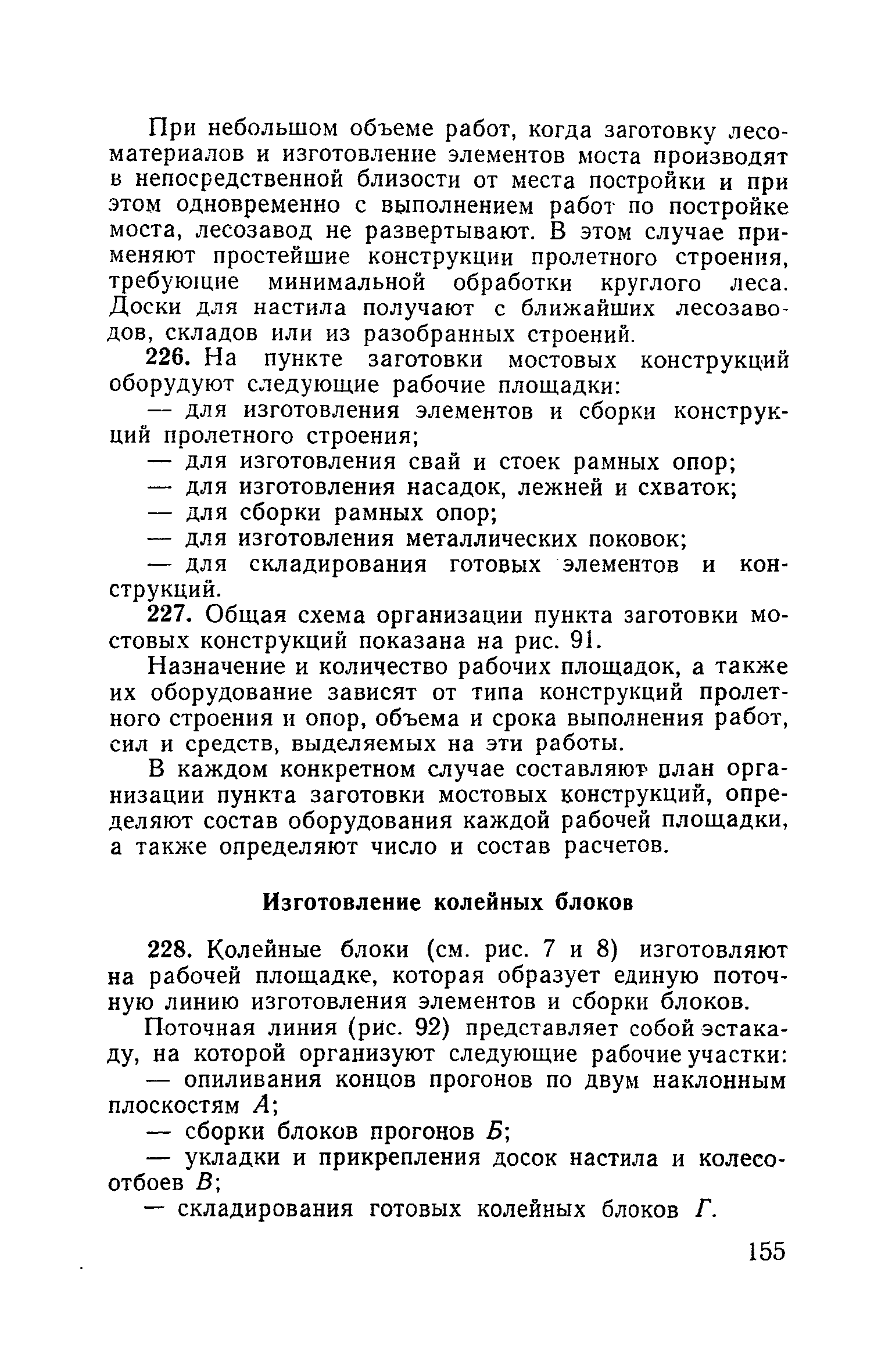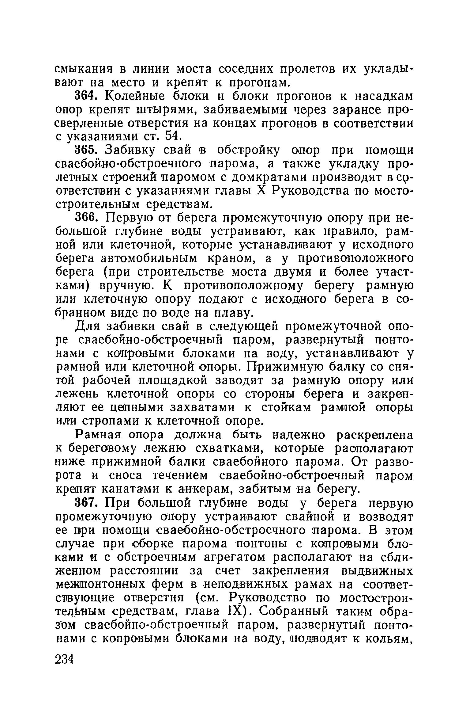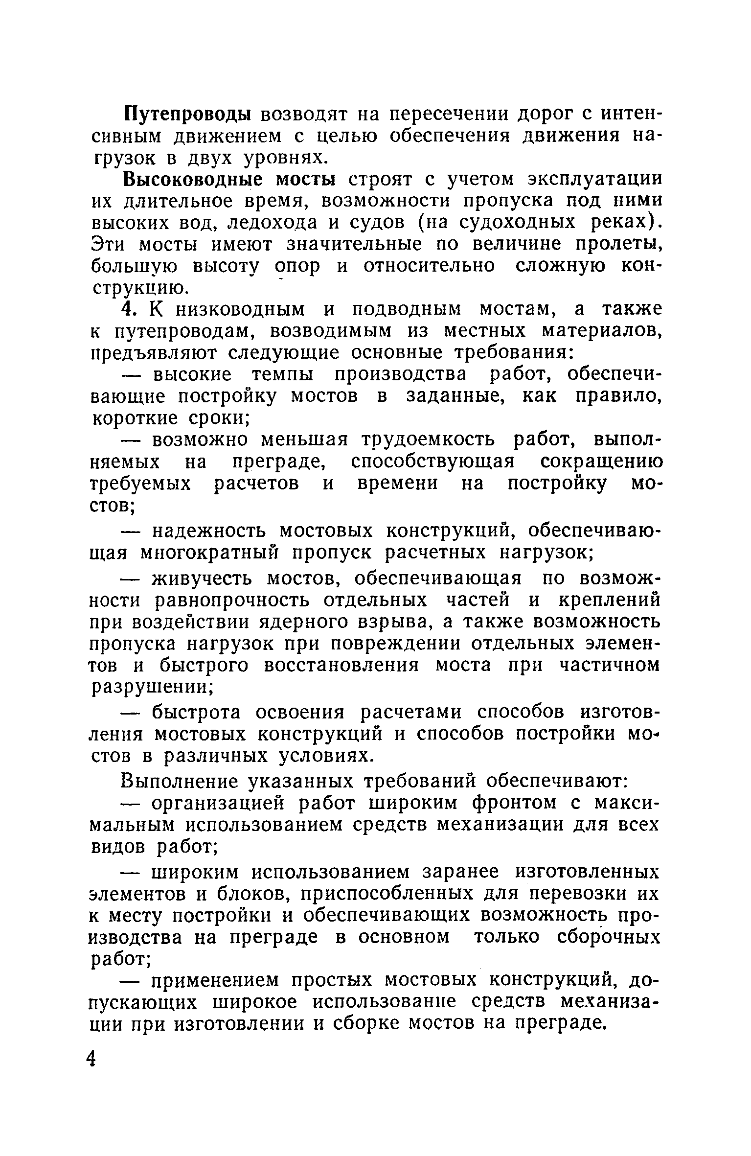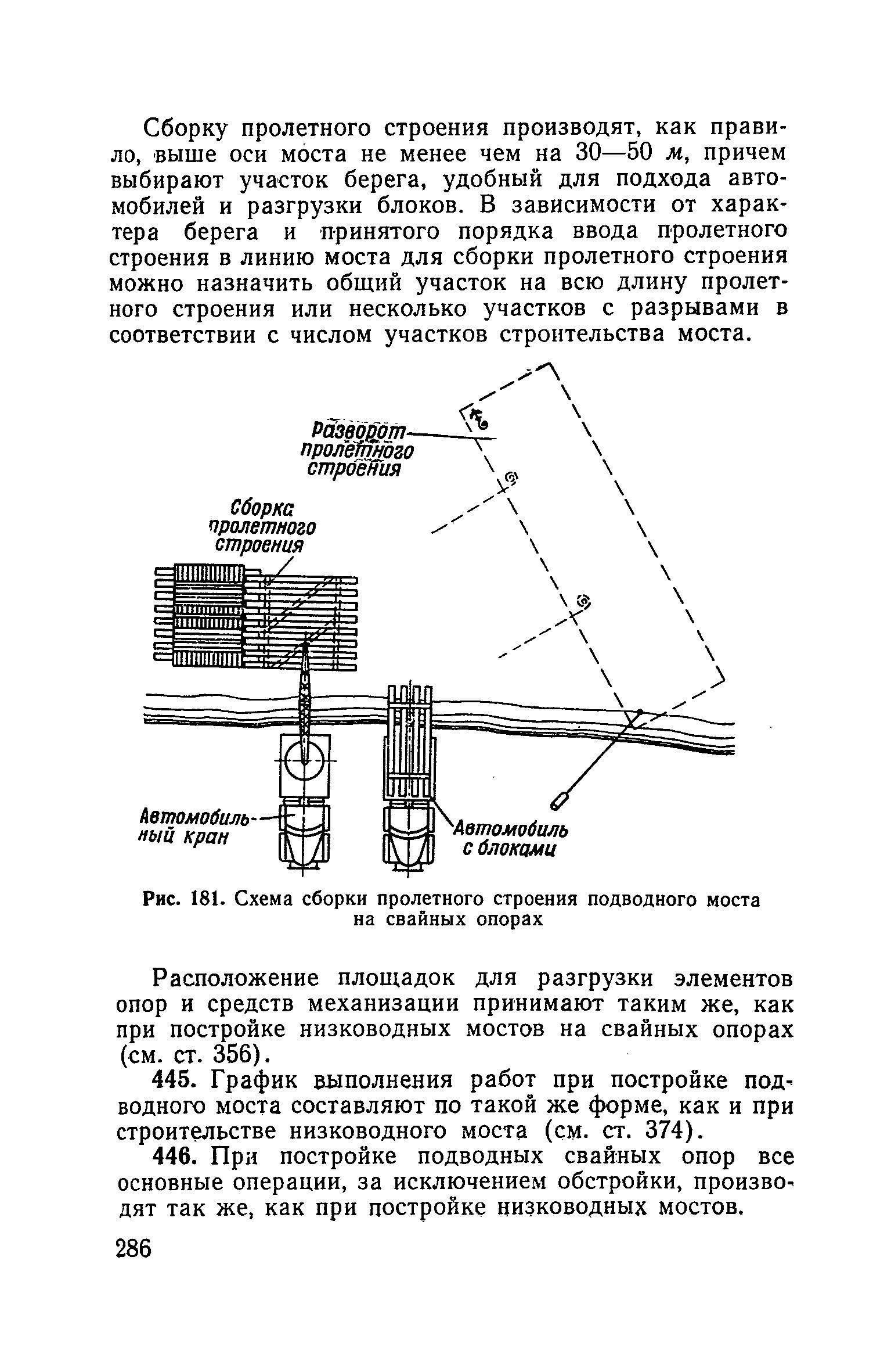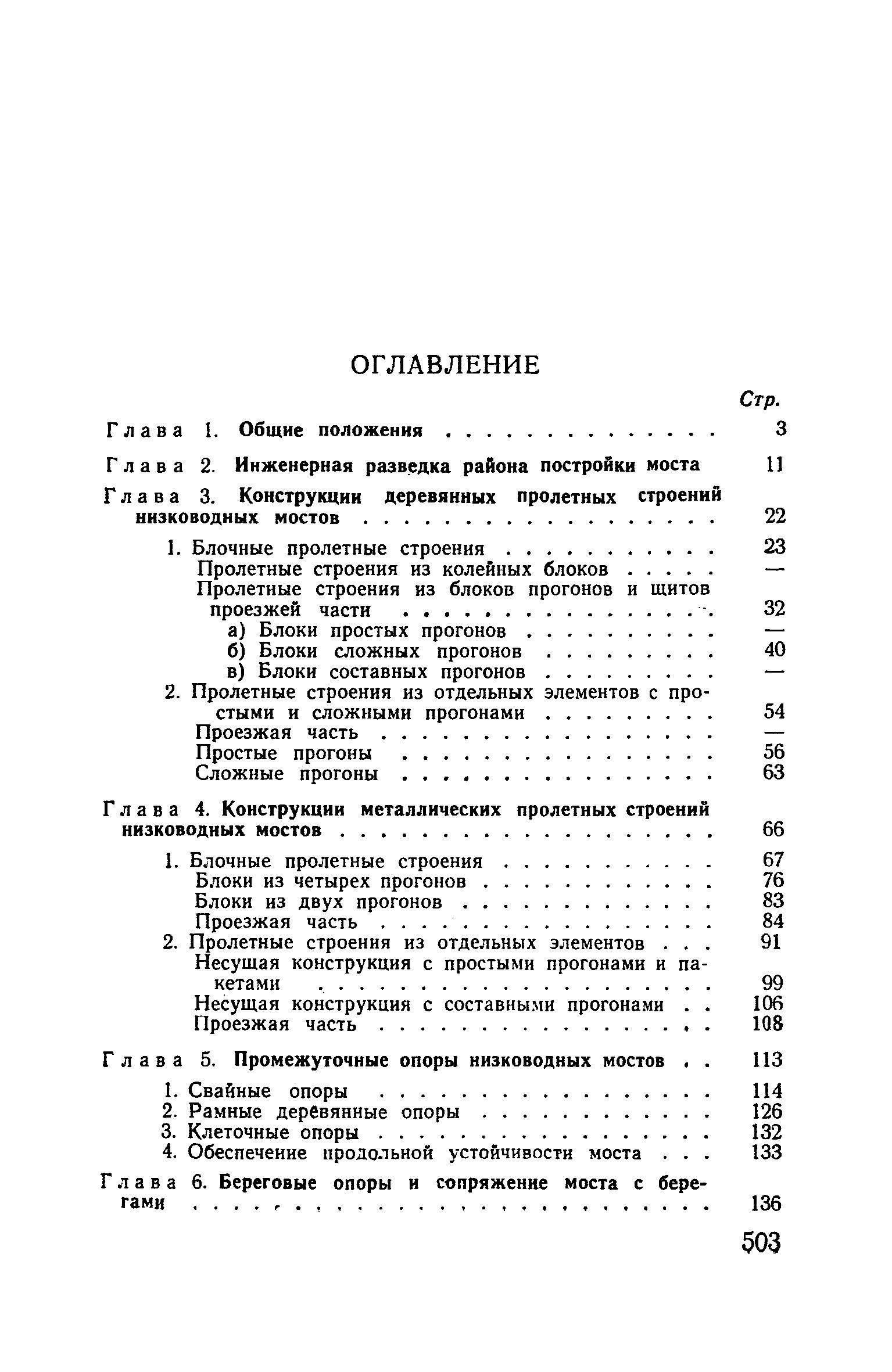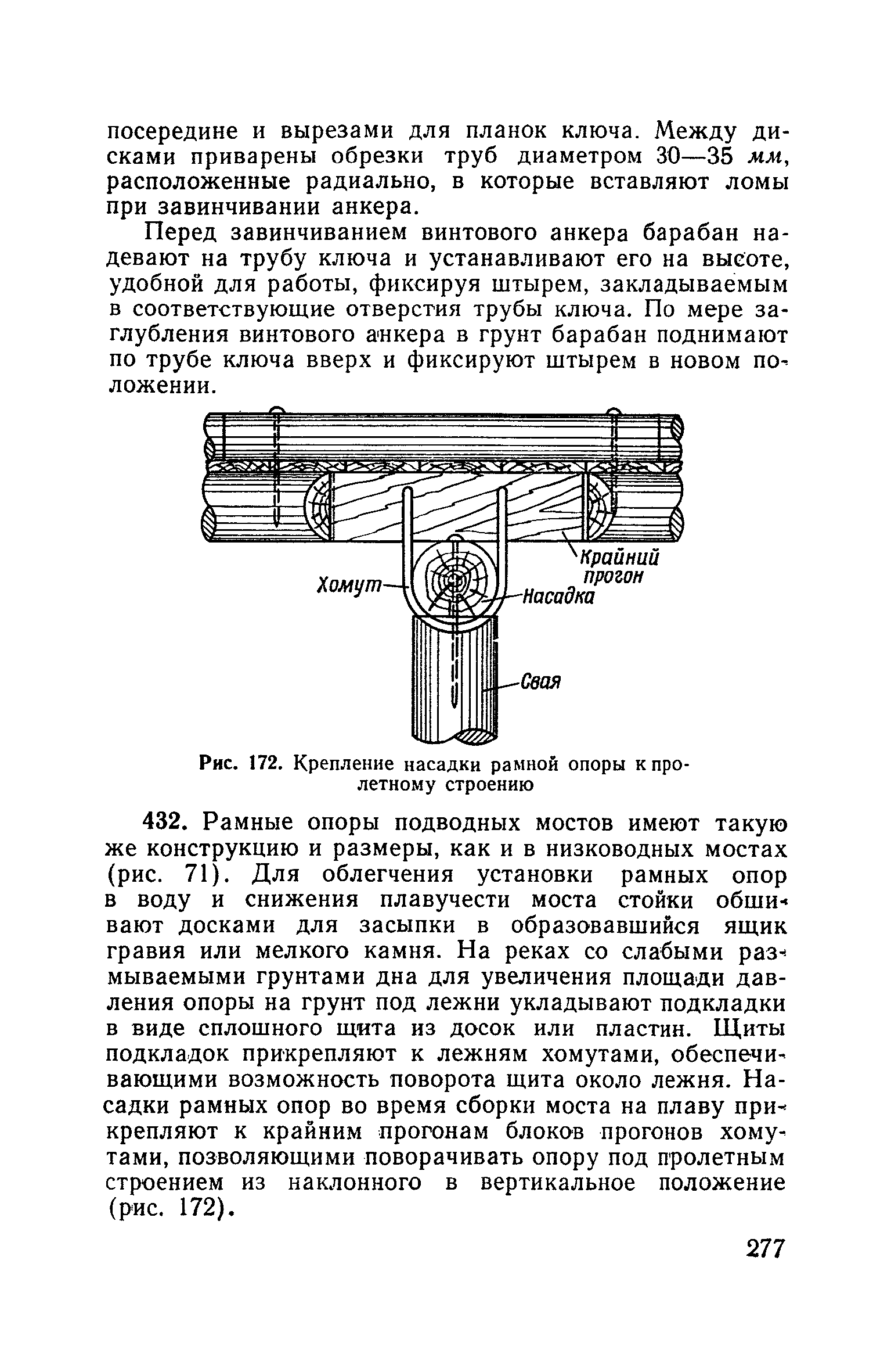 | Оглавление: | Глава 1. Общие положения Глава 2. Инженерная разведка района постройки моста Глава 3. Конструкции деревянных пролетных строений низководных мостов 1. Блочные пролетные строения Пролетные строения из колейных блоков Пролетные строения из блоков прогонов и щитов проезжей части а) Блоки простых прогонов б) Блоки сложных прогонов в) Блоки составных прогонов 2. Пролетные строения из отдельных элементов с простыми и сложными прогонами Проезжая часть Простые прогоны Сложные прогоны Глава 4. Конструкции металлических пролетных строений низководных мостов 1. Блочные пролетные строения Блоки из четырех прогонов Блоки из двух прогонов Проезжая часть 2. Пролетные строения из отдельных элементов Несущая конструкция с простыми прогонами и пакетами Несущая конструкция с составными прогонами Проезжая часть Глава 5. Промежуточные опоры низководных мостов 1. Свайные опоры 2. Рамные деревянные опоры 3. Клеточные опоры 4. Обеспечение продольной устойчивости моста Глава 6. Береговые опоры и сопряжение моста с берегами Глава 7. Изготовление и транспортировка мостовых конструкций 1. Общие положения 2. Изготовление конструкций низководных деревянных мостов Лесозаготовительные работы Лесопильные работы Работы по изготовлению деревянных мостовых конструкций Изготовление колейных блоков Сборка блоков прогонов Изготовление конструкций пролетного строения из блоков прогонов и щитов проезжей части Особенности сборки блоков сложных прогонов Изготовление составных прогонов на стальных цилиндрических нагелях и сборка блоков из двух прогонов Изготовление свай Изготовление насадок и лежней опор Изготовление элементов и сборка рамных опор Особенности изготовления элементов мостовых конструкций при постройке мостов из отдельных элементов 3. Изготовление конструкций металлических мостов Общие положения Изготовление металлических элементов Изготовление элементов проезжей части Изготовление блоков прогонов Изготовление пролетных строений из отдельных элементов 4. Транспортировка мостовых конструкций Глава 8. Постройка низководных мостов 1. Общие положения 2. Разбивка оси моста и осей опор 3. Средства механизации работ при постройке мостов 4. Глубина забивки свай в опорах 5. Организация в производство работ при постройке низководных мостов Общие положения Постройка мостов на свайных опорах при помощи комплекта мостостроительных средств КМС Постройка мостов на свайных опорах при помощи дизель-молотов ДМ-150 с одностреловыми копрами ОСК и дизель-молотов ДБ-45 с приспособлениями ПУС-1 для установки свай Постройка мостов на рамных опорах при помощи паромов с домкратами из комплекта КМС Устройство береговых опор и сопряжений моста с берегами Постройка мостов из отдельных элементов Особенности постройки двухпутных мостов на свайных опорах Особенности постройки мостов на свайных опорах с увеличенными пролетами Глава 9. Подводные мосты 1. Общие положения 2. Особенности конструкции промежуточных опор 3. Береговые опоры и сопряжение подводного моста с берегами 4. Особенности конструкции пролетных строений подводных мостов 5. Особенности постройки подводных мостов на свайных опорах 6. Особенности постройки подводных мостов на рамных опорах 7. Особенности постройки подводных мостов с металлическими прогонами Глава 10. Особенности к