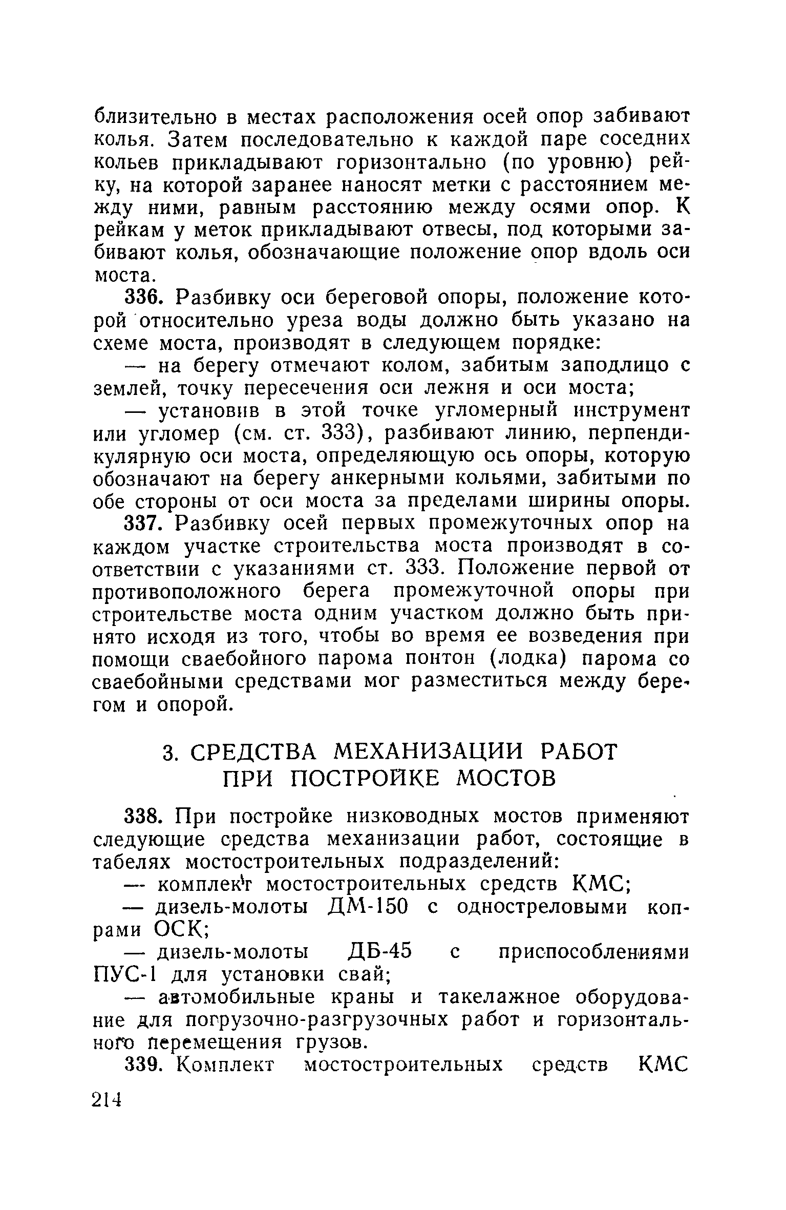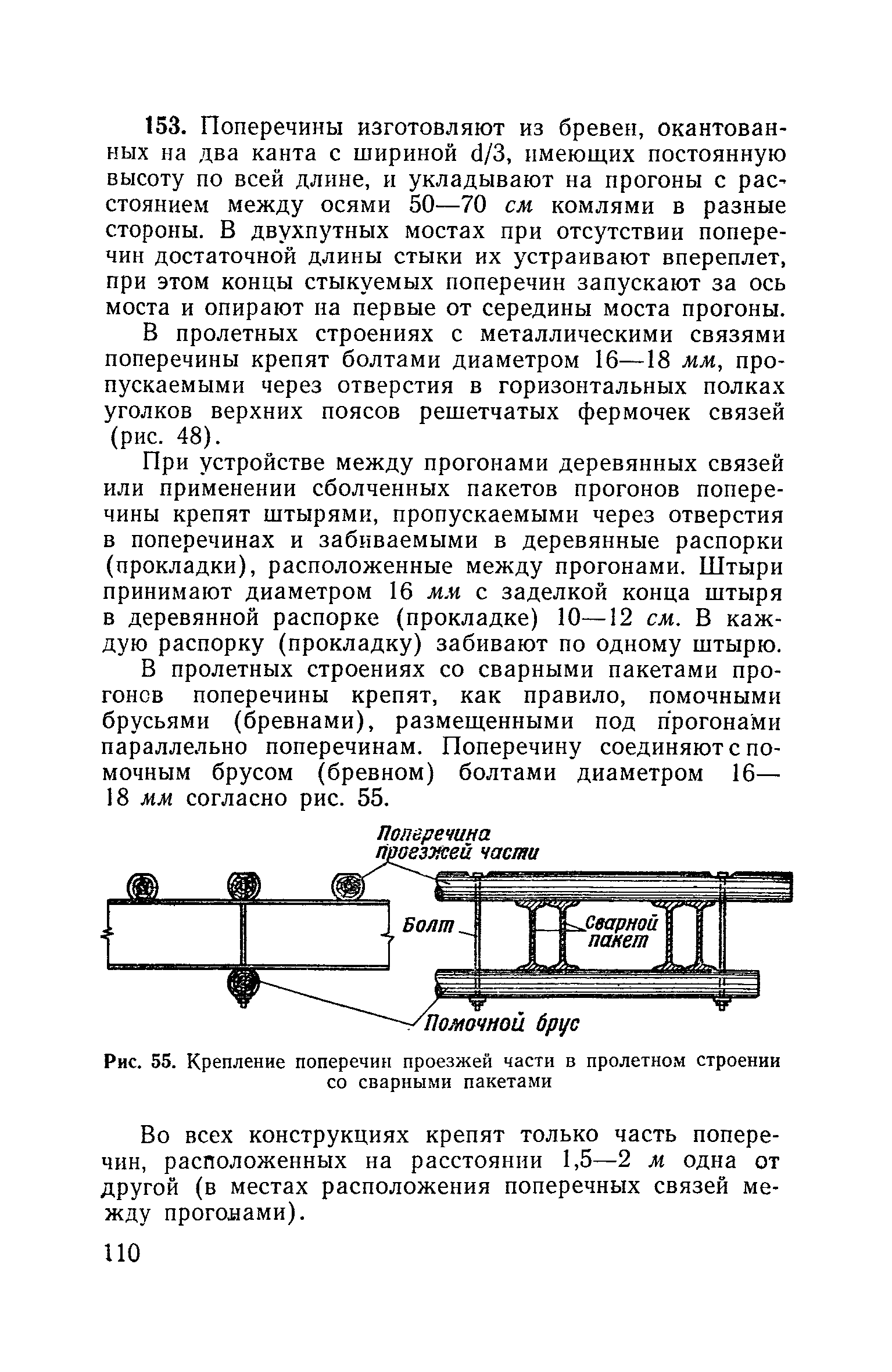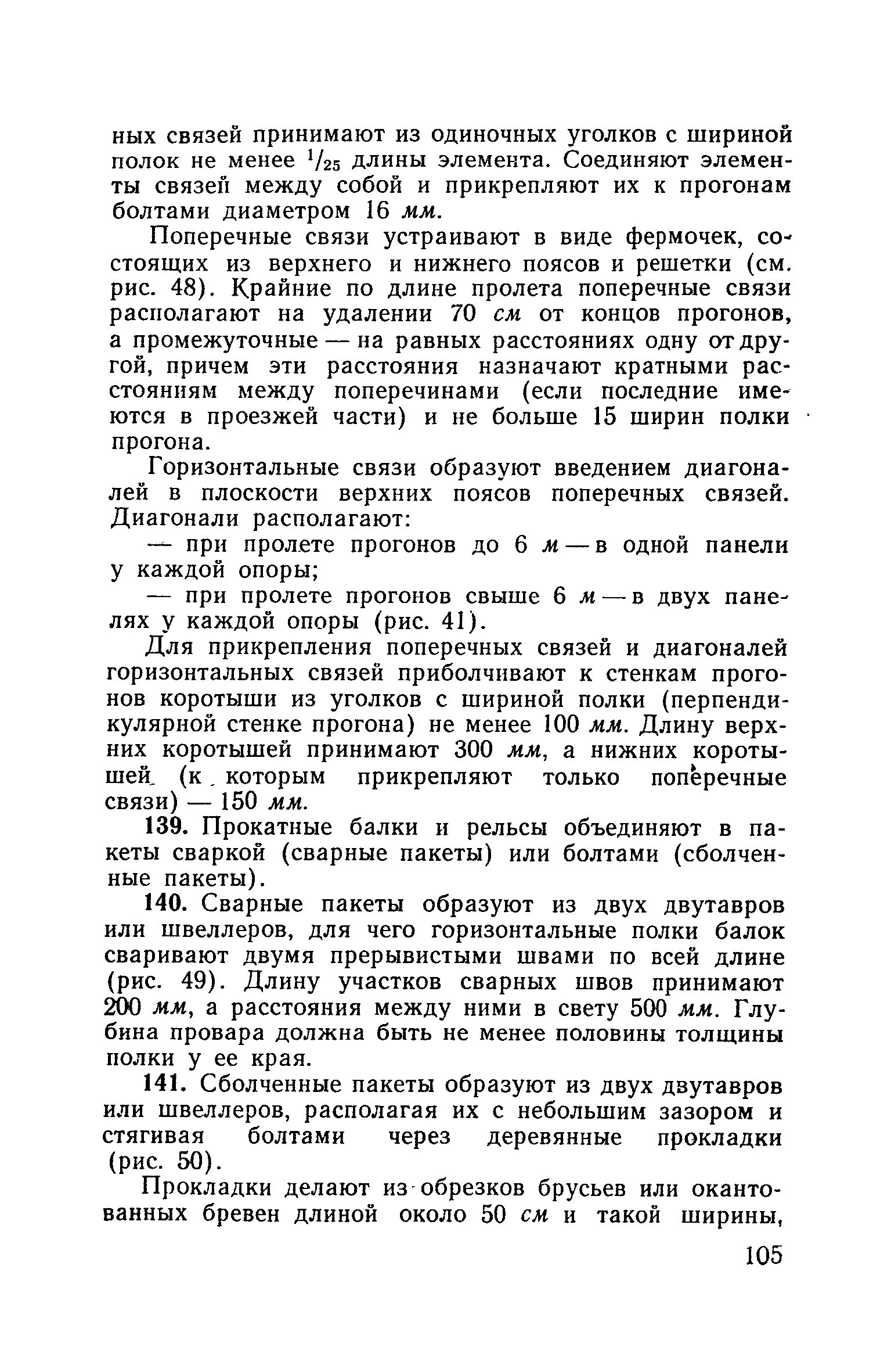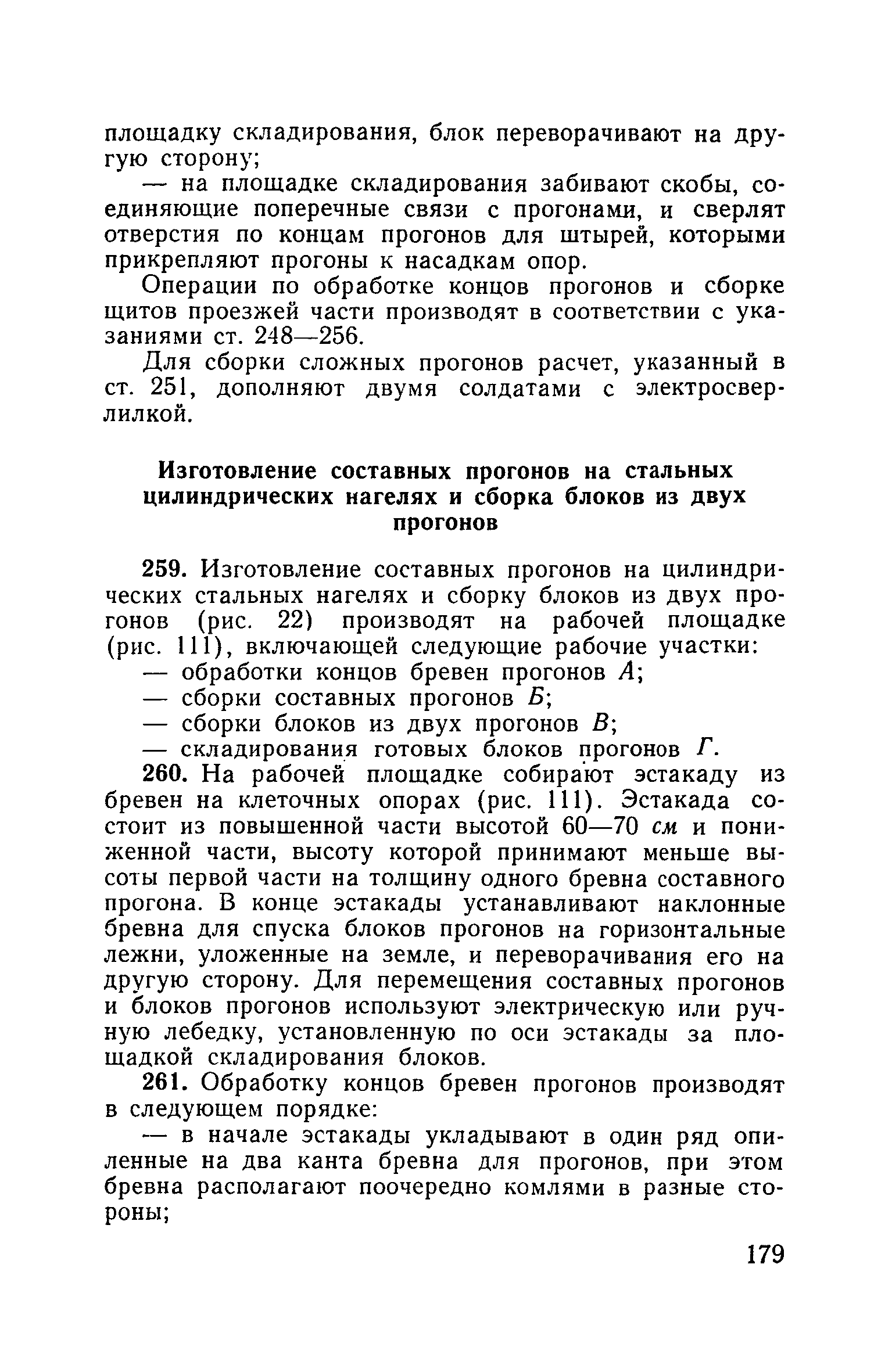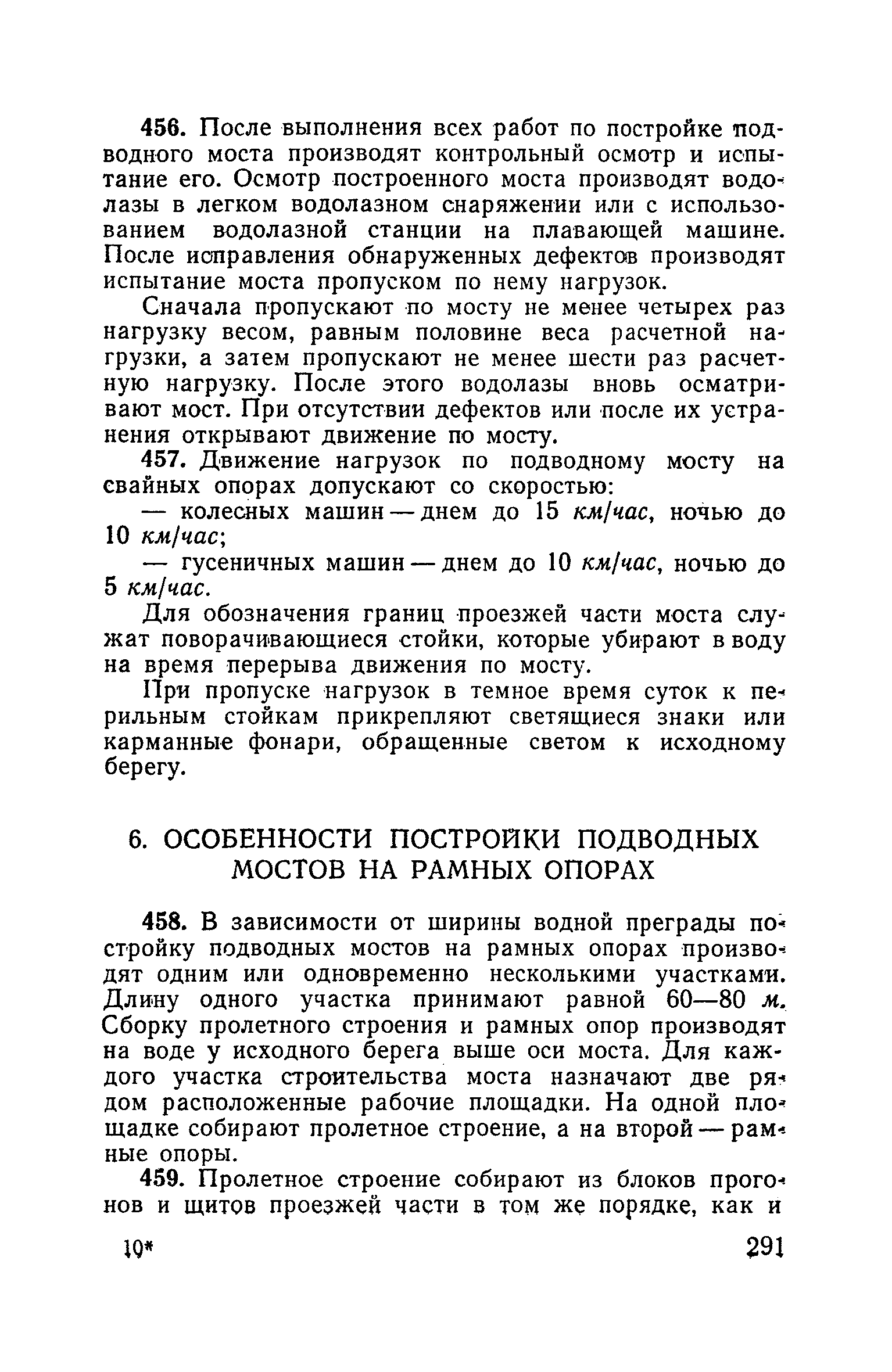 | Оглавление: | Глава 1. Общие положения Глава 2. Инженерная разведка района постройки моста Глава 3. Конструкции деревянных пролетных строений низководных мостов 1. Блочные пролетные строения Пролетные строения из колейных блоков Пролетные строения из блоков прогонов и щитов проезжей части а) Блоки простых прогонов б) Блоки сложных прогонов в) Блоки составных прогонов 2. Пролетные строения из отдельных элементов с простыми и сложными прогонами Проезжая часть Простые прогоны Сложные прогоны Глава 4. Конструкции металлических пролетных строений низководных мостов 1. Блочные пролетные строения Блоки из четырех прогонов Блоки из двух прогонов Проезжая часть 2. Пролетные строения из отдельных элементов Несущая конструкция с простыми прогонами и пакетами Несущая конструкция с составными прогонами Проезжая часть Глава 5. Промежуточные опоры низководных мостов 1. Свайные опоры 2. Рамные деревянные опоры 3. Клеточные опоры 4. Обеспечение продольной устойчивости моста Глава 6. Береговые опоры и сопряжение моста с берегами Глава 7. Изготовление и транспортировка мостовых конструкций 1. Общие положения 2. Изготовление конструкций низководных деревянных мостов Лесозаготовительные работы Лесопильные работы Работы по изготовлению деревянных мостовых конструкций Изготовление колейных блоков Сборка блоков прогонов Изготовление конструкций пролетного строения из блоков прогонов и щитов проезжей части Особенности сборки блоков сложных прогонов Изготовление составных прогонов на стальных цилиндрических нагелях и сборка блоков из двух прогонов Изготовление свай Изготовление насадок и лежней опор Изготовление элементов и сборка рамных опор Особенности изготовления элементов мостовых конструкций при постройке мостов из отдельных элементов 3. Изготовление конструкций металлических мостов Общие положения Изготовление металлических элементов Изготовление элементов проезжей части Изготовление блоков прогонов Изготовление пролетных строений из отдельных элементов 4. Транспортировка мостовых конструкций Глава 8. Постройка низководных мостов 1. Общие положения 2. Разбивка оси моста и осей опор 3. Средства механизации работ при постройке мостов 4. Глубина забивки свай в опорах 5. Организация в производство работ при постройке низководных мостов Общие положения Постройка мостов на свайных опорах при помощи комплекта мостостроительных средств КМС Постройка мостов на свайных опорах при помощи дизель-молотов ДМ-150 с одностреловыми копрами ОСК и дизель-молотов ДБ-45 с приспособлениями ПУС-1 для установки свай Постройка мостов на рамных опорах при помощи паромов с домкратами из комплекта КМС Устройство береговых опор и сопряжений моста с берегами Постройка мостов из отдельных элементов Особенности постройки двухпутных мостов на свайных опорах Особенности постройки мостов на свайных опорах с увеличенными пролетами Глава 9. Подводные мосты 1. Общие положения 2. Особенности конструкции промежуточных опор 3. Береговые опоры и сопряжение подводного моста с берегами 4. Особенности конструкции пролетных строений подводных мостов 5. Особенности постройки подводных мостов на свайных опорах 6. Особенности постройки подводных мостов на рамных опорах 7. Особенности постройки подводных мостов с металлическими прогонами Глава 10. Особенности к
