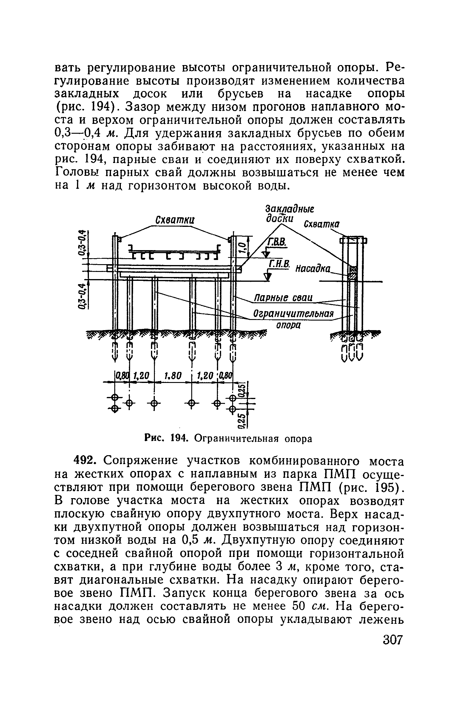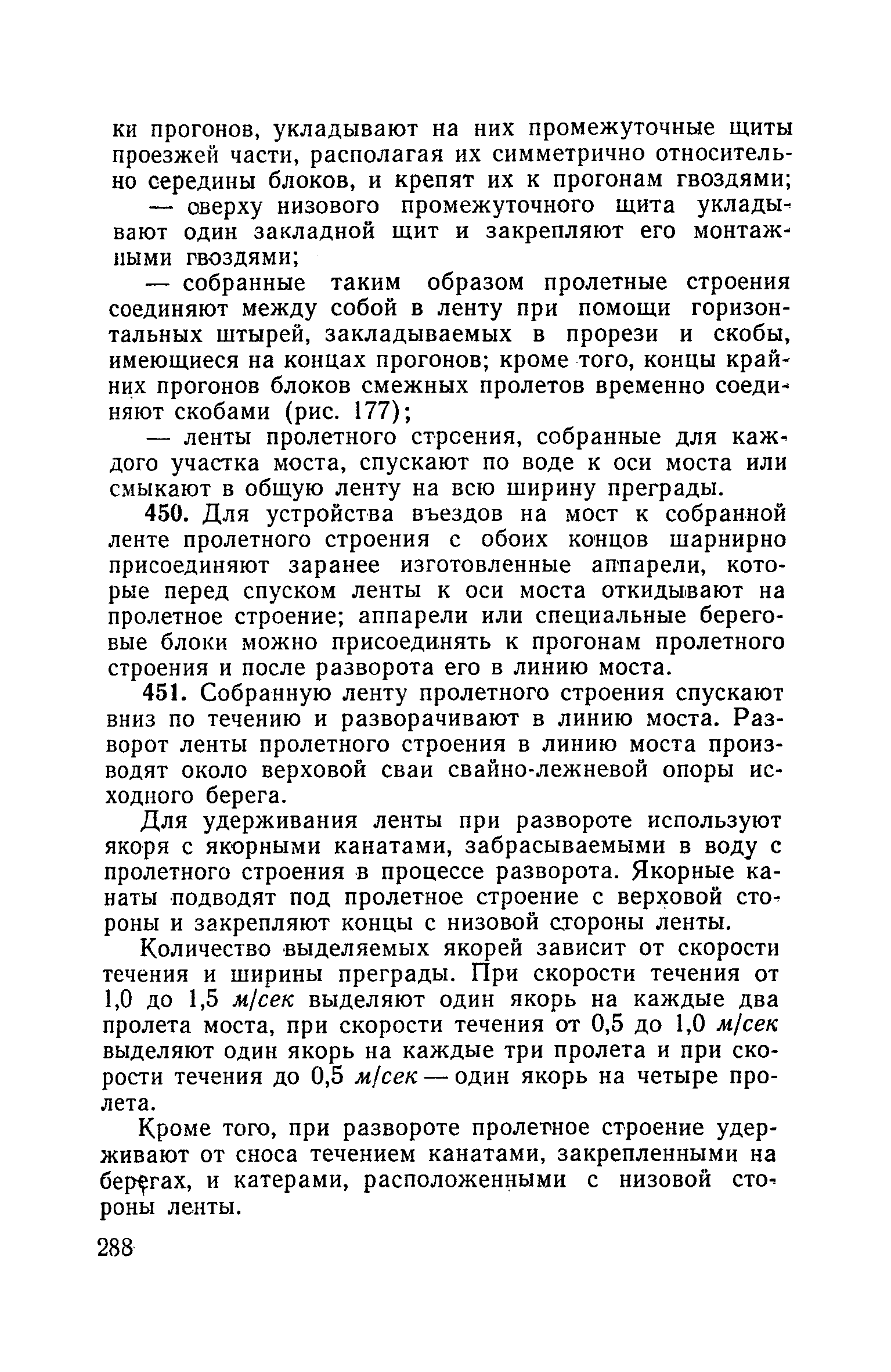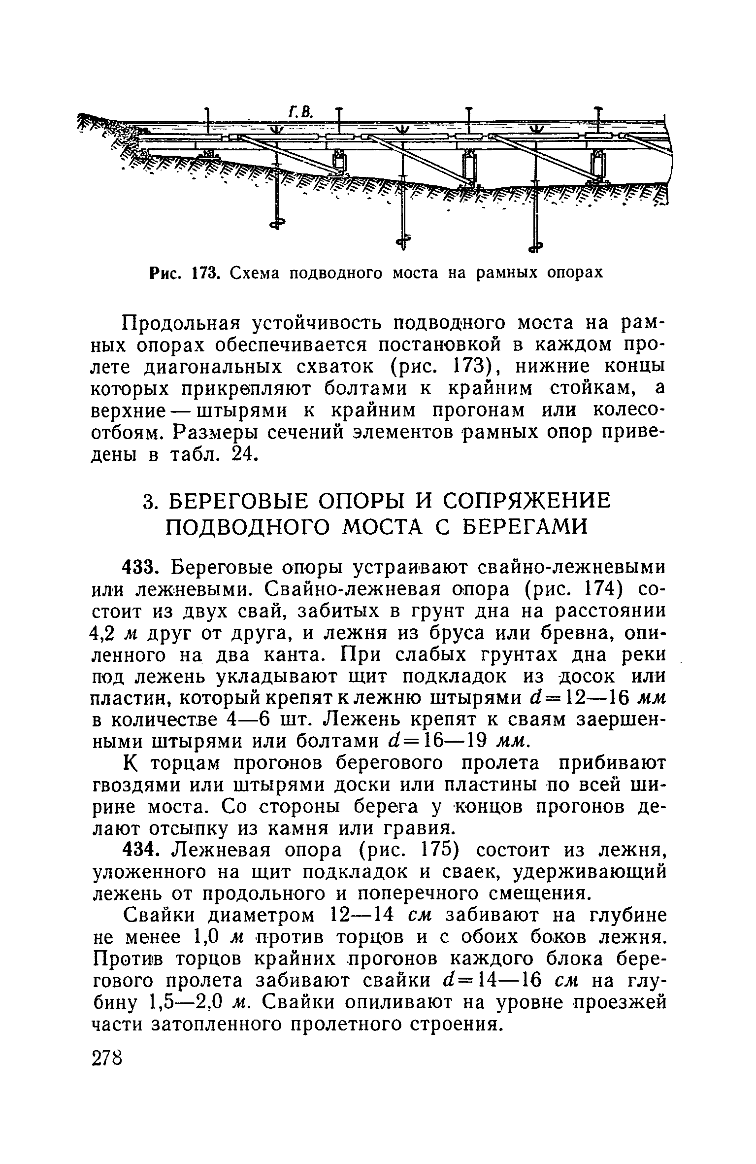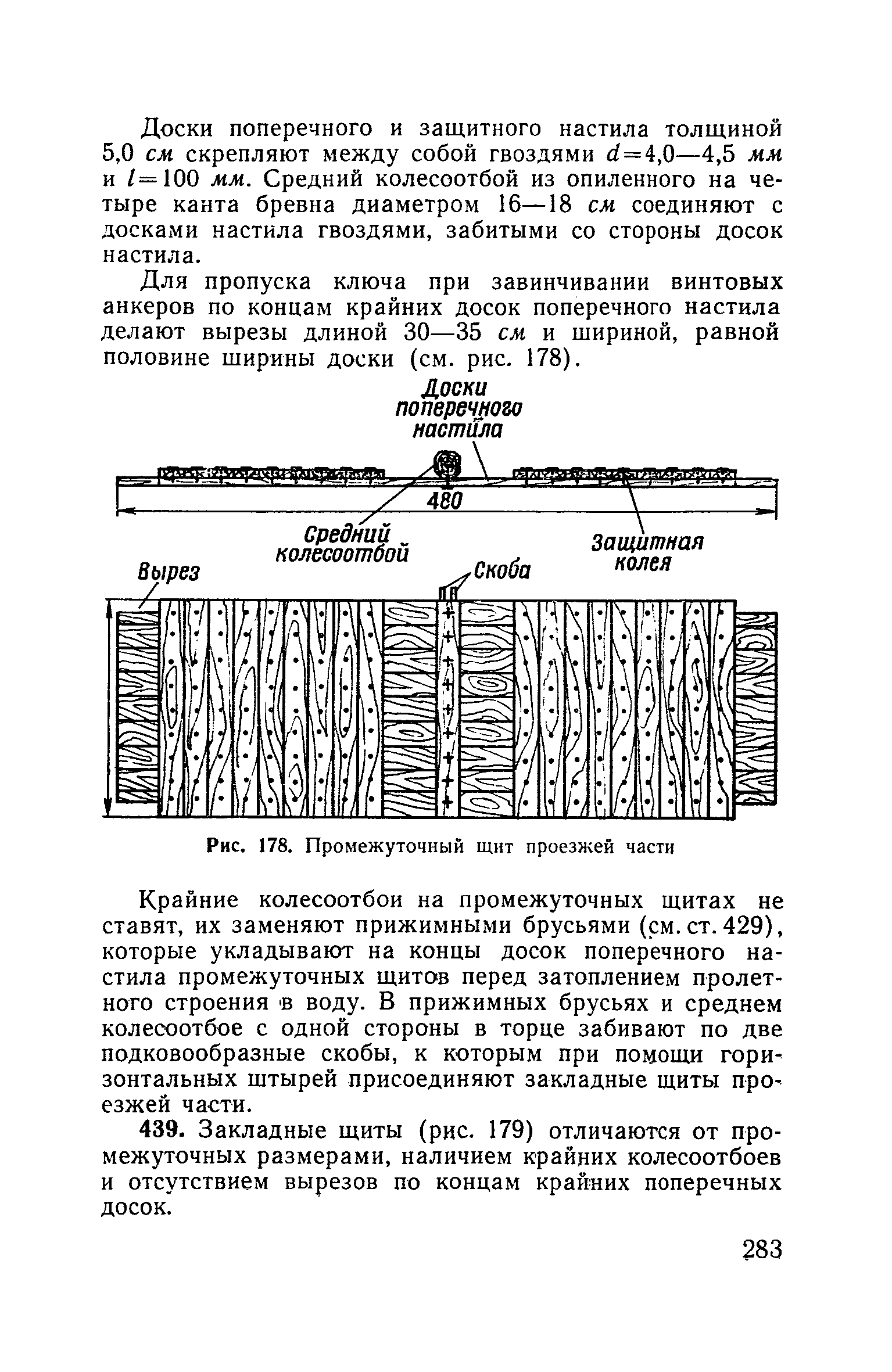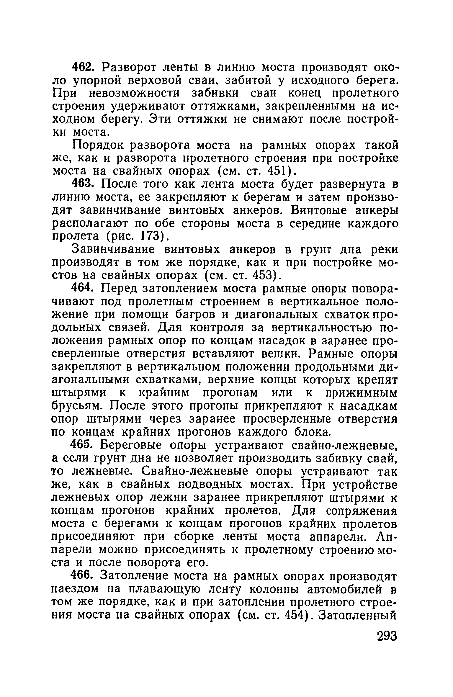 | Оглавление: | Глава 1. Общие положения Глава 2. Инженерная разведка района постройки моста Глава 3. Конструкции деревянных пролетных строений низководных мостов 1. Блочные пролетные строения Пролетные строения из колейных блоков Пролетные строения из блоков прогонов и щитов проезжей части а) Блоки простых прогонов б) Блоки сложных прогонов в) Блоки составных прогонов 2. Пролетные строения из отдельных элементов с простыми и сложными прогонами Проезжая часть Простые прогоны Сложные прогоны Глава 4. Конструкции металлических пролетных строений низководных мостов 1. Блочные пролетные строения Блоки из четырех прогонов Блоки из двух прогонов Проезжая часть 2. Пролетные строения из отдельных элементов Несущая конструкция с простыми прогонами и пакетами Несущая конструкция с составными прогонами Проезжая часть Глава 5. Промежуточные опоры низководных мостов 1. Свайные опоры 2. Рамные деревянные опоры 3. Клеточные опоры 4. Обеспечение продольной устойчивости моста Глава 6. Береговые опоры и сопряжение моста с берегами Глава 7. Изготовление и транспортировка мостовых конструкций 1. Общие положения 2. Изготовление конструкций низководных деревянных мостов Лесозаготовительные работы Лесопильные работы Работы по изготовлению деревянных мостовых конструкций Изготовление колейных блоков Сборка блоков прогонов Изготовление конструкций пролетного строения из блоков прогонов и щитов проезжей части Особенности сборки блоков сложных прогонов Изготовление составных прогонов на стальных цилиндрических нагелях и сборка блоков из двух прогонов Изготовление свай Изготовление насадок и лежней опор Изготовление элементов и сборка рамных опор Особенности изготовления элементов мостовых конструкций при постройке мостов из отдельных элементов 3. Изготовление конструкций металлических мостов Общие положения Изготовление металлических элементов Изготовление элементов проезжей части Изготовление блоков прогонов Изготовление пролетных строений из отдельных элементов 4. Транспортировка мостовых конструкций Глава 8. Постройка низководных мостов 1. Общие положения 2. Разбивка оси моста и осей опор 3. Средства механизации работ при постройке мостов 4. Глубина забивки свай в опорах 5. Организация в производство работ при постройке низководных мостов Общие положения Постройка мостов на свайных опорах при помощи комплекта мостостроительных средств КМС Постройка мостов на свайных опорах при помощи дизель-молотов ДМ-150 с одностреловыми копрами ОСК и дизель-молотов ДБ-45 с приспособлениями ПУС-1 для установки свай Постройка мостов на рамных опорах при помощи паромов с домкратами из комплекта КМС Устройство береговых опор и сопряжений моста с берегами Постройка мостов из отдельных элементов Особенности постройки двухпутных мостов на свайных опорах Особенности постройки мостов на свайных опорах с увеличенными пролетами Глава 9. Подводные мосты 1. Общие положения 2. Особенности конструкции промежуточных опор 3. Береговые опоры и сопряжение подводного моста с берегами 4. Особенности конструкции пролетных строений подводных мостов 5. Особенности постройки подводных мостов на свайных опорах 6. Особенности постройки подводных мостов на рамных опорах 7. Особенности постройки подводных мостов с металлическими прогонами Глава 10. Особенности к